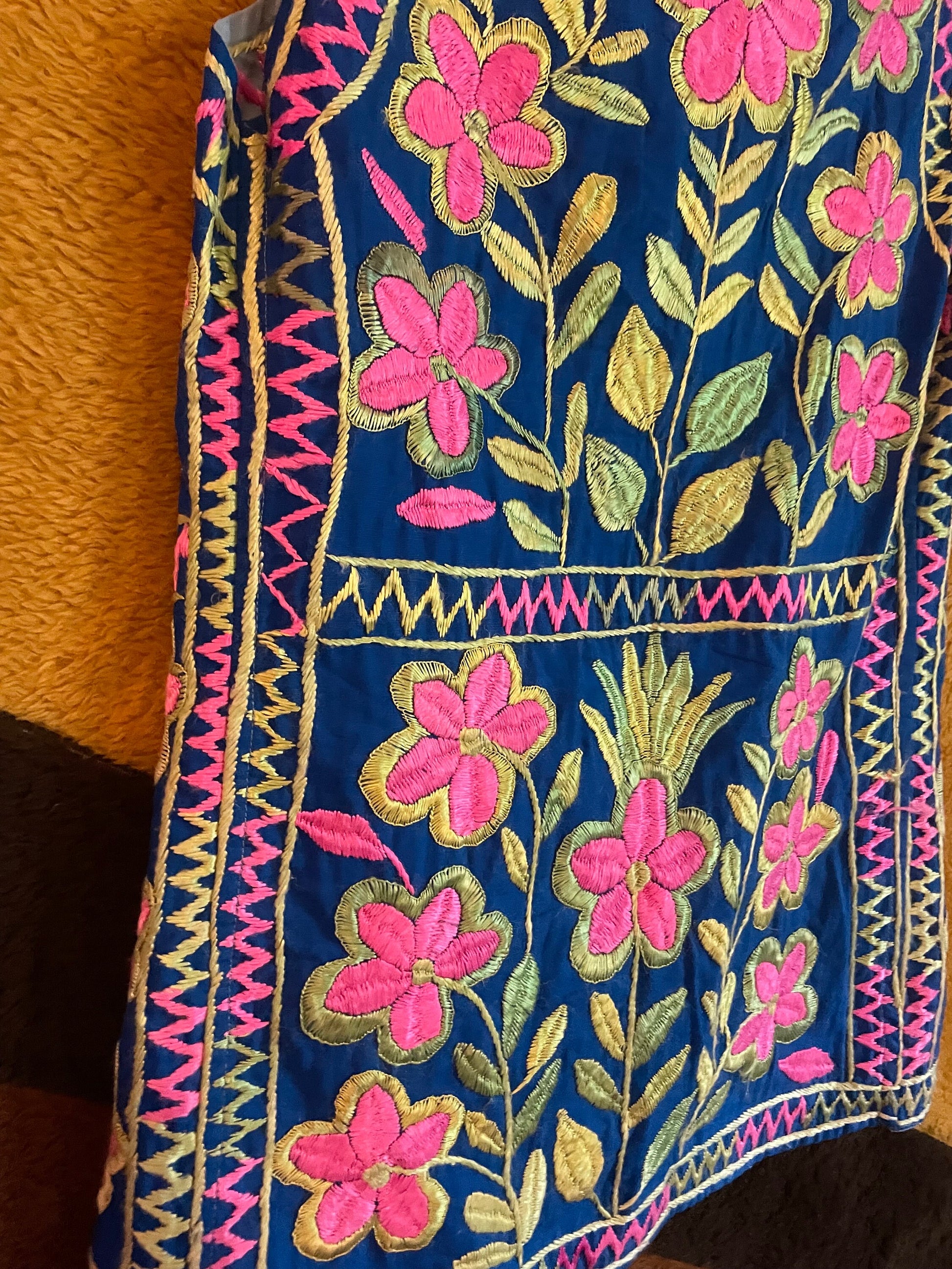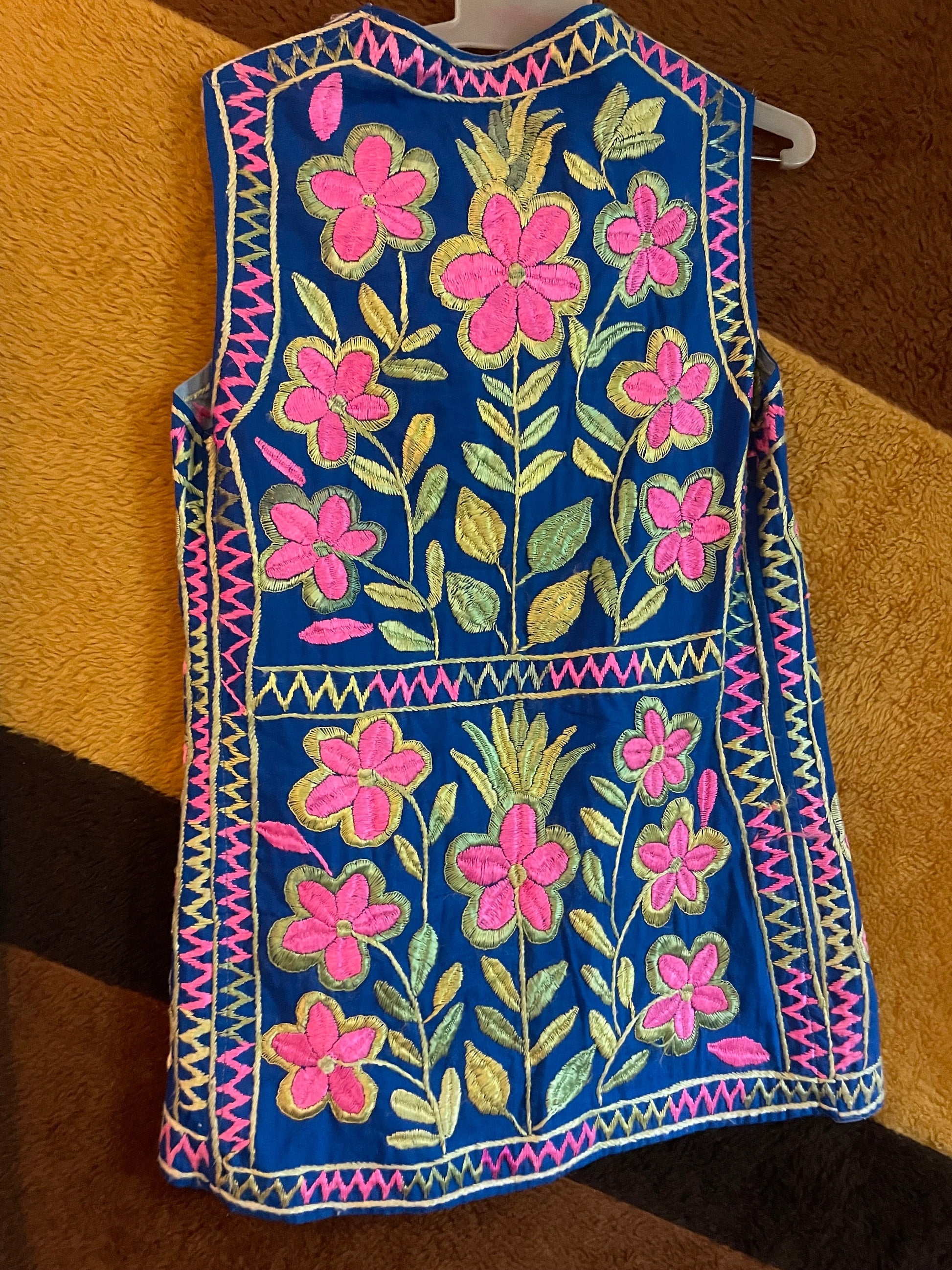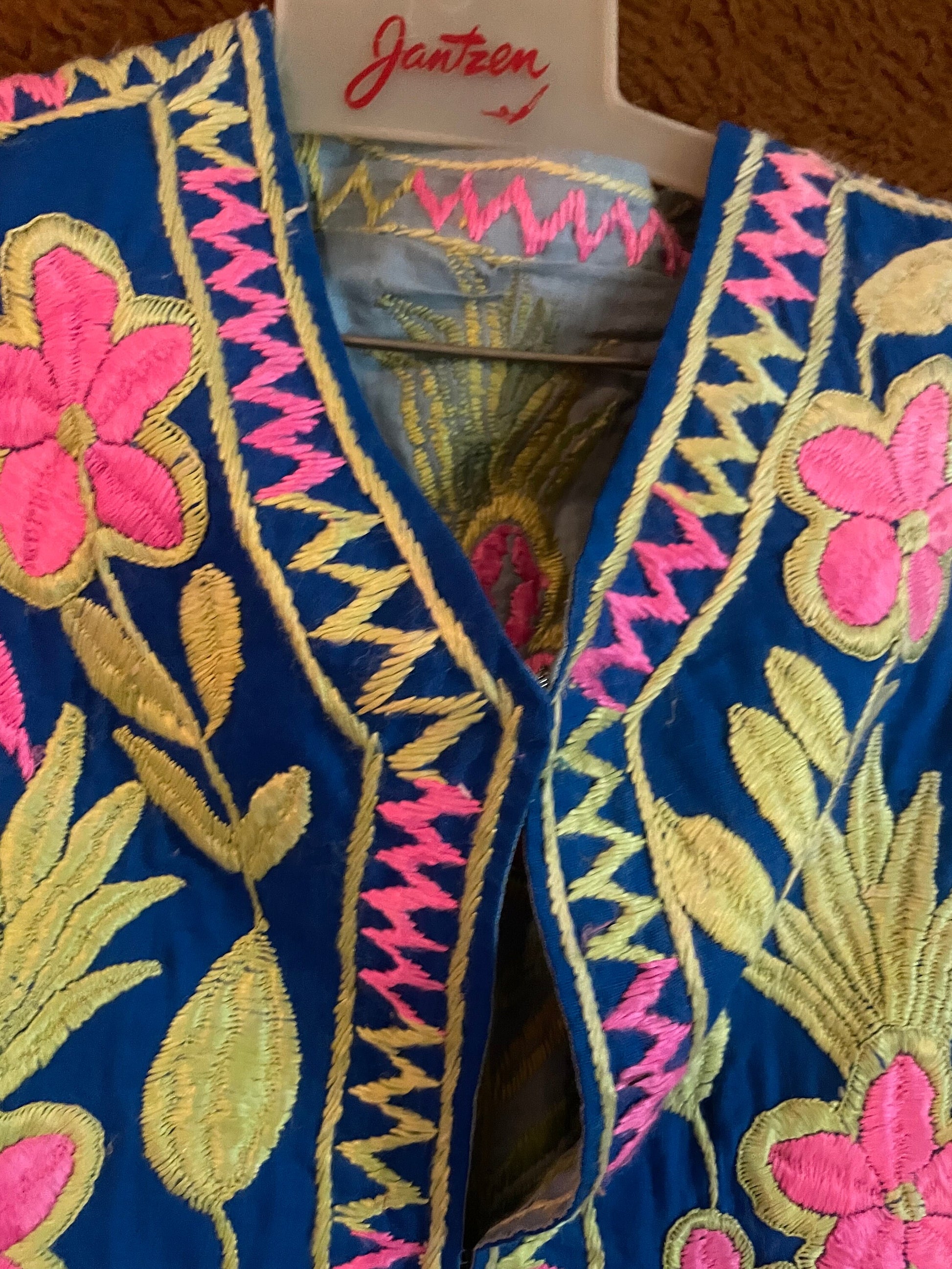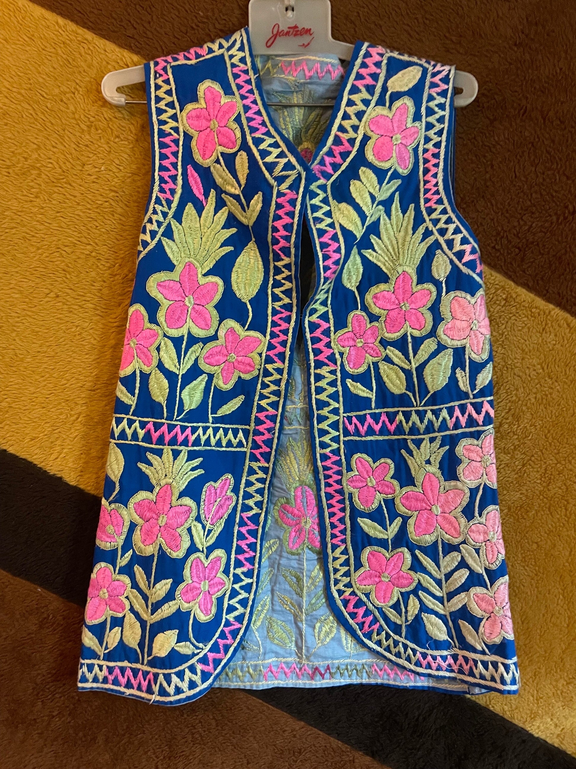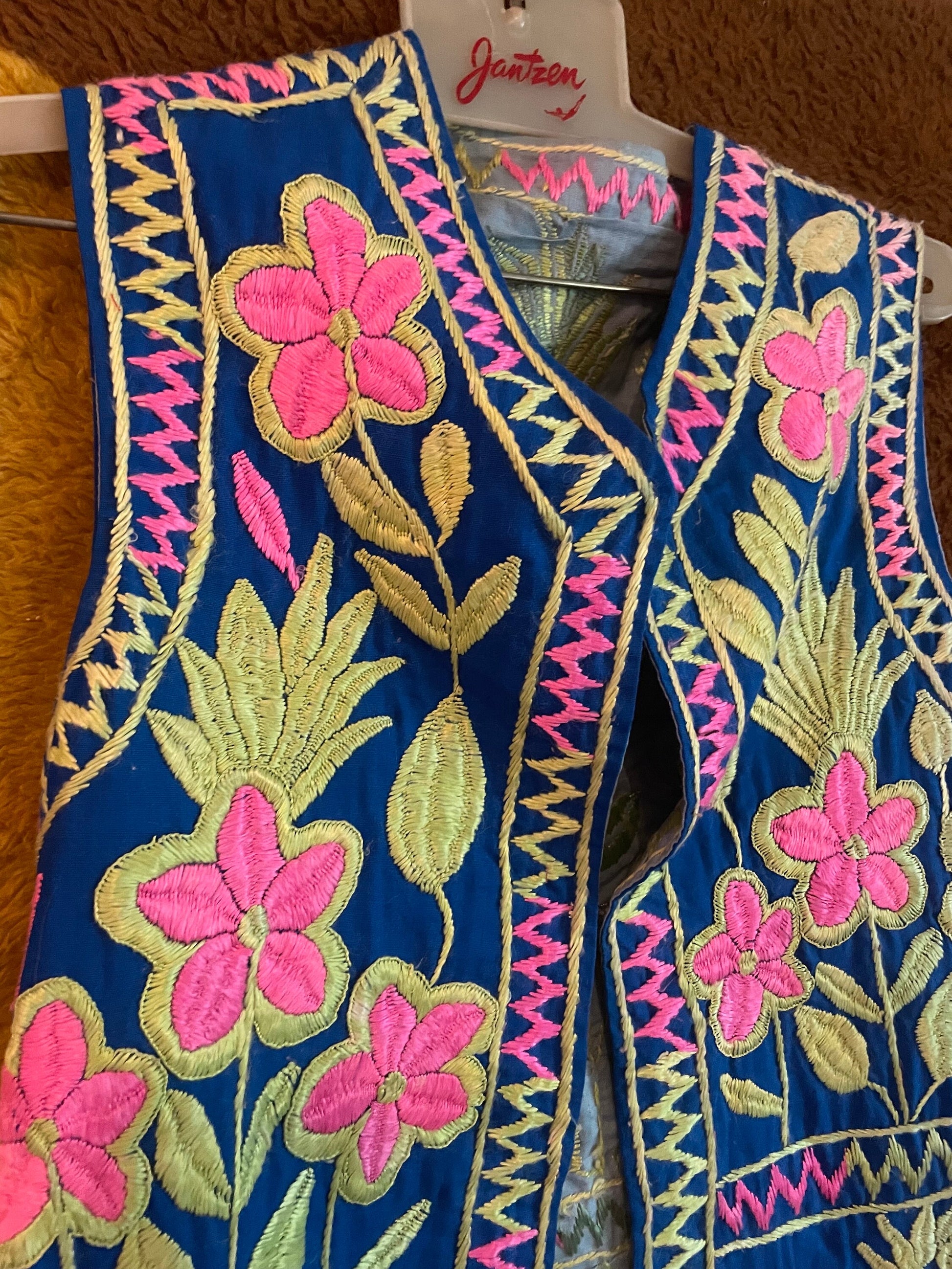 vtg 60s embroidered waistcoat blue & pink floral tapestry vest bright neon hippie kitschy hand embroidered psychedelic long vest zig zag afghan ethnic