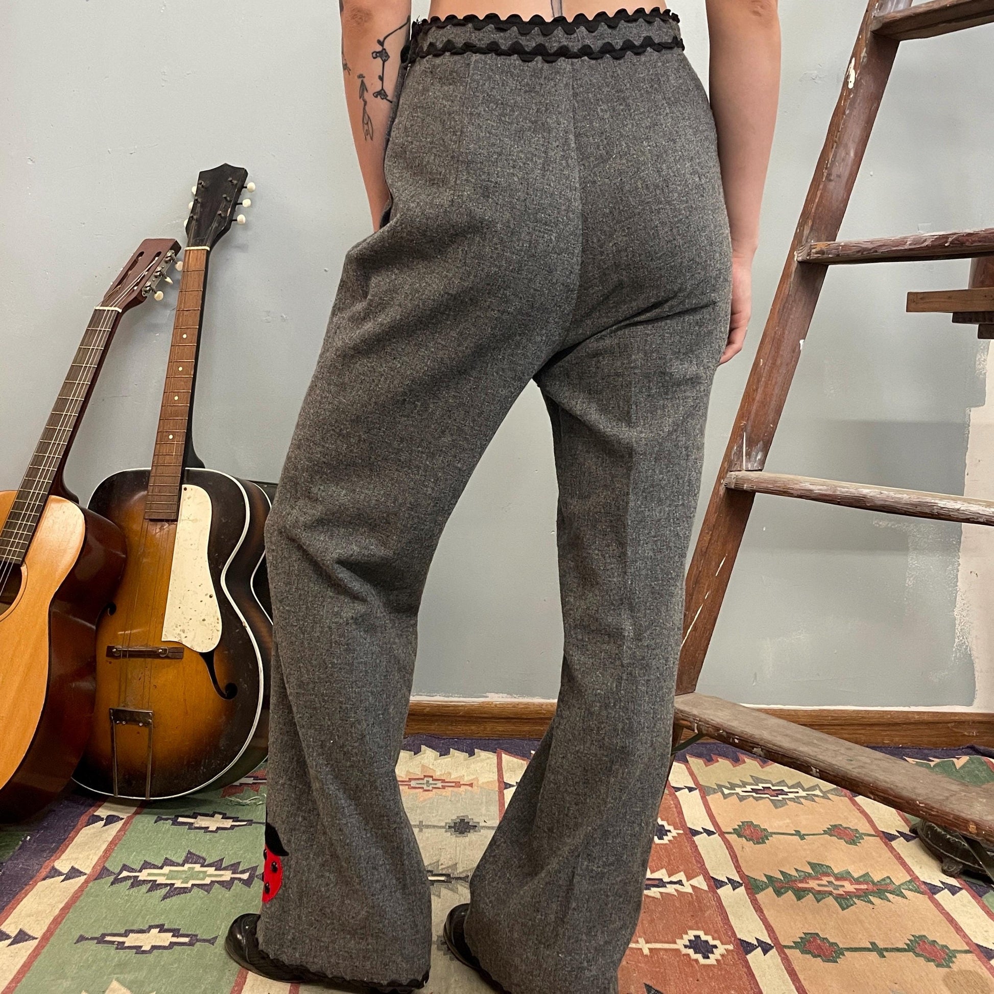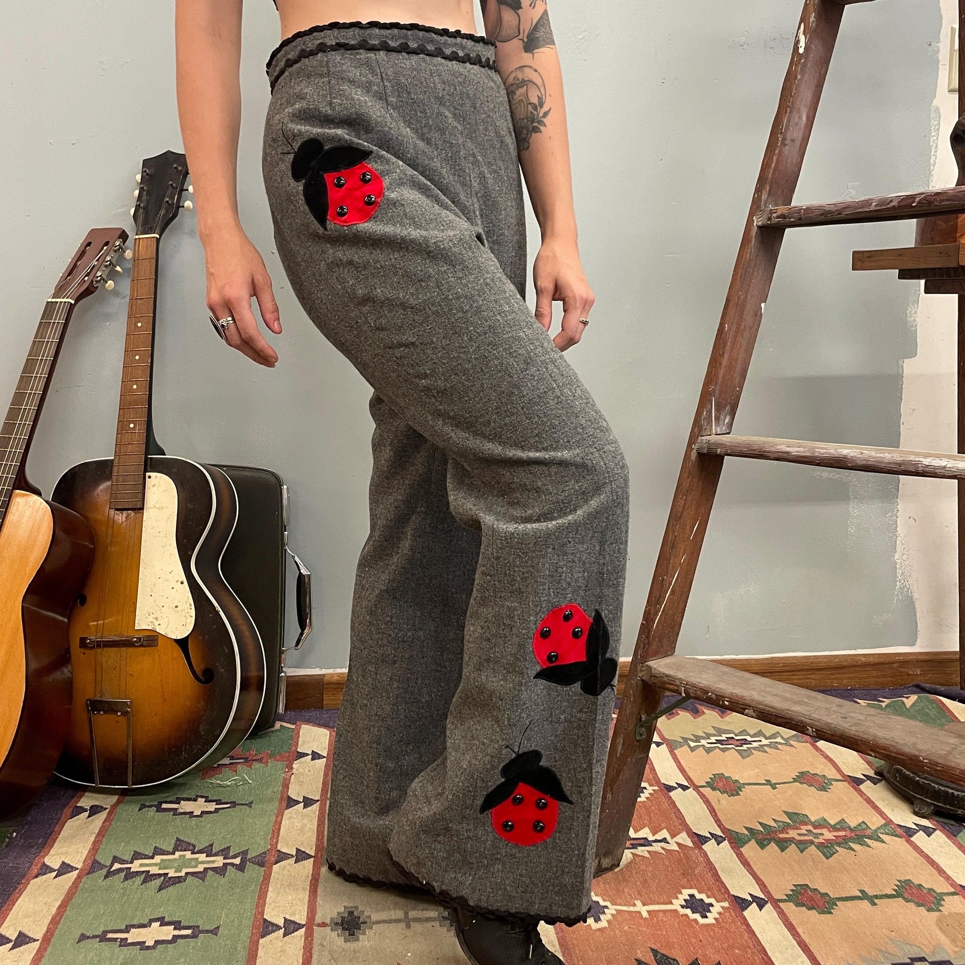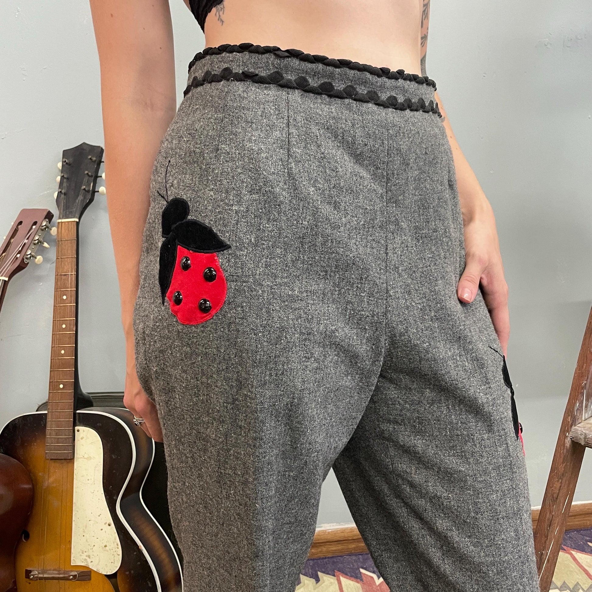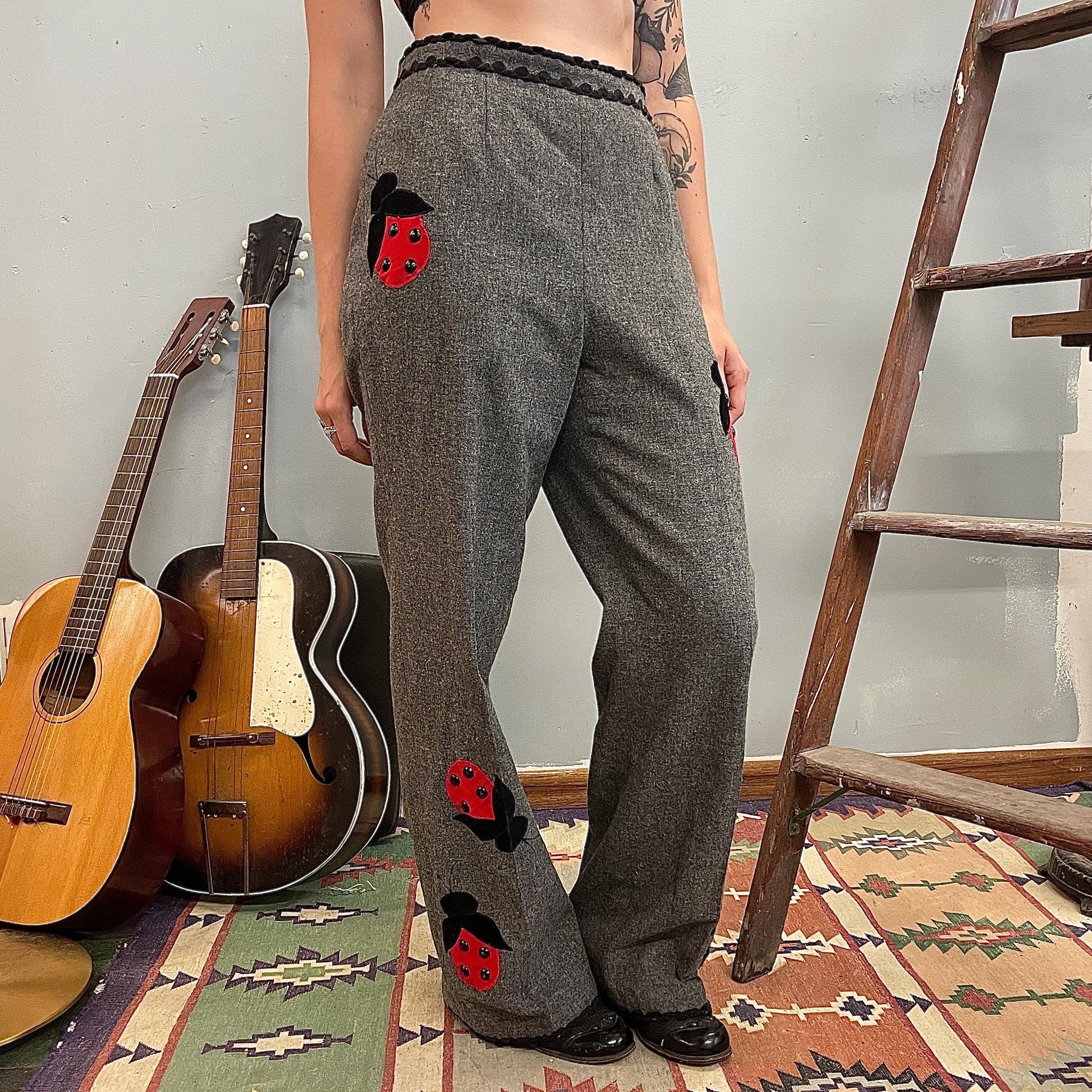 vtg 60s LADYBUG PANTS // bug patches St. Louis grey wool ric rac trousers high waisted flare pants dressy unique mod patchwork twee hippie