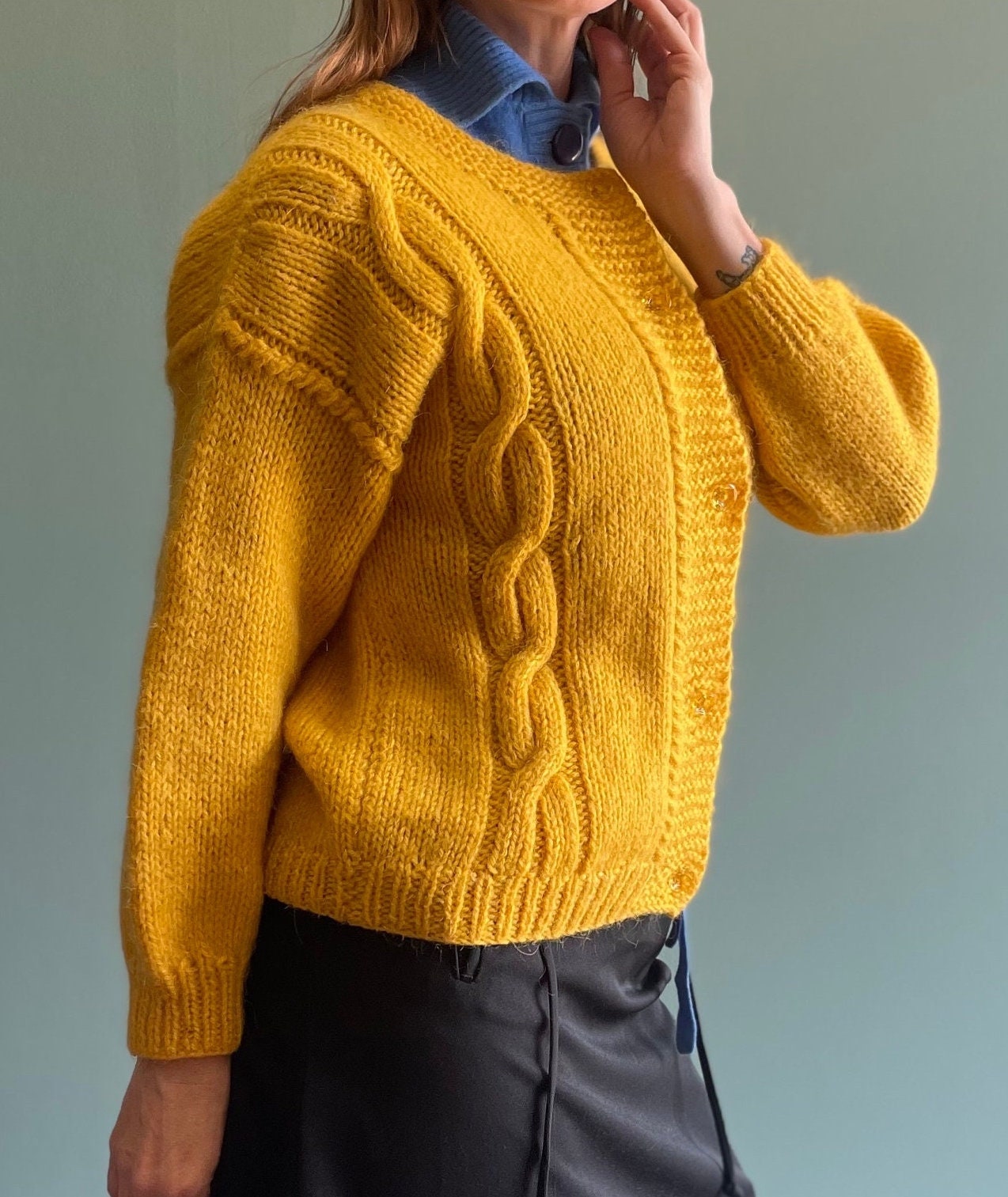 Vintage 60s Marigold Mohair Cardigan / Mustard Yellow Sweater /60s Bright Sweater / Cable Knit Jumper