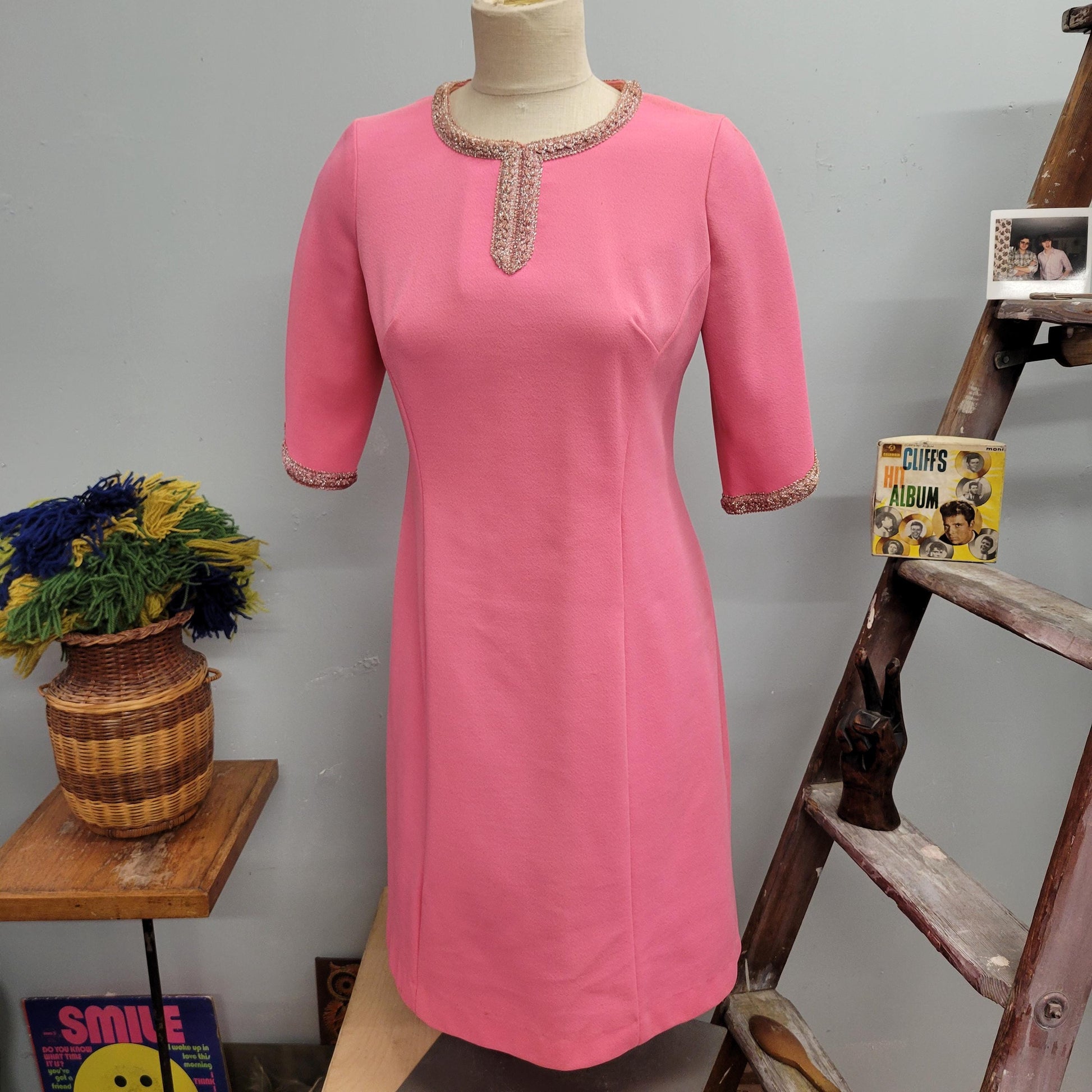 vtg 60s MOD PINK TINSEL Dress // vintage union made size 14 1/2 large beaded embellished tinsel trim barbie pink split flare sleeve keyhole