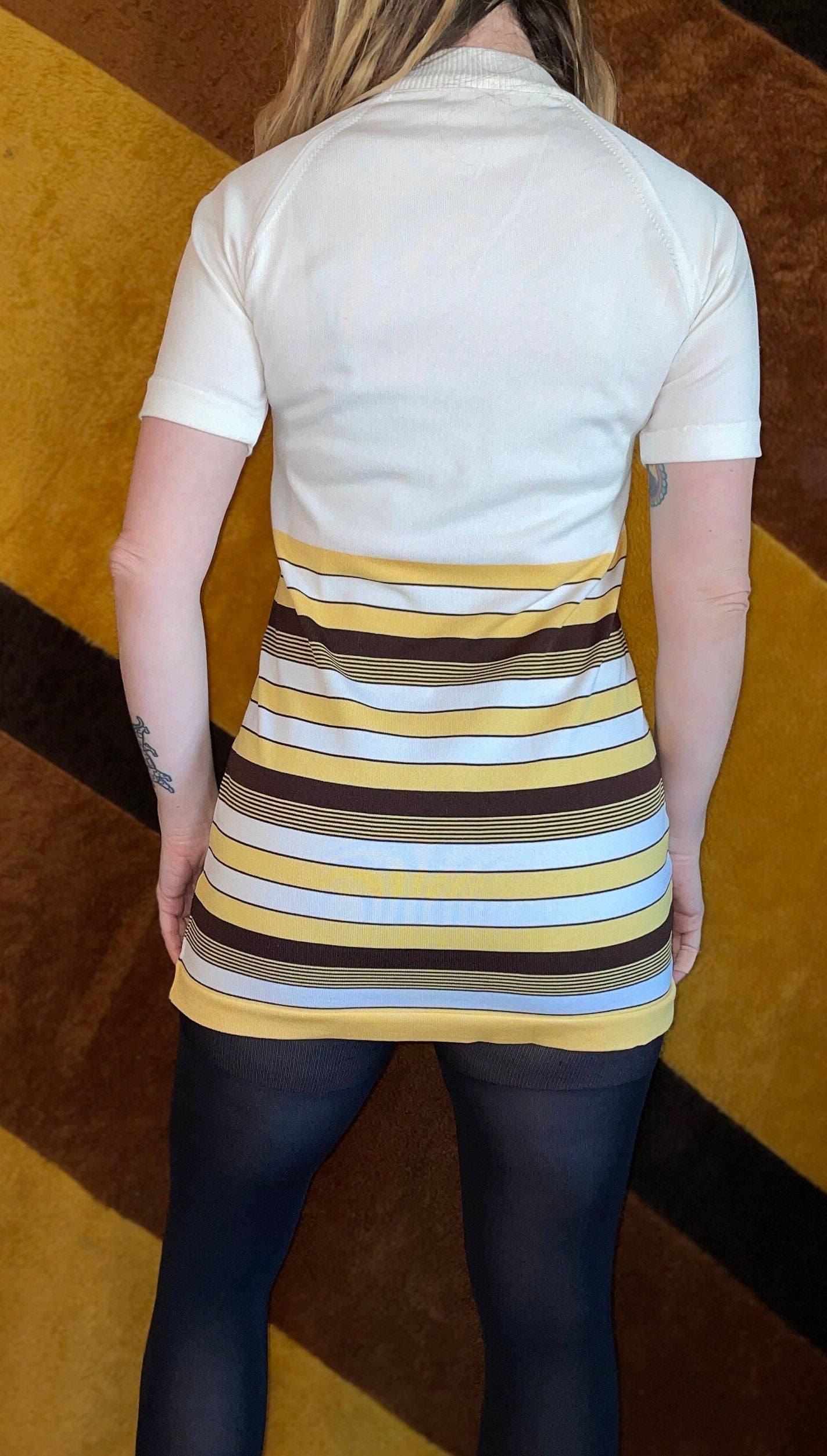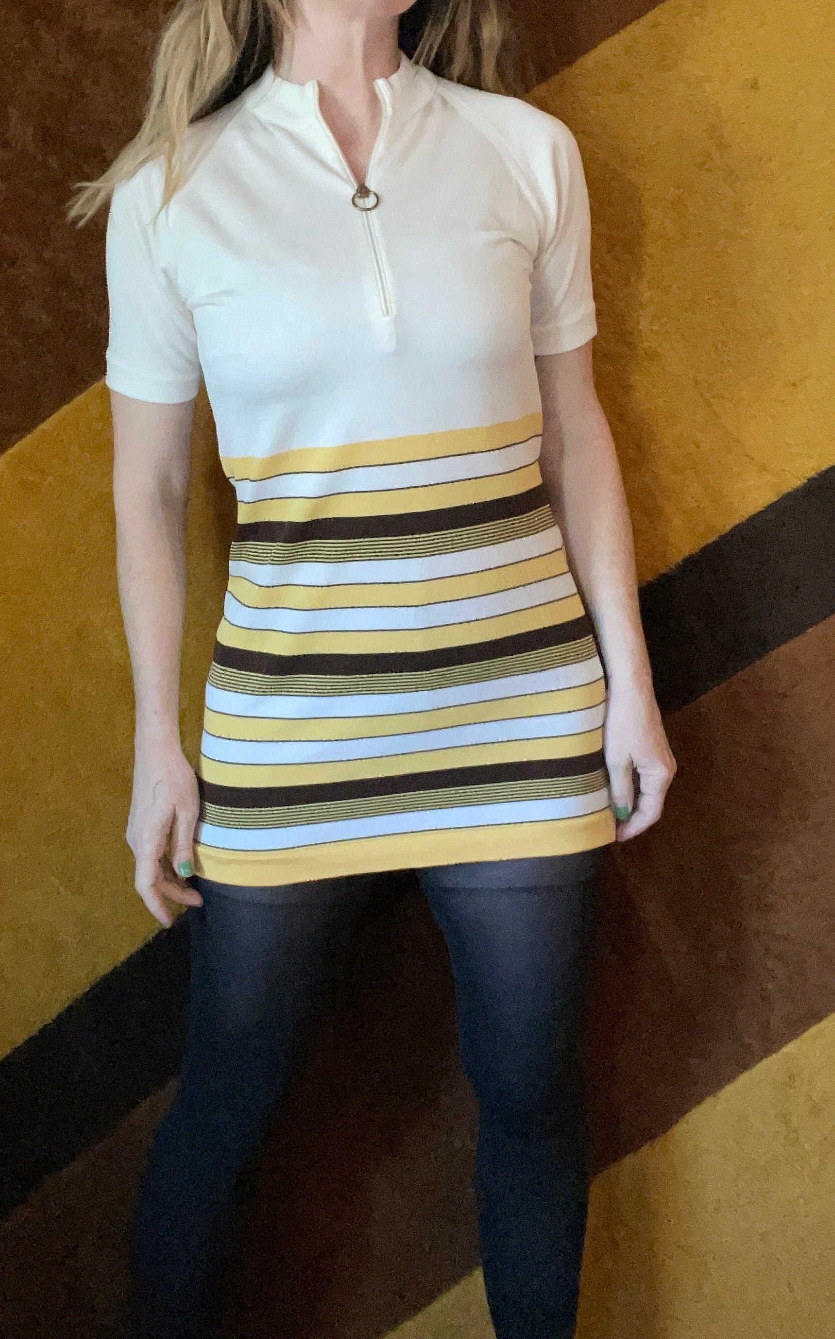 vtg 60s mod yellow & brown teen spirit striped short mini dress go go retro scooter dress zip up space age tri tone cute summer dress
