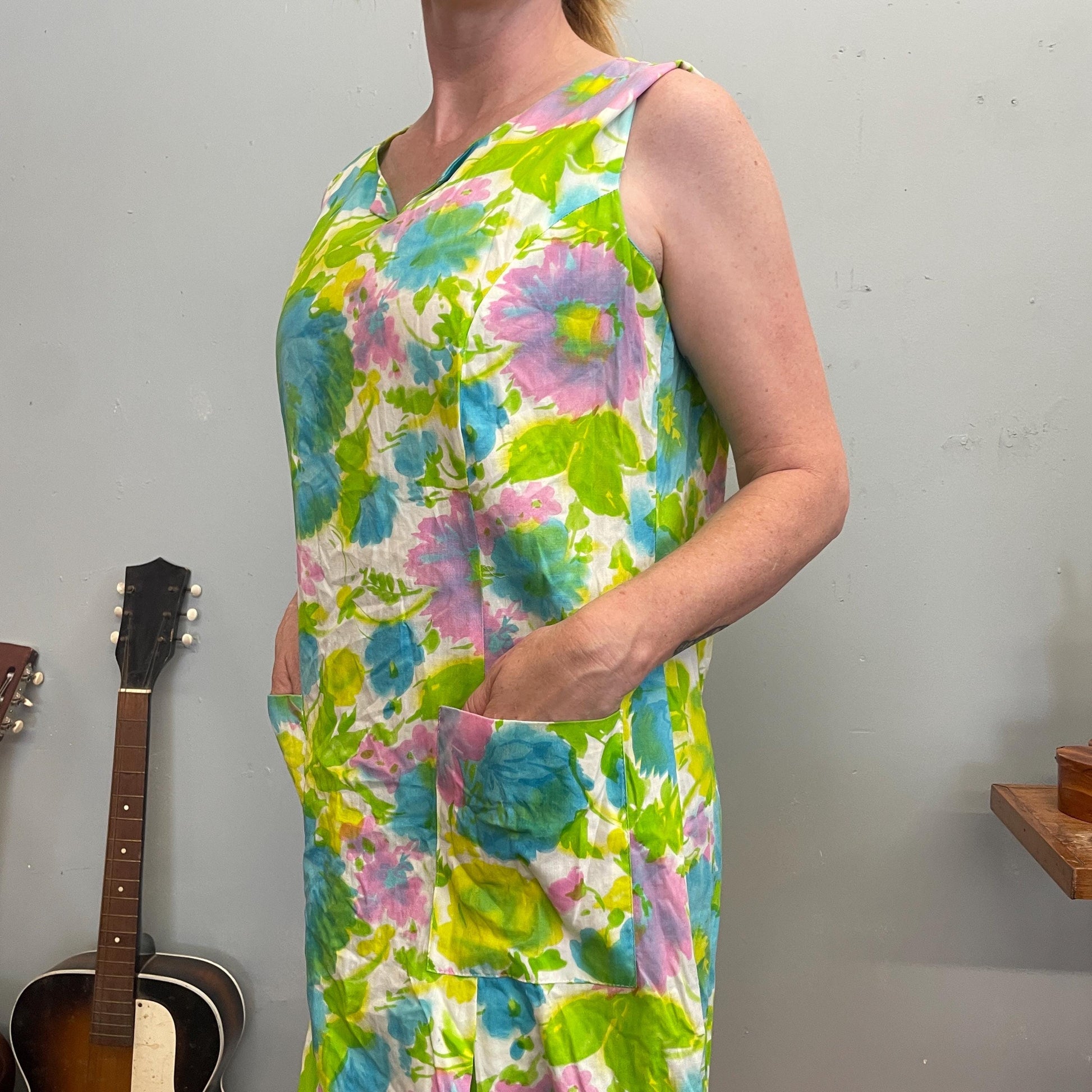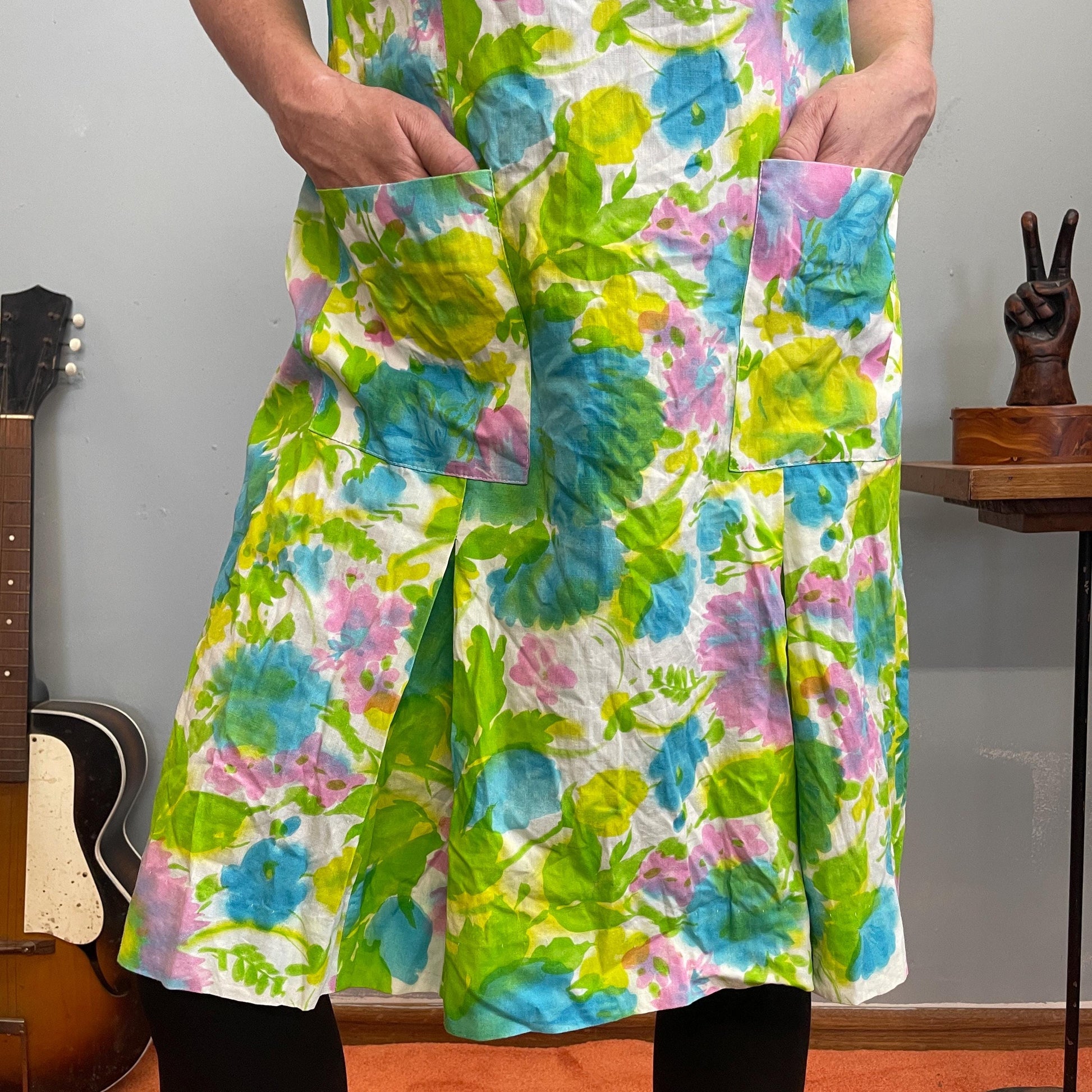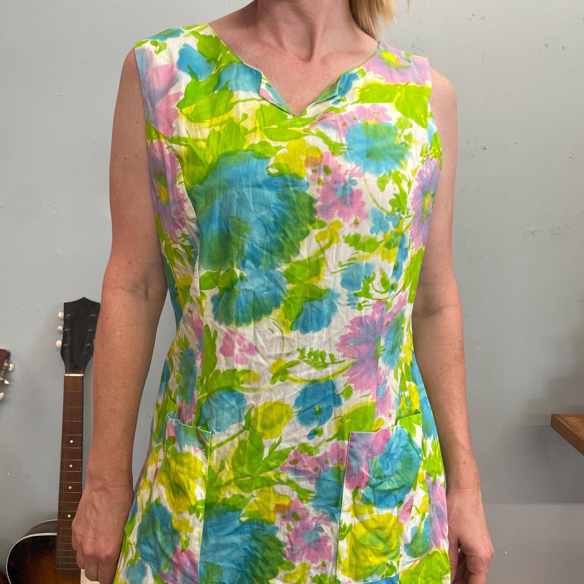 vtg 60s PASTEL FLORAL DRESS // soft rayon cotton watercolor pocket shift dress neon green mod retro flower power smock pleated mini scooter