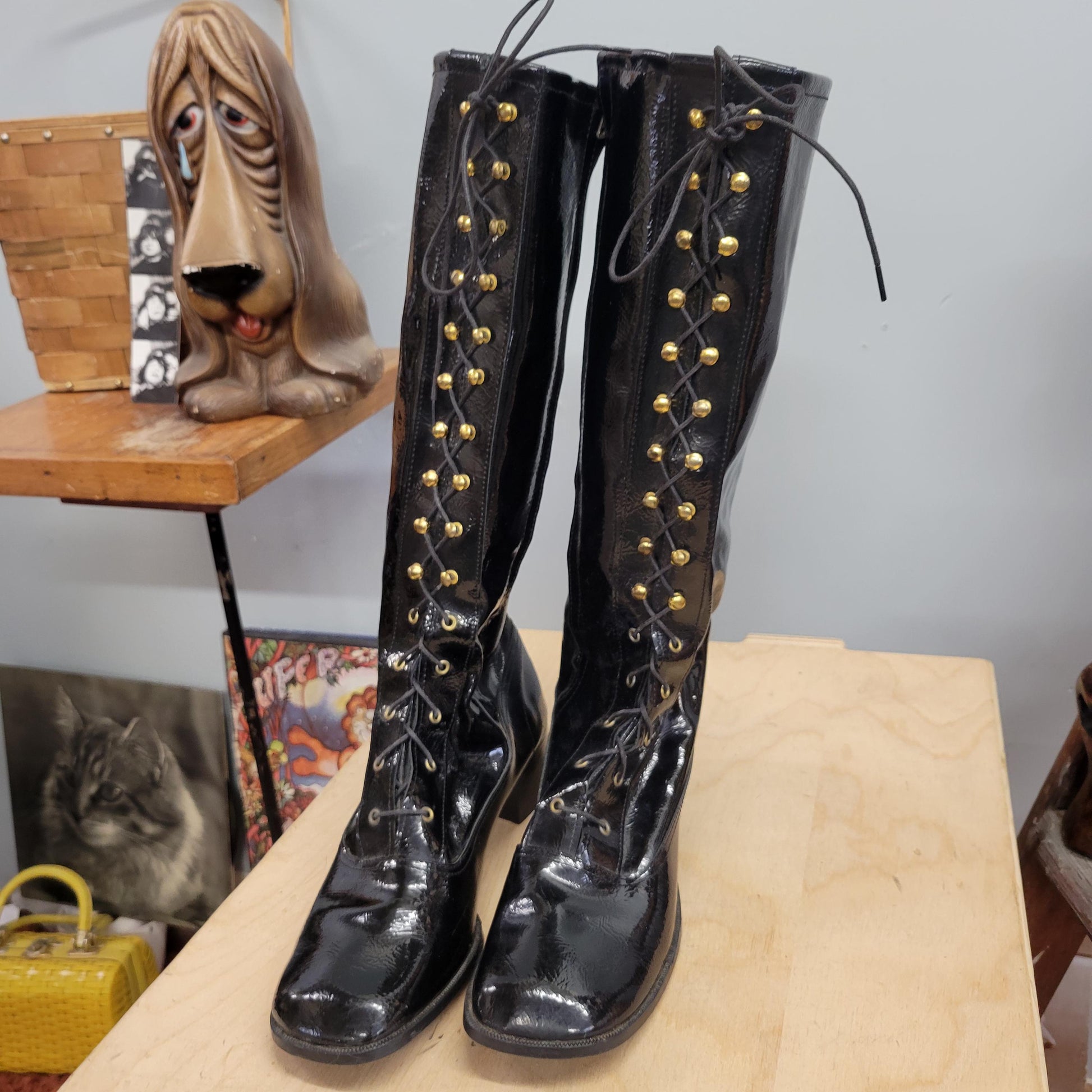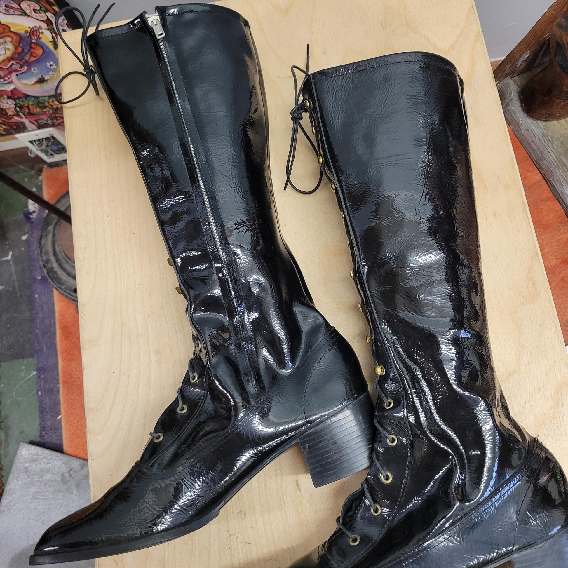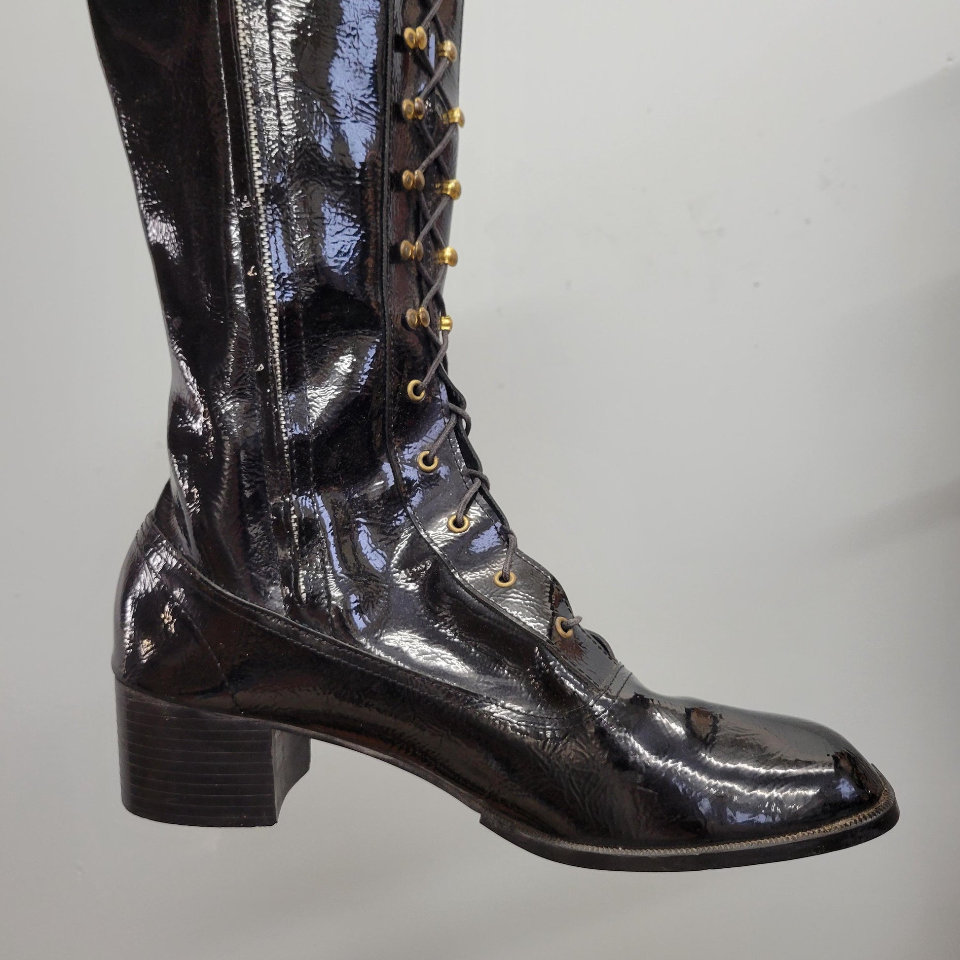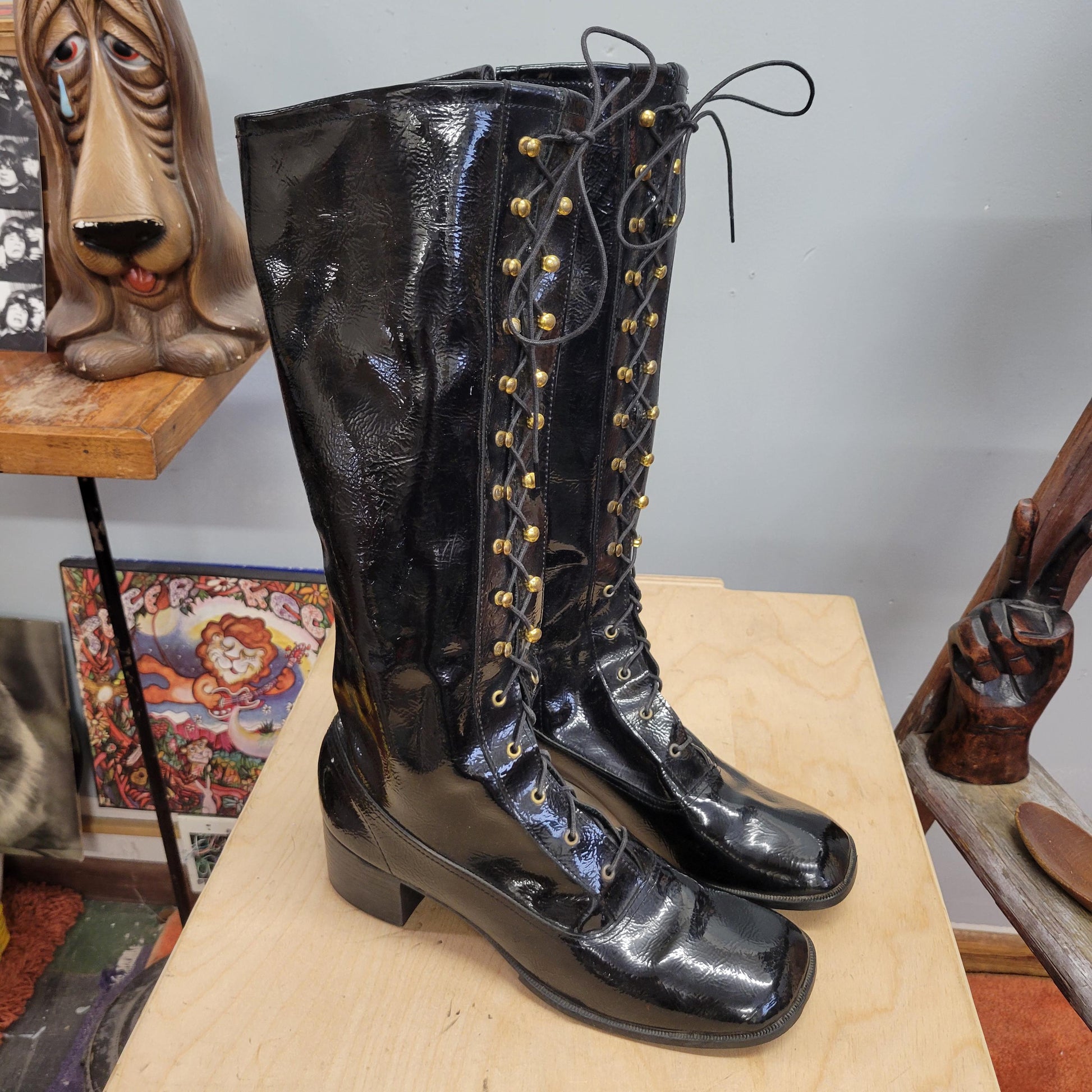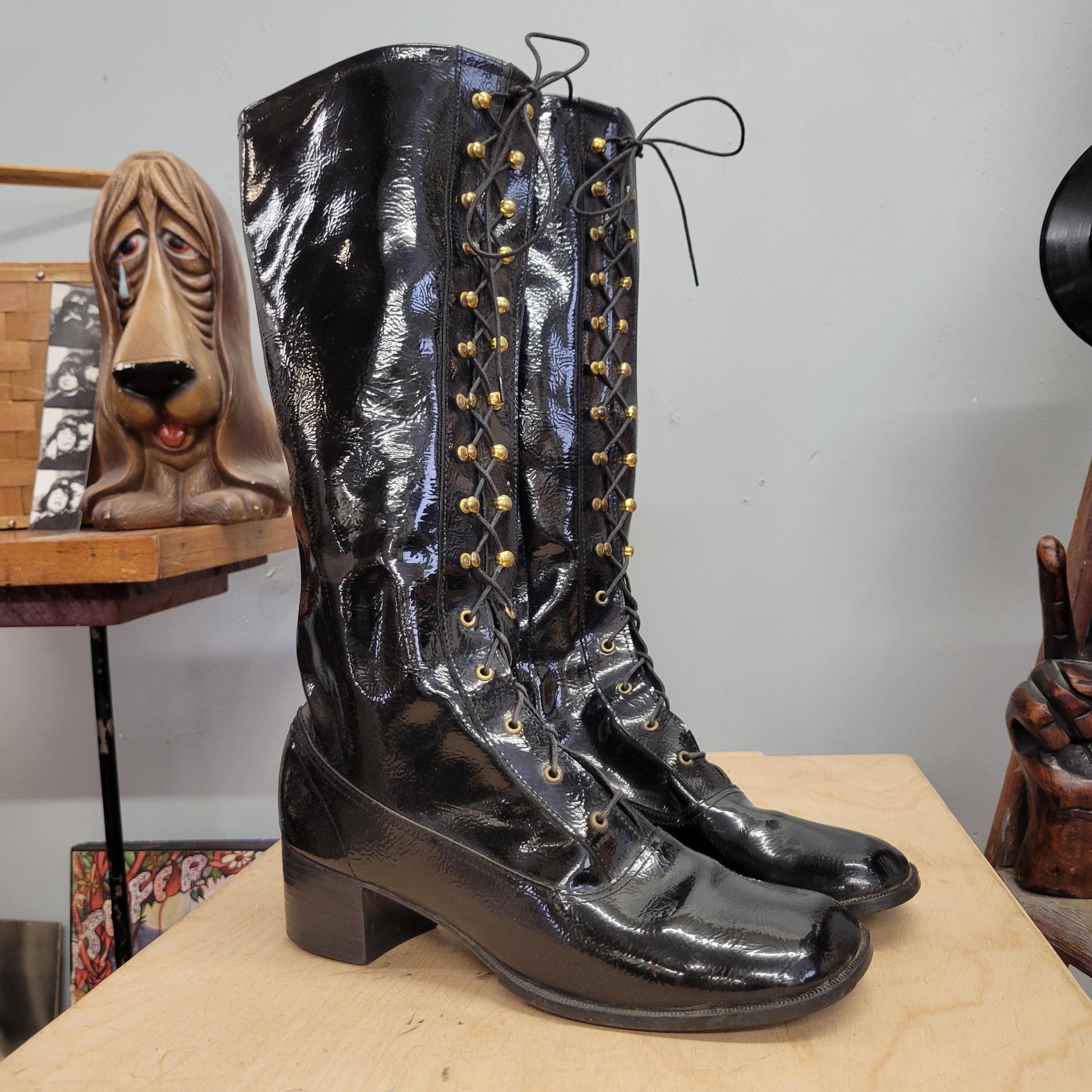 vtg 60s PATENT LEATHER BOOTS // vintage womens 10 lace up go go boots retro mod shiny black knee high zip up gothic wet look autumn winter