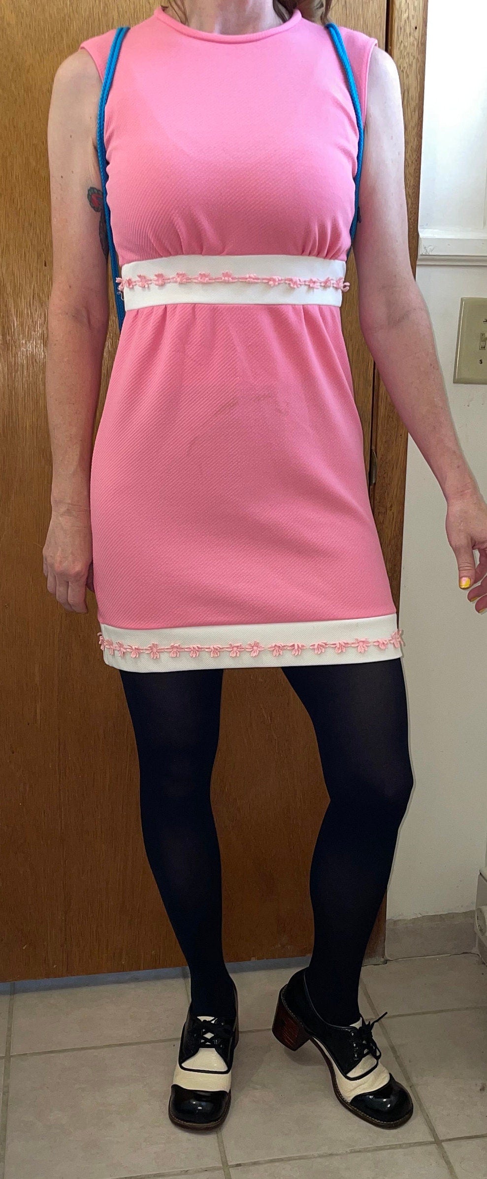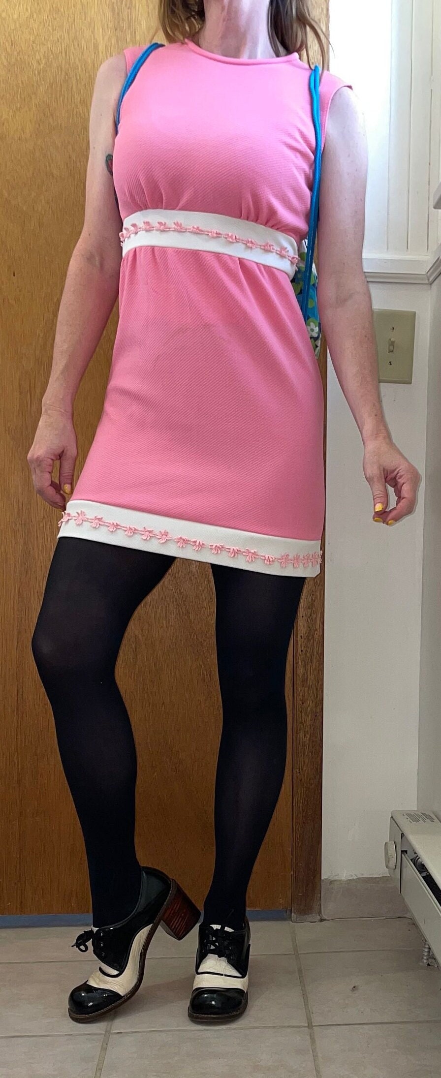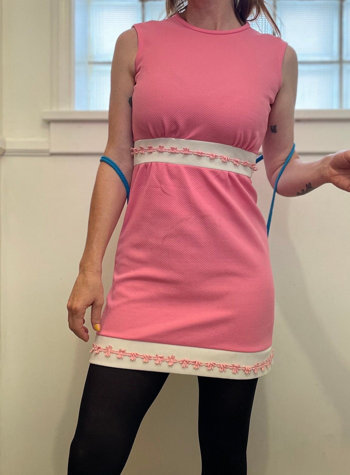 Vintage 60s Baby Pink Mod Dress / Retro Floral Applique Two Tone Mini Dress