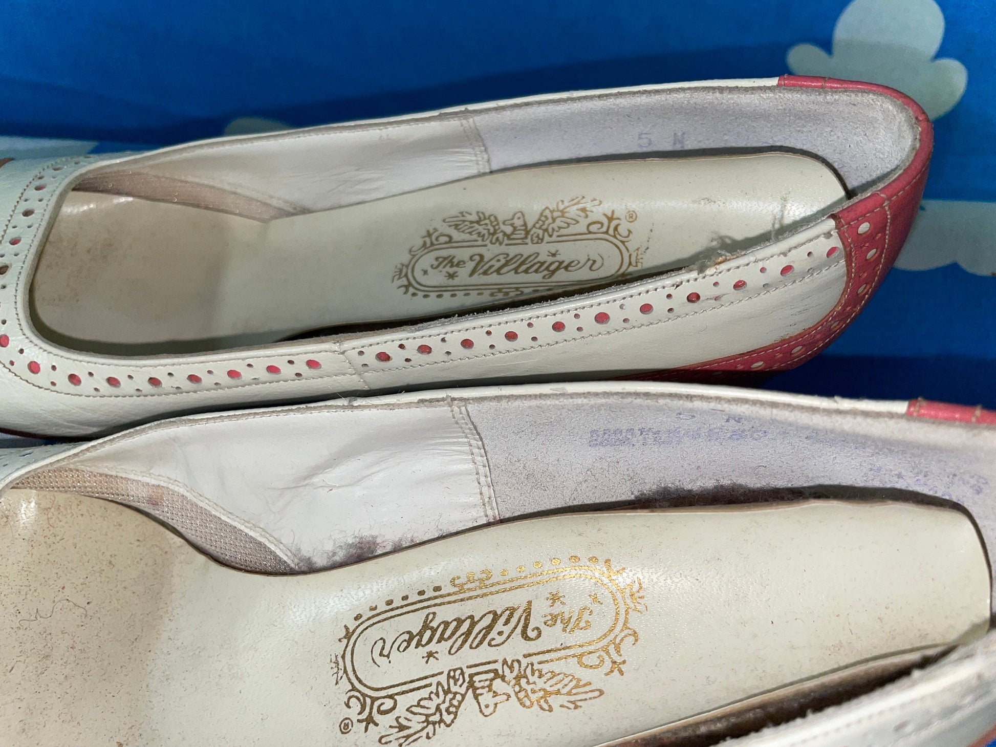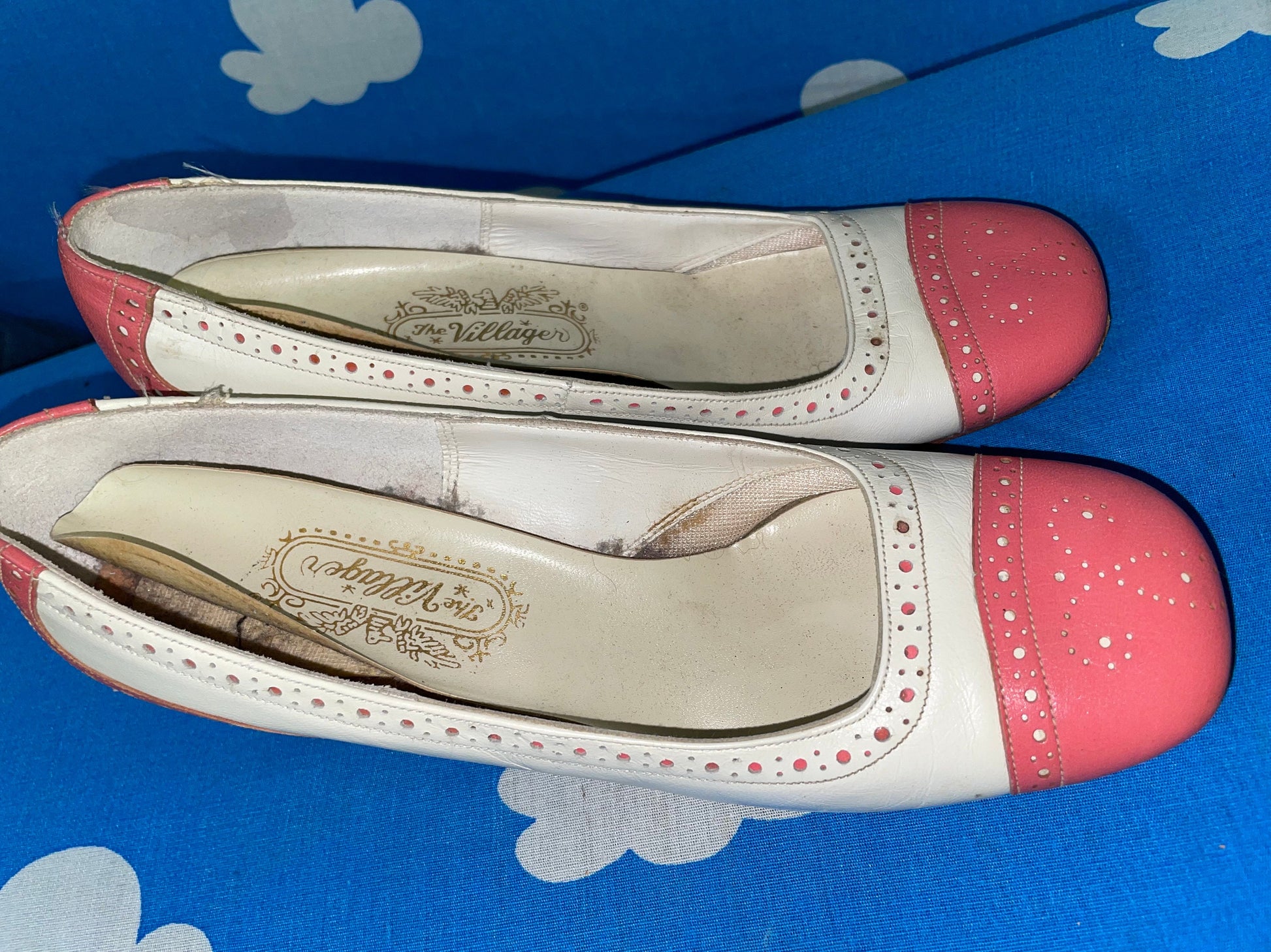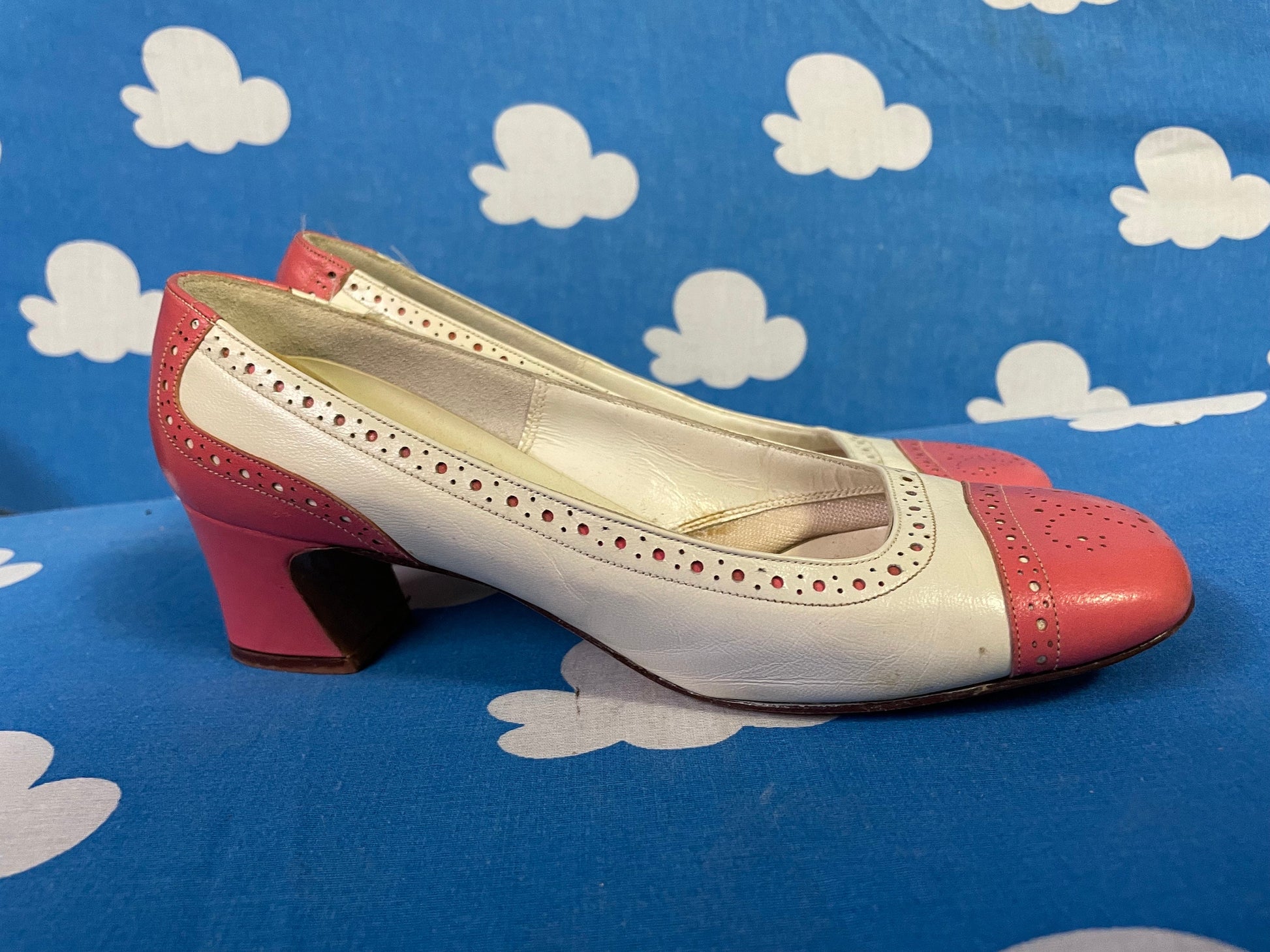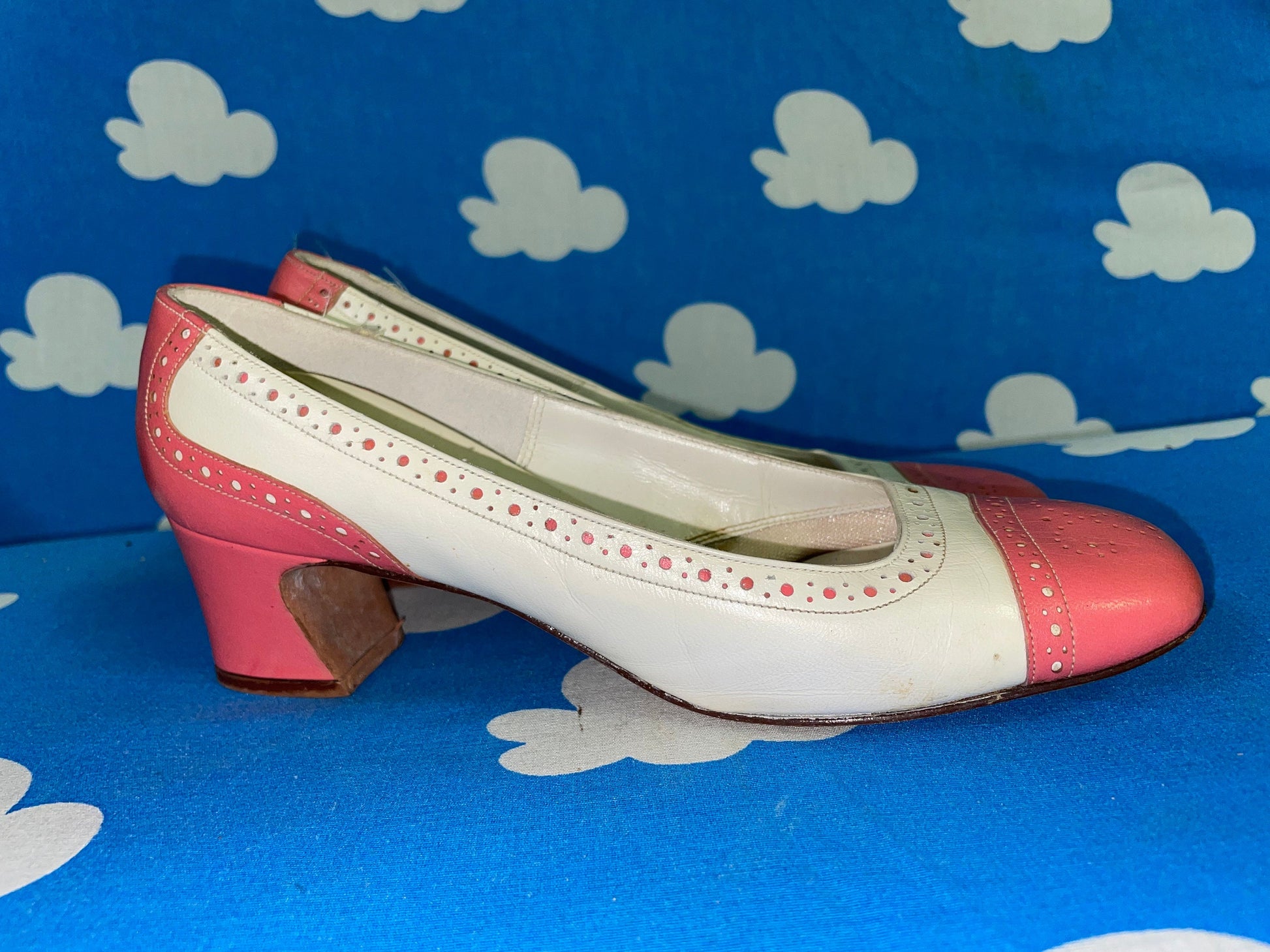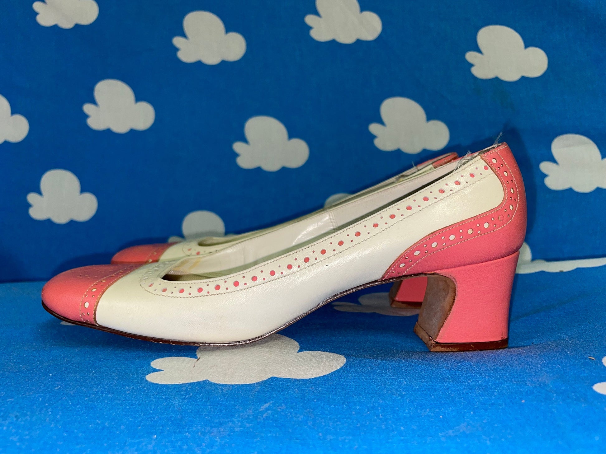 vtg 60s PINK & WHITE MOD Heels // bubblegum dotted round toe barbie core dandy low heels fairy cutesy baby pastel pink two tone spectators