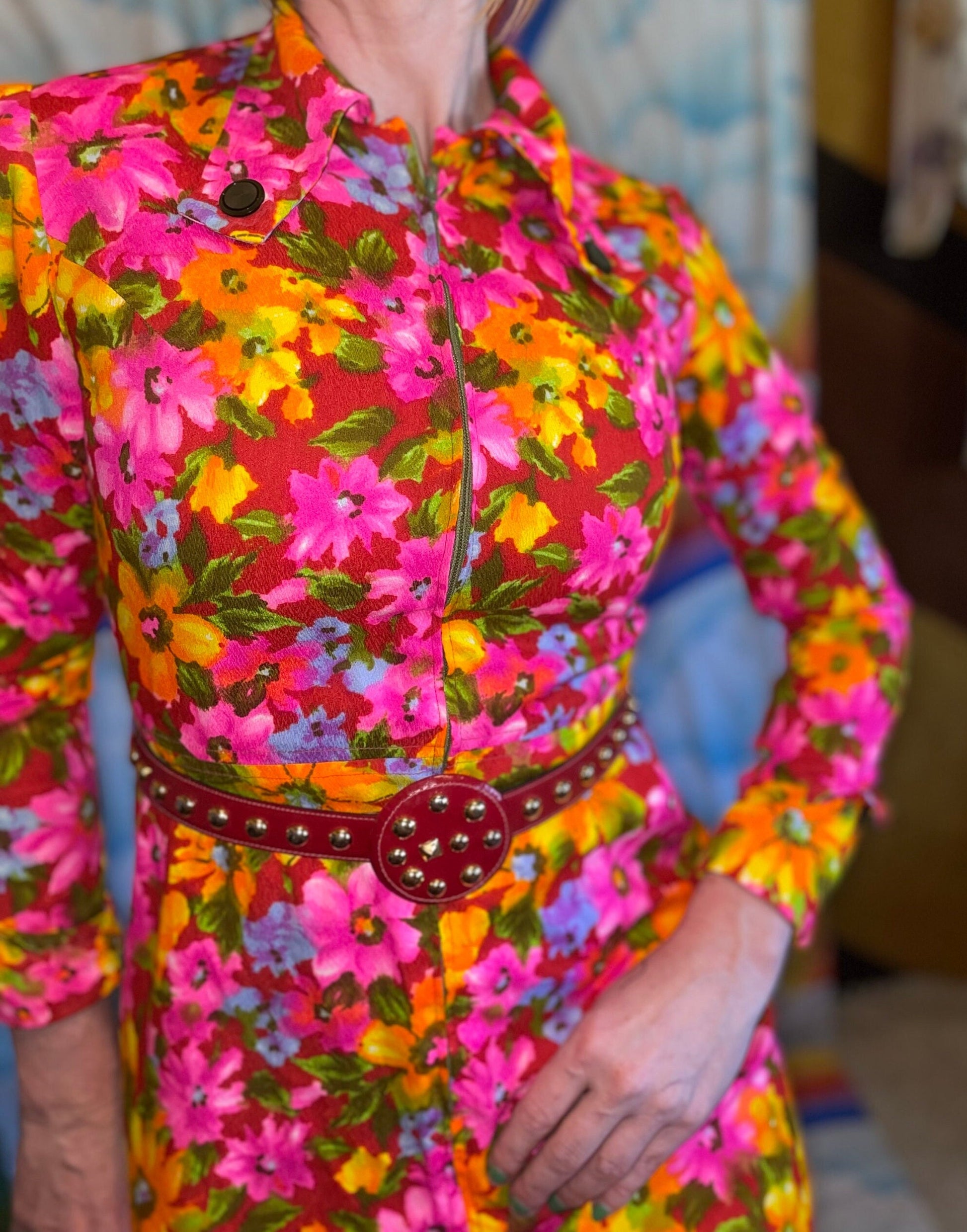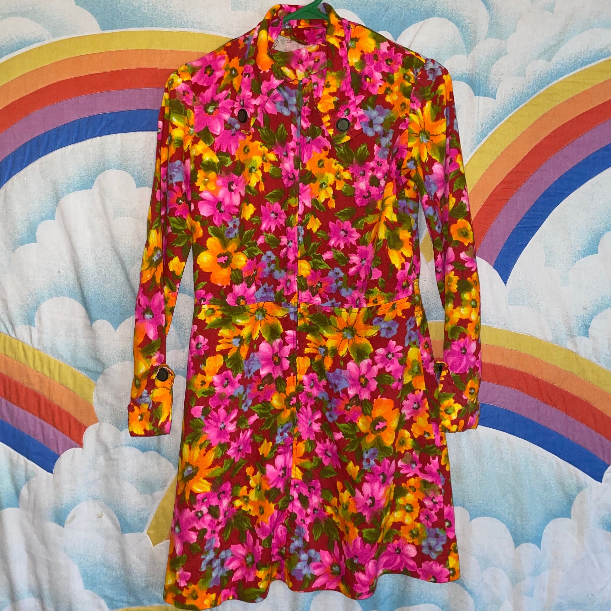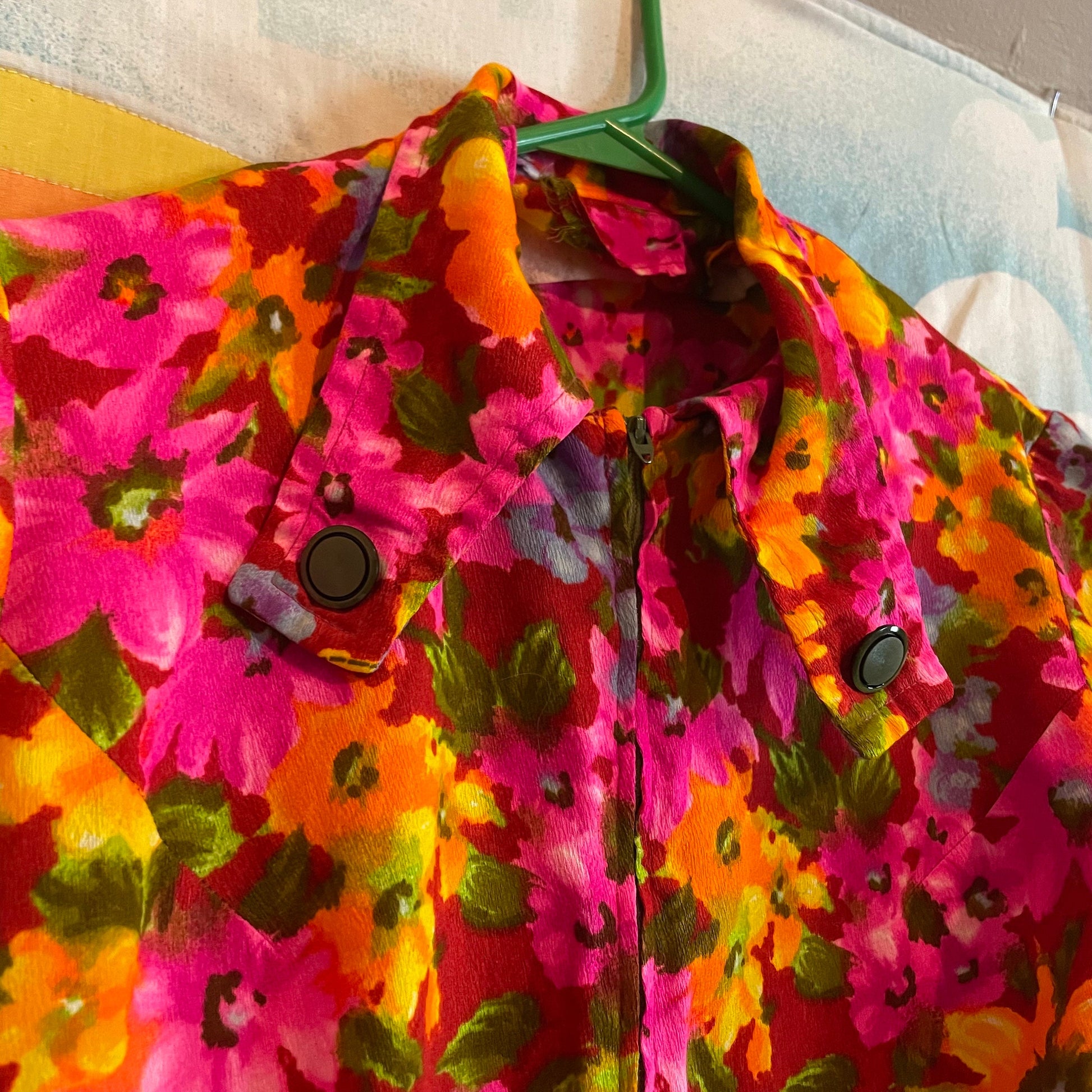 vtg 60s psychedelic mini dress square collar neon floral zip up mod hippie retro button collar petite hawaiian barkcloth pink yellow summer