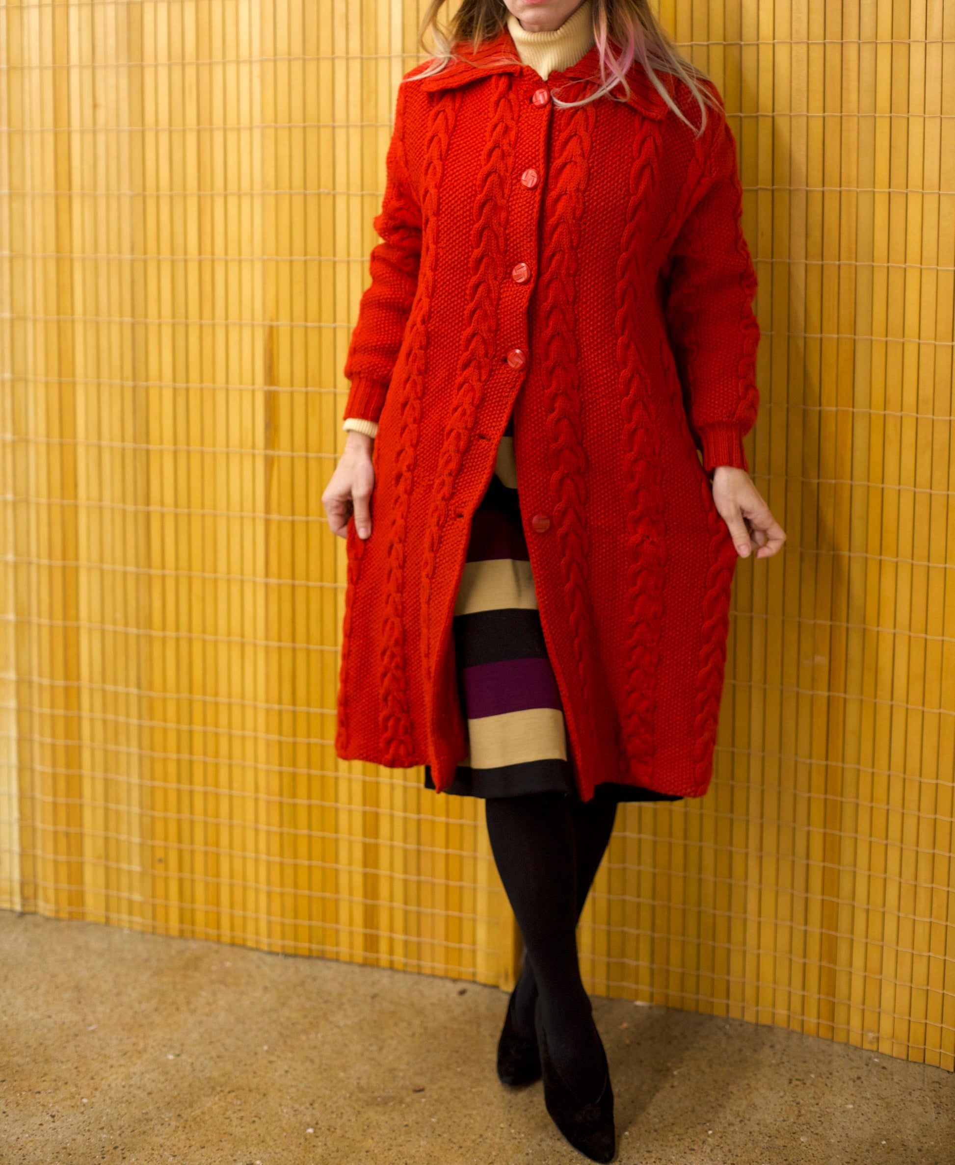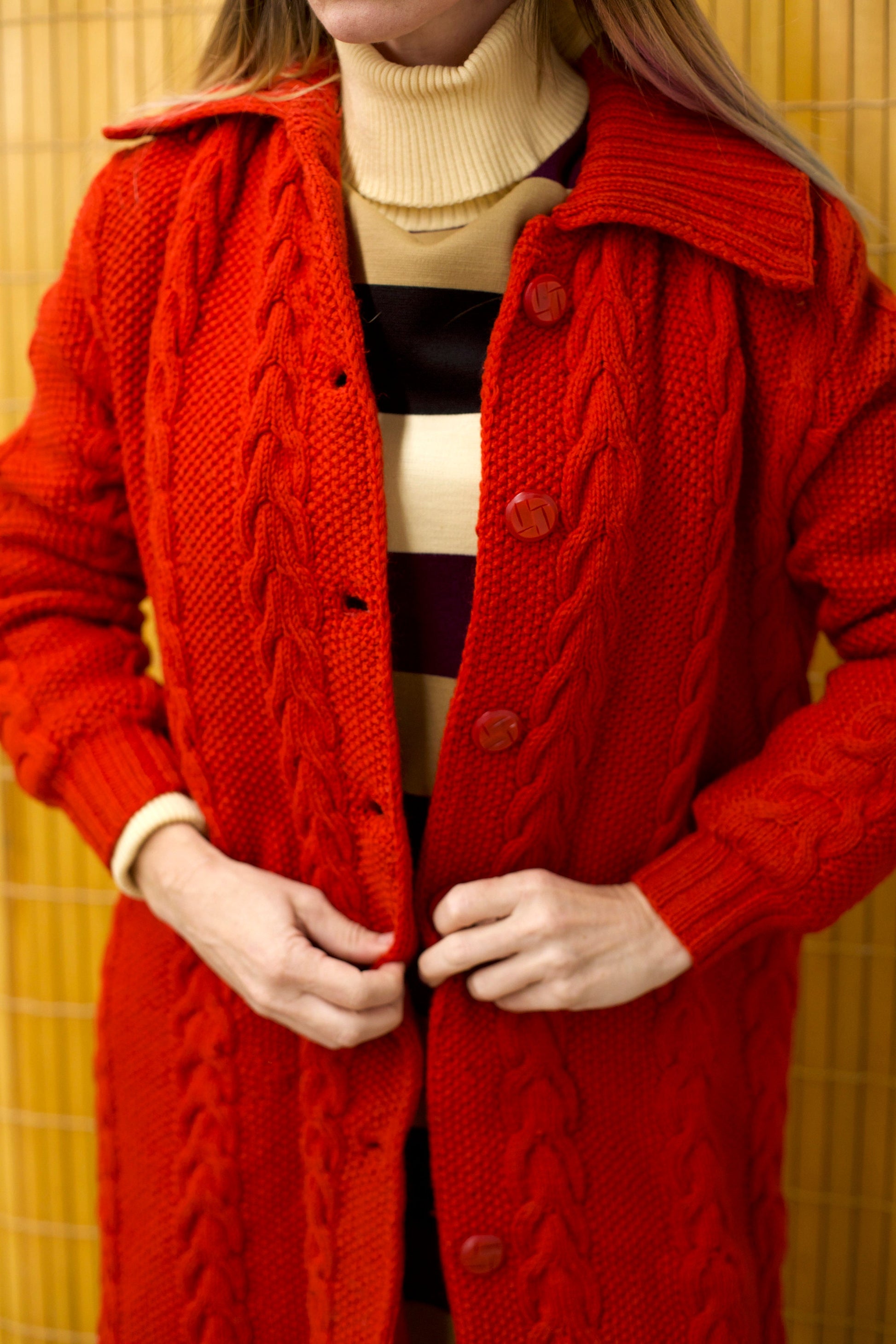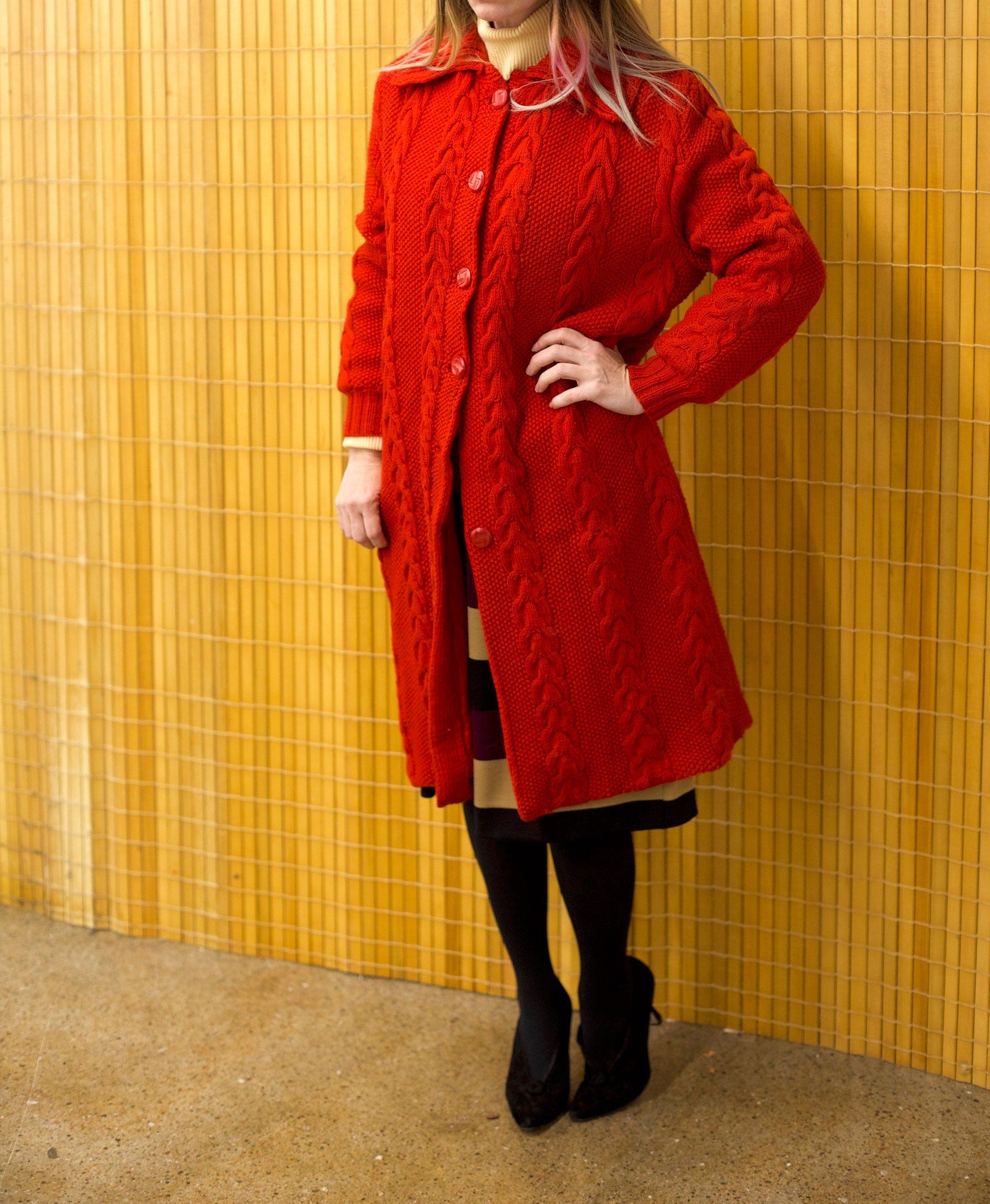 vtg 60s Red CABLE KNIT SWEATER Jacket // long knit duster petite red wool jacket winter buttons heavy cardigan style collared warm overcoat