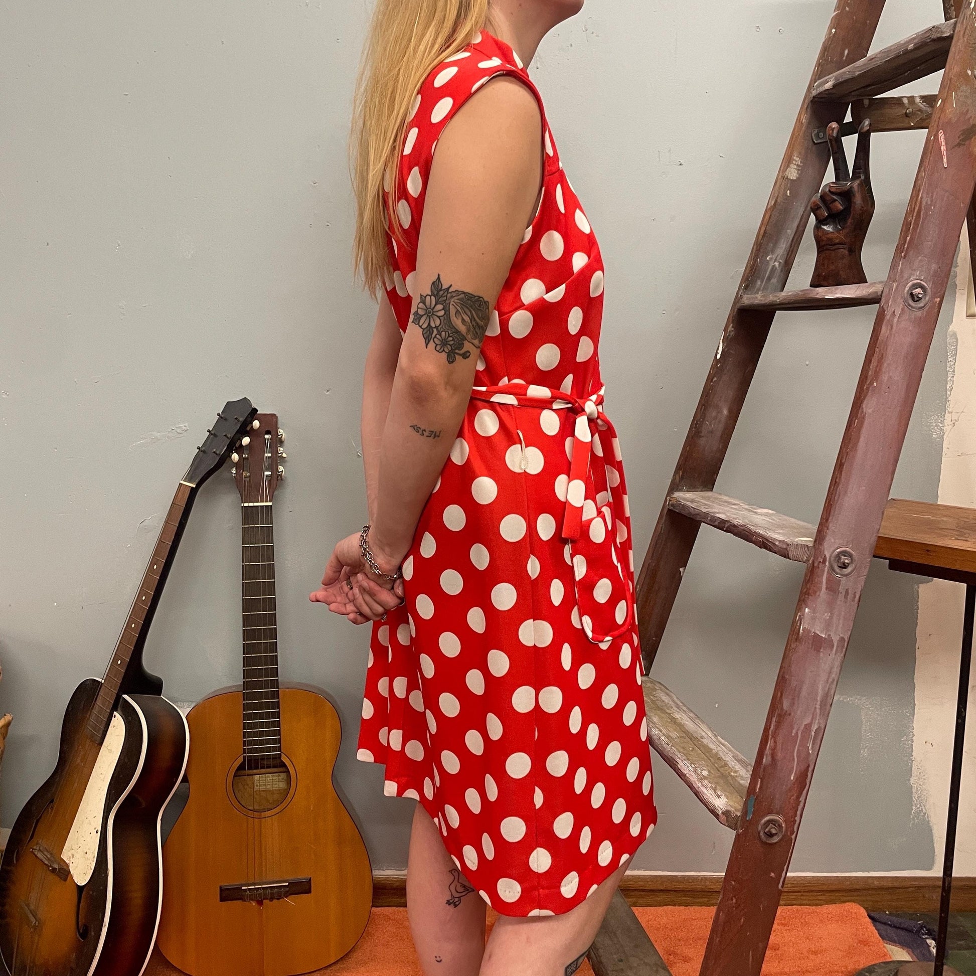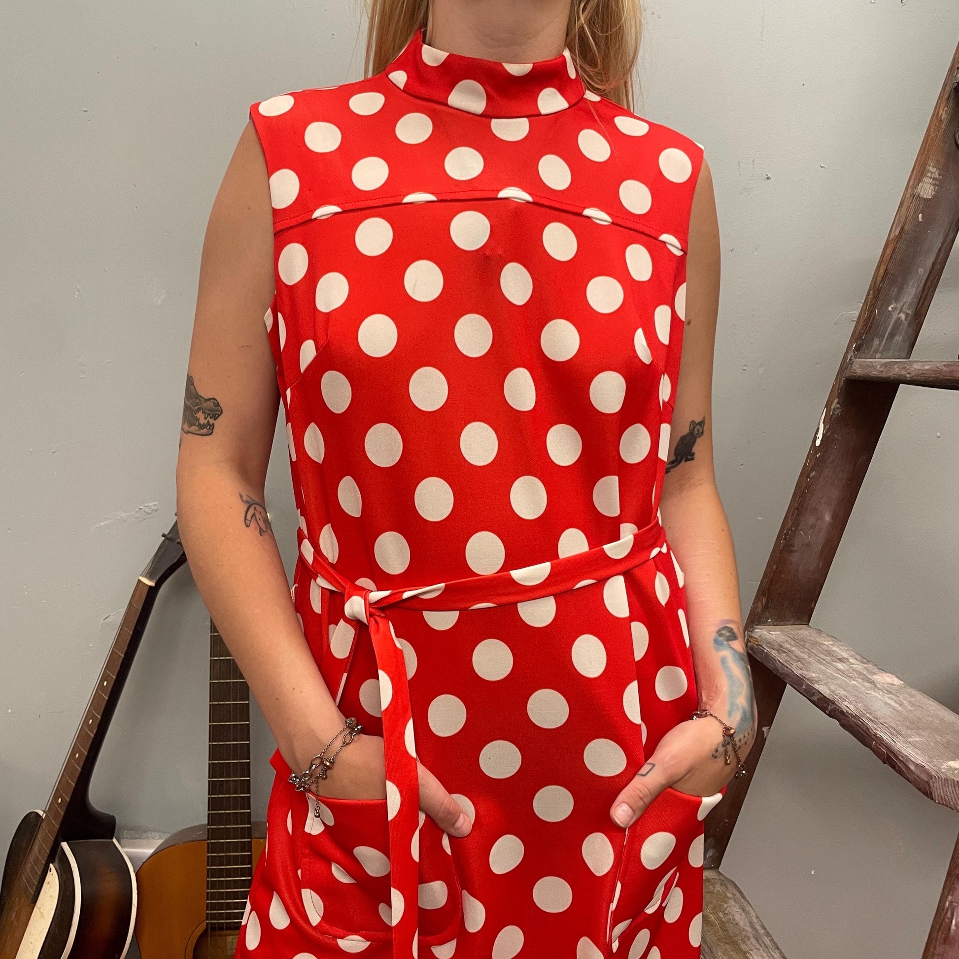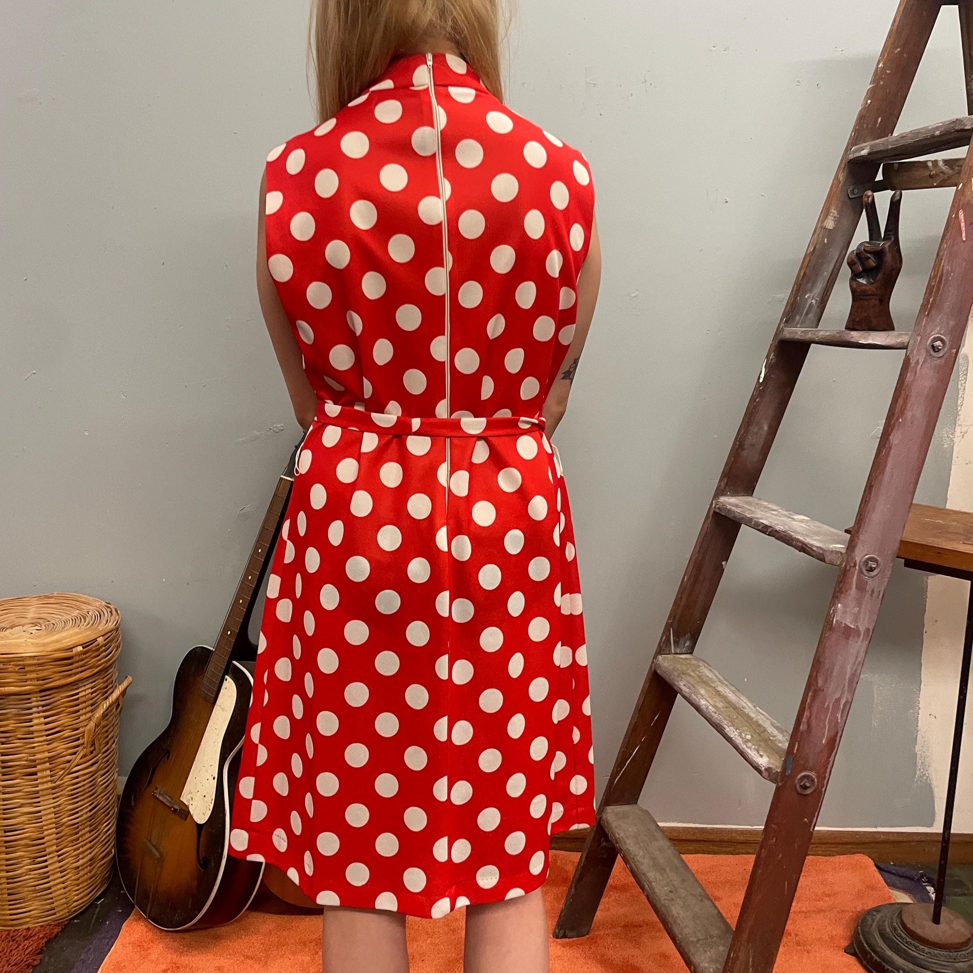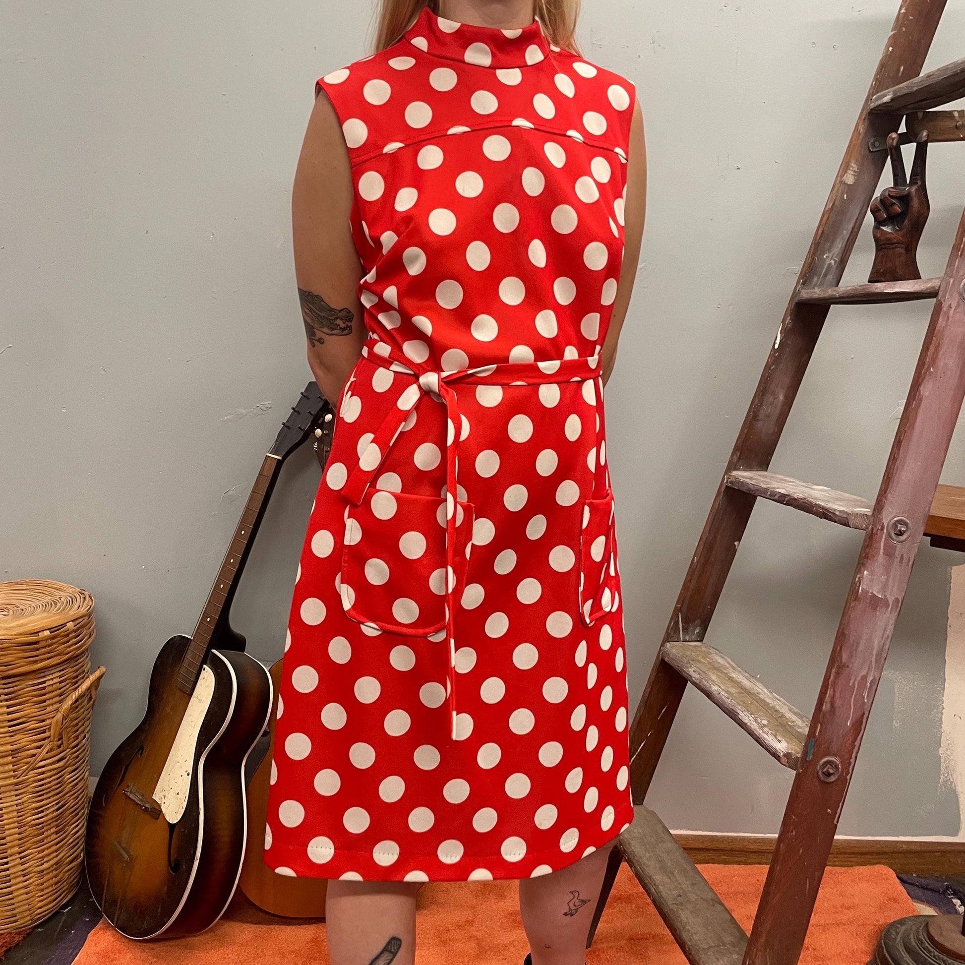 vtg 60s RED POLKA DOT Dress // vintage cute retro geometric print belted mini dress with pockets cute casual funky mod space age go go shift