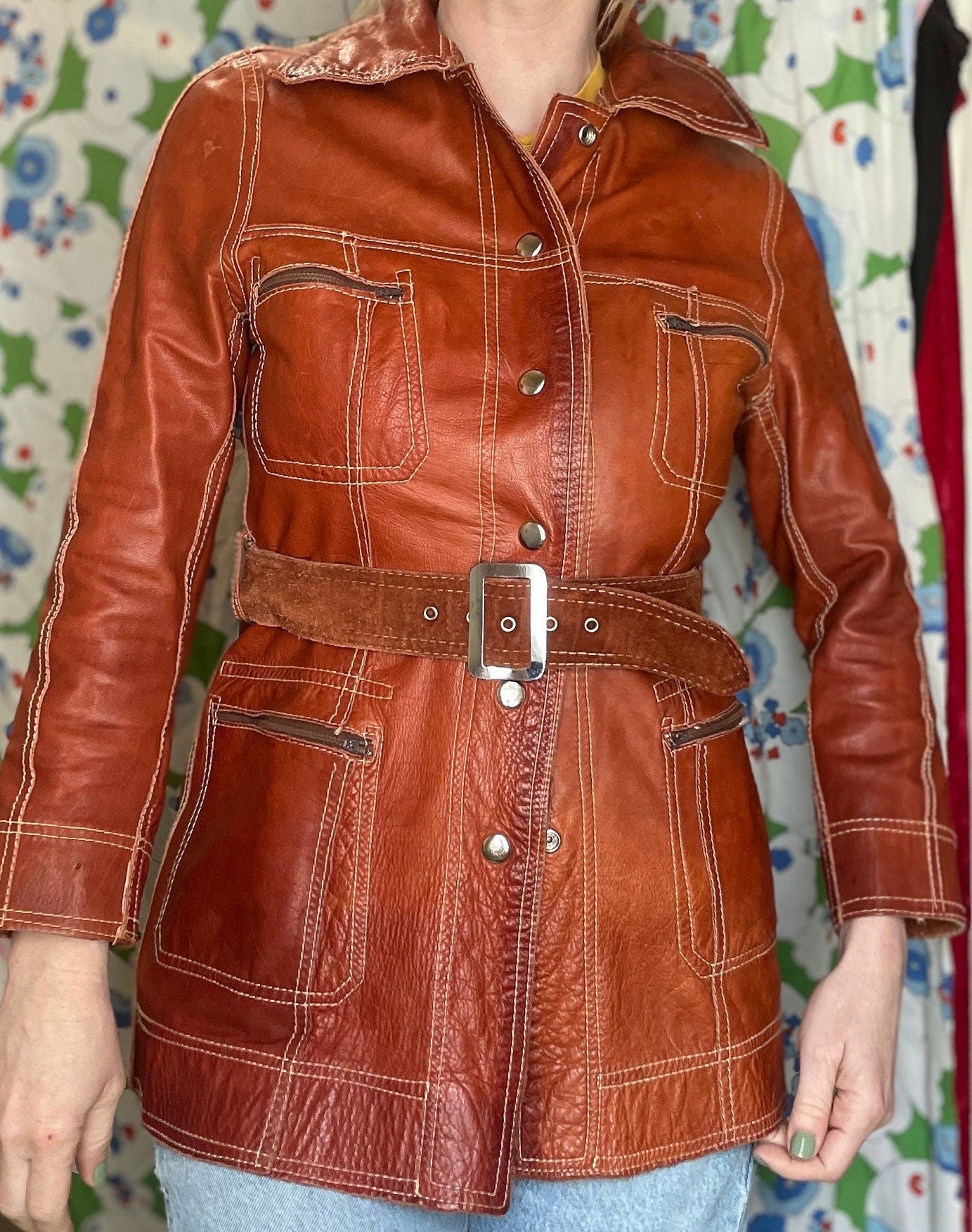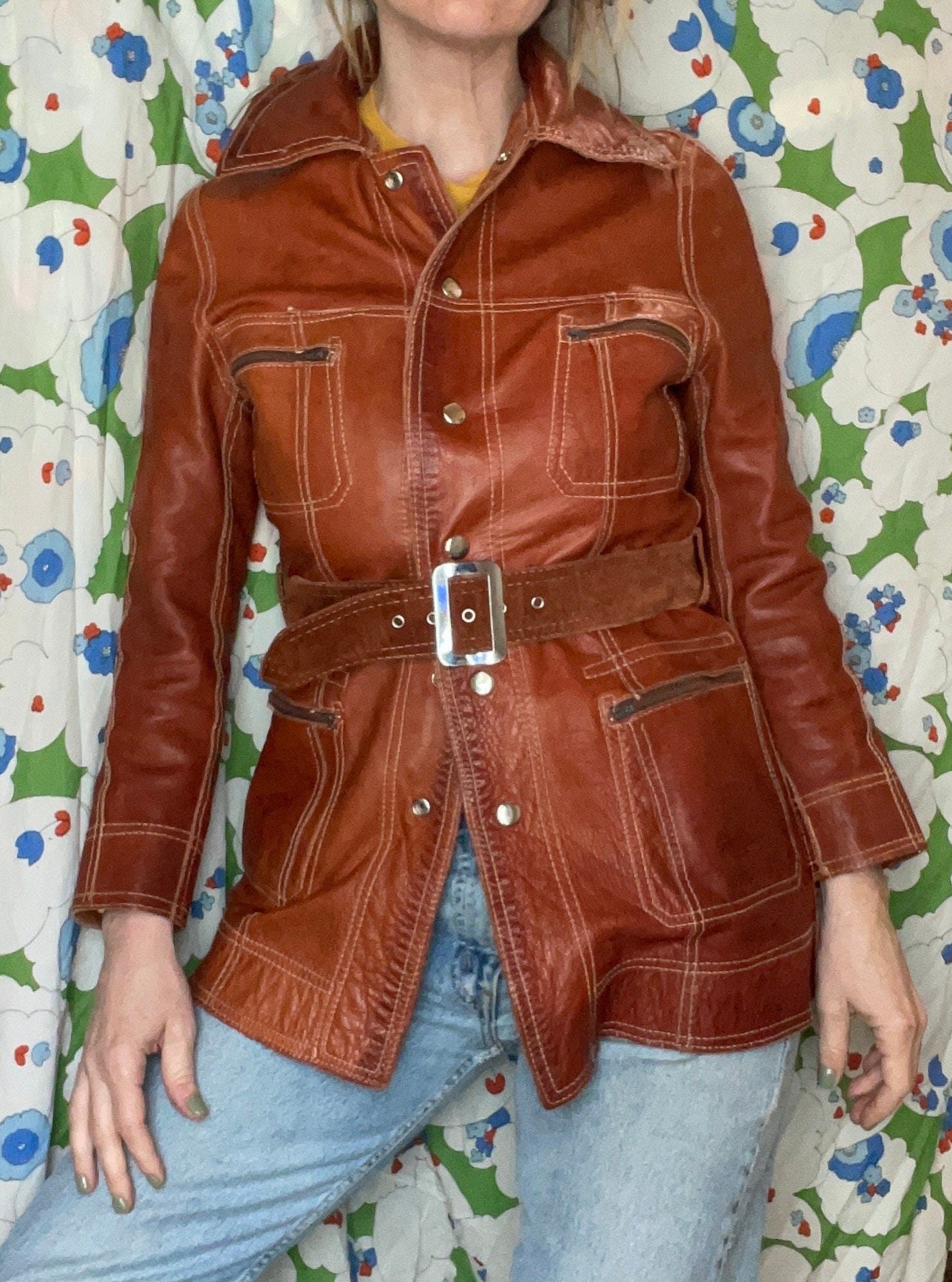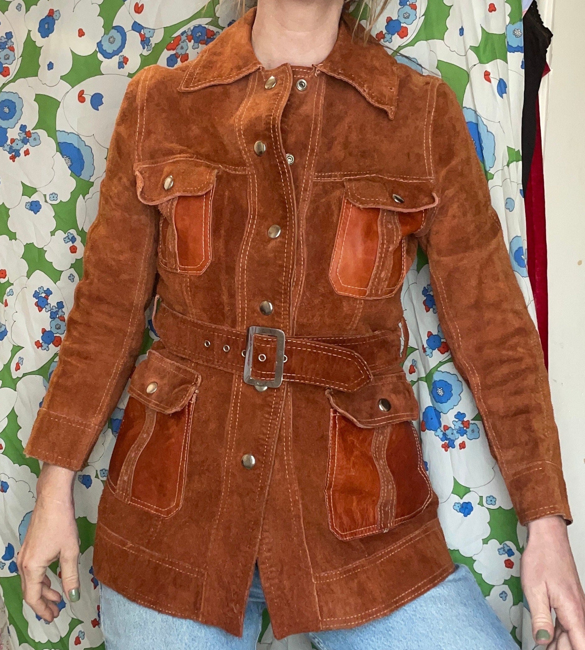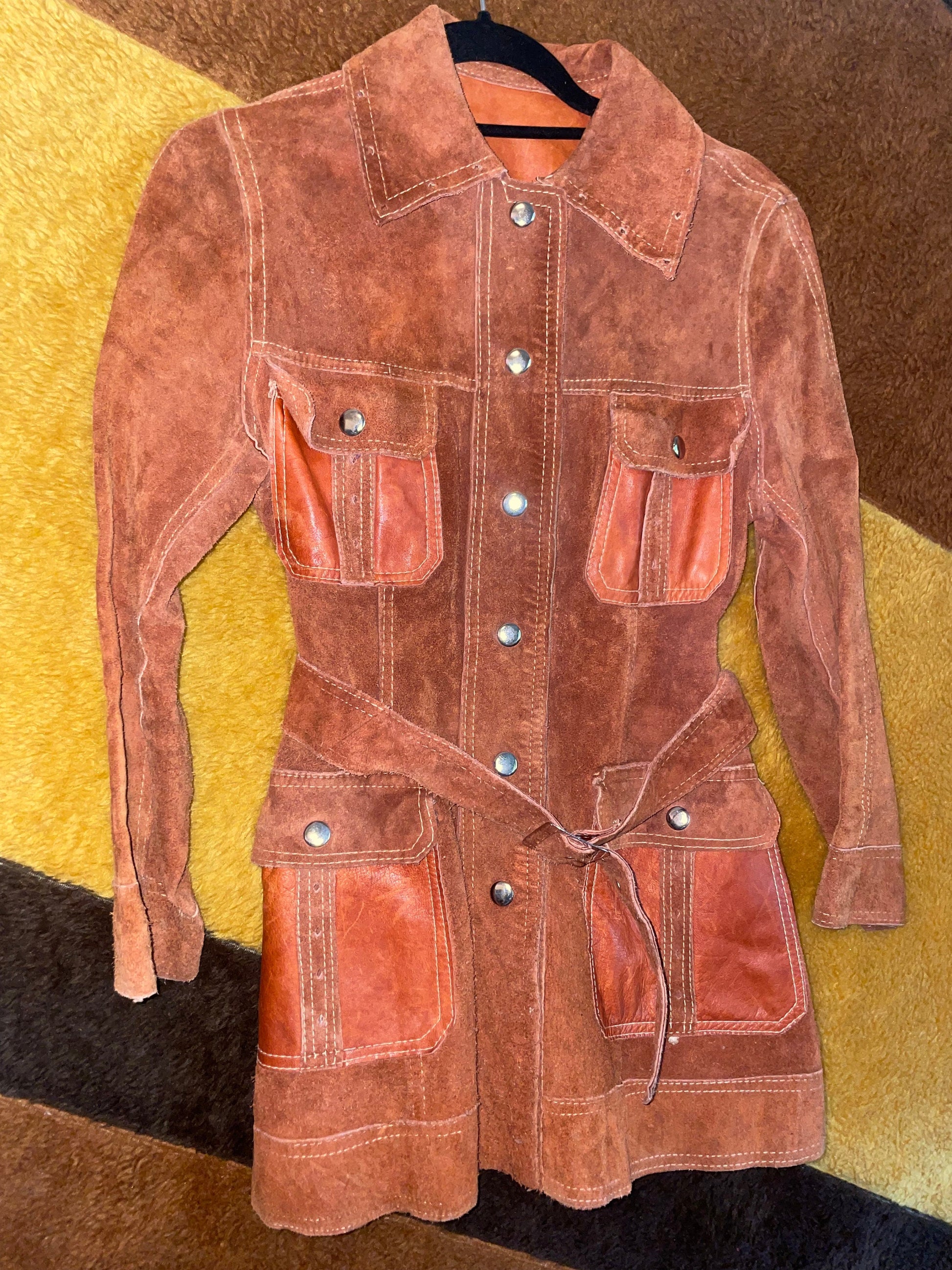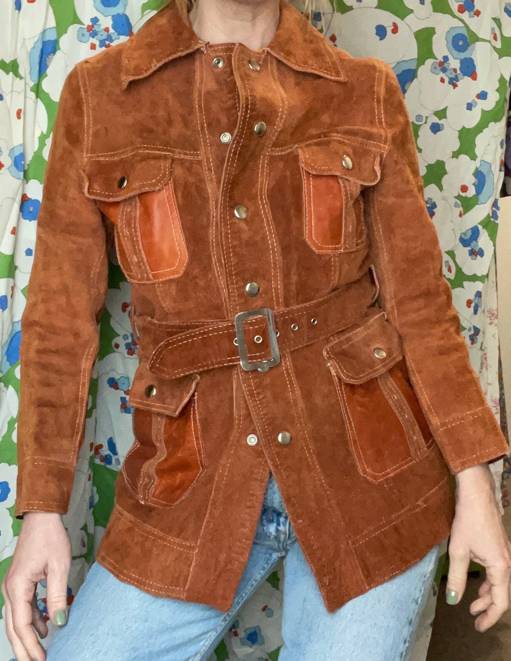 vtg 60s reversible orange suede leather jacket two tone hide belted collared button up hippie western retro two in one rocker chic boho