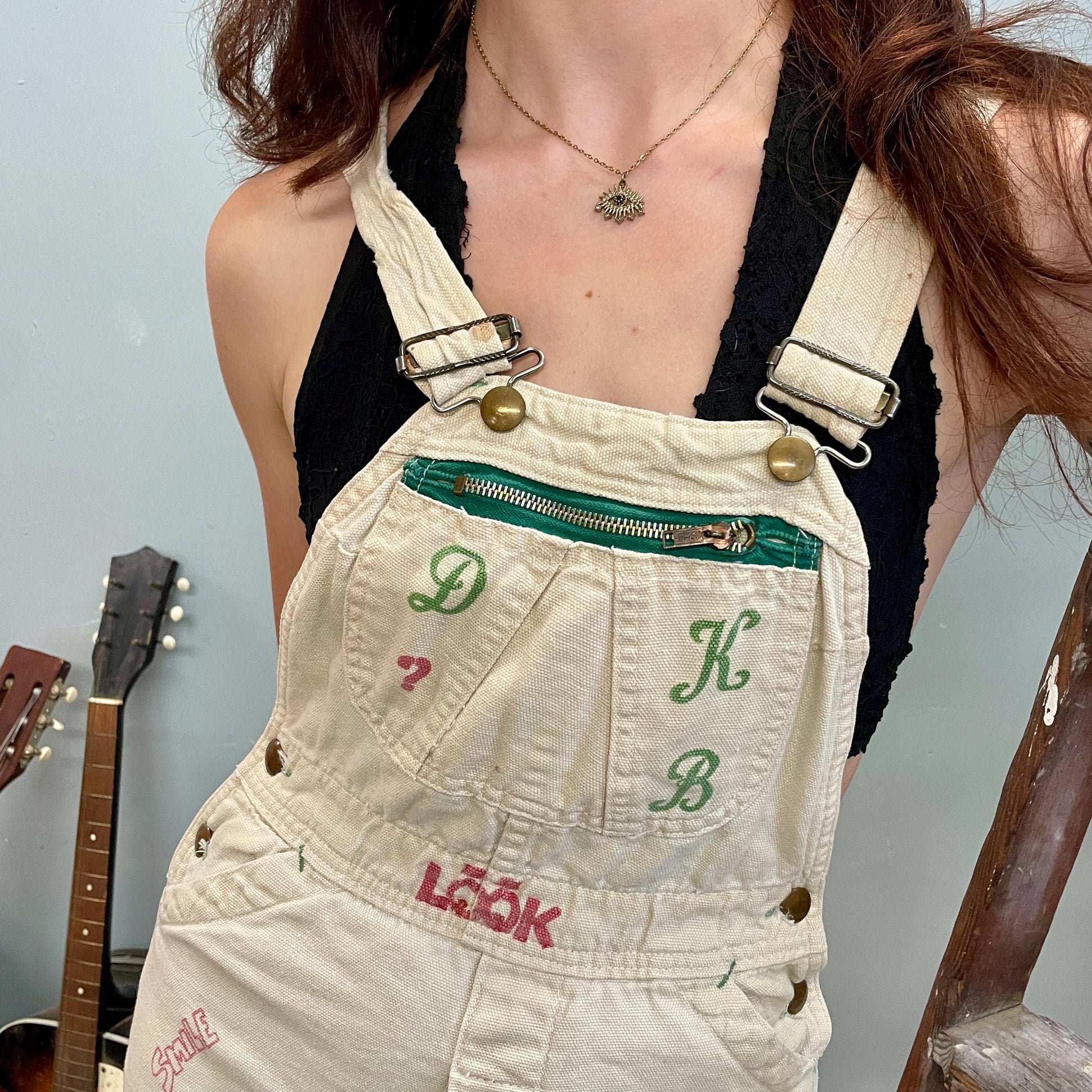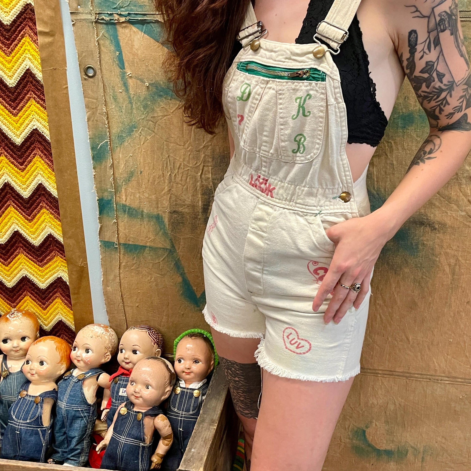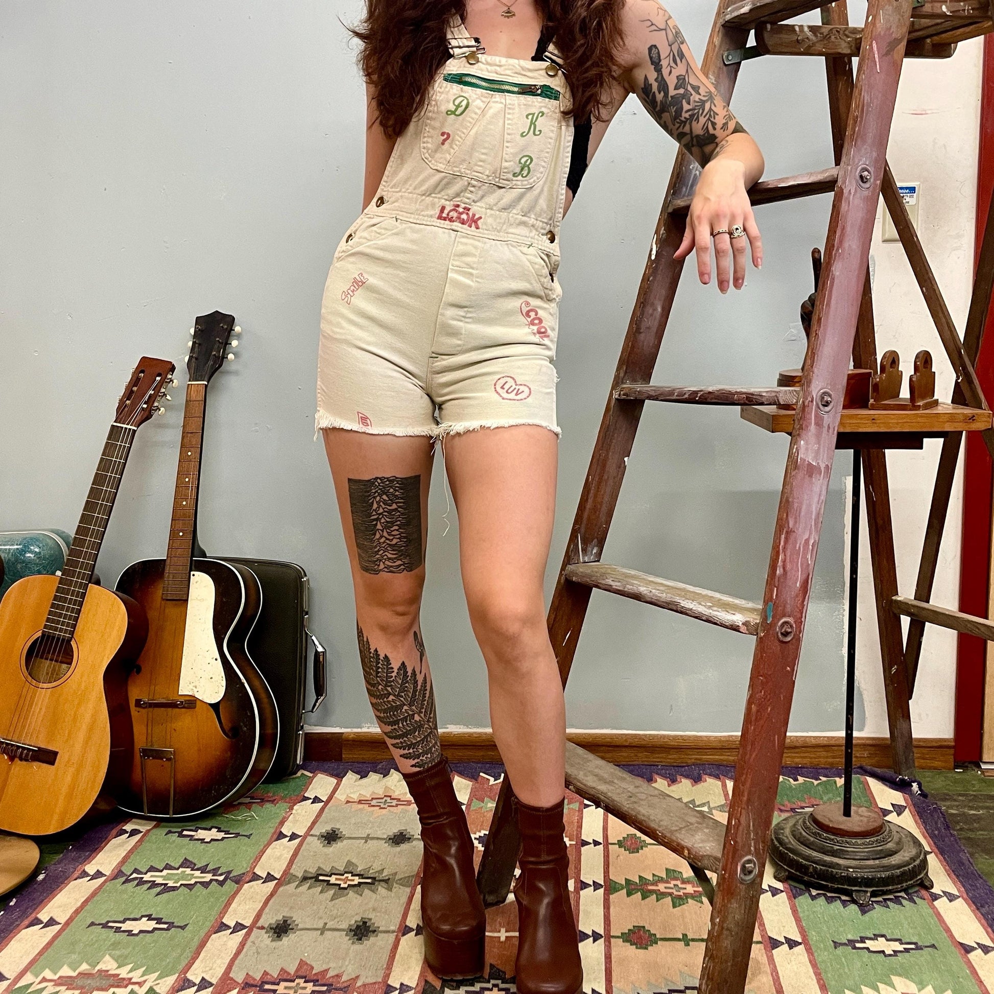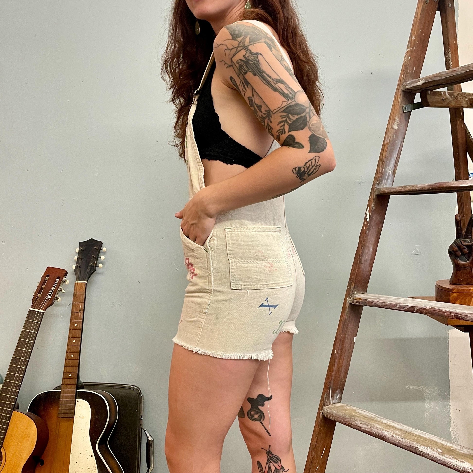 Funky artsy decorated shorts overalls