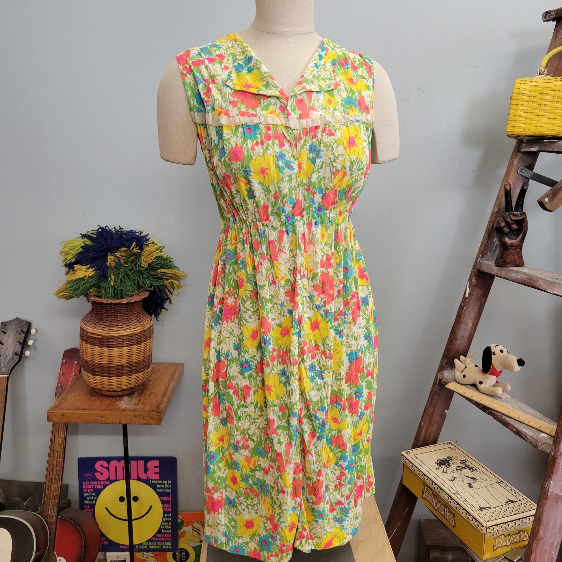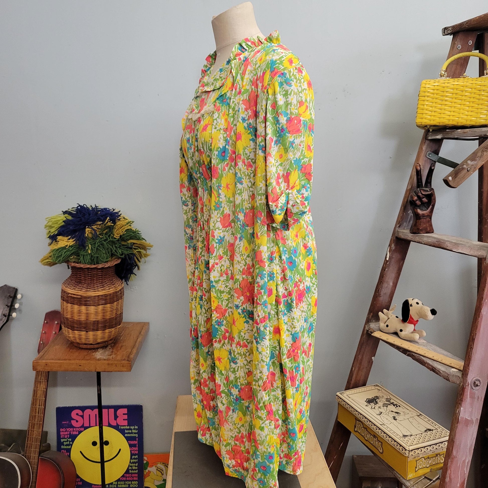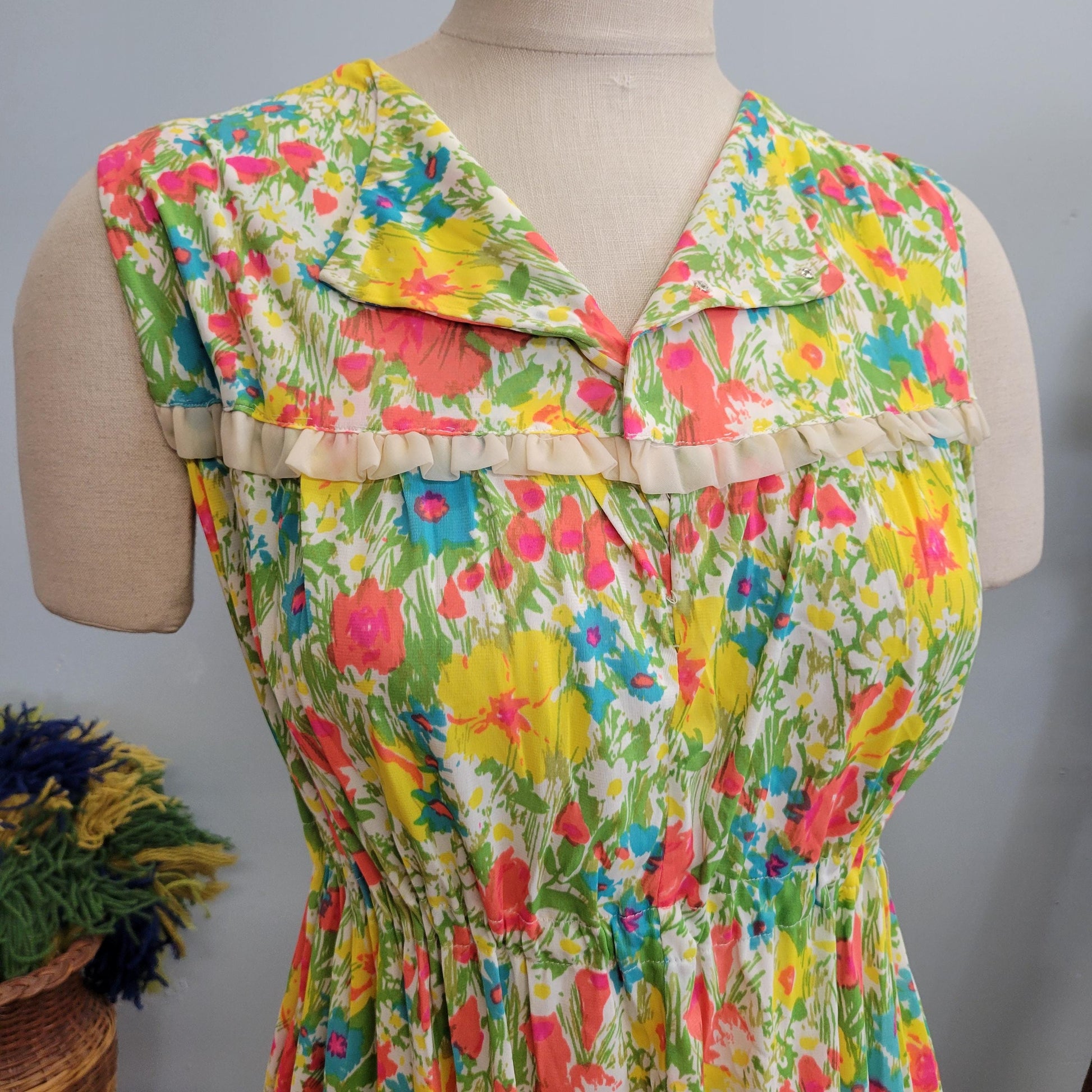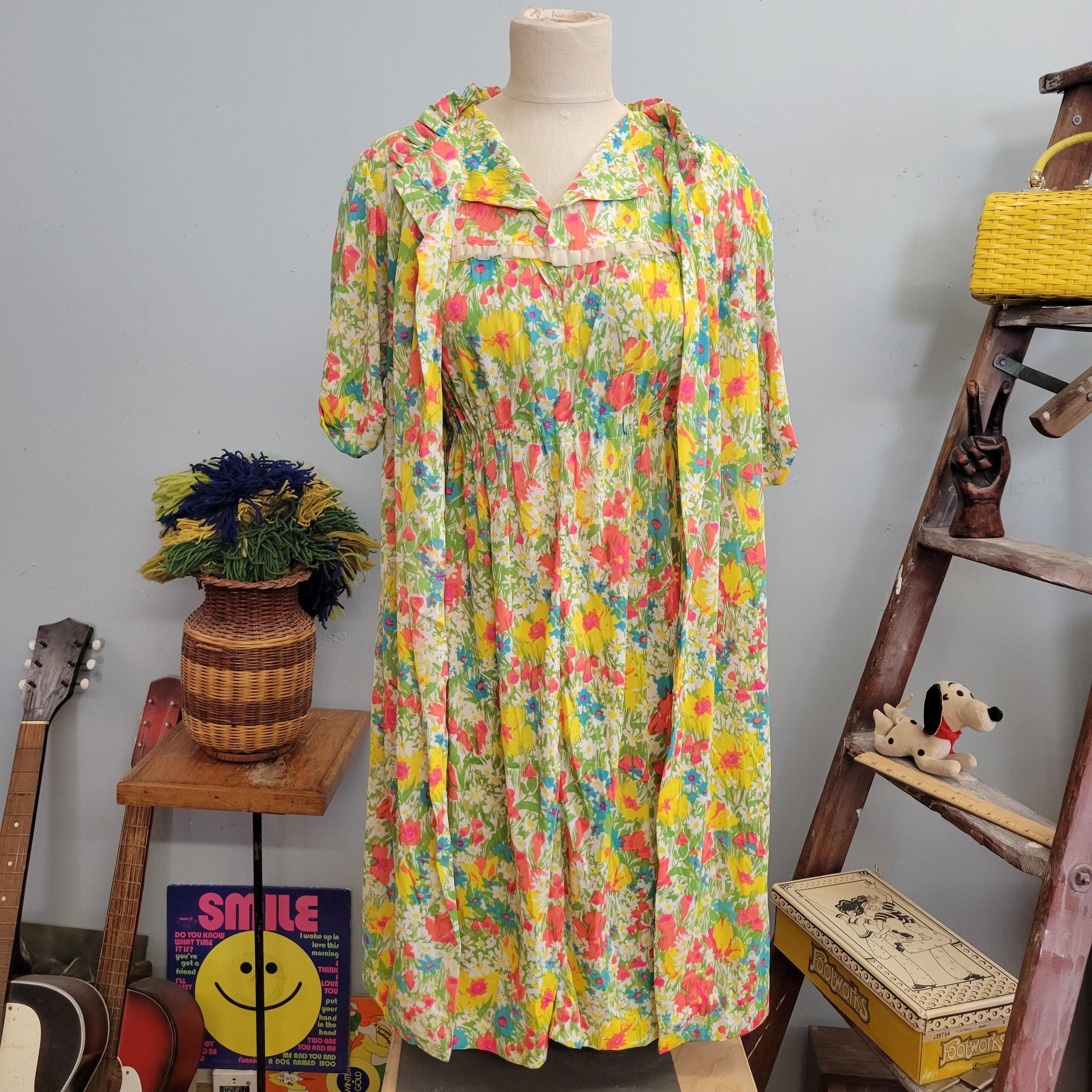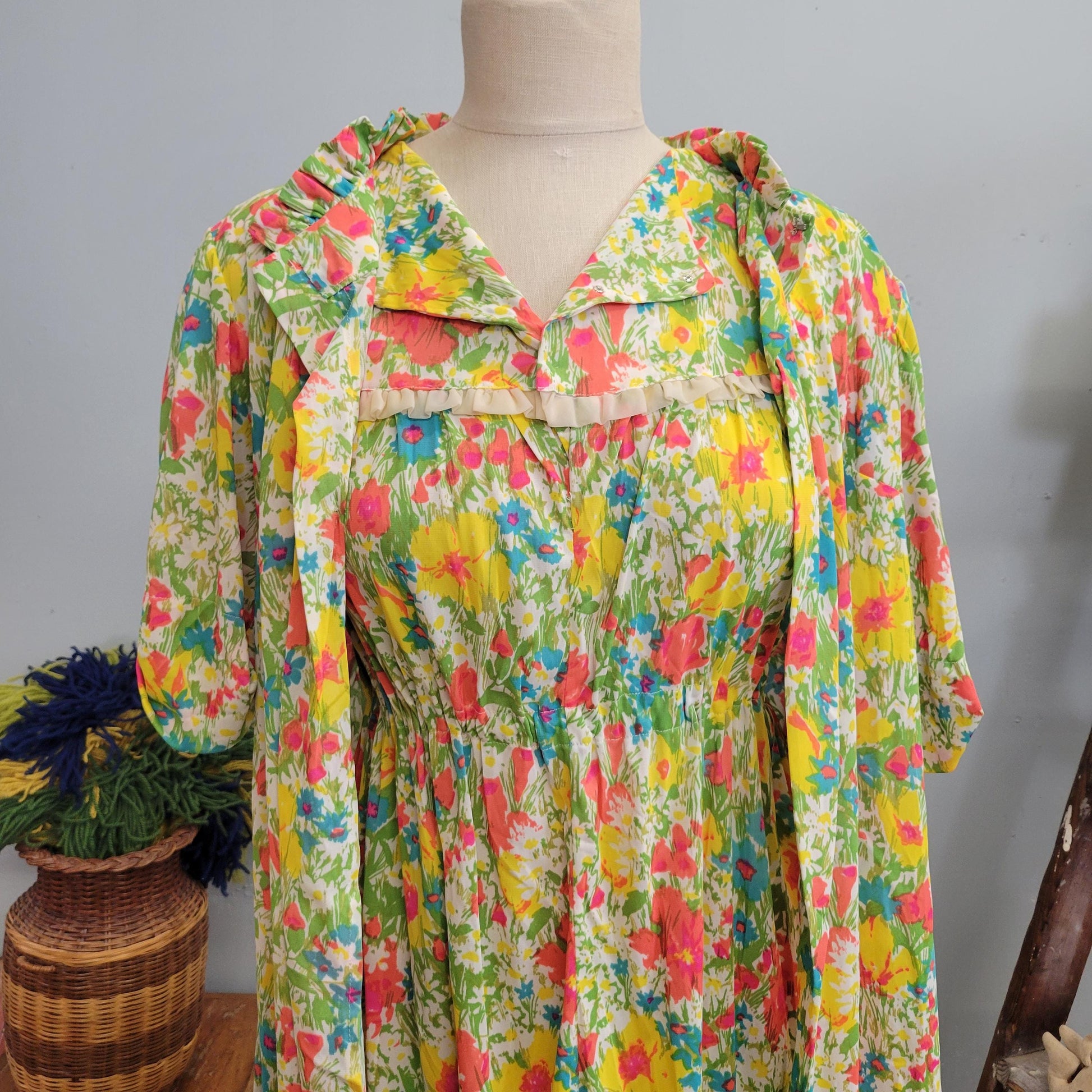 vtg 60s TWO PIECE DRESS // vintage silky outfit flower power flowy nylon jersey neon bright pastel slip dress and housecoat set nightgown