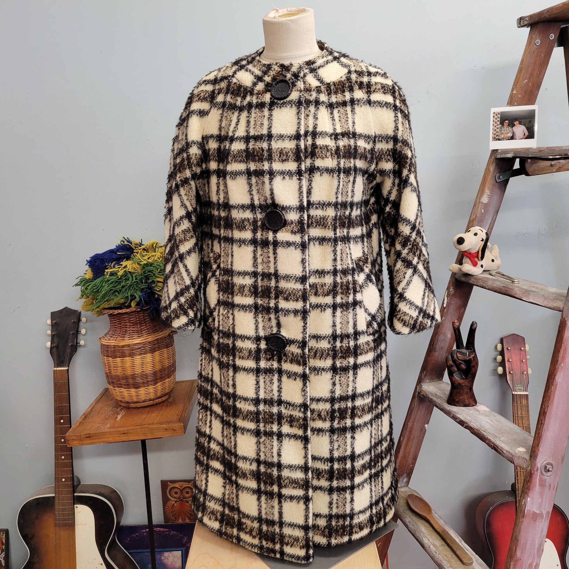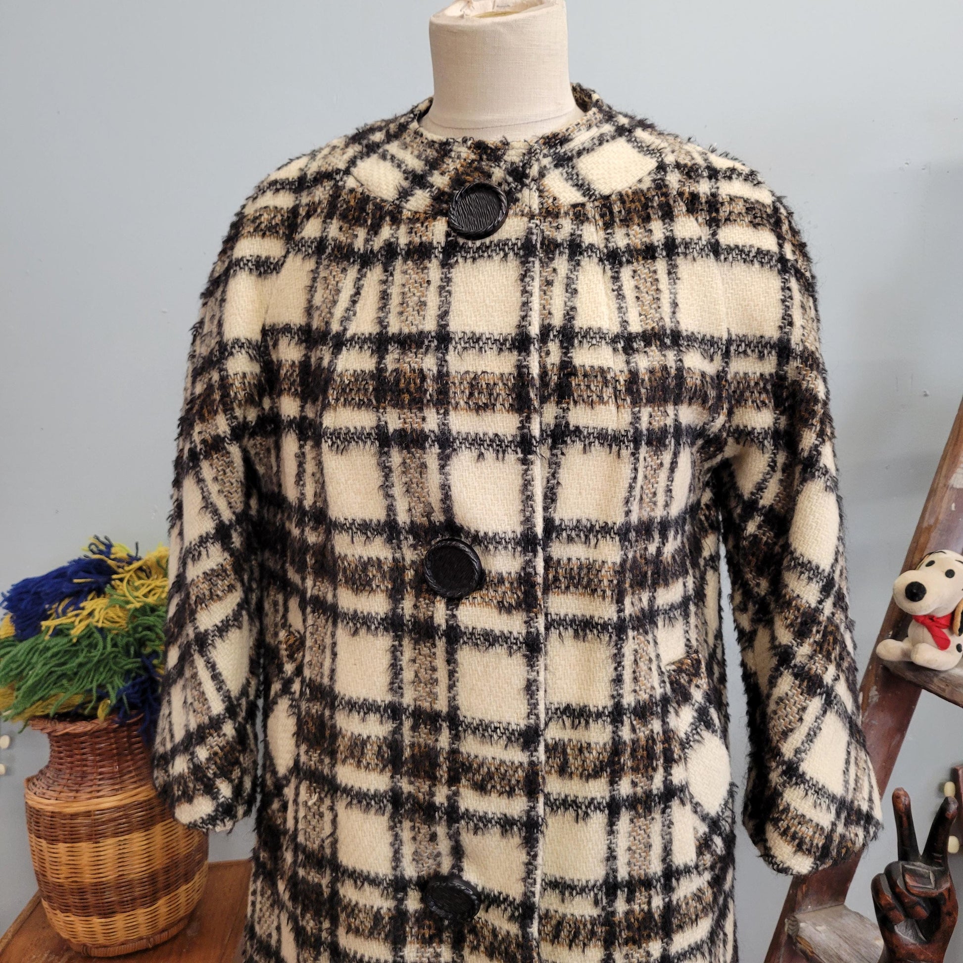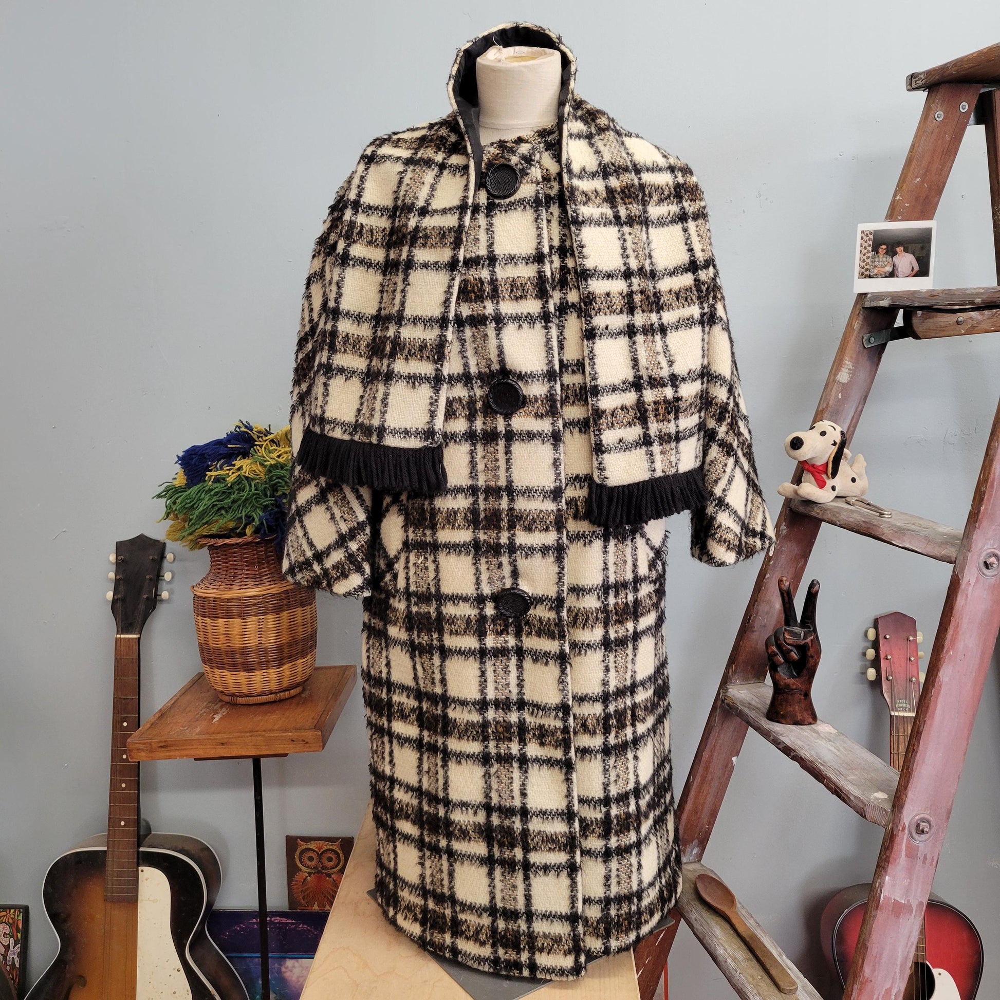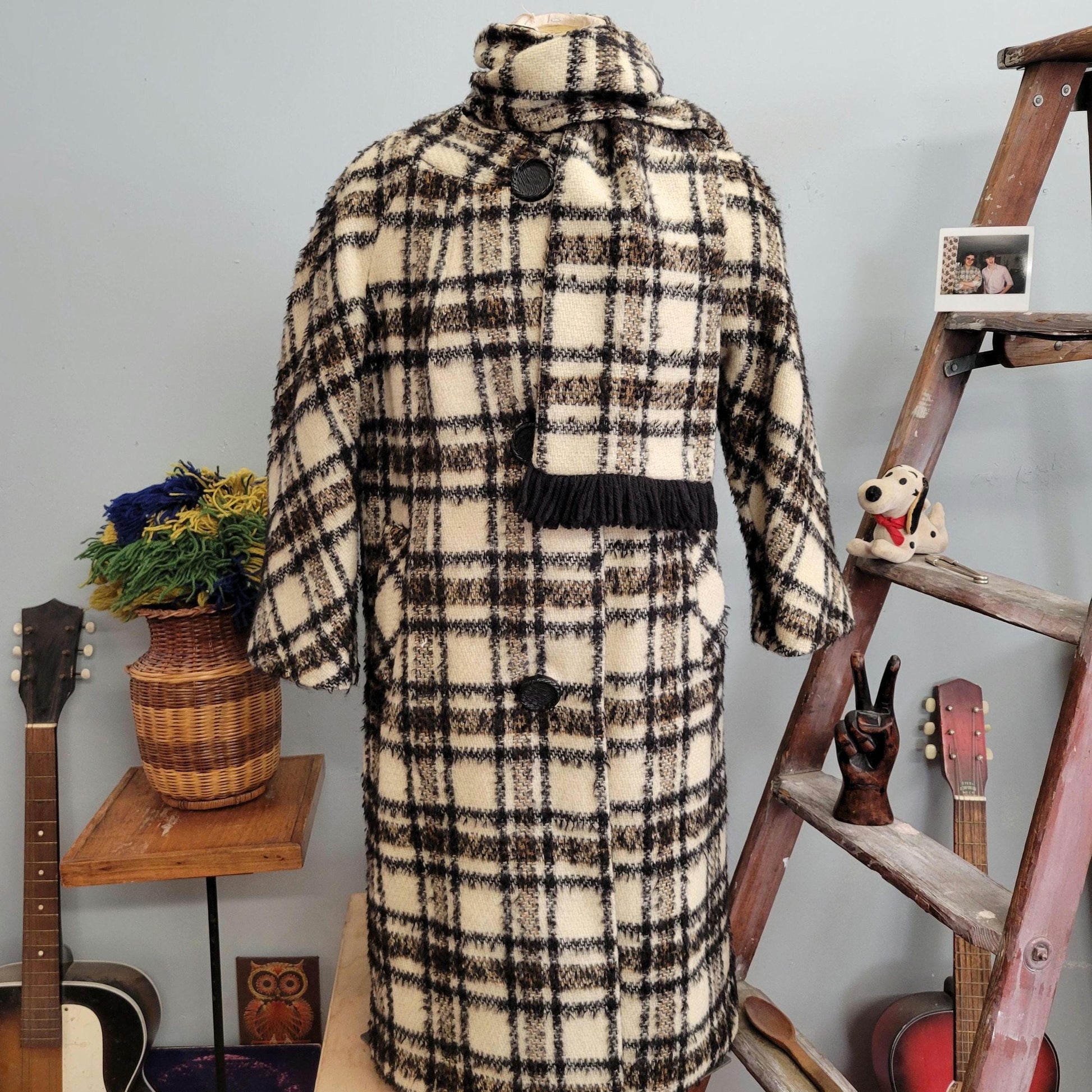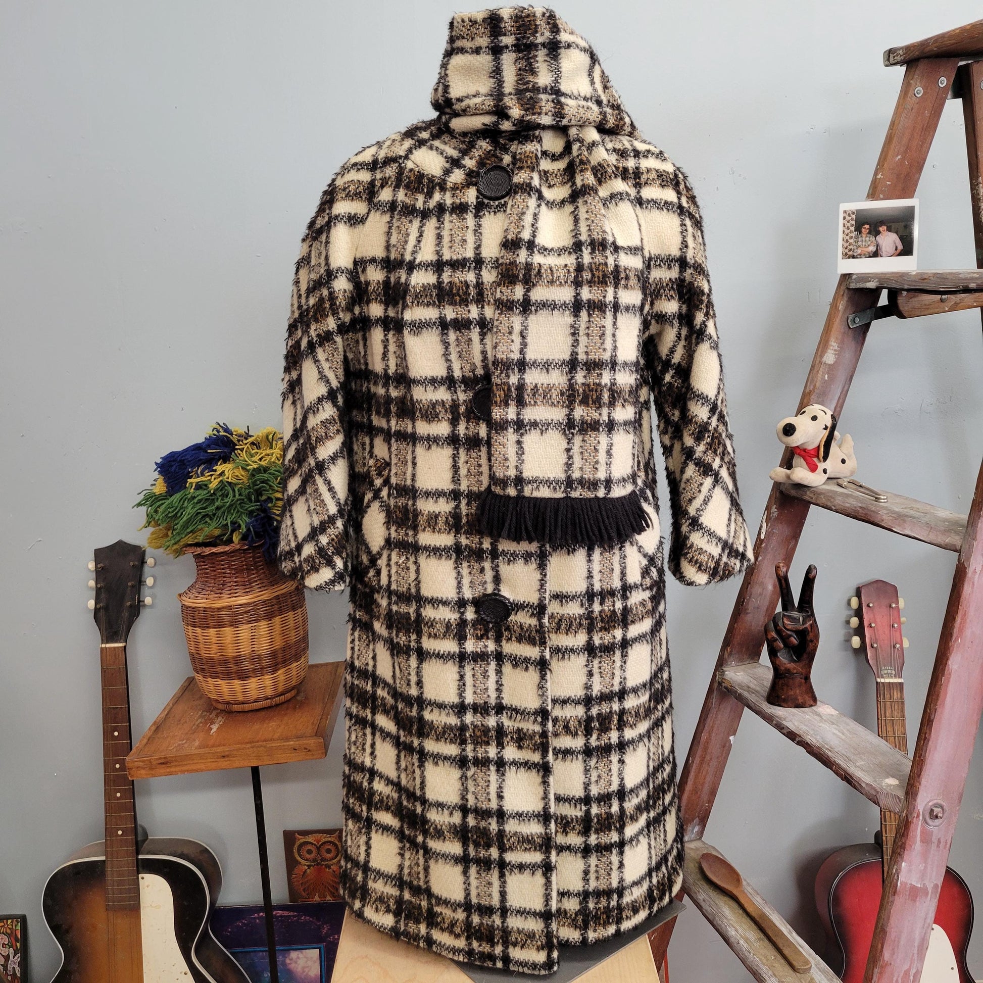 vtg 60s WOOL COAT & SCARF / vintage checkered plaid swing coat womens large shaggy wool preppy mod stylish warm winter fashion fringe shawl