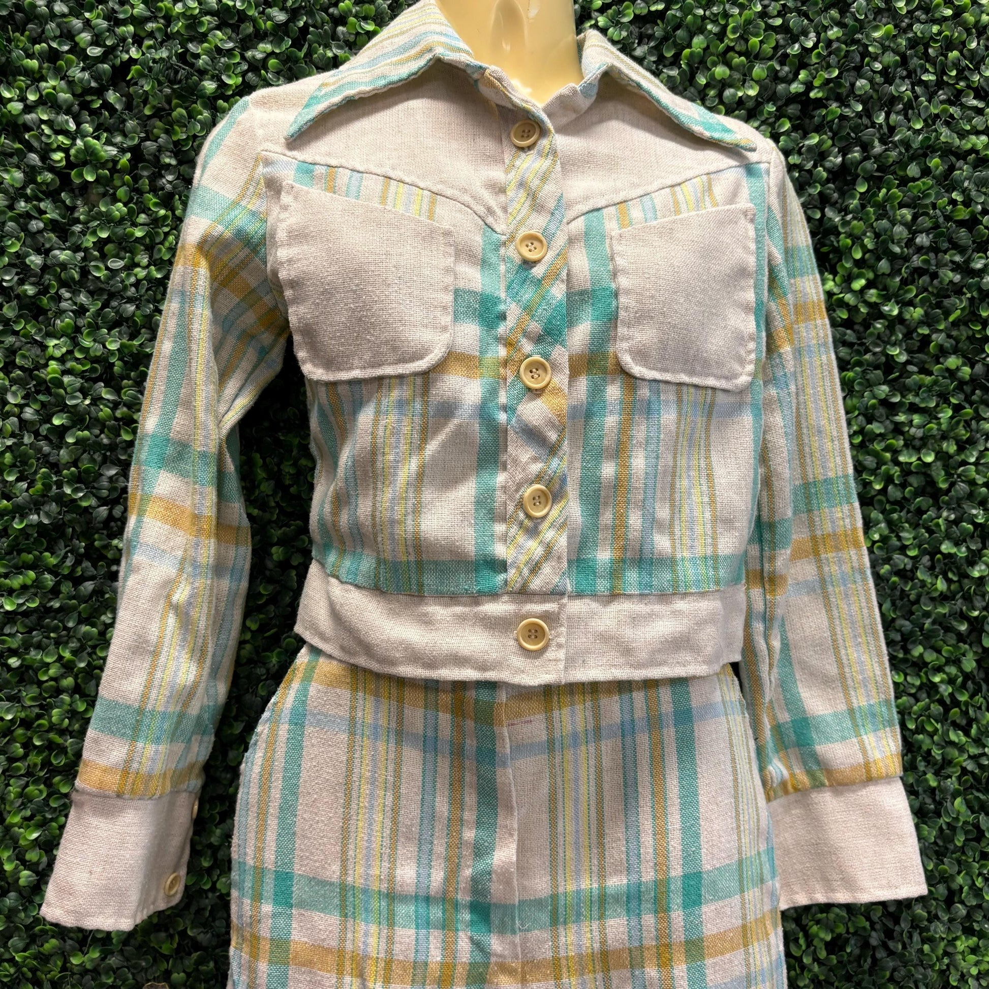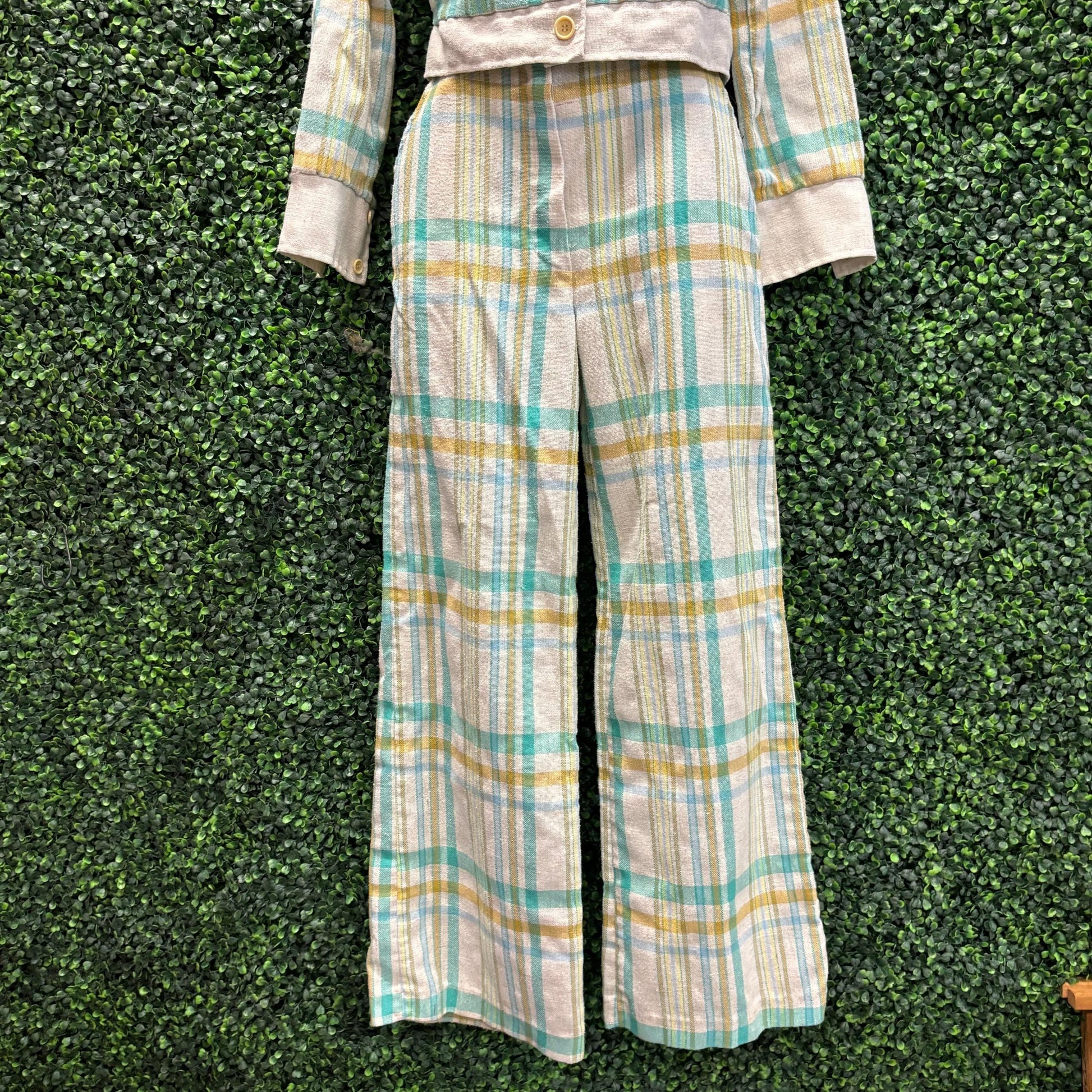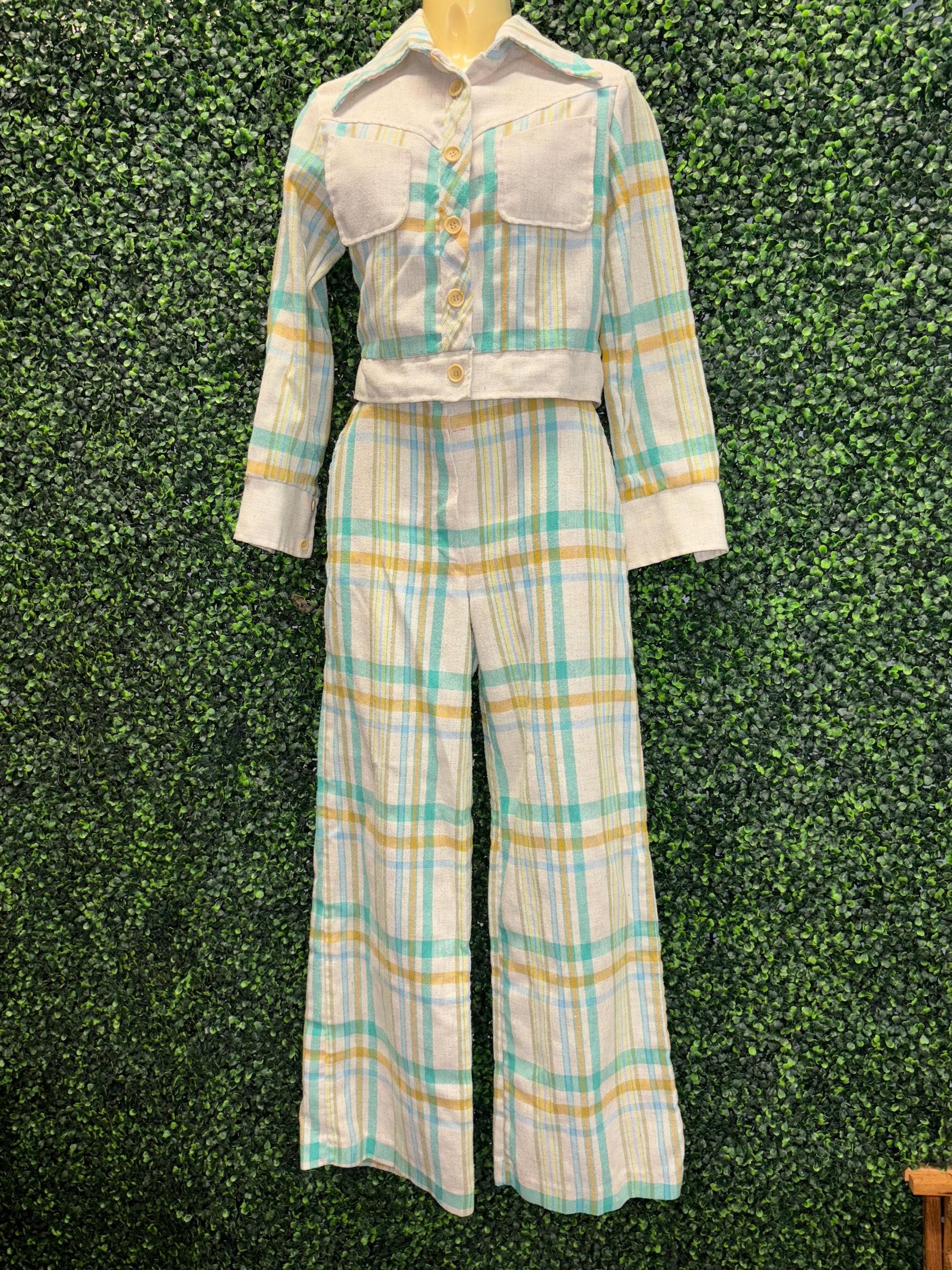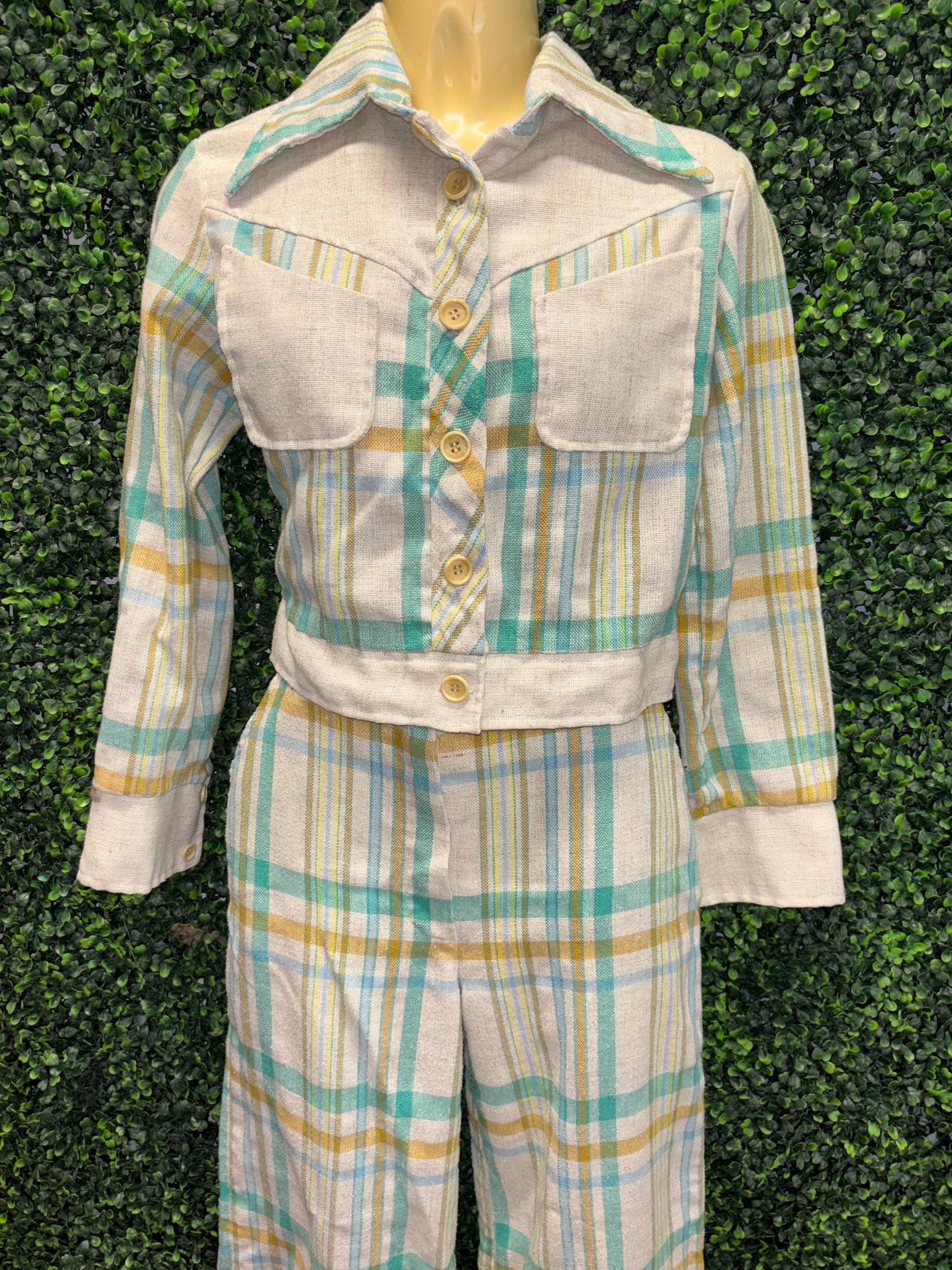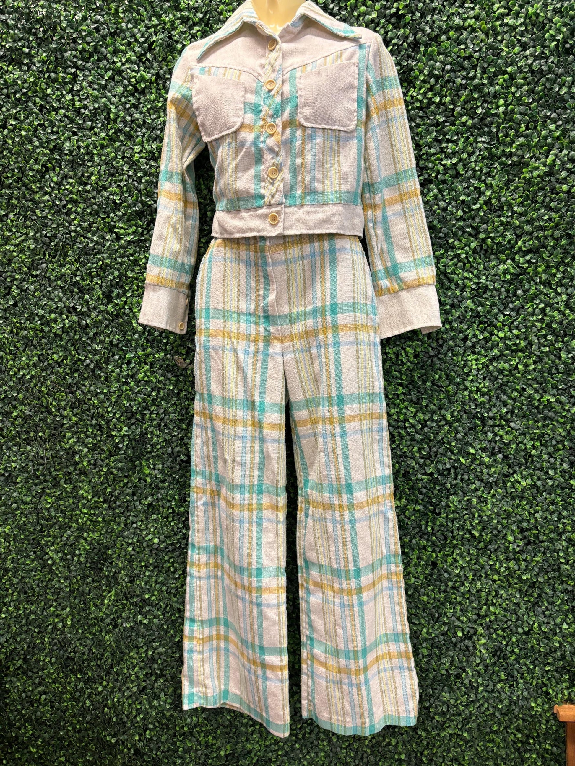 vtg 70s 2 PIECE PANTSUIT Set // vintage flare leg blue yellow plaid bell bottoms and pointy collar retro blazer top juniors teens autumn