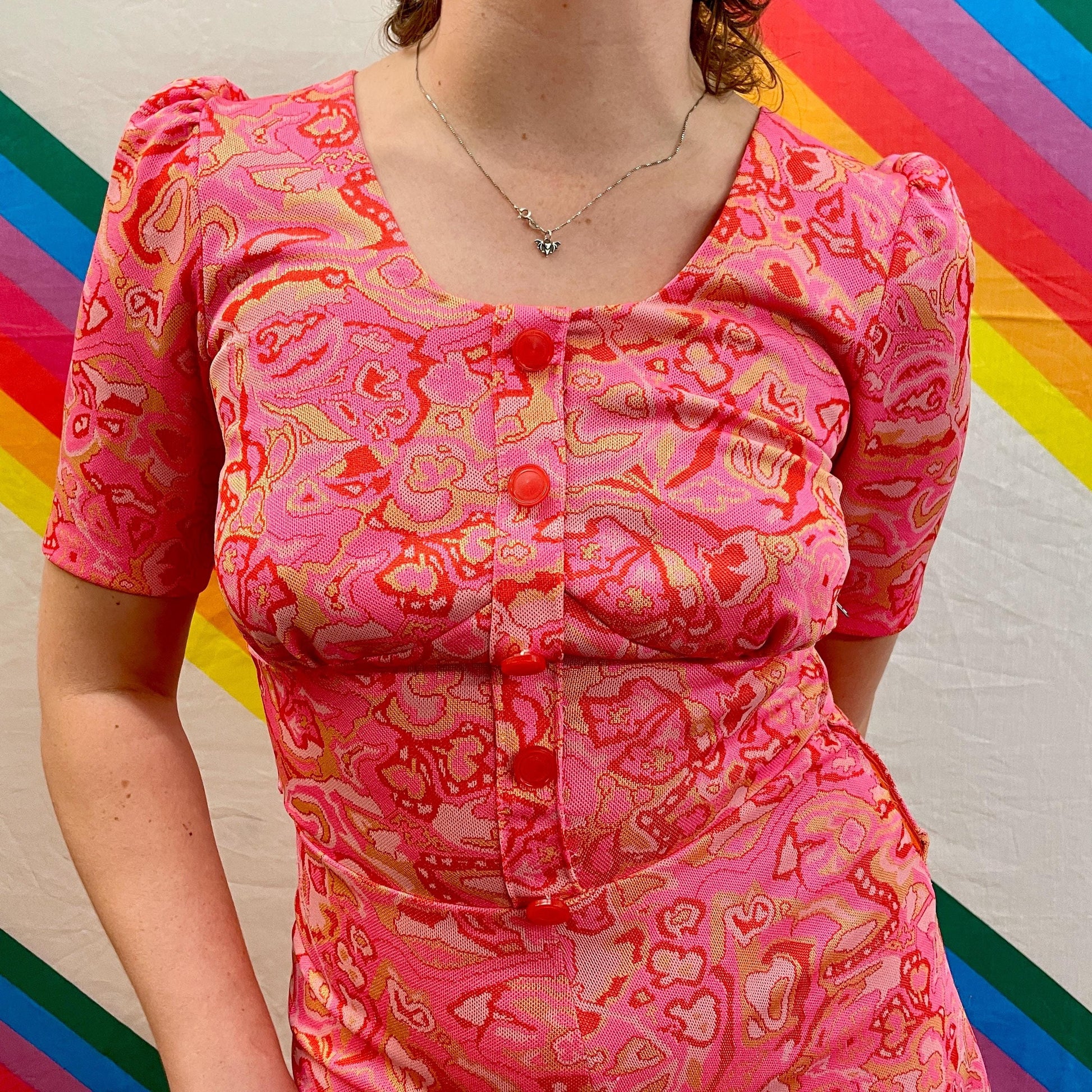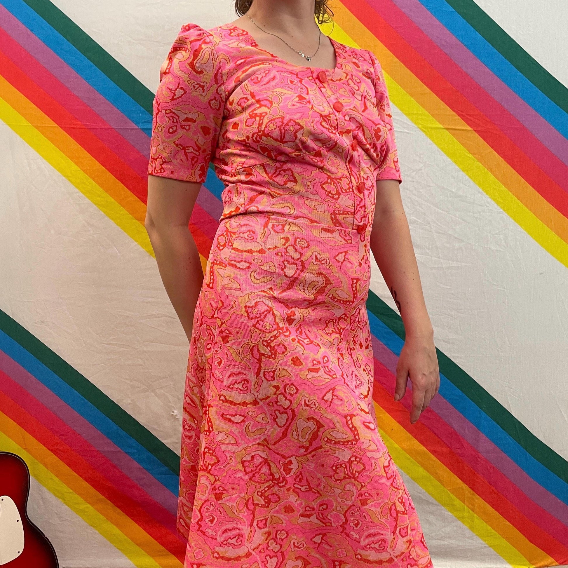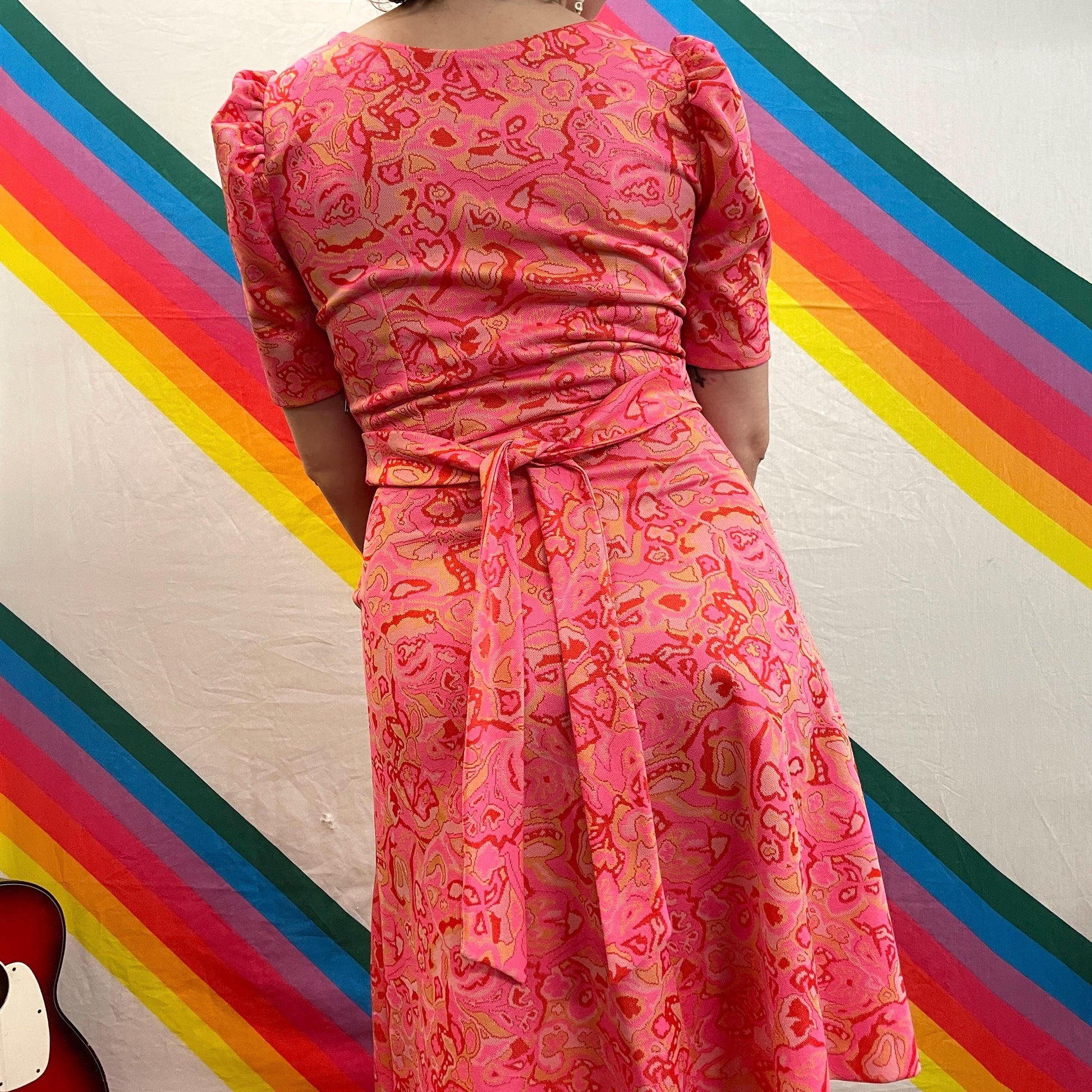 vtg 70s ABSTRACT PINK LAVA Lamp dress // trippy psychedelic acid drip funky neon retro belted button up midi autumn fall halloween party