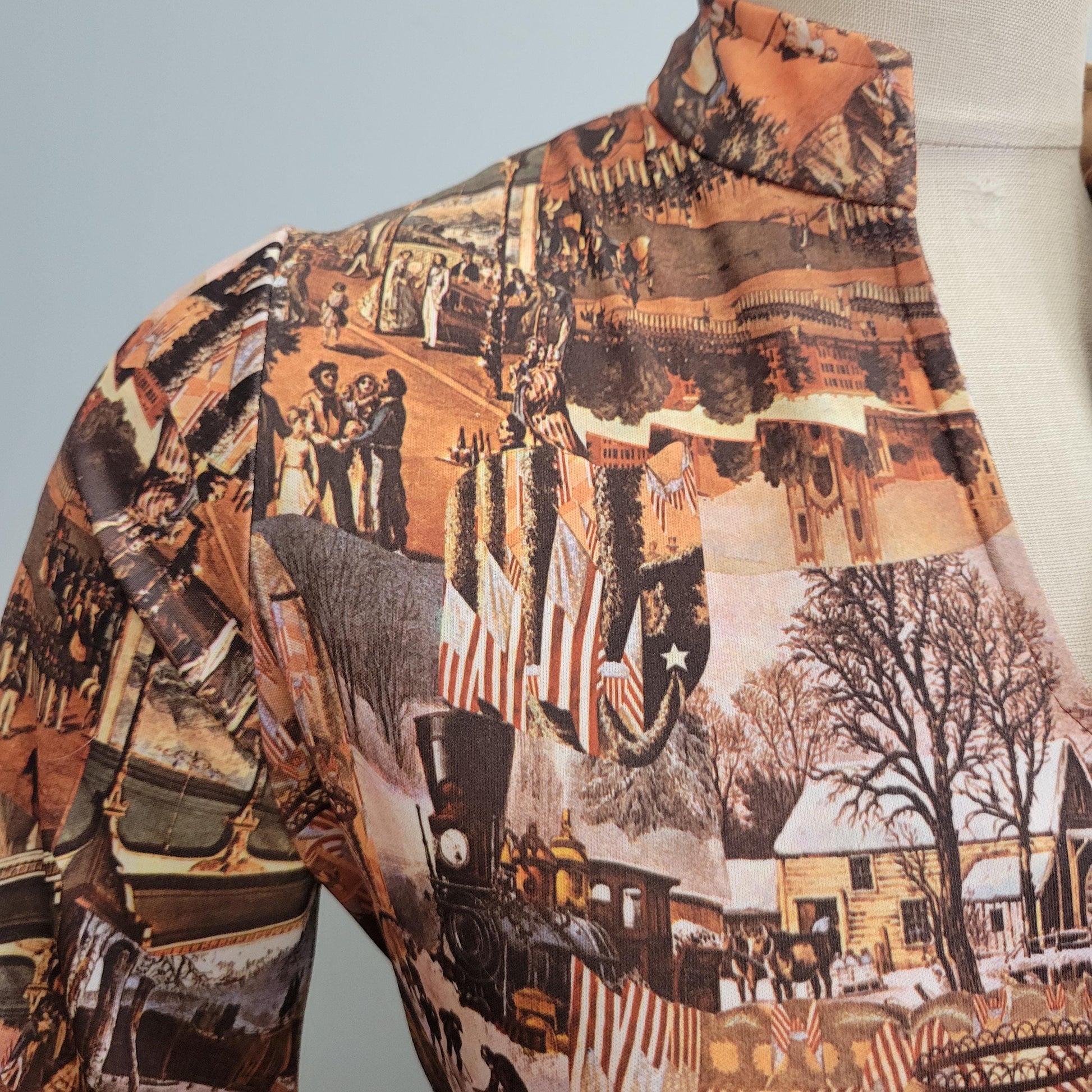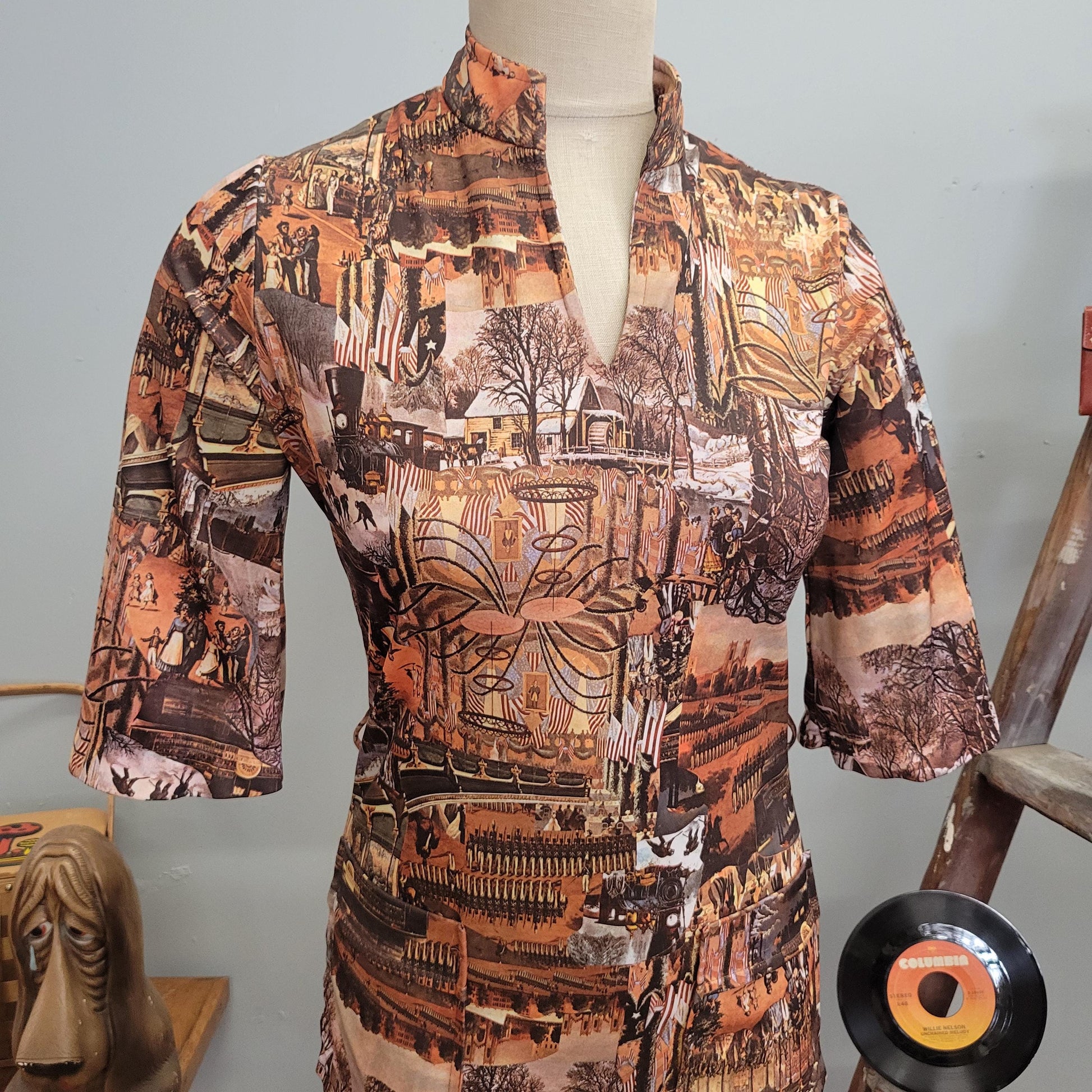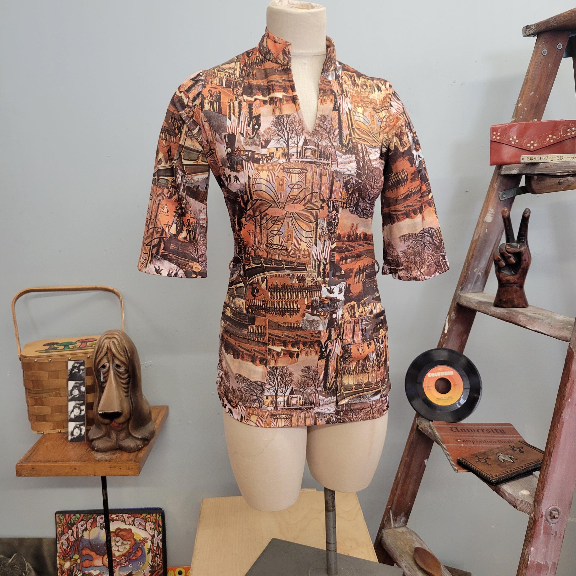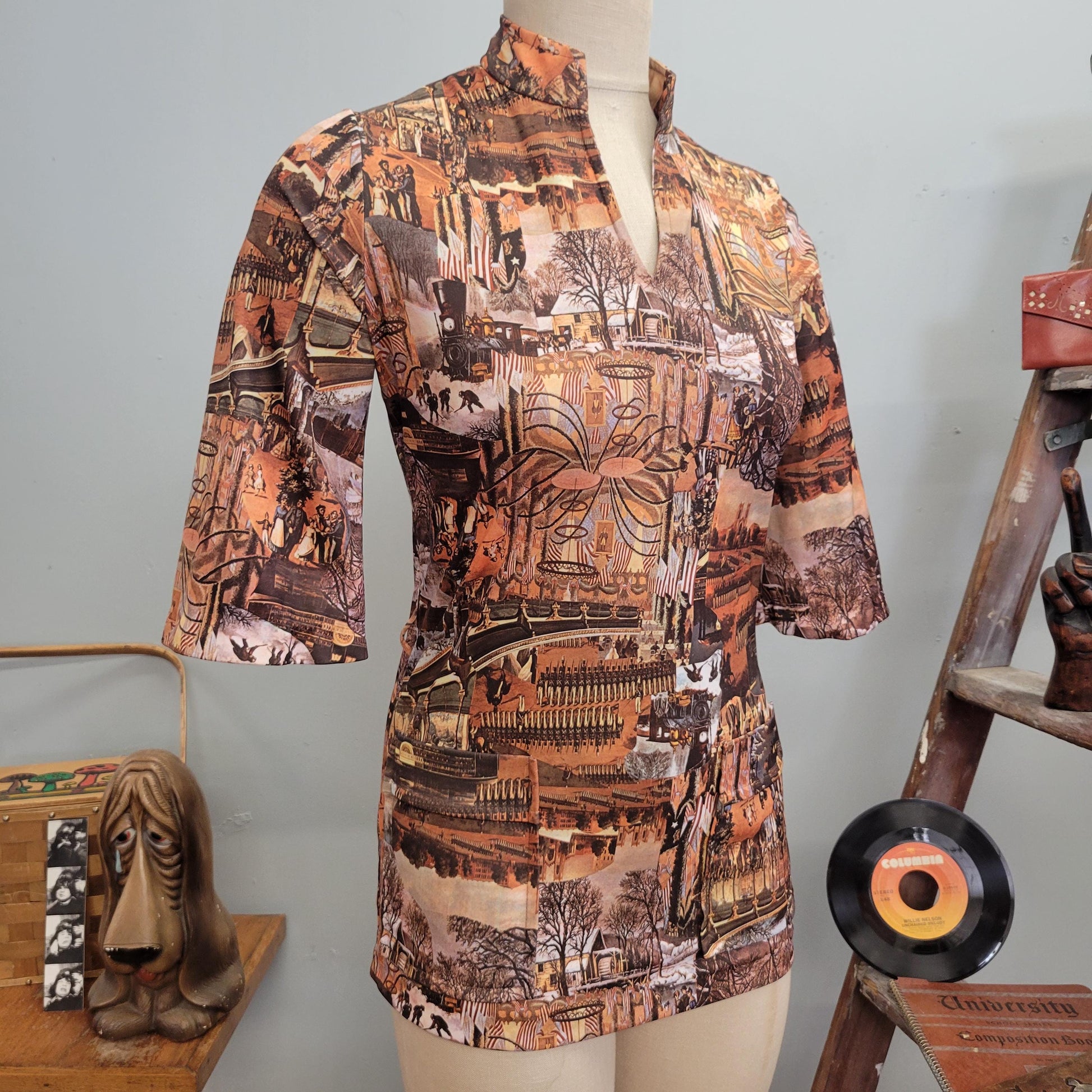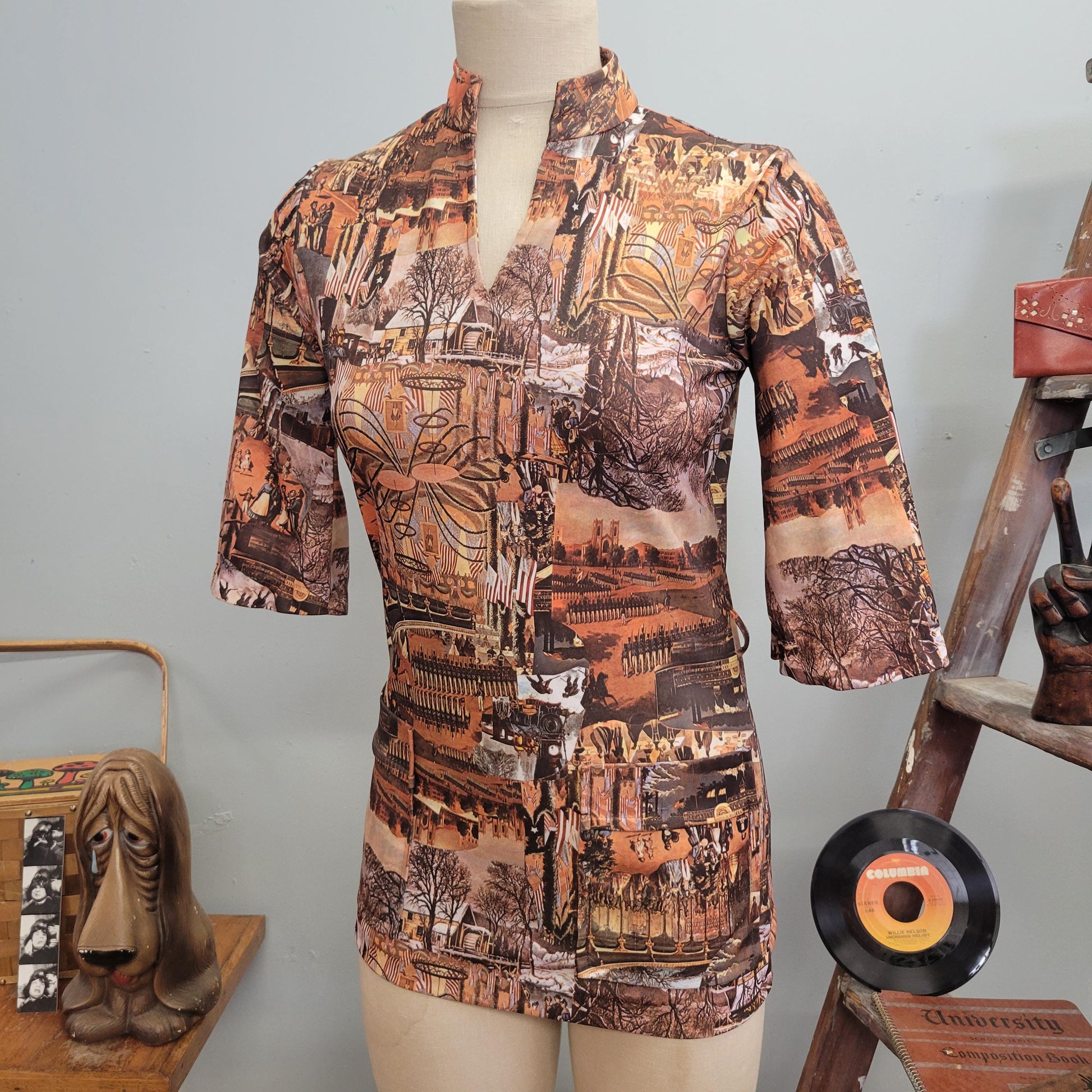 vtg 70s ALL OVER PRINT Top // vintage i.o.u. braxton blouse high collar v neck 3/4 sleeve retro autumn fall fashion hippie mod psychedelic