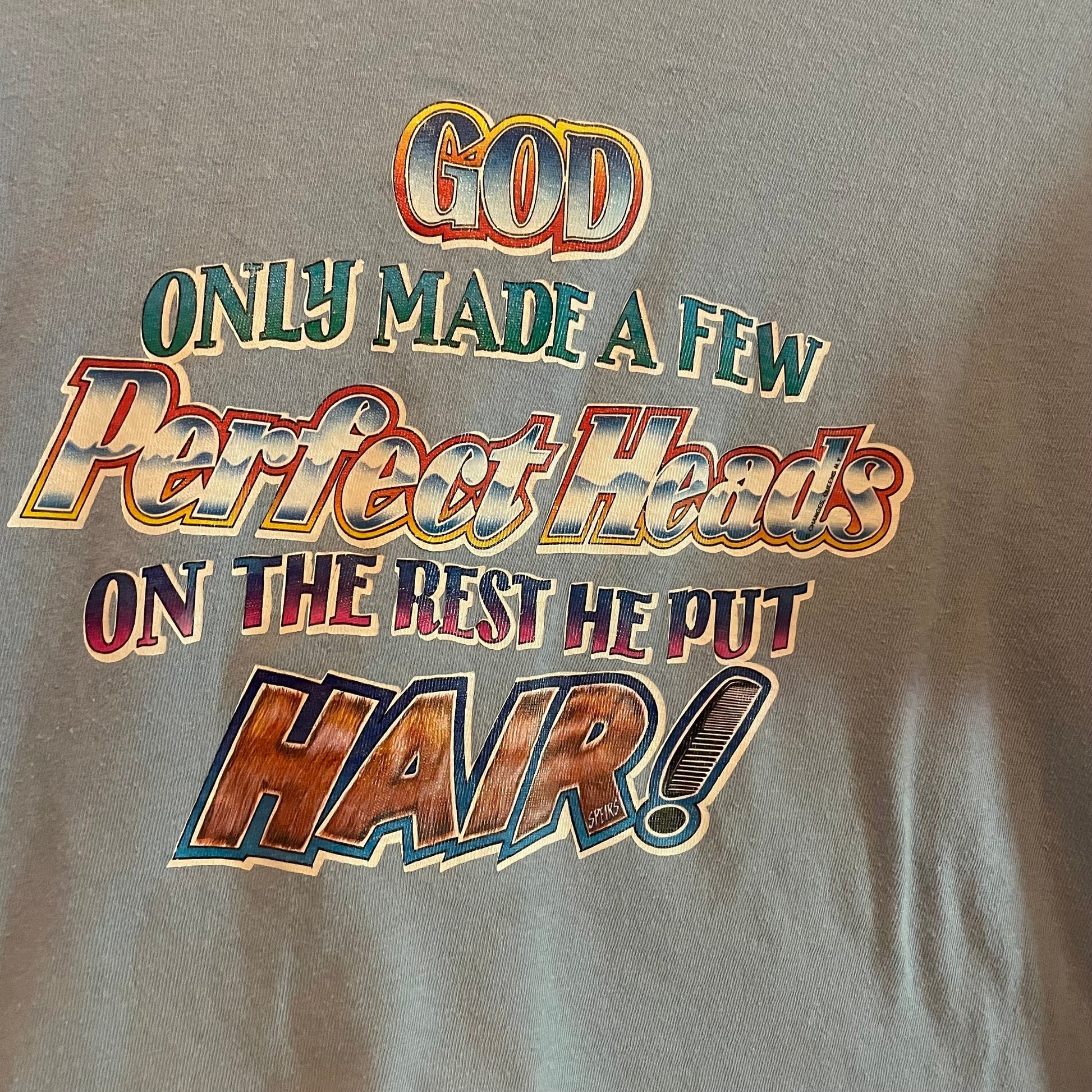 Vtg 70s God made a few perfect heads, on the rest he put hair! Funny bald guy shirt 70s 80s graphic tee iron on t shirt humorous pastel blue