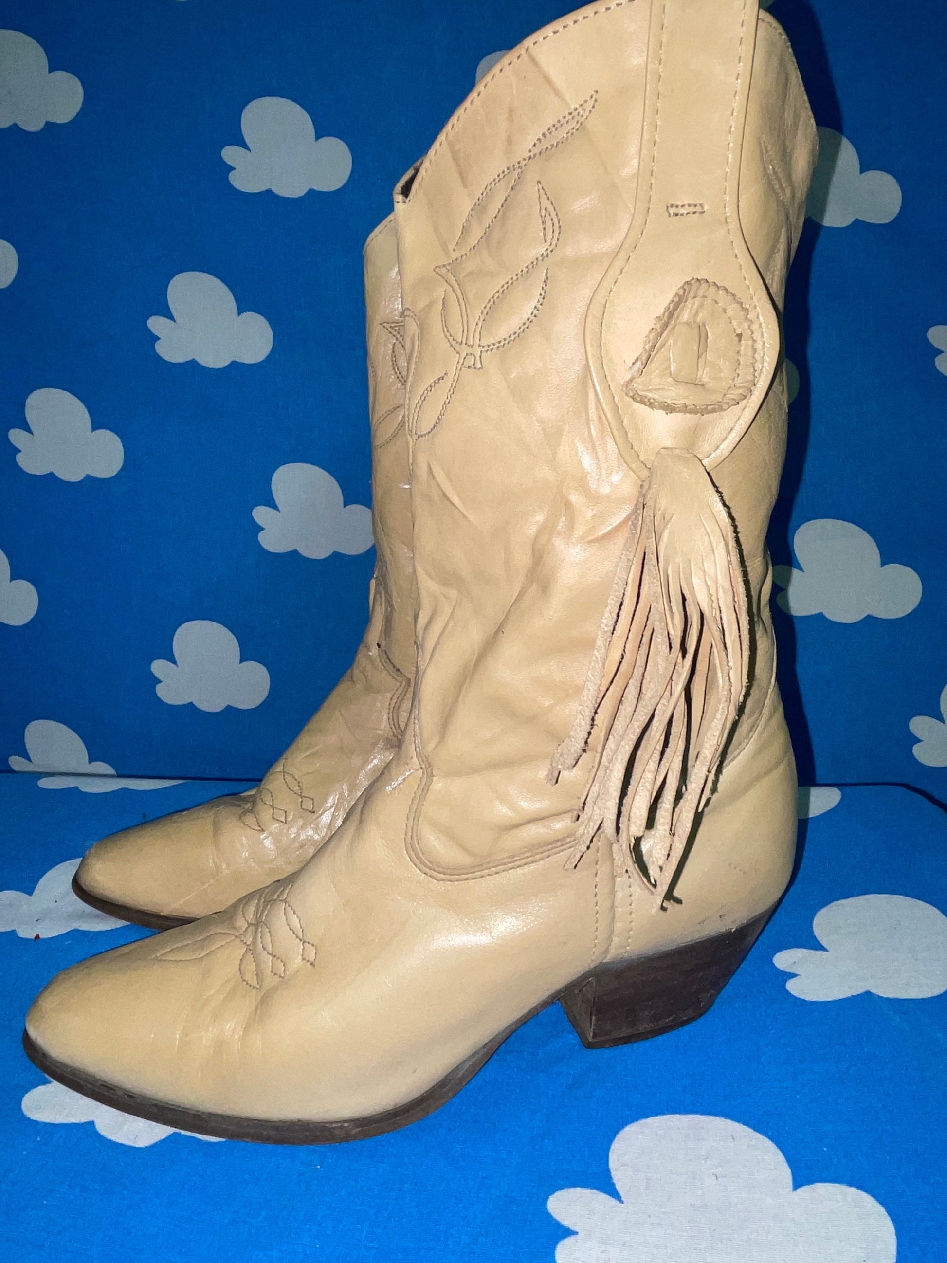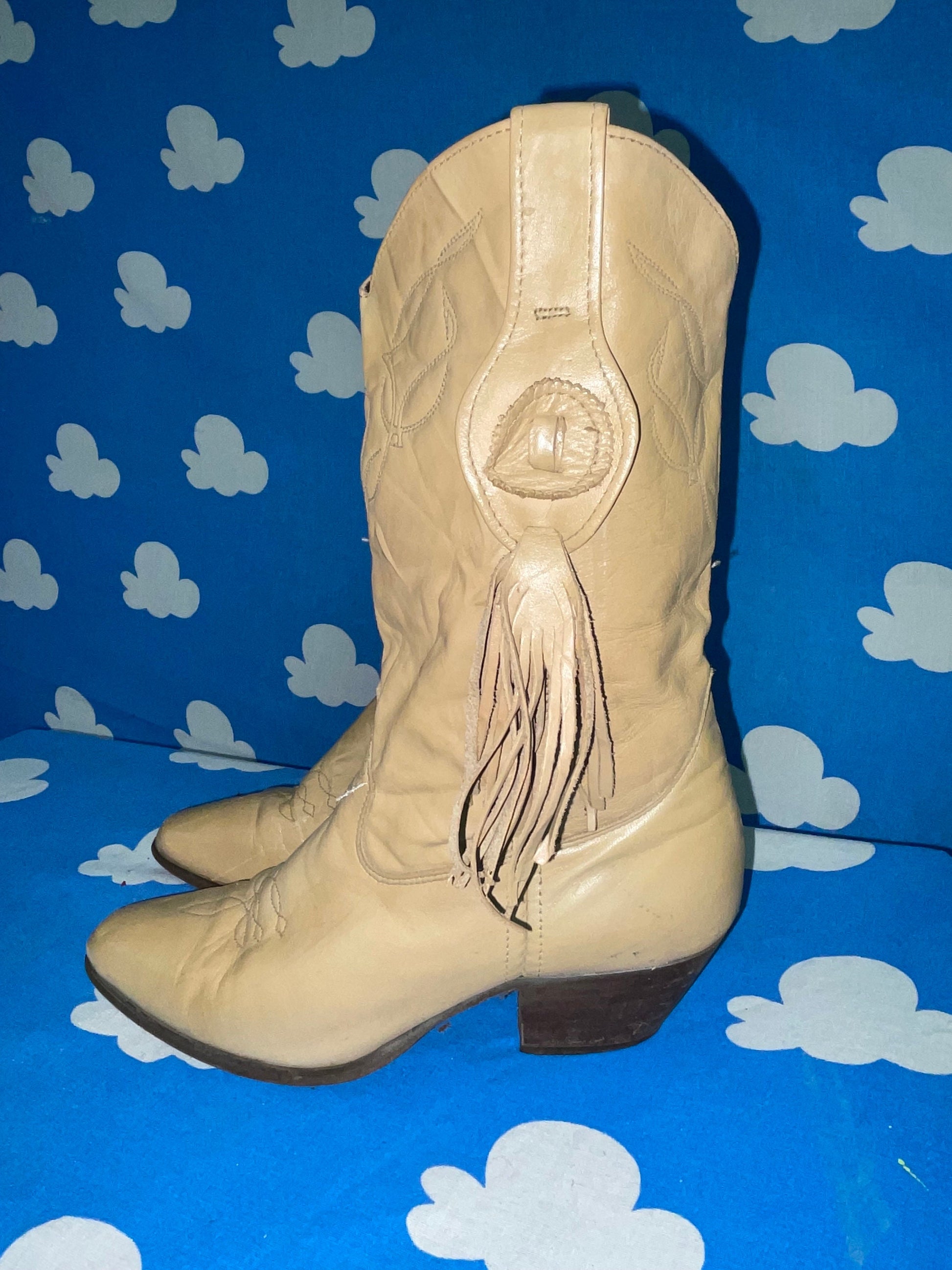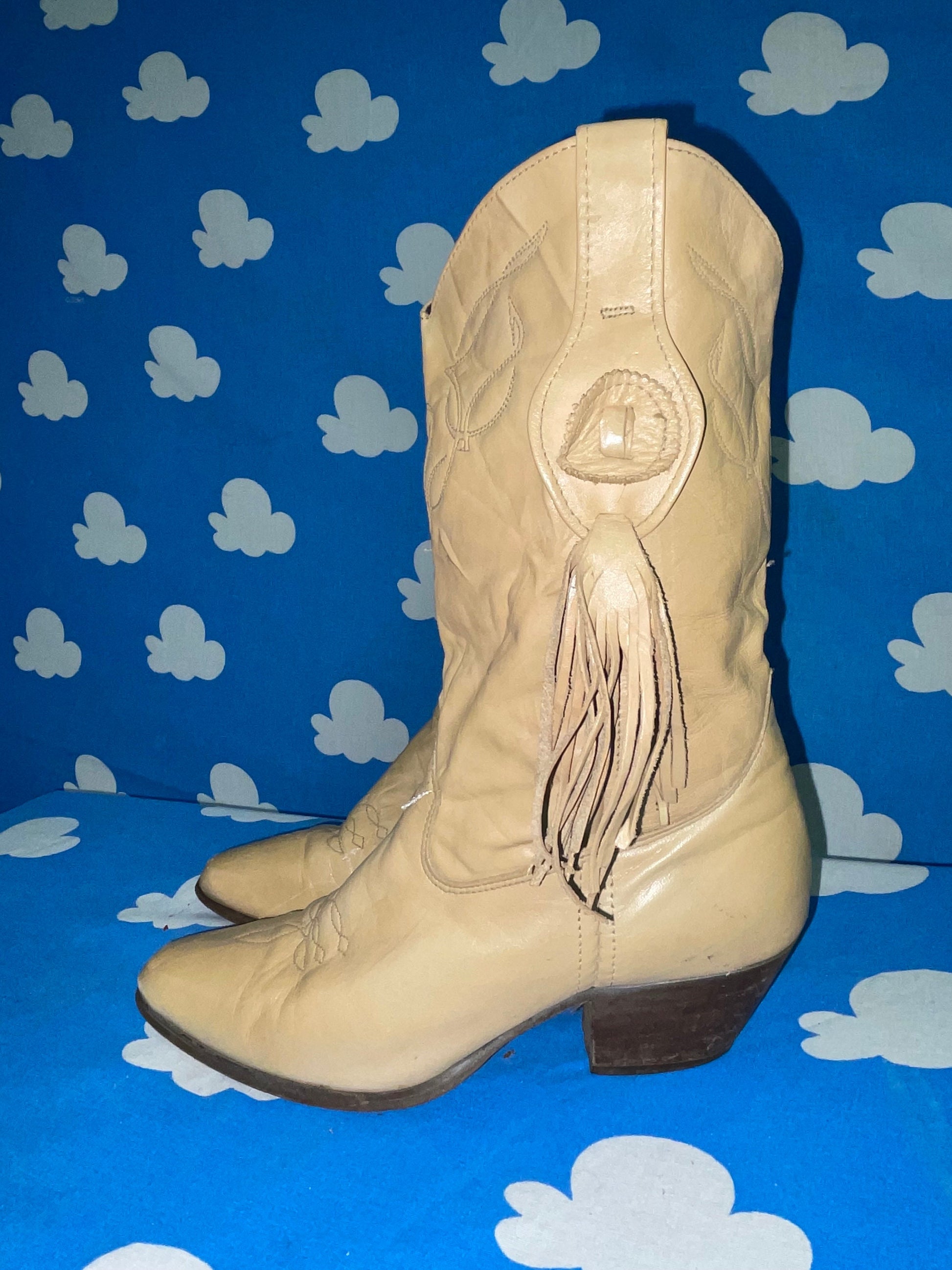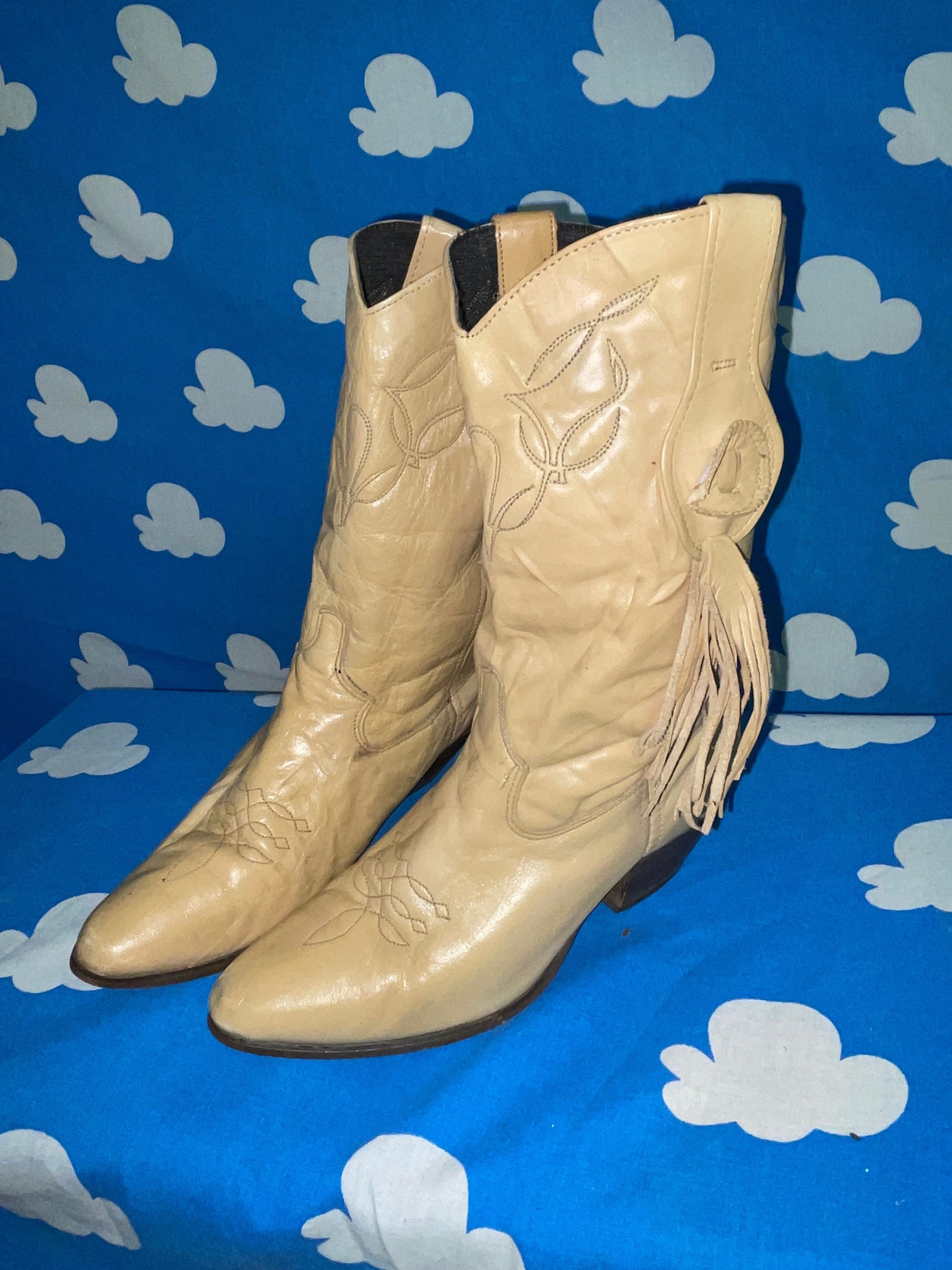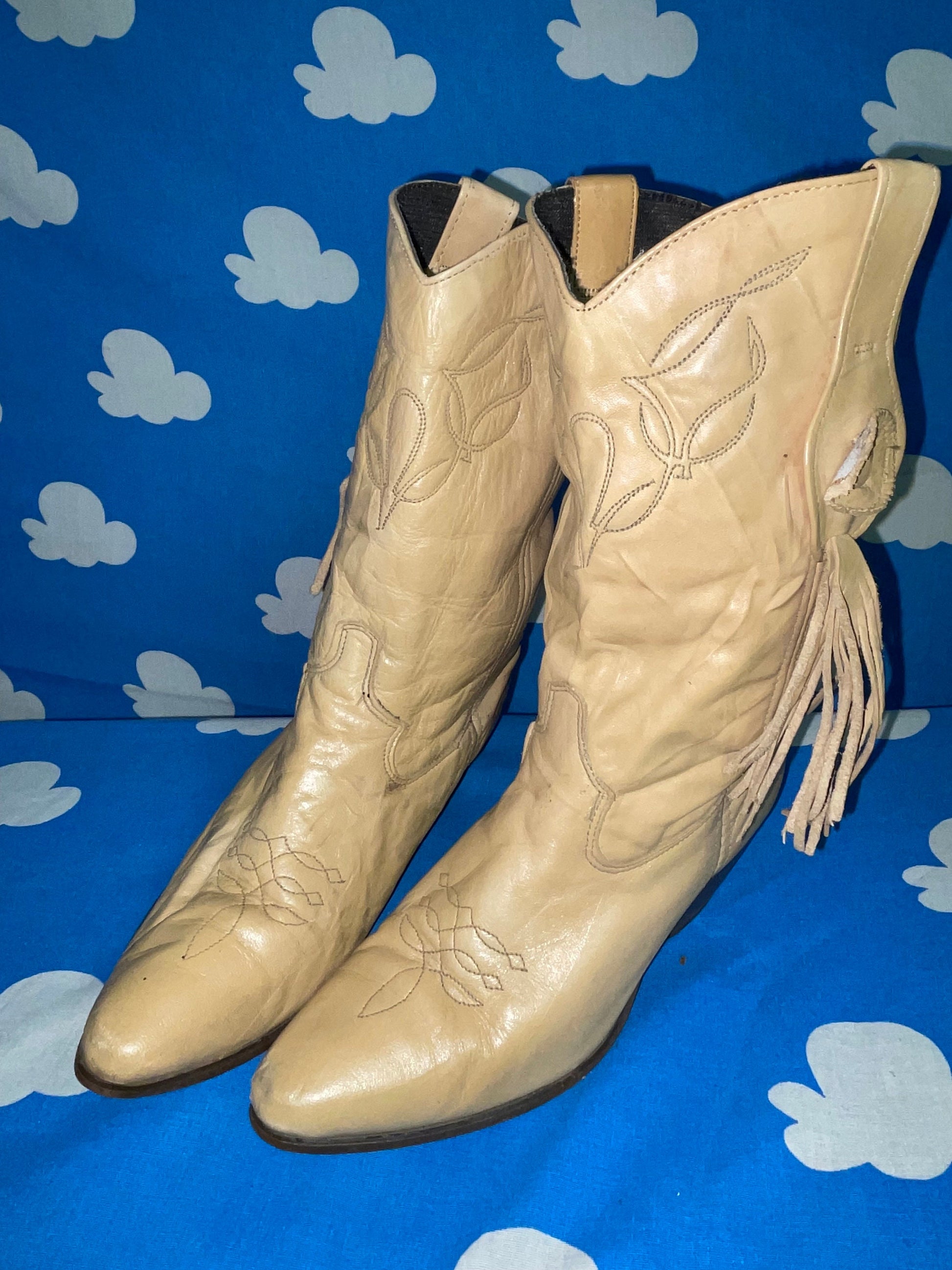 Vtg 70s BEIGE FRINGE BOOTS / 80s boho madonna punk western cowboy cowgirl tan leather pointy toe ankle boots autumn grunge baby doll dress