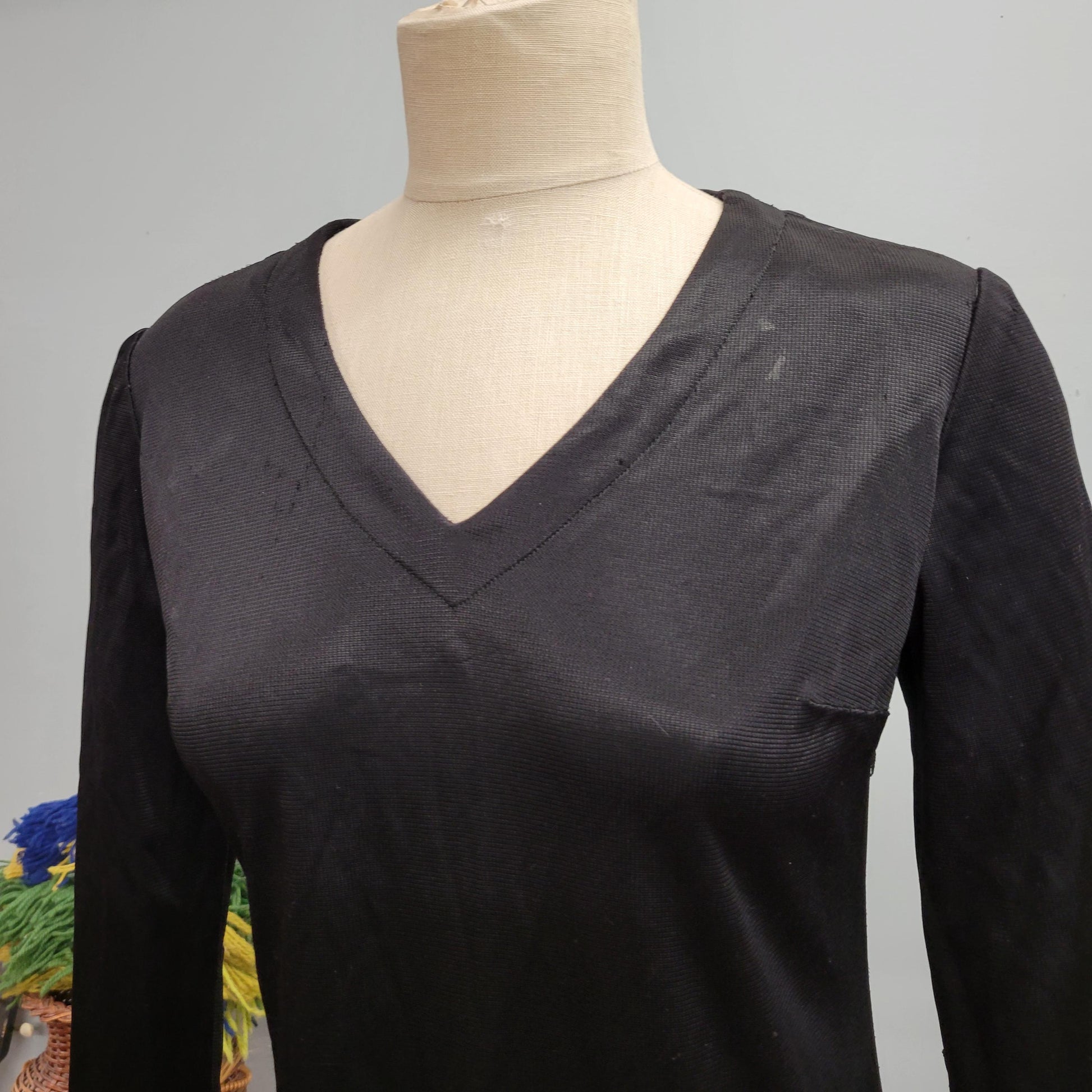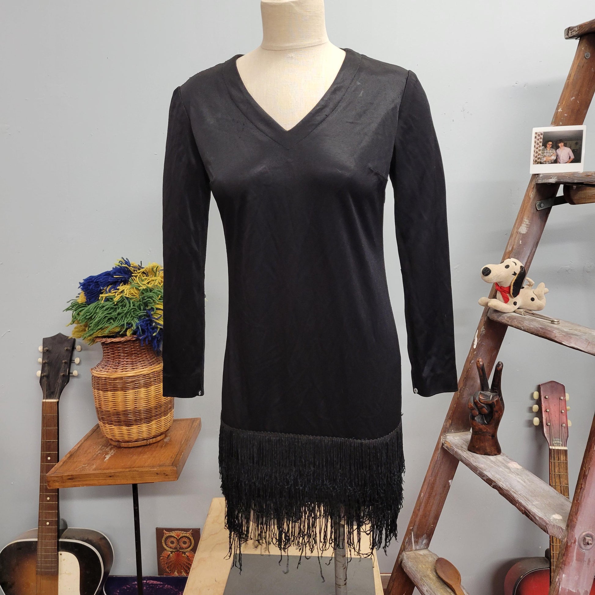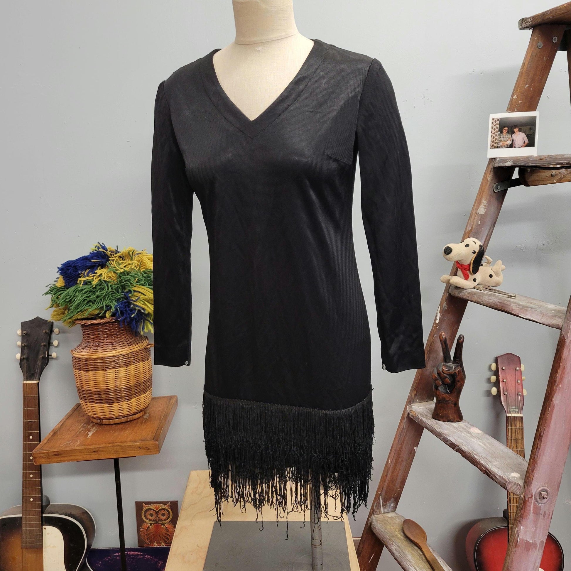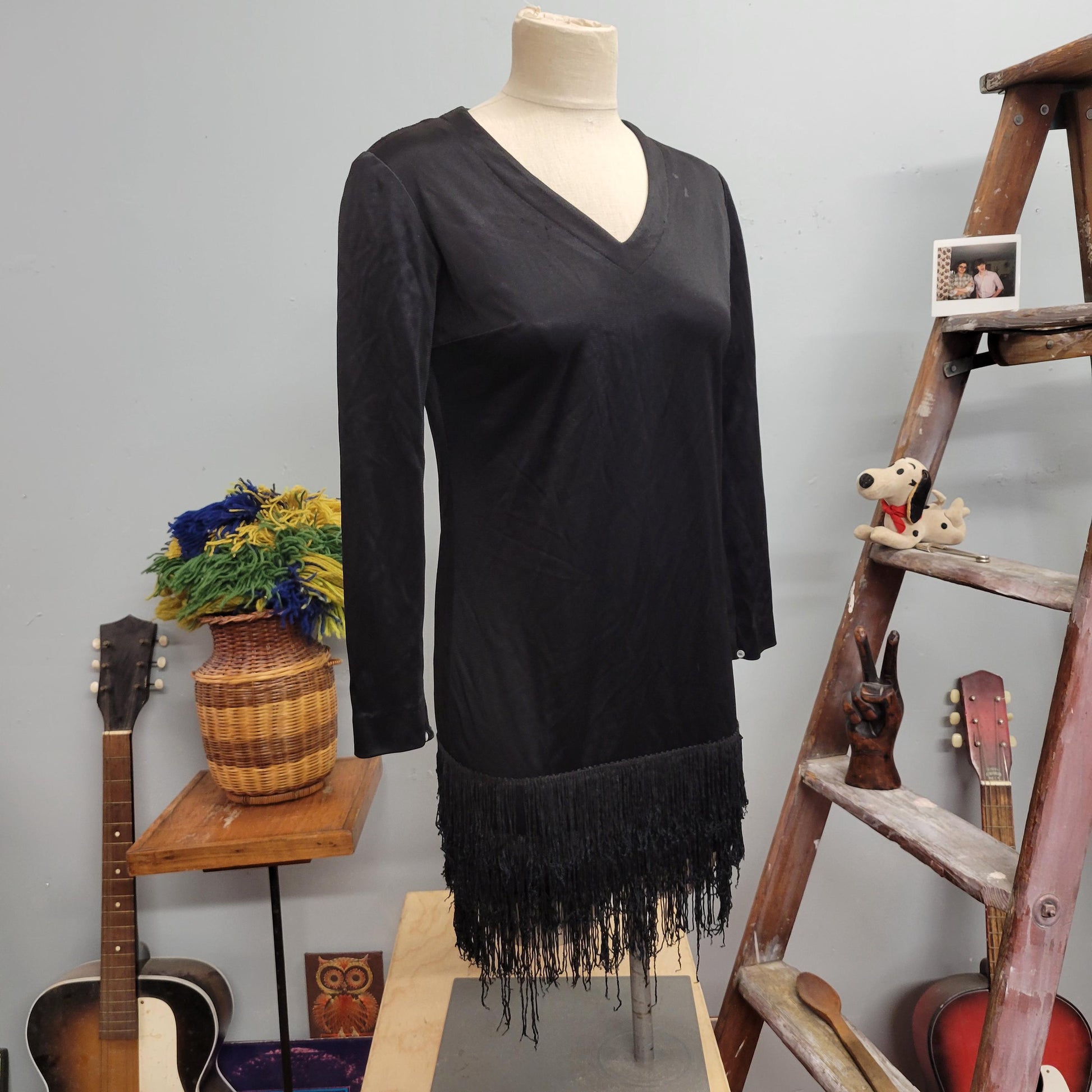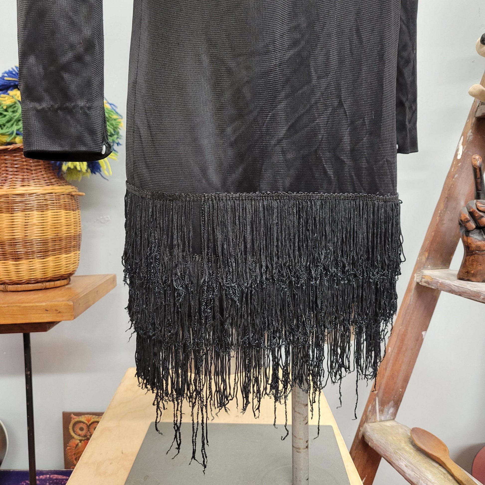 vtg 70s BLACK FRINGE DRESS // vintage flapper style long sleeve womens medium little black dress cocktail xmas party vneck retro mini dress