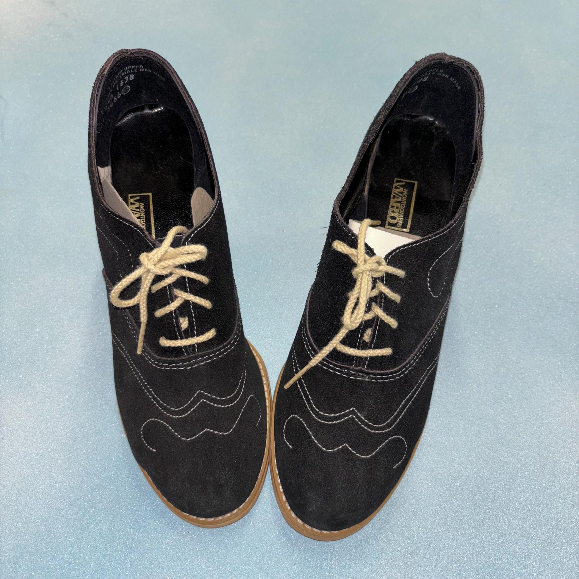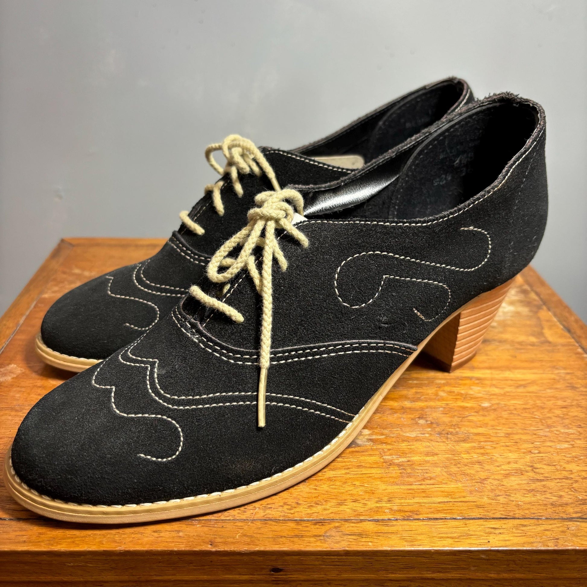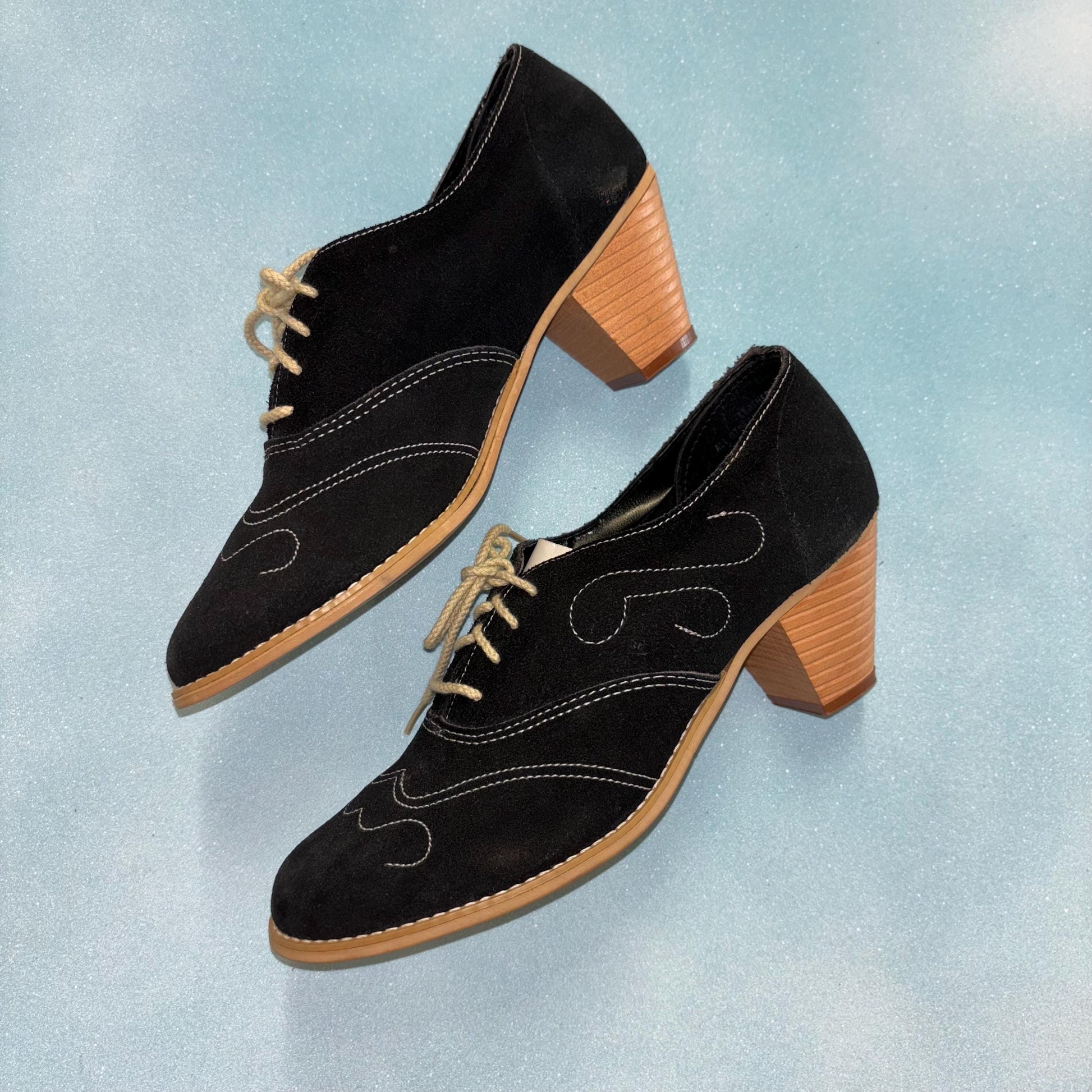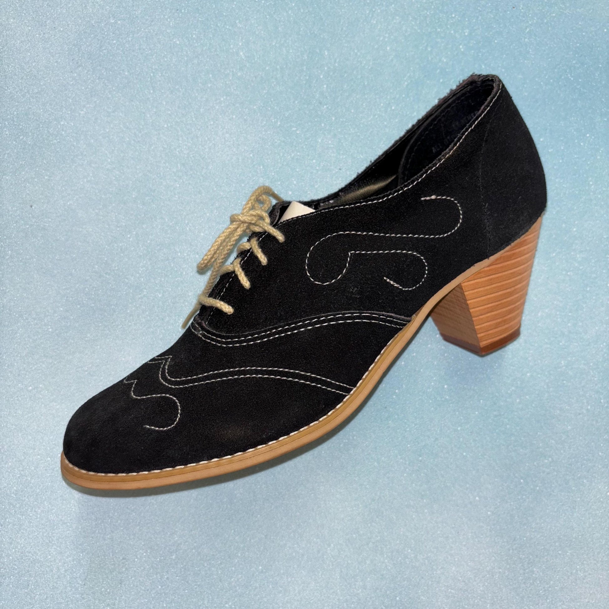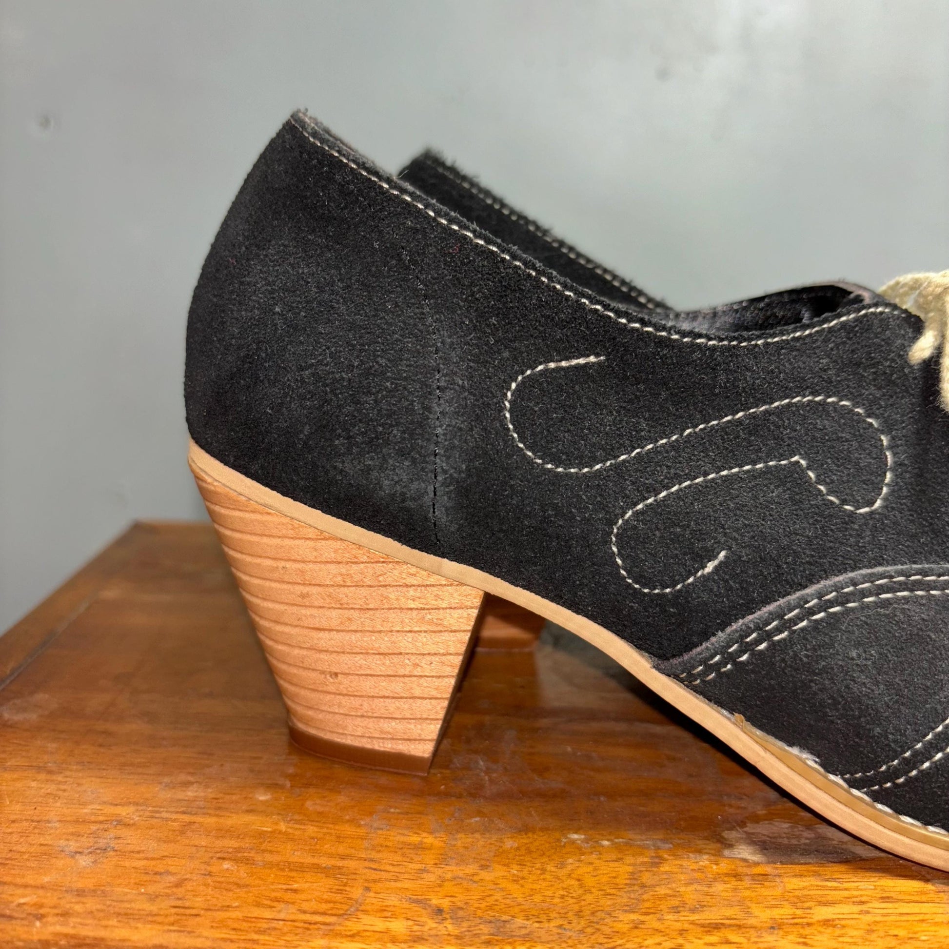 cute black suede chainstitch wooden heels