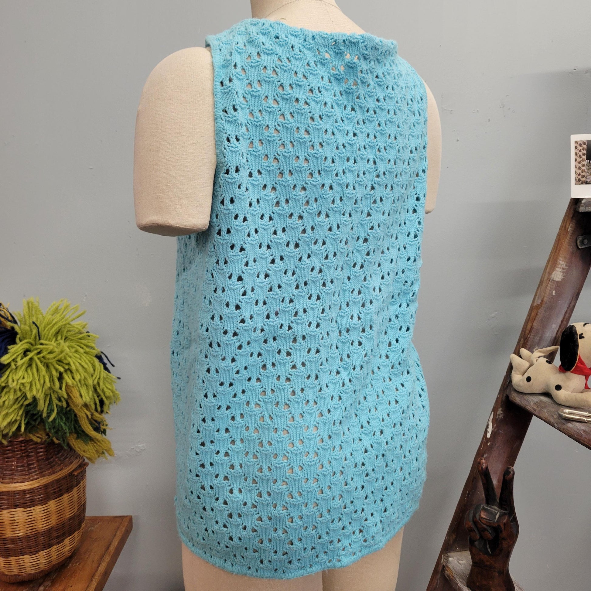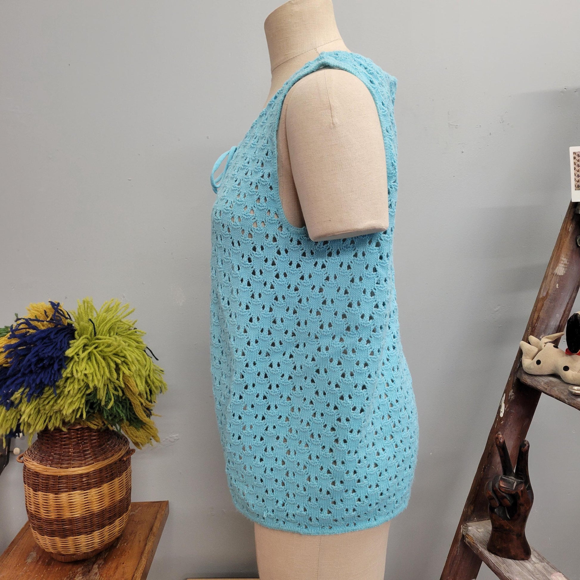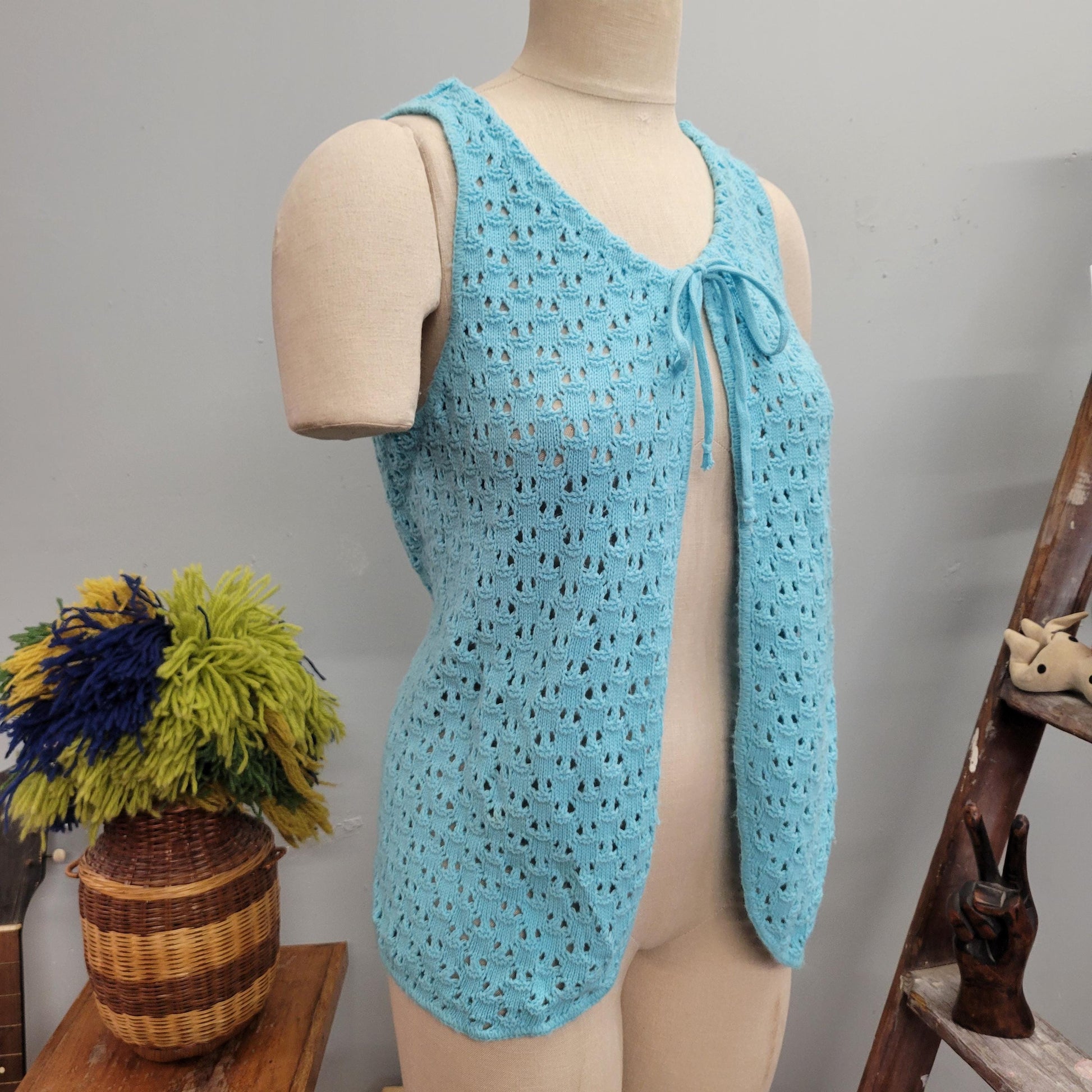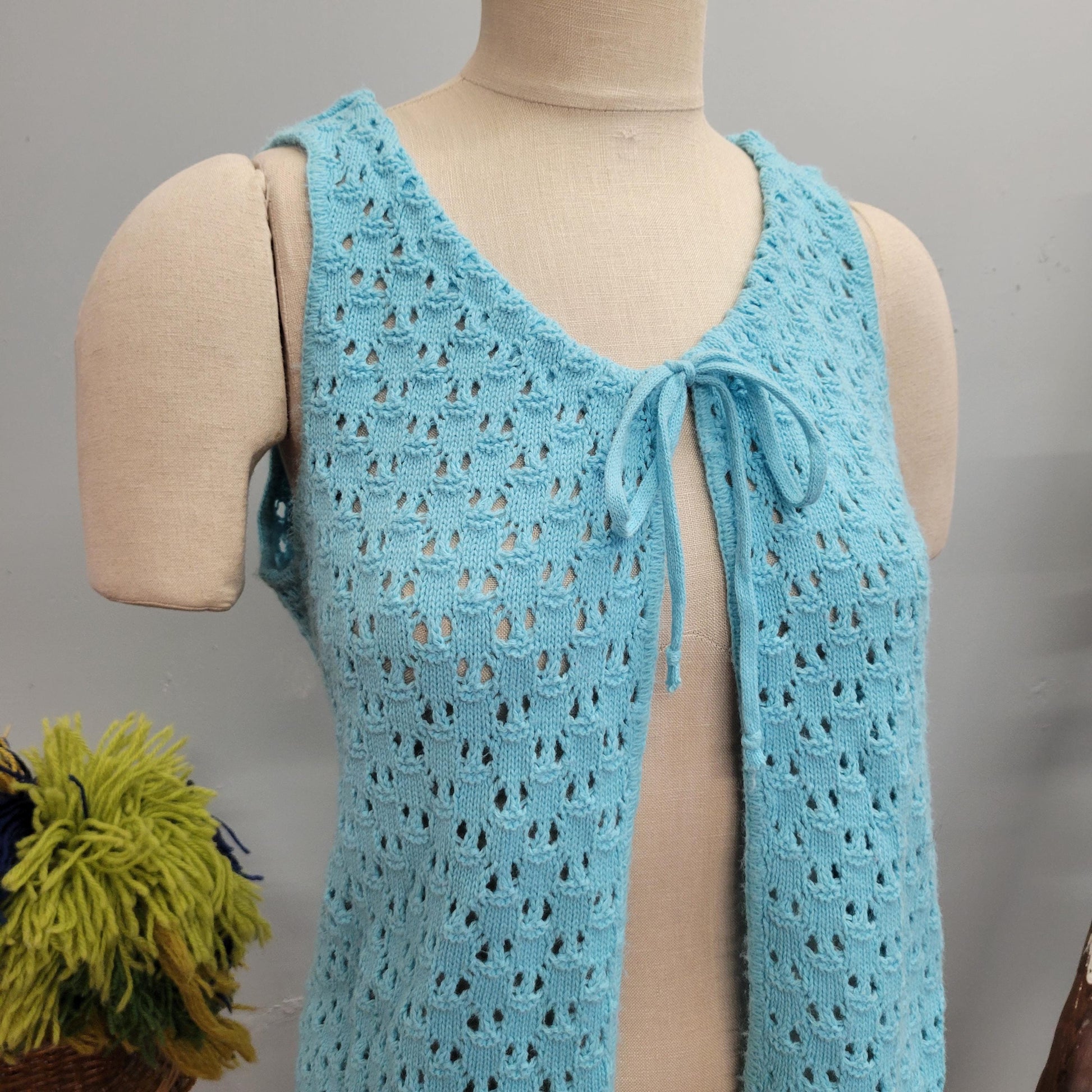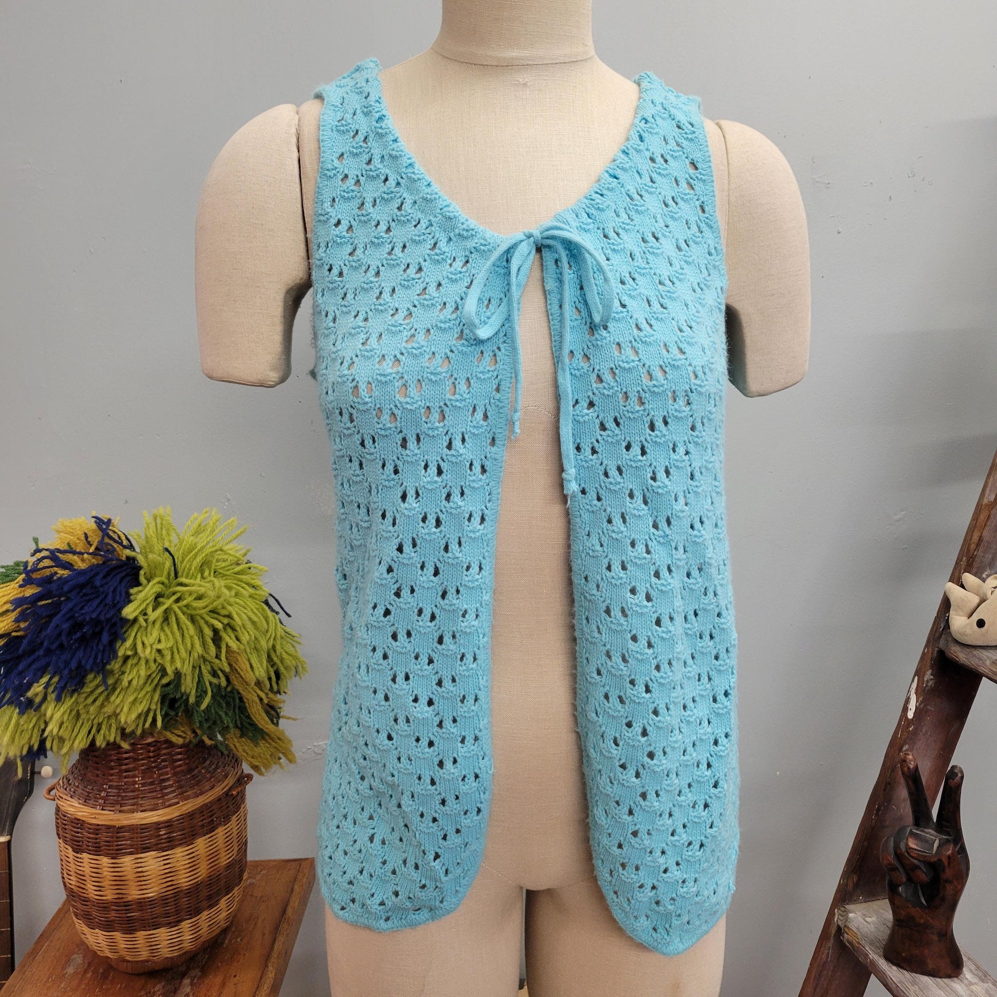 Vtg 70s BLUE KNIT VEST // vintage pandora cute tie top autumn layers crochet afghan blanket jacket pastel dreamy waistcoat 70s mod retro top