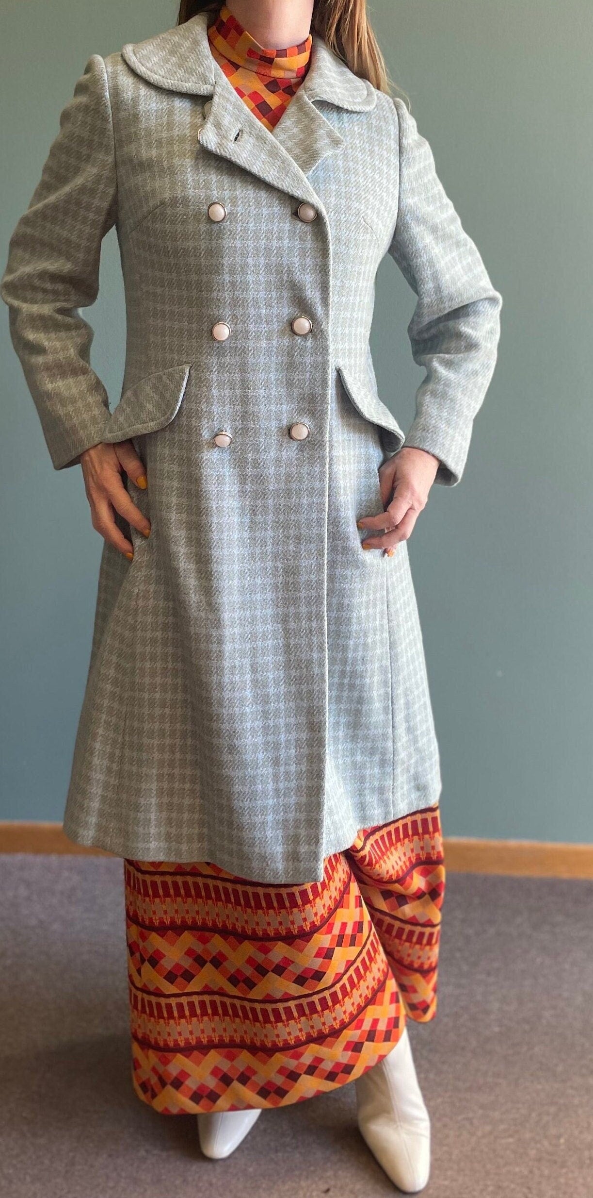 Vintage 70s Baby Blue Plaid Jacket / Butterfly Collar Long Maxi Coat / 60s 70s Lorendale Mod Peacoat