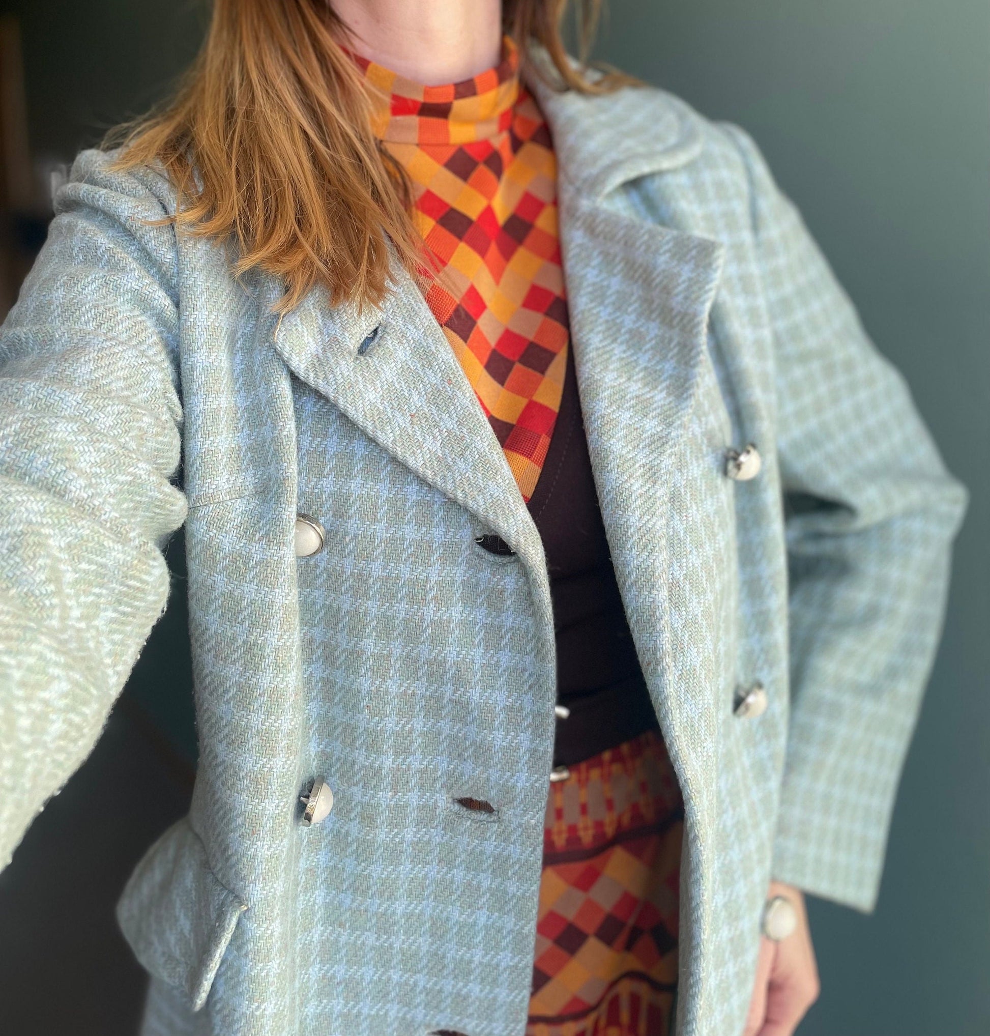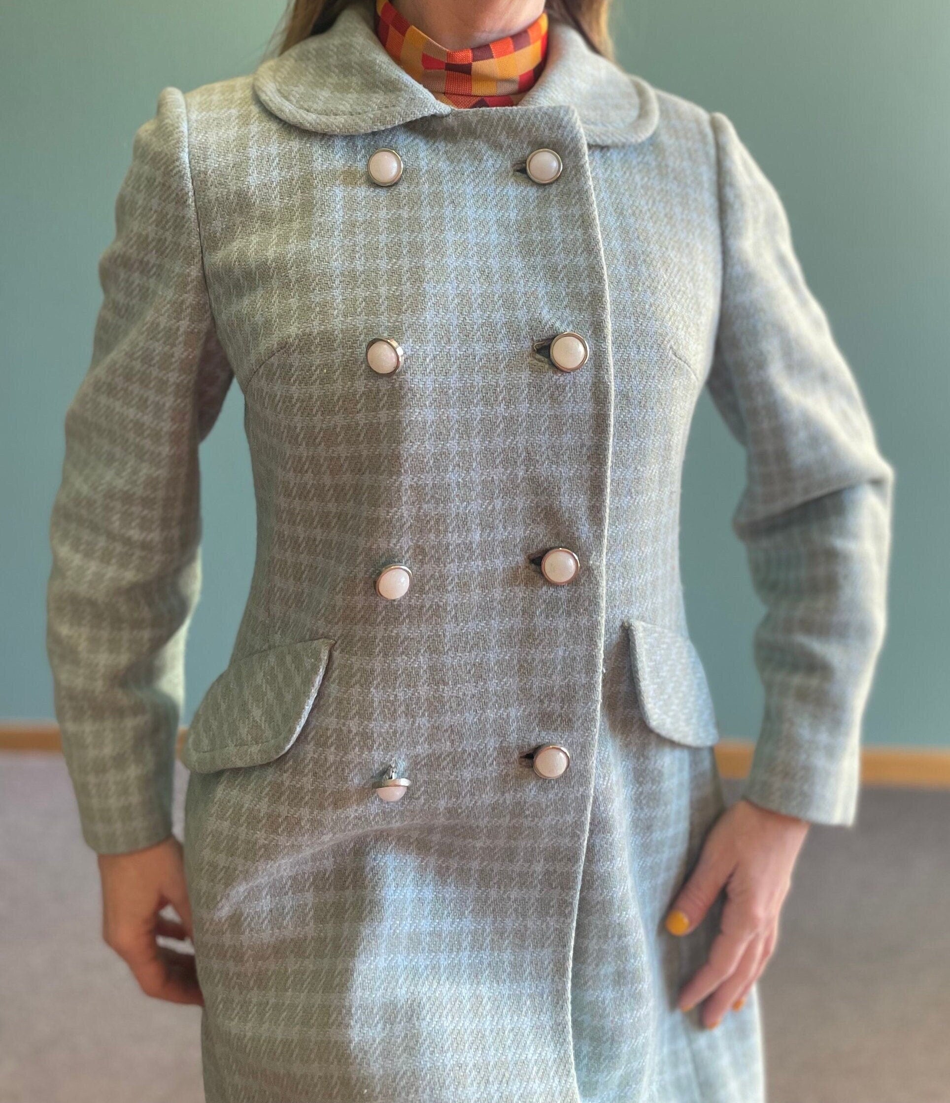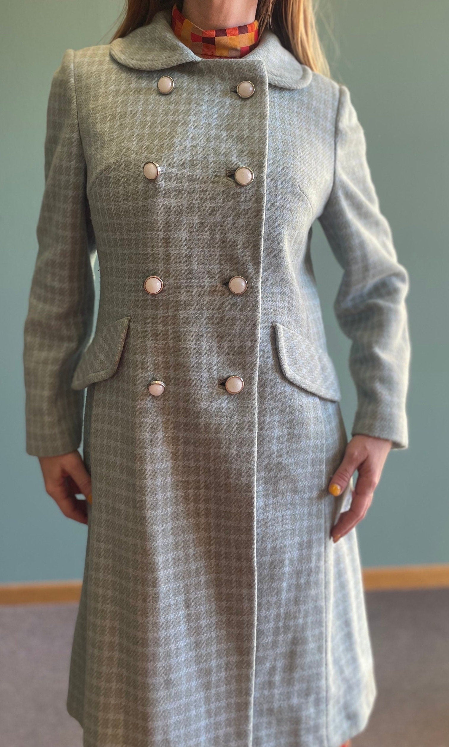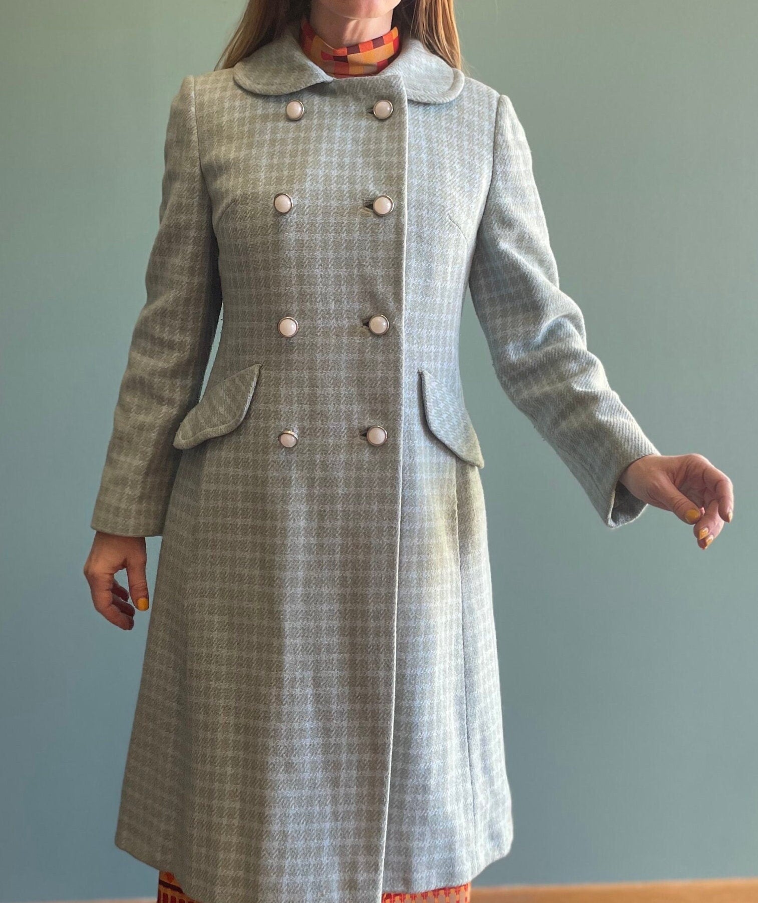 vtg 70s BLUE PLAID JACKET // butterfly pan collar long maxi coat Lorendale mod peacoat Blair Waldorf preppy pastel blue checkered retro