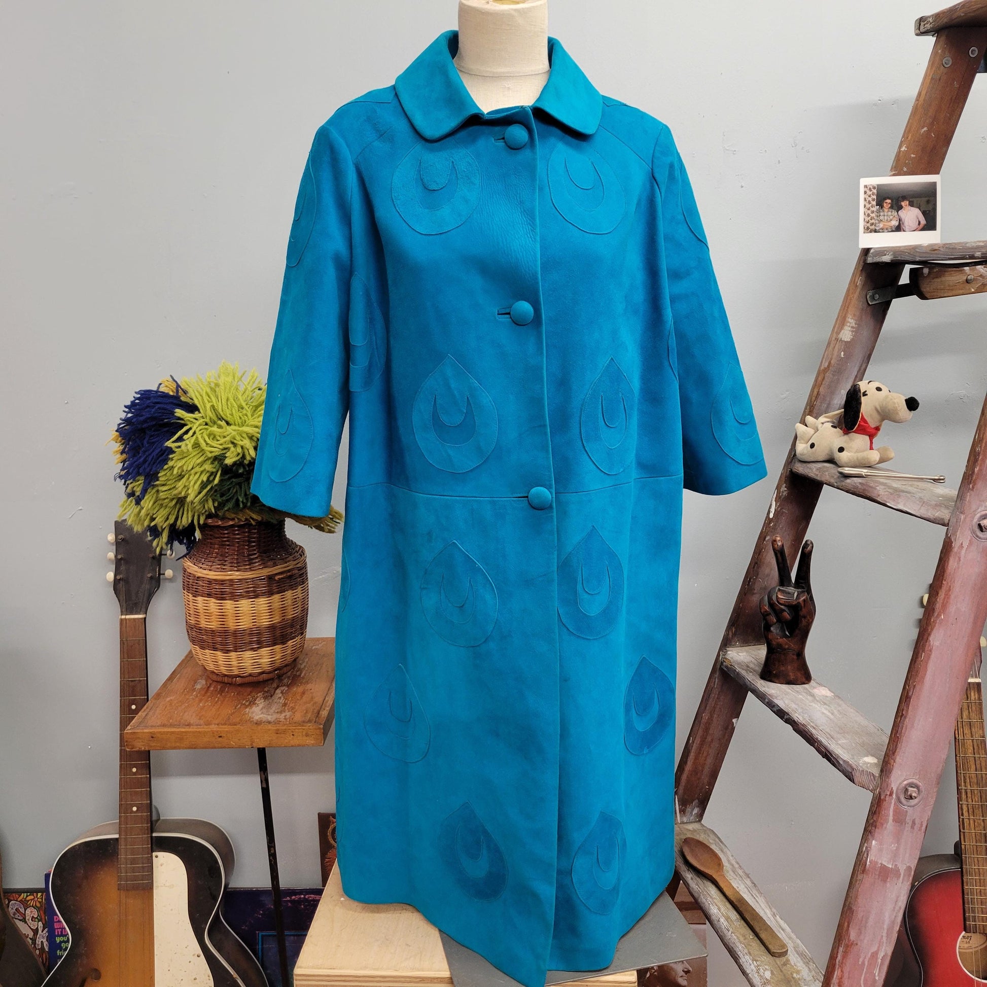 vtg 70s BLUE SUEDE COAT / vintage womens large jacket cardinale madrid raindrop hand tooled leather cut out patchwork bright funky statement