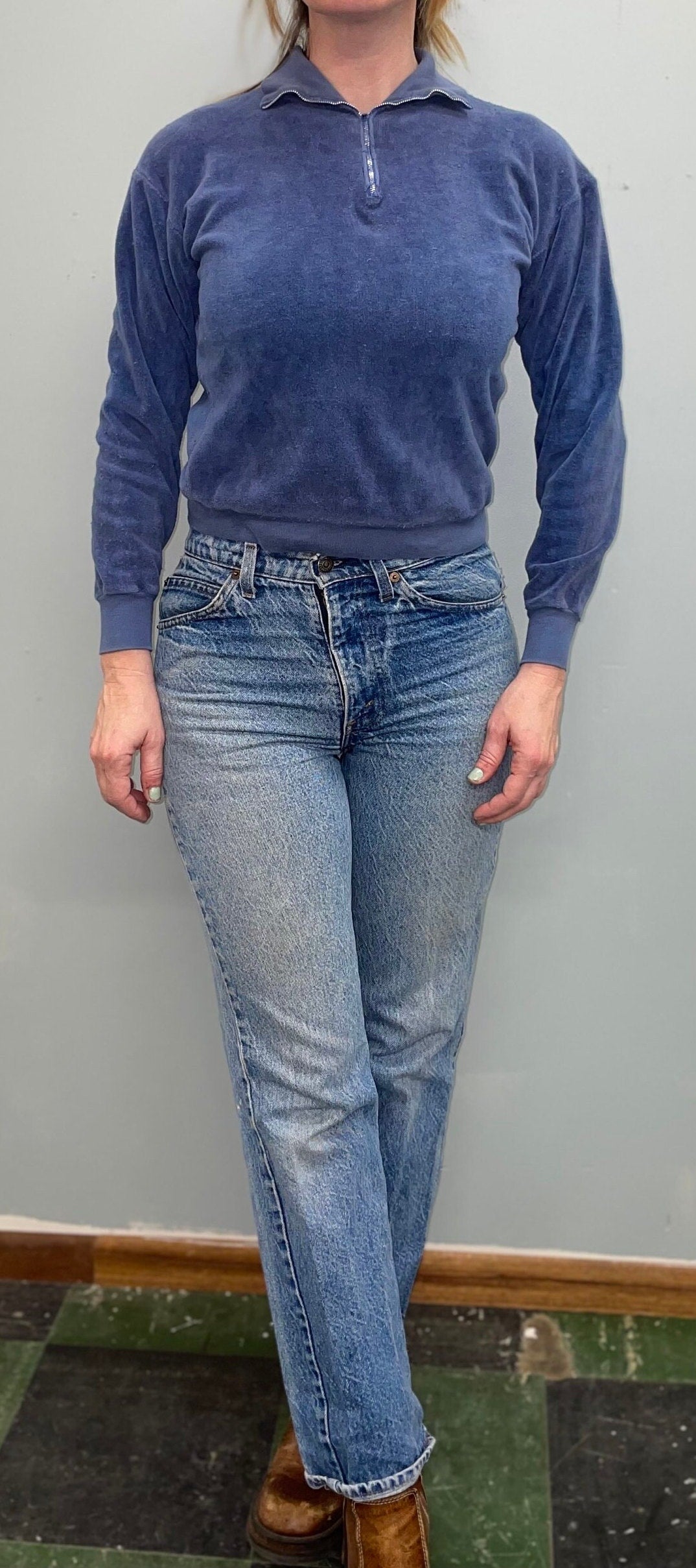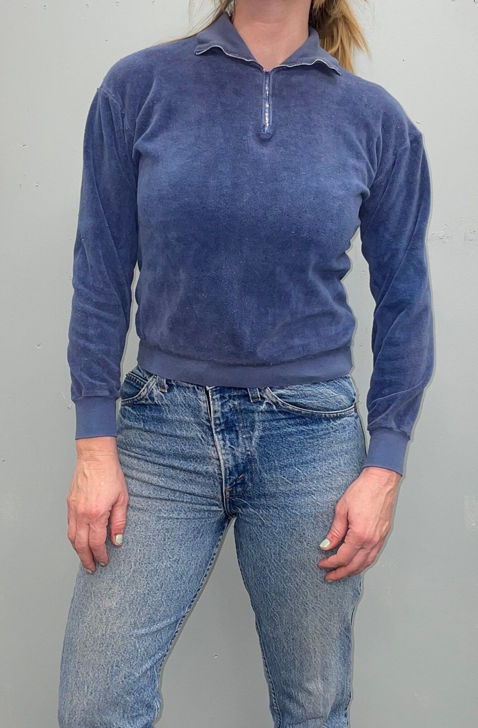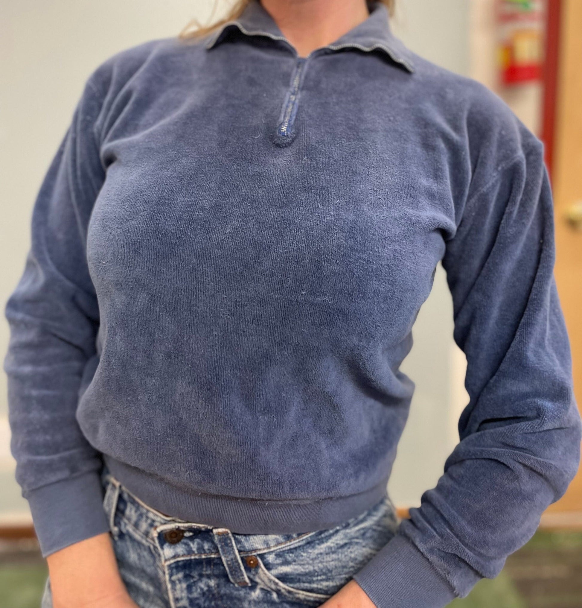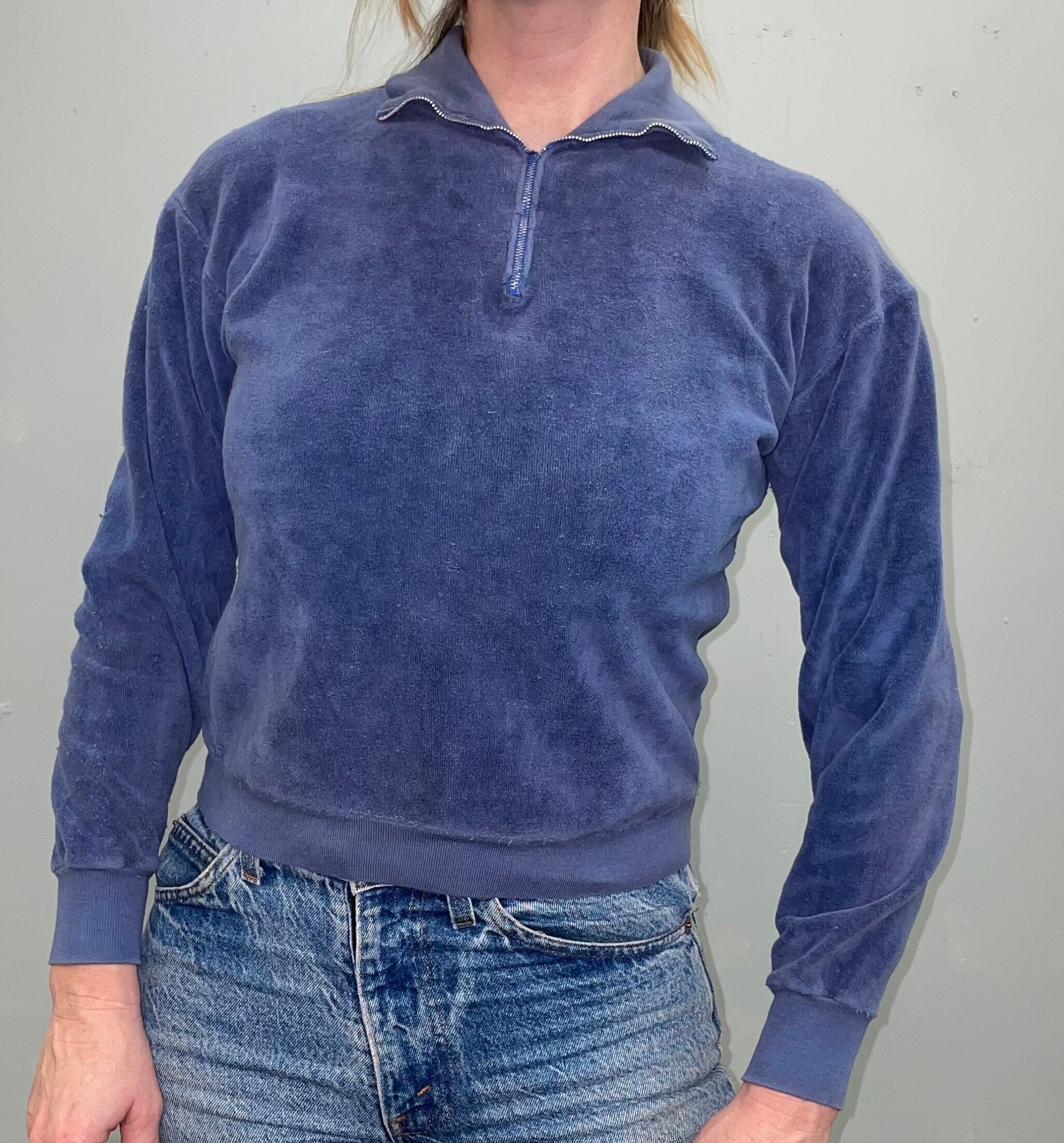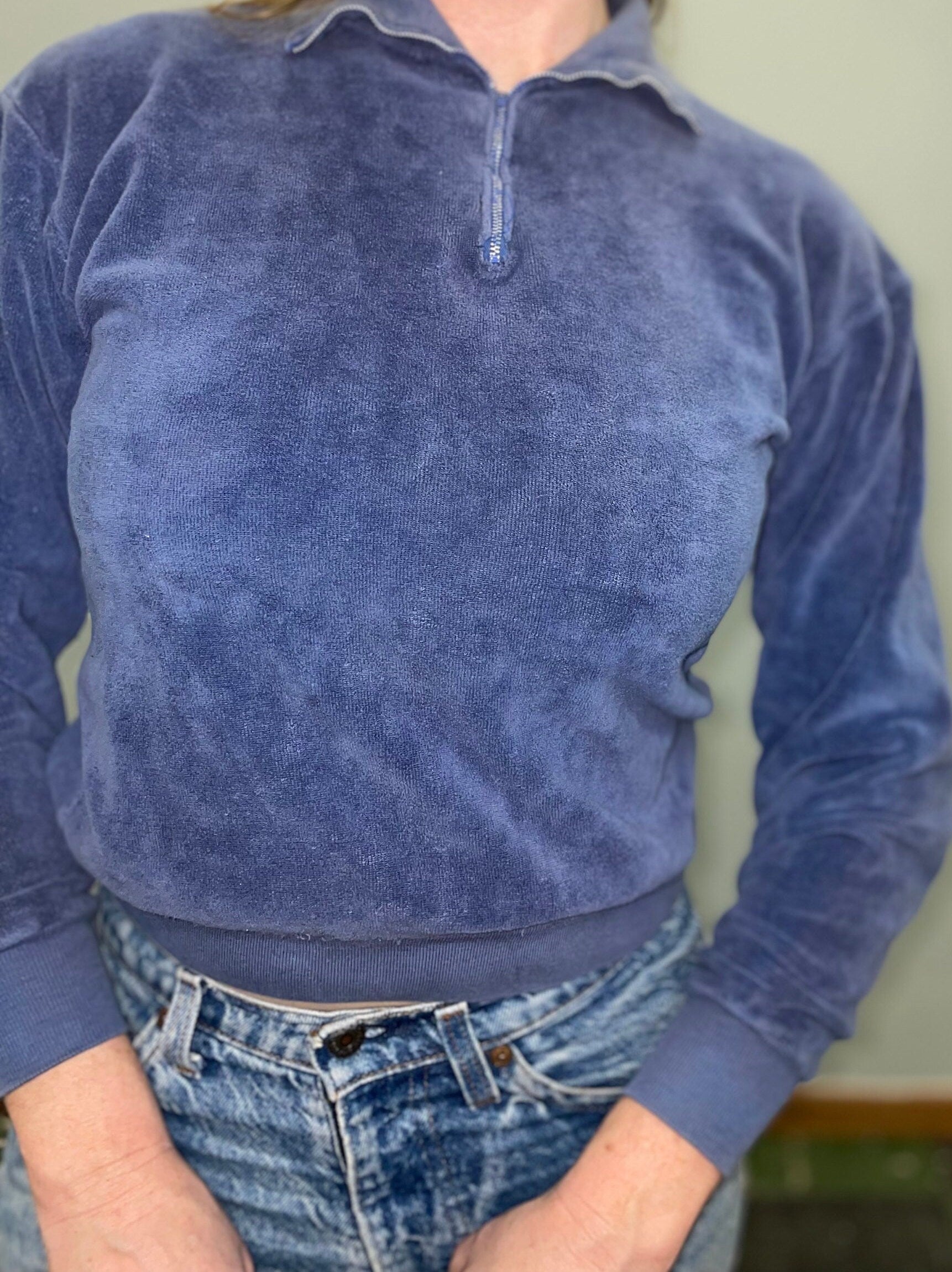 vtg 70s BLUE VELOUR SHIRT // vintage quarter zip distressed youth large soft fitted cropped sweatshirt long sleeve petite womens autumn top