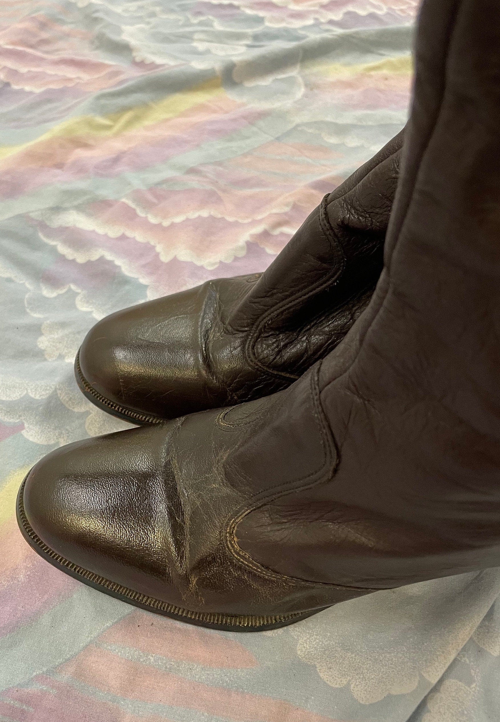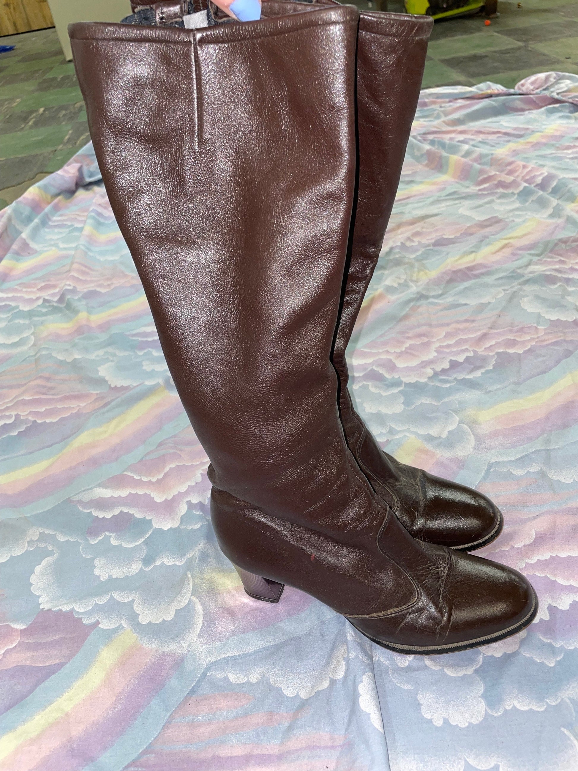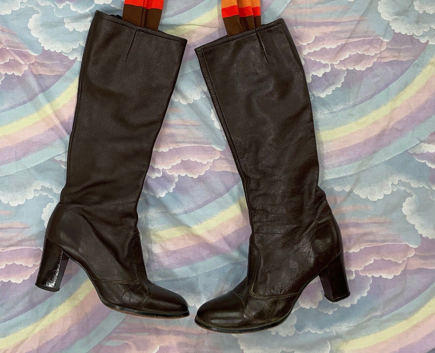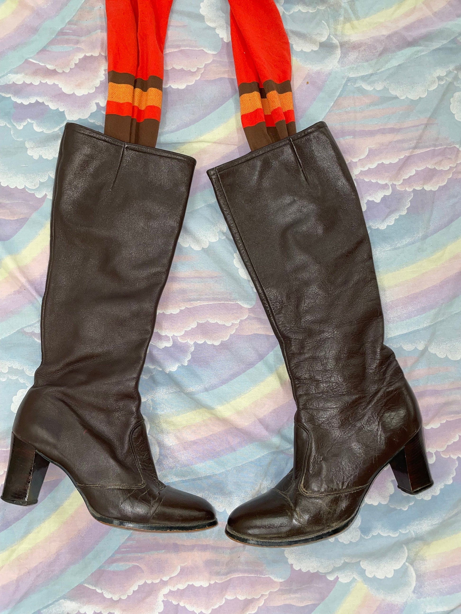 Vtg 70s dark brown leather boots zip up sleek chocolate brown boho chic knee high nancy sinatra go go boots calf high mini skirt hot pants