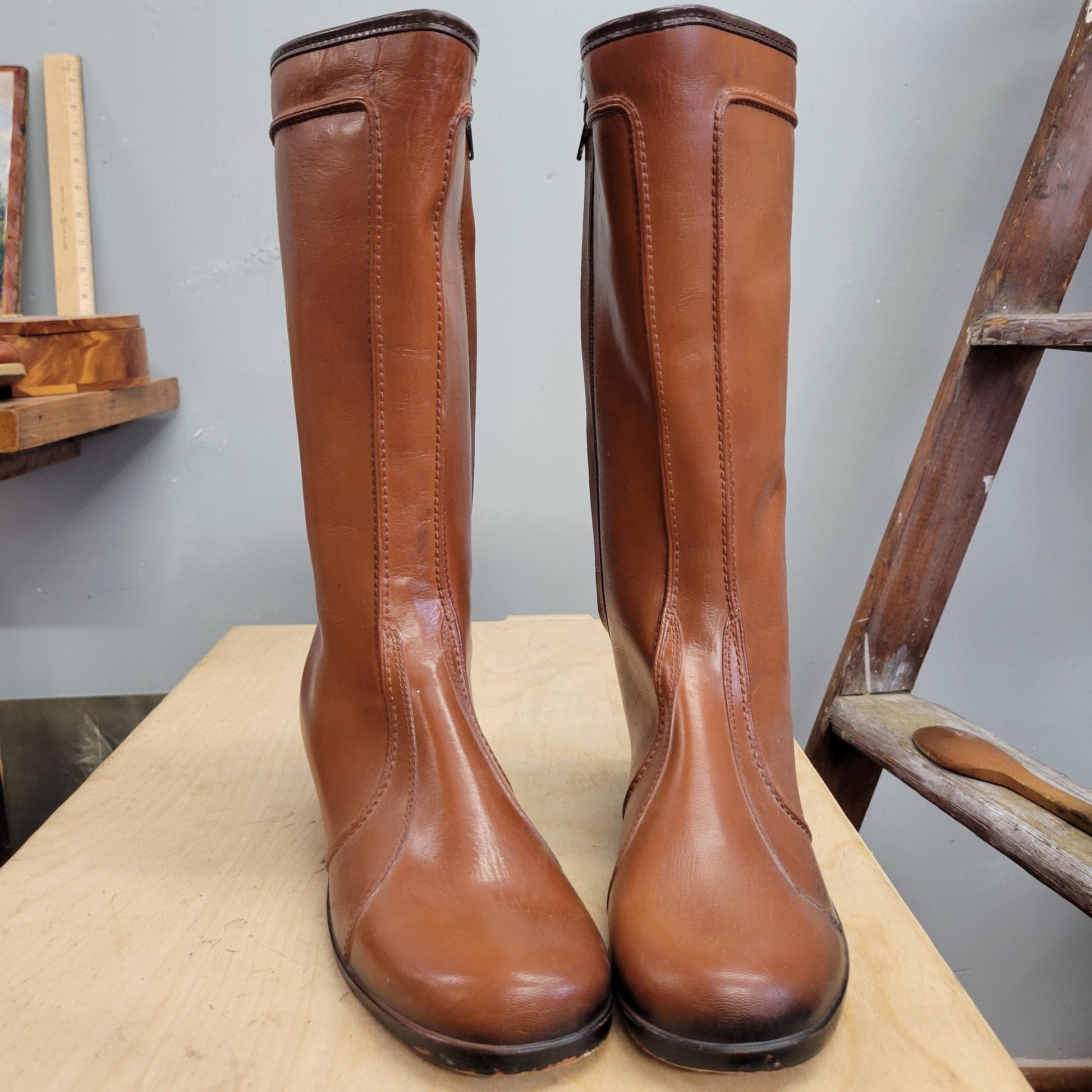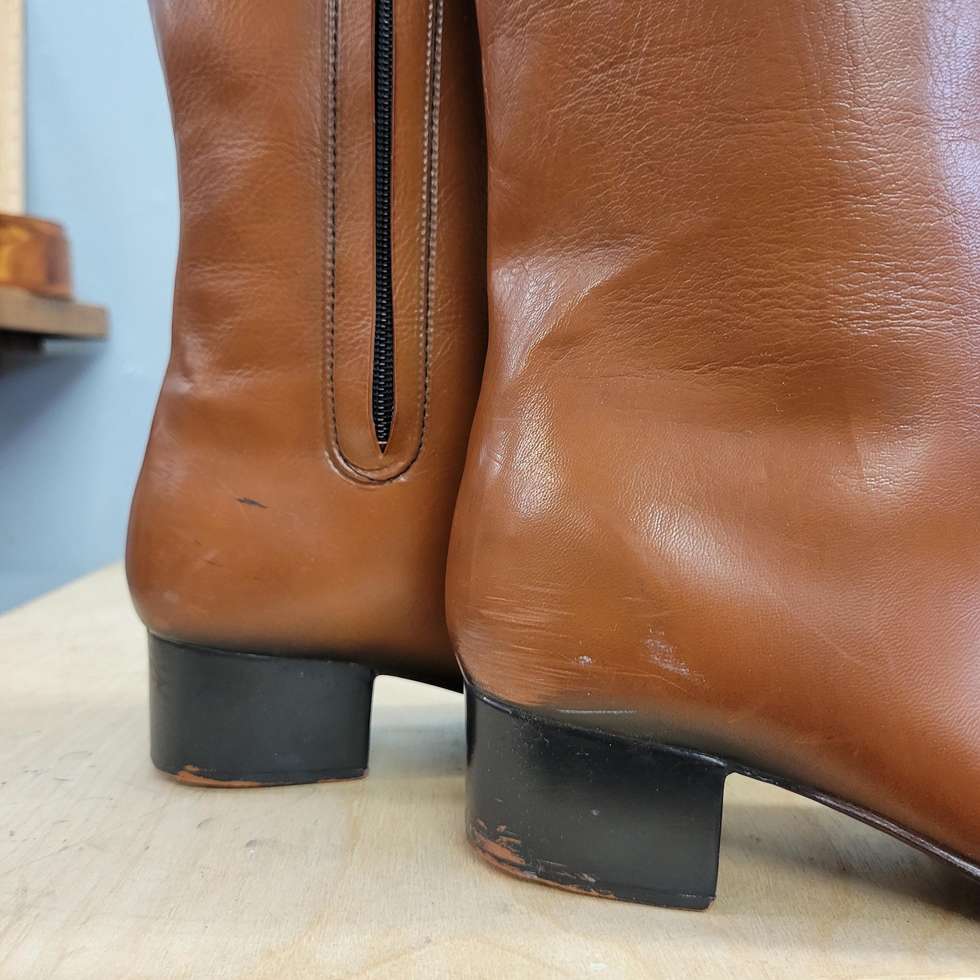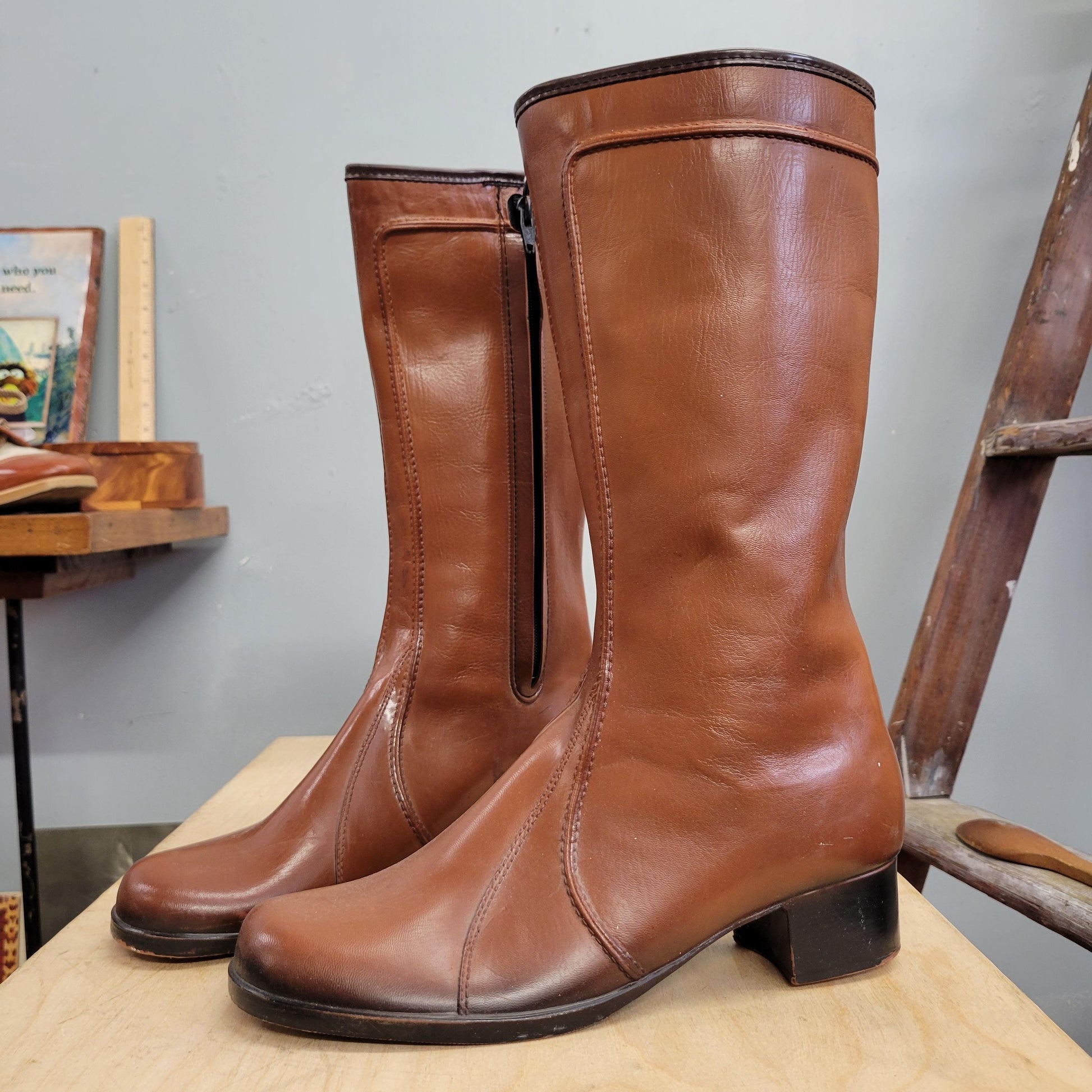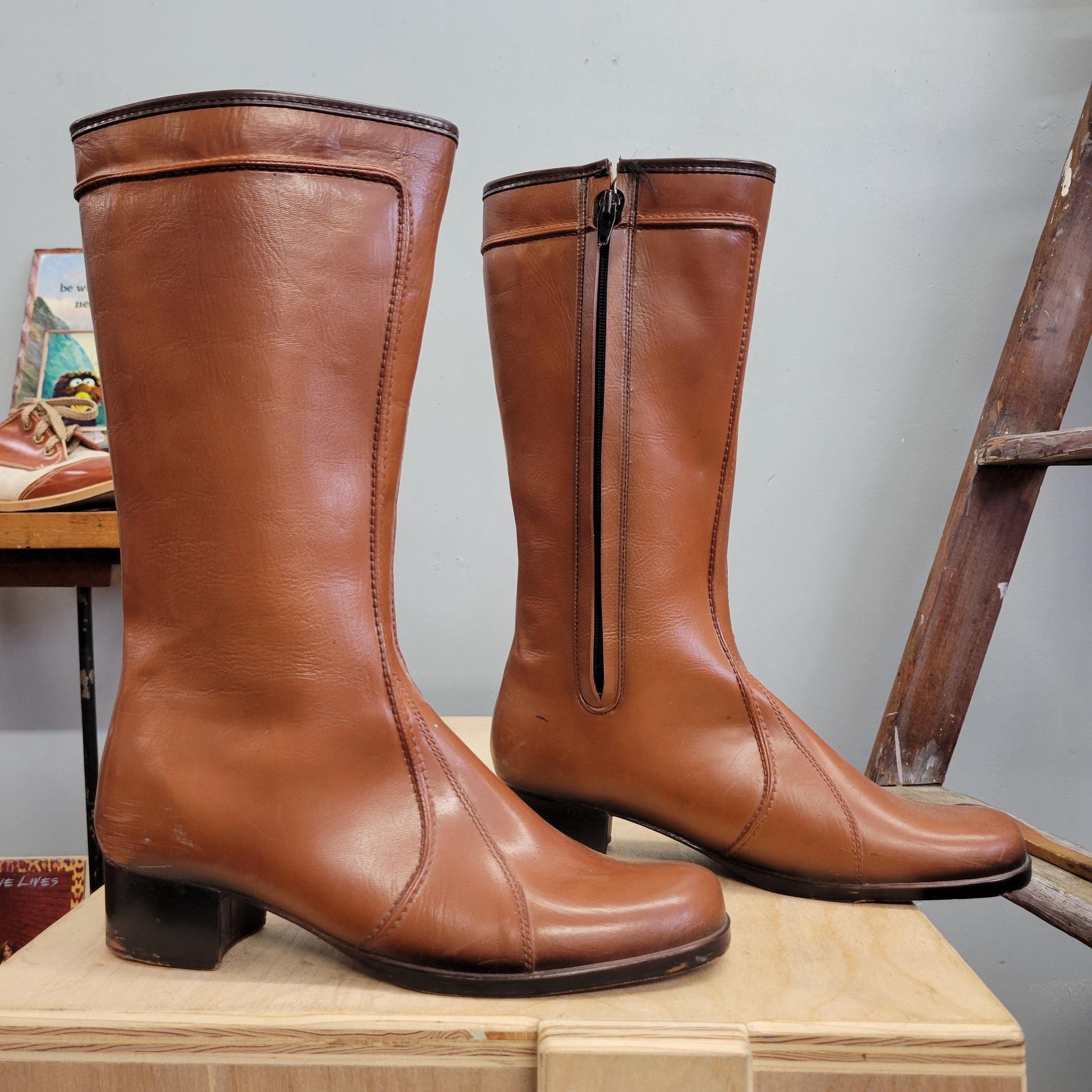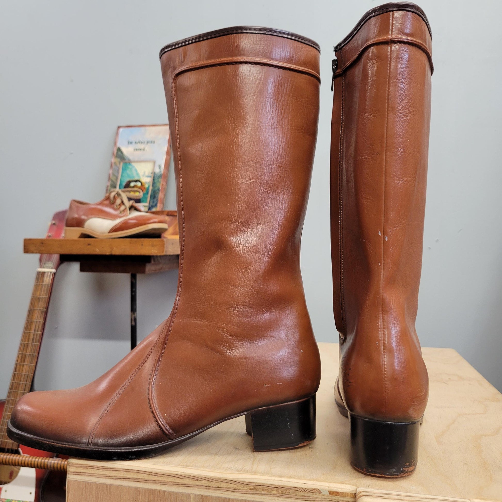 vtg 70s BROWN LEATHER BOOTS // vintage sears tan leather size 10 womens usa calf high chic autumn riding boots waterprrof fancy snow boots