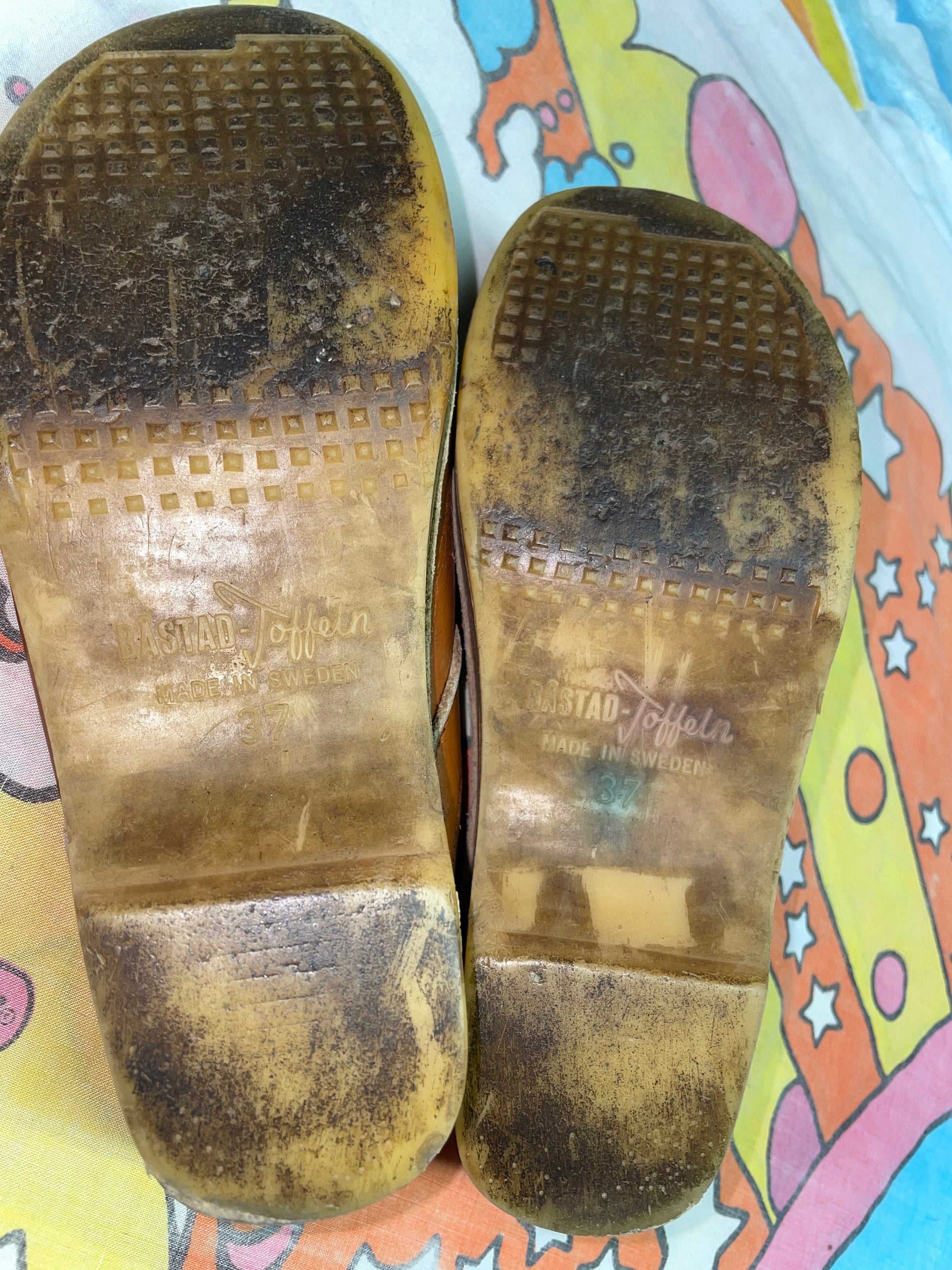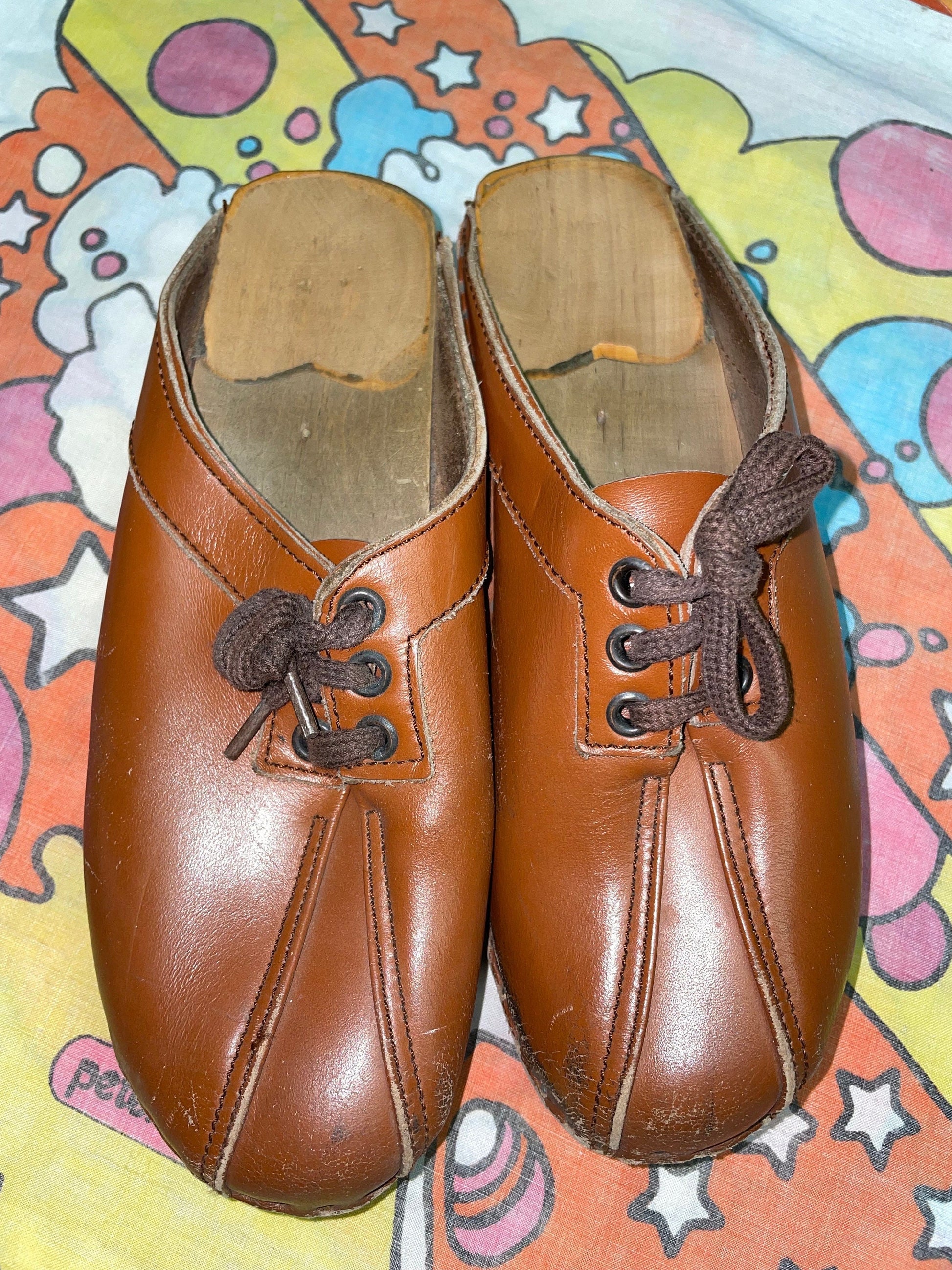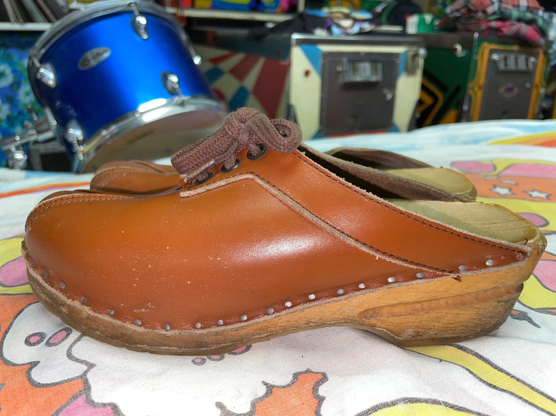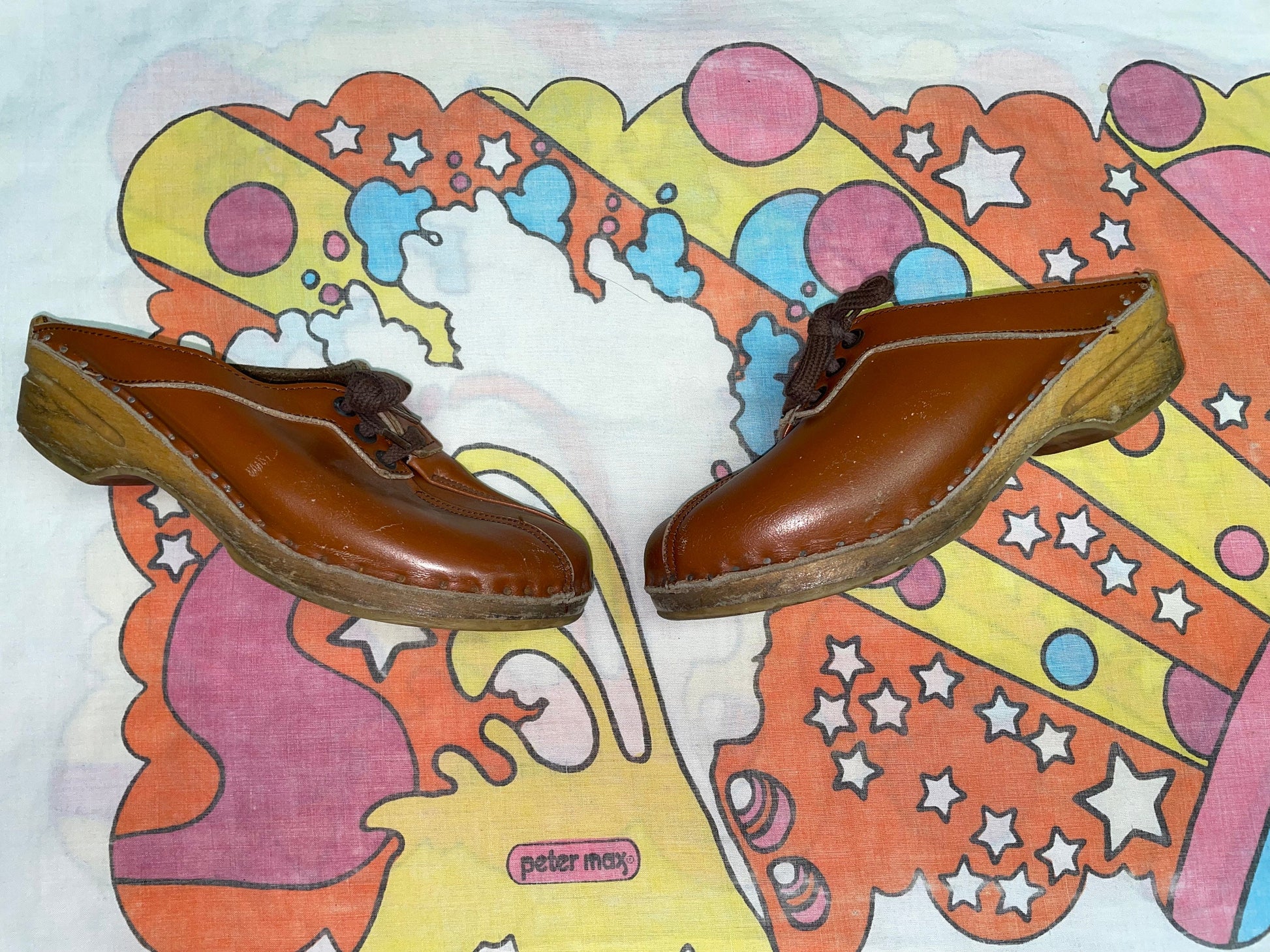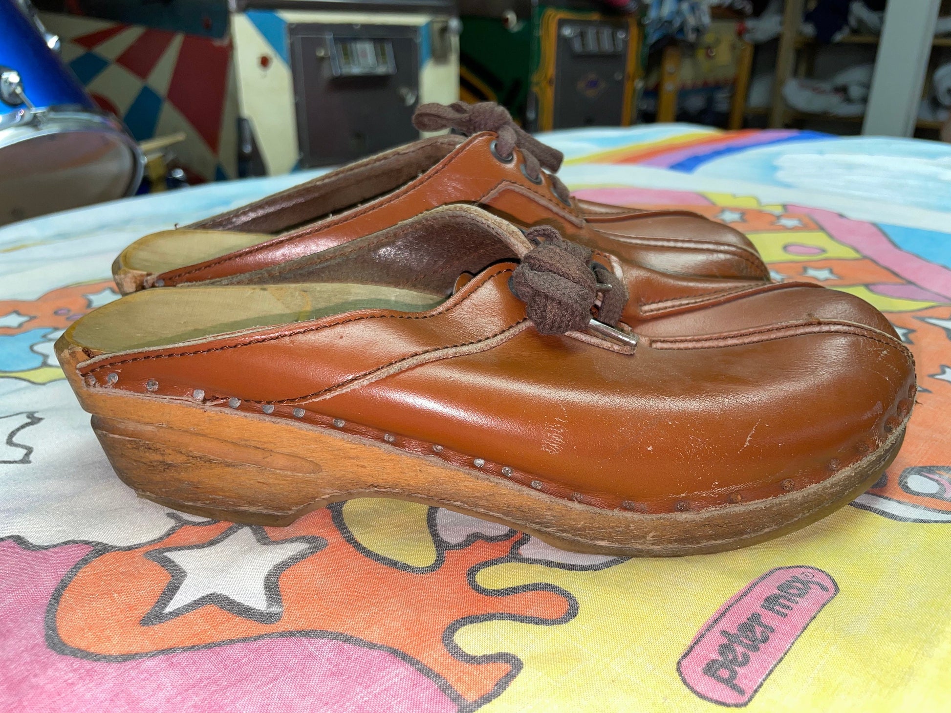 vtg 70s BROWN WOODEN CLOGS // vintage basad toffeln swedish hippie boho chic wooden leather wedges heidi retro autimn fashion womens 7 usa