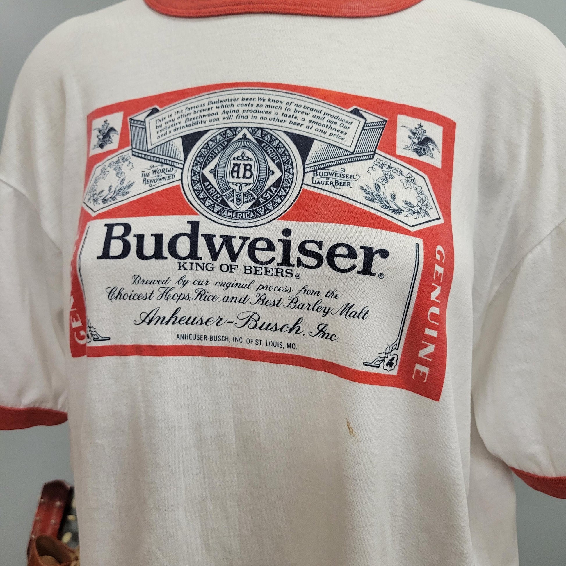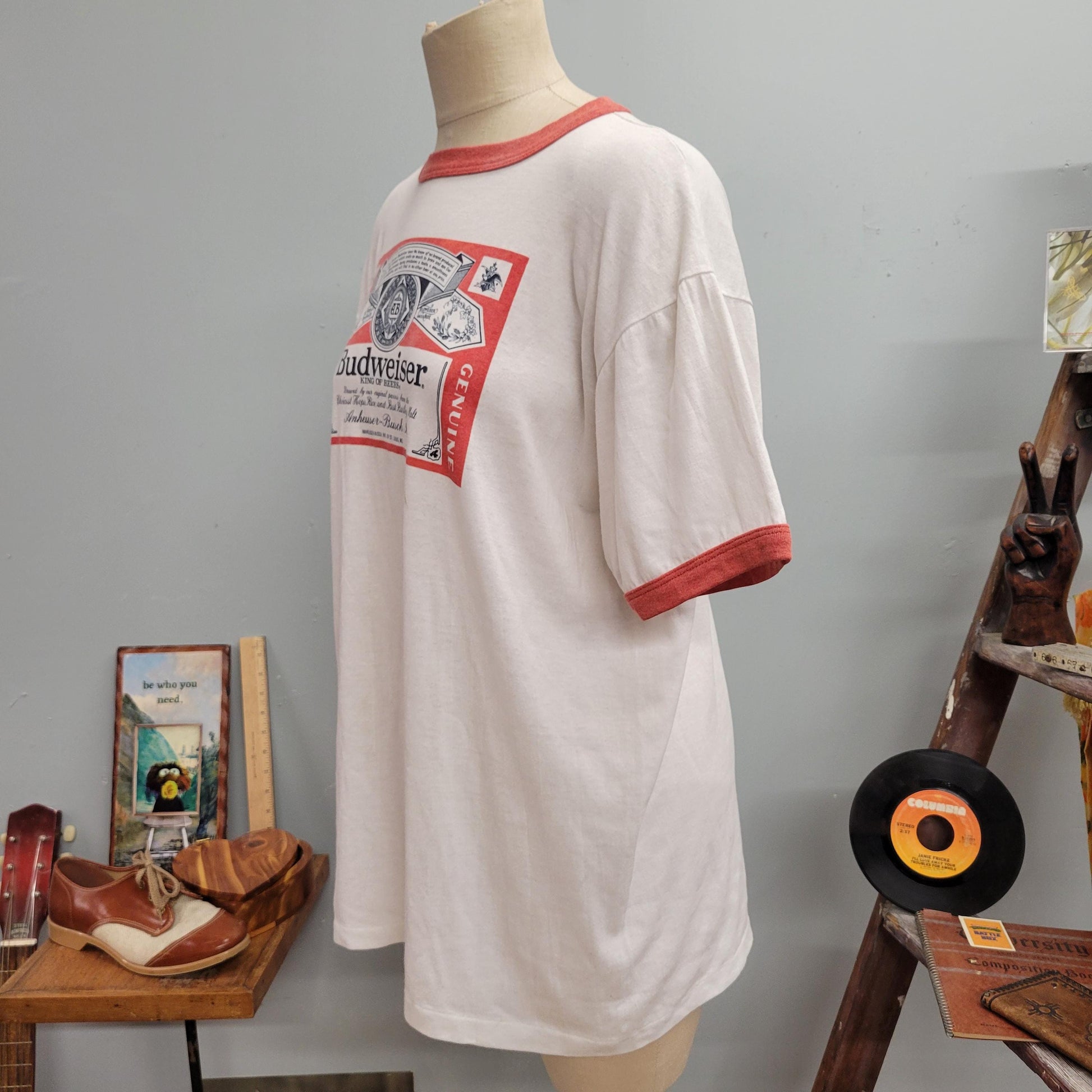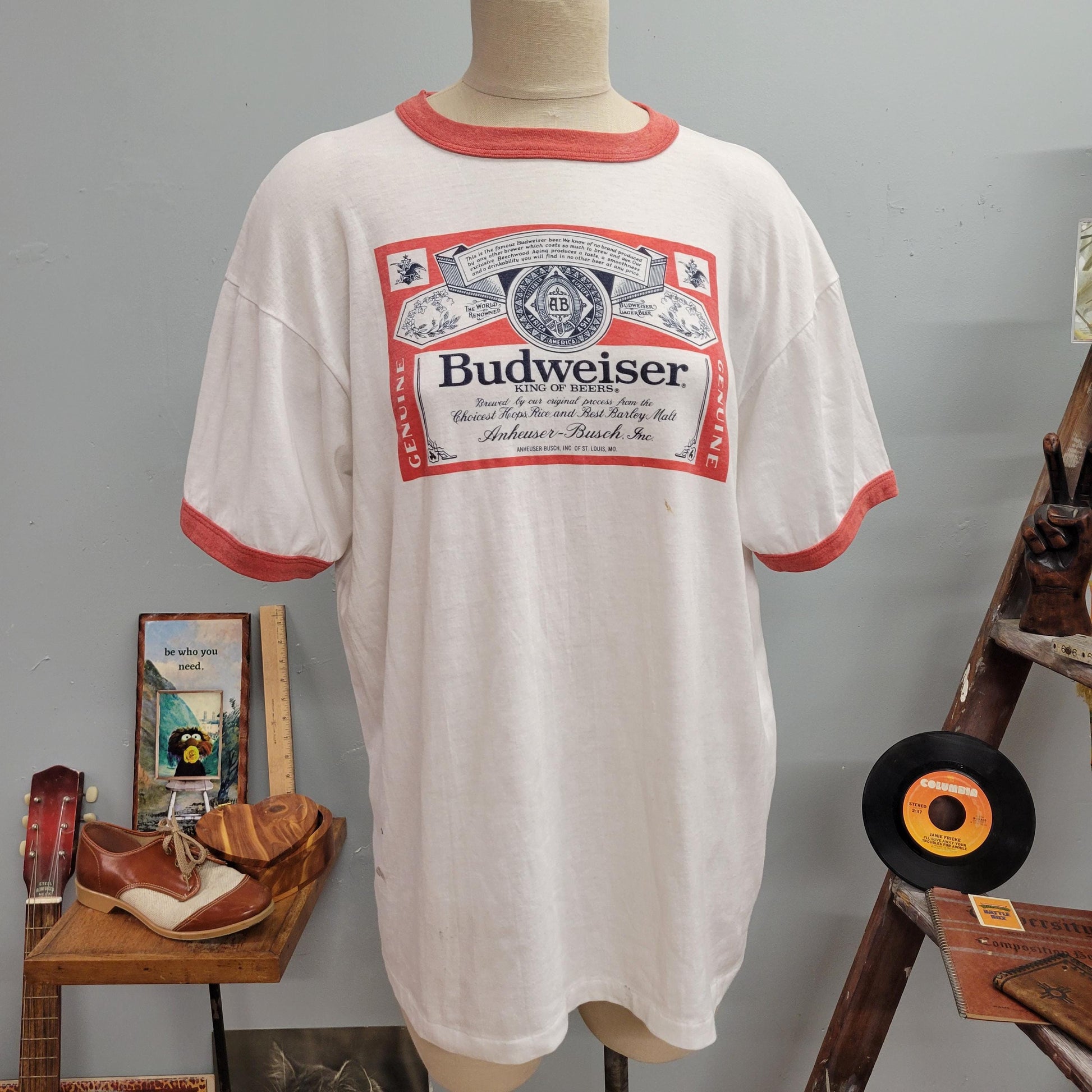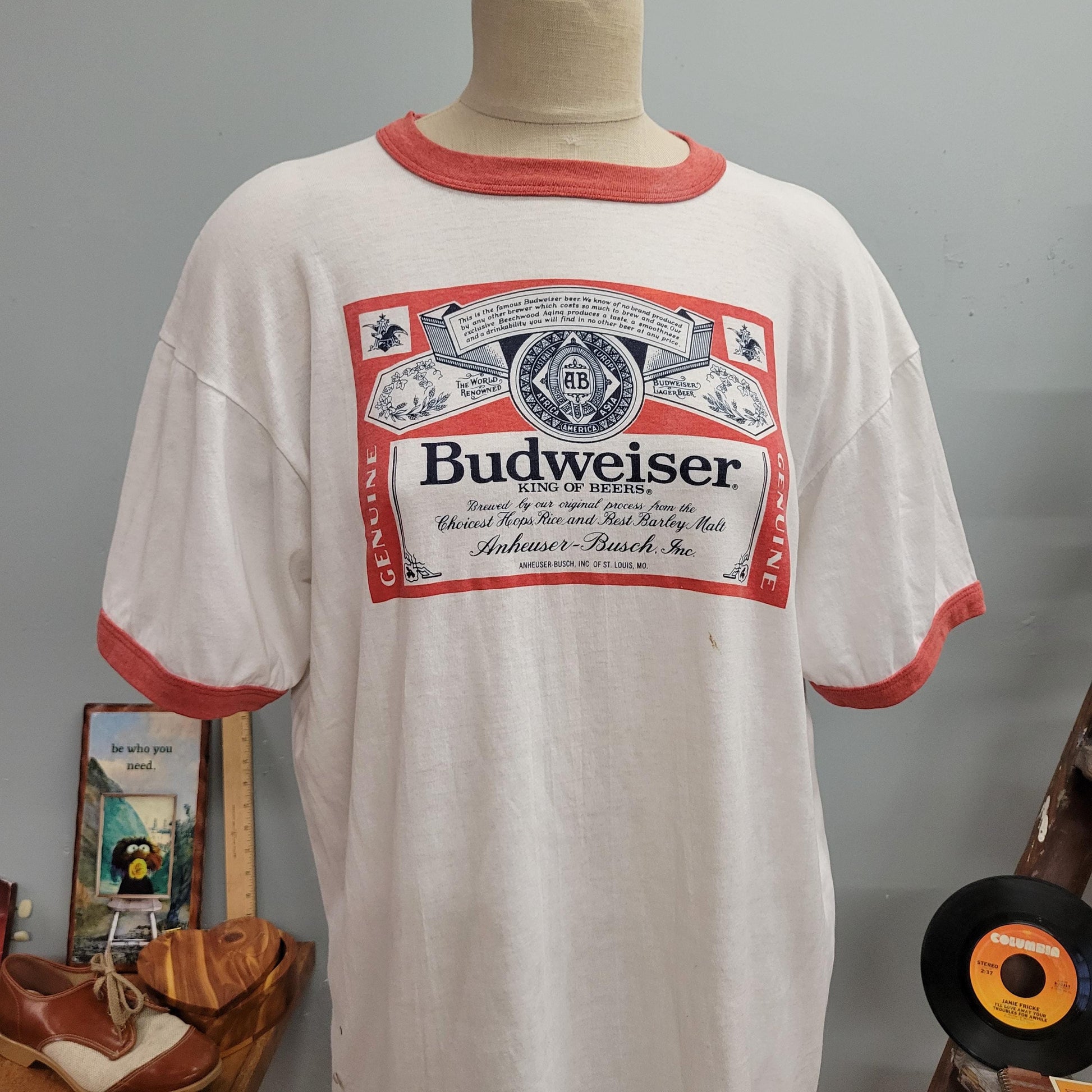 vtg 70s BUDWEISER RINGER TSHIRT // vintage xl paper thin oversized king of beers faded soft single stitch bartender beer lover retro graphic
