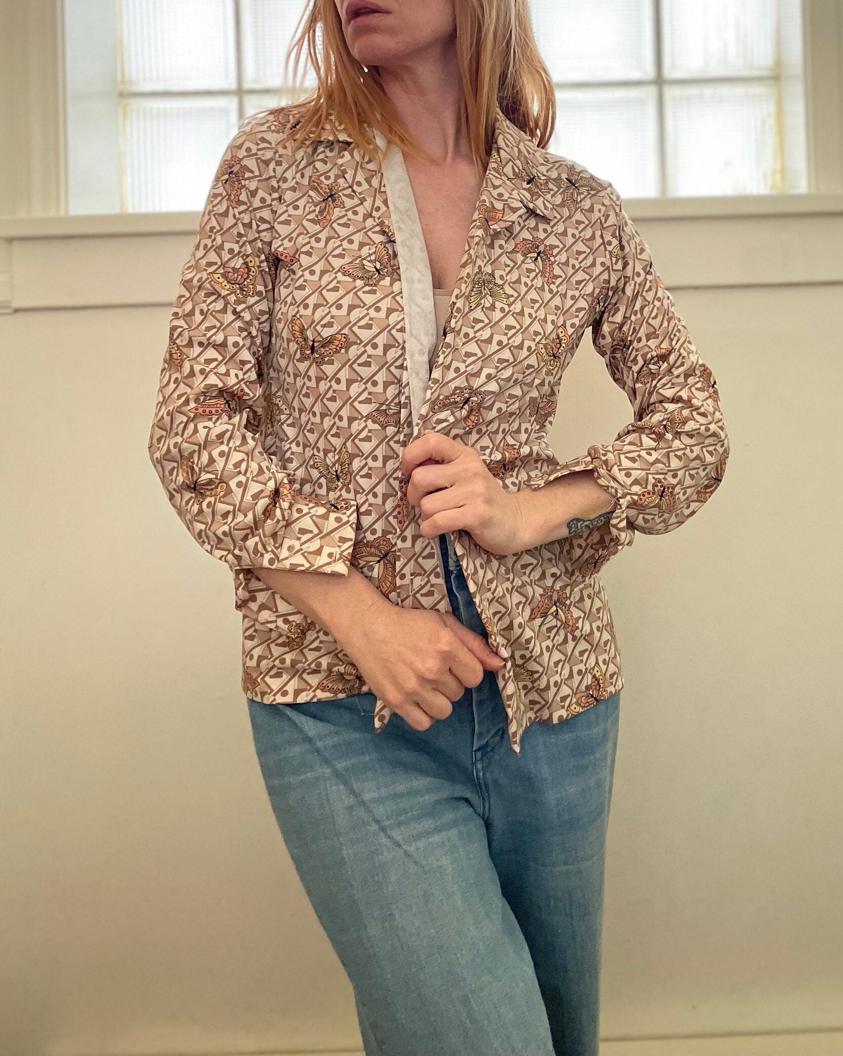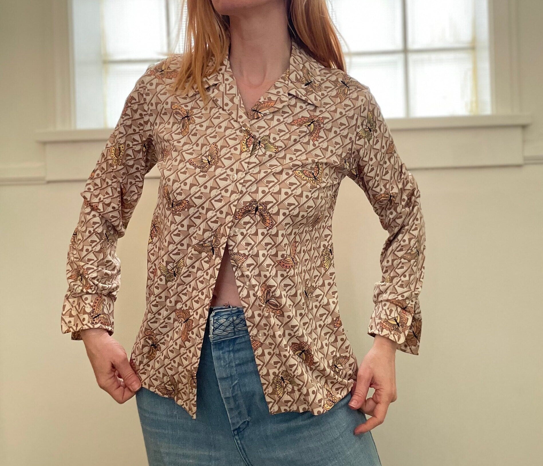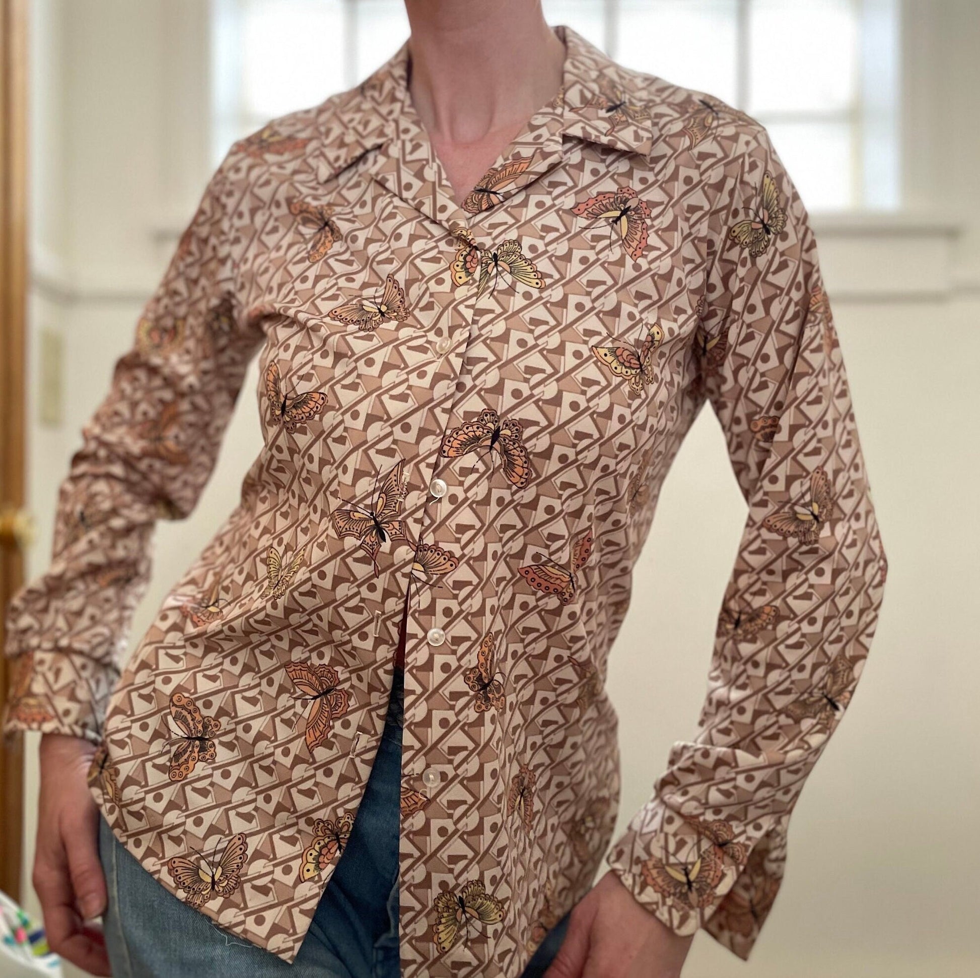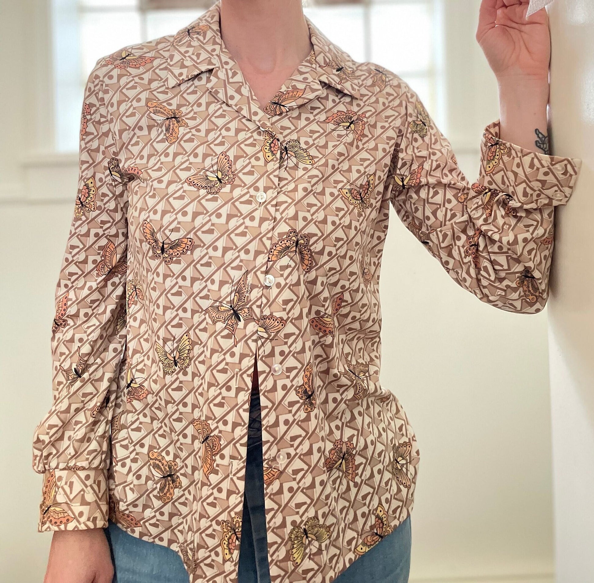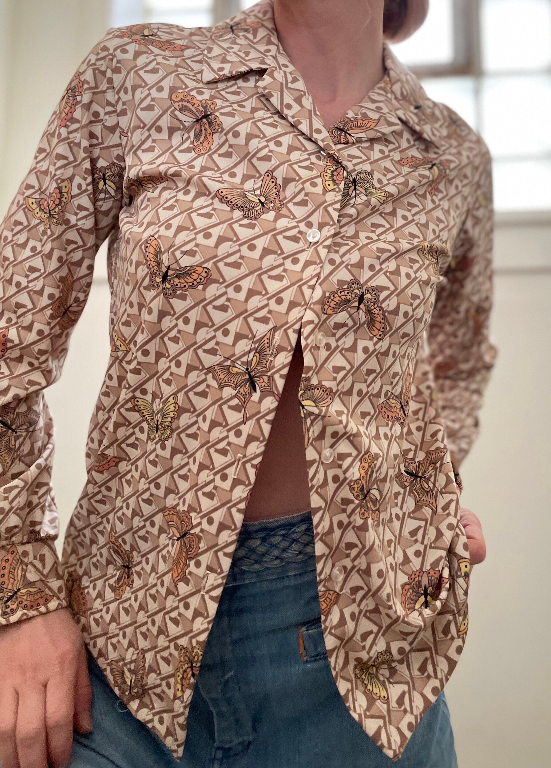 vtg 70s BUTTERFLY PATTERN TOP // retro all over print button up polyester abstract print blouse pointy collar mod hippie flowy psychedelic