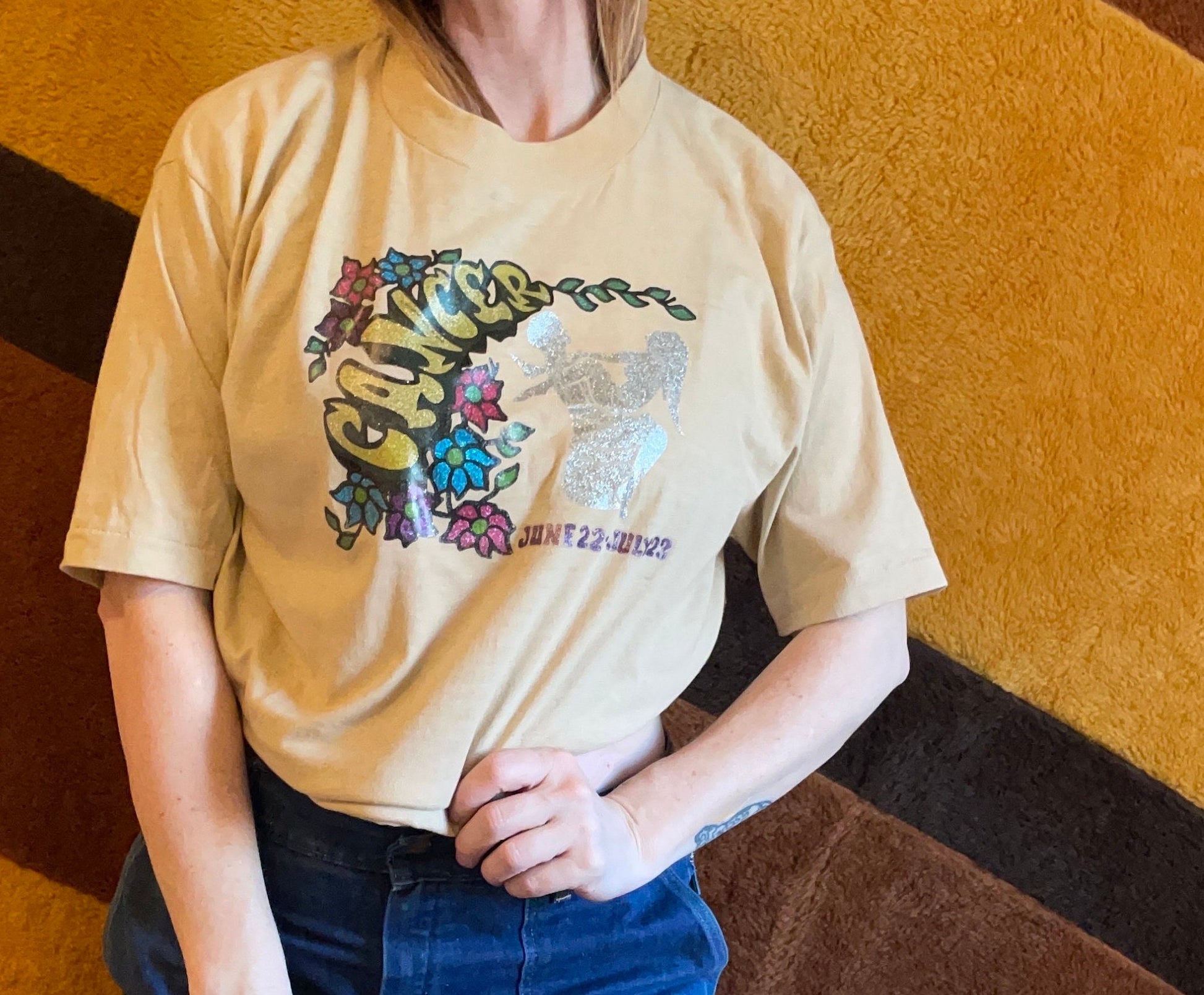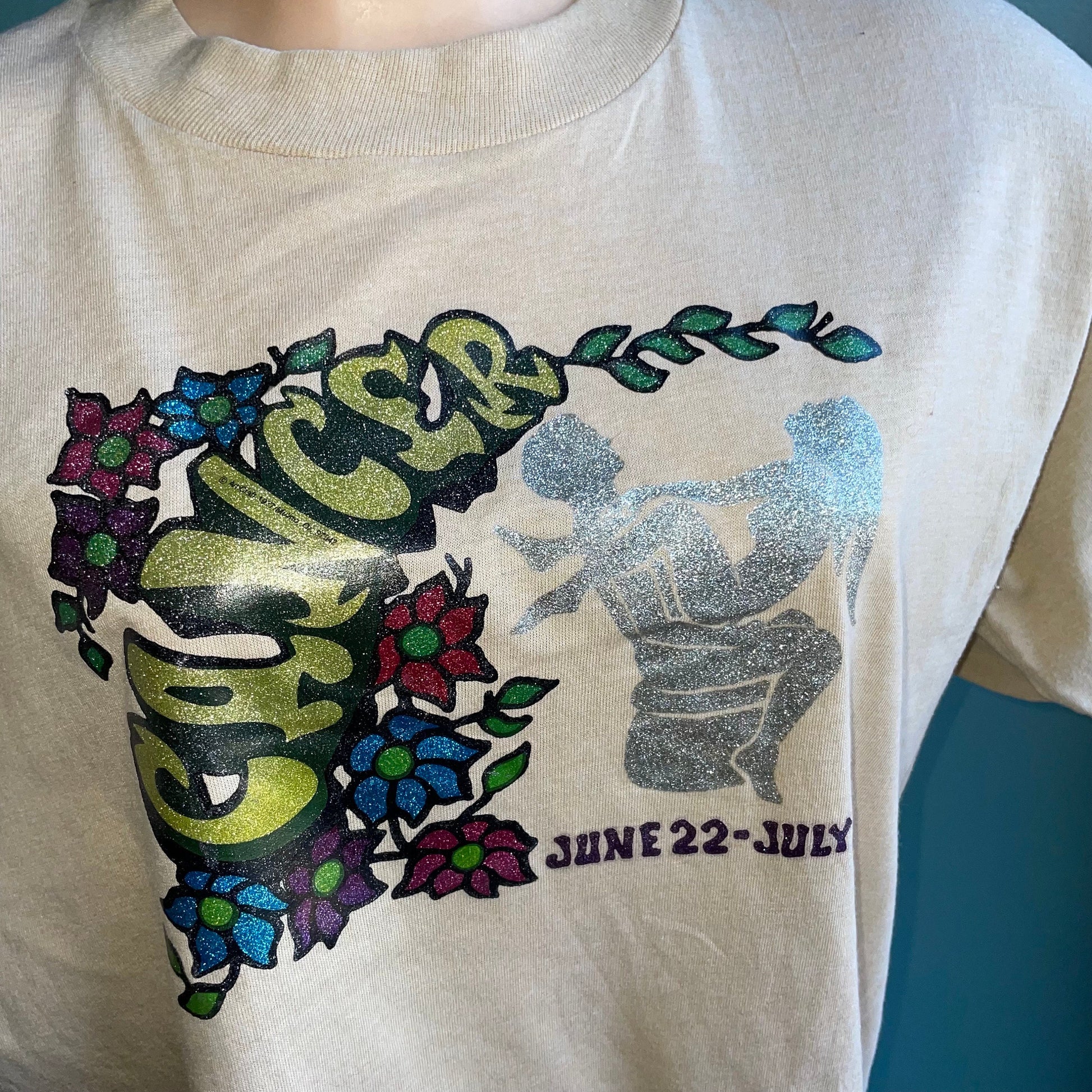 vtg 70s Zodiac Cancer HOROSCOPE iron on sparkly shirt retro crab sexual position chart graphic tee