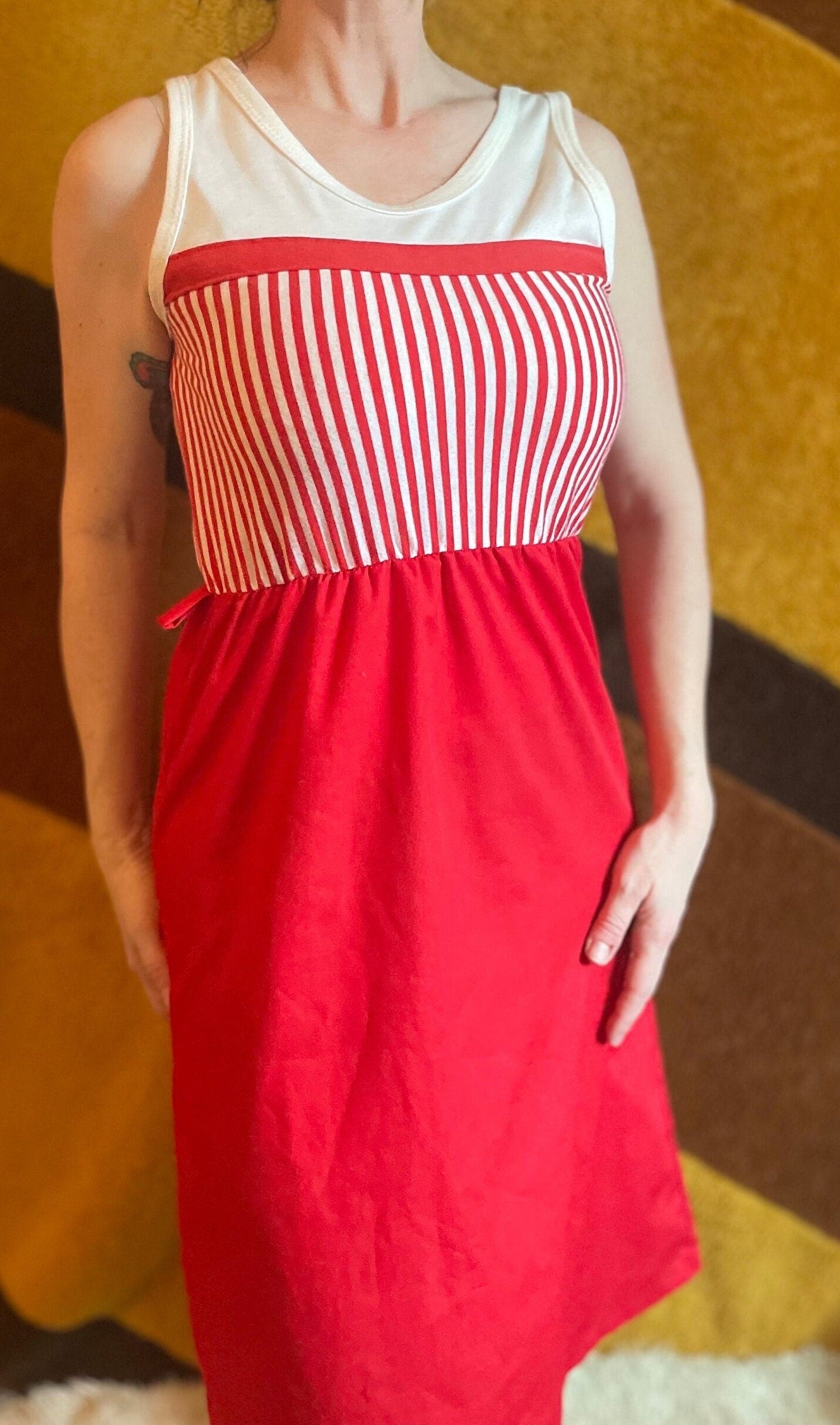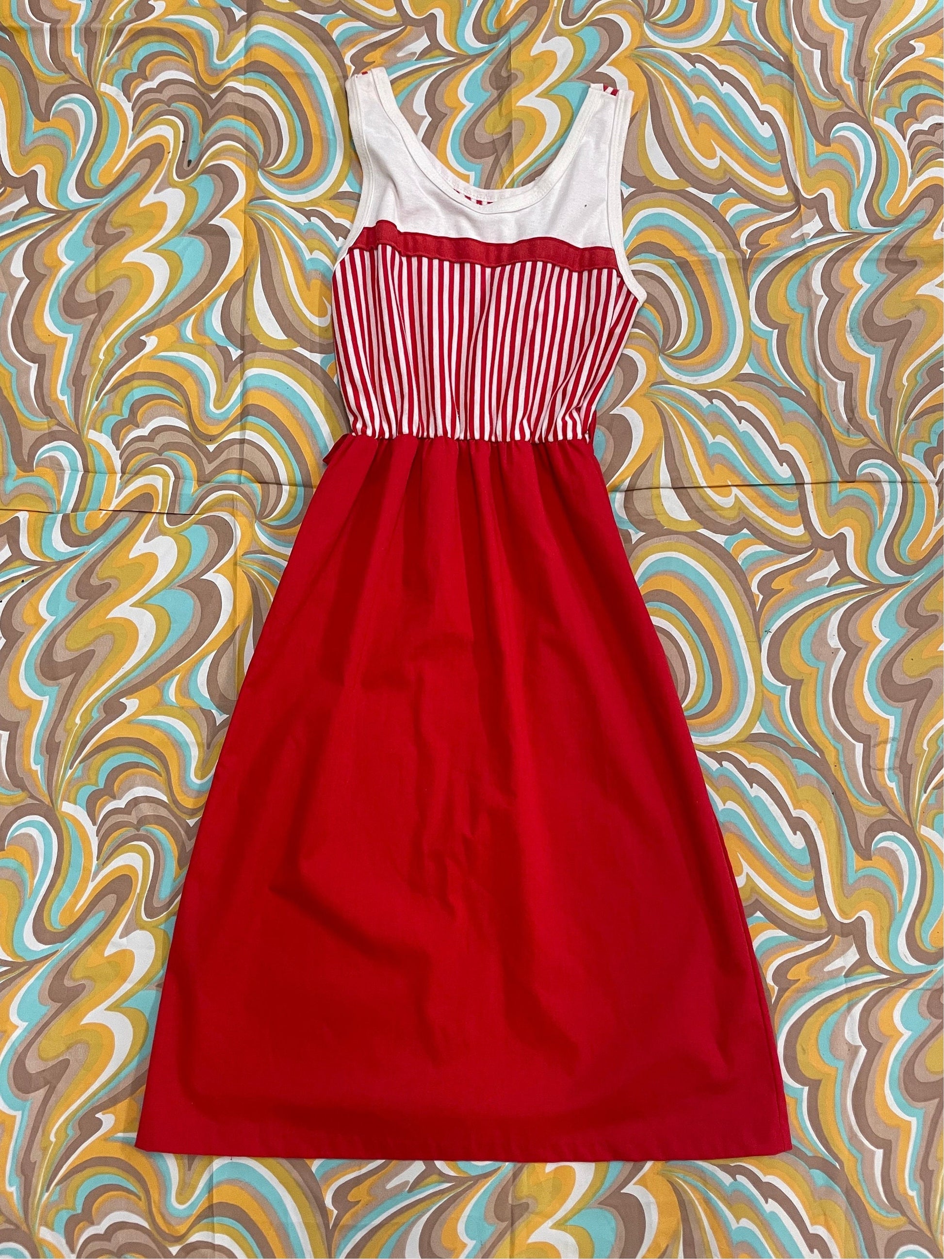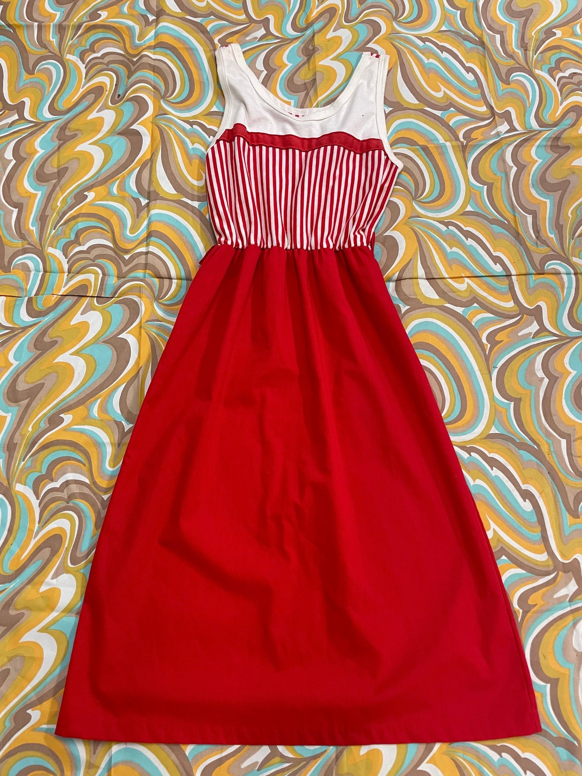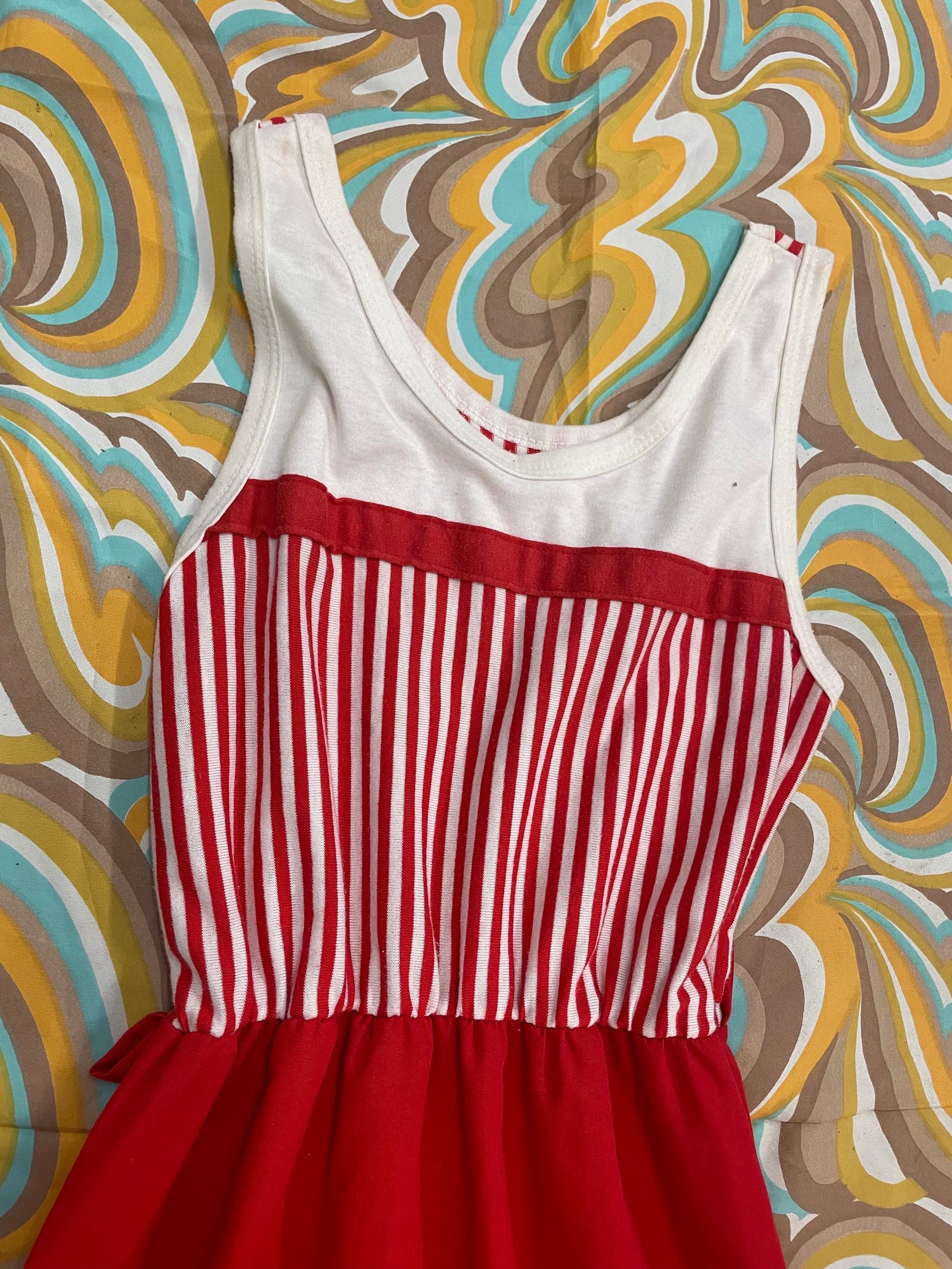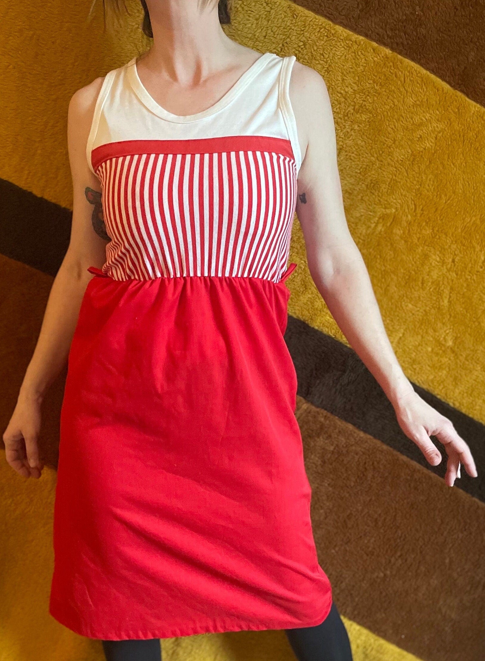 vtg 70s CANDY STRIPER DRESS // summer tank dress casual red white striped cute kitschy retro fit n flare with belt loops casual secretary