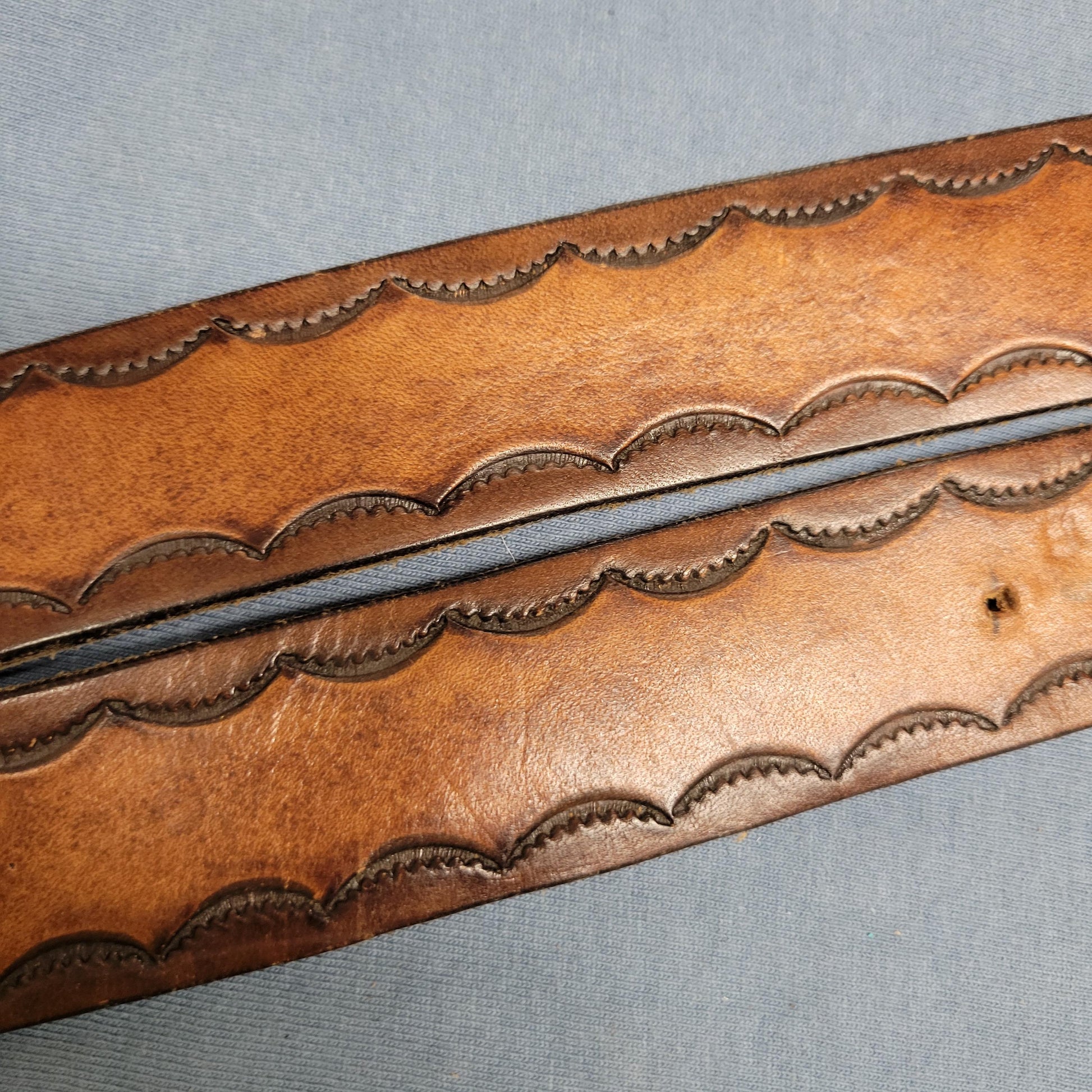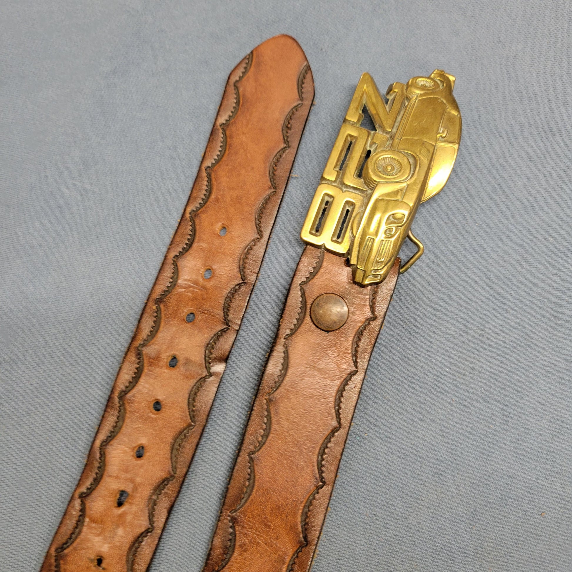 vtg 70s CAR BUCKLE & BELT // vintage Z28 Chevy 1979 solid brass baron buckle muscle car hand tooled leather belt size 32 retro western hot