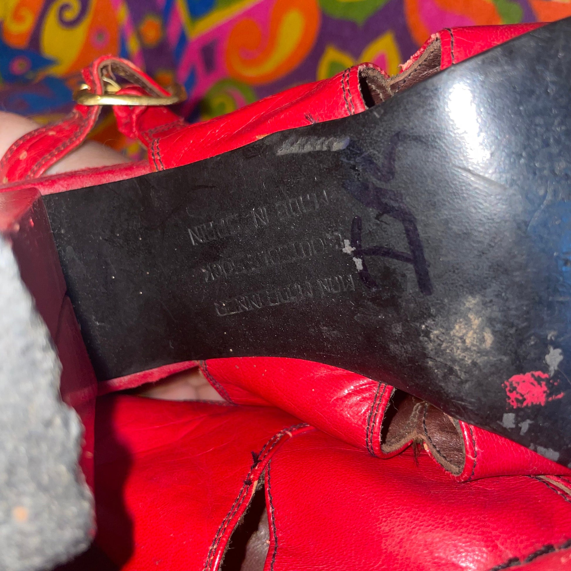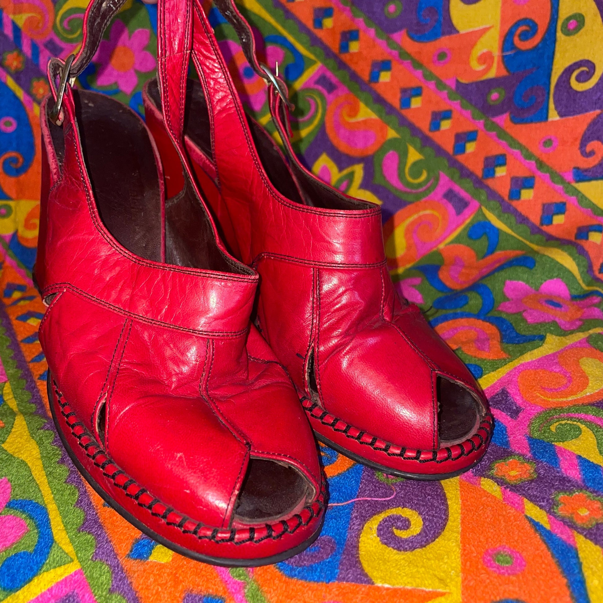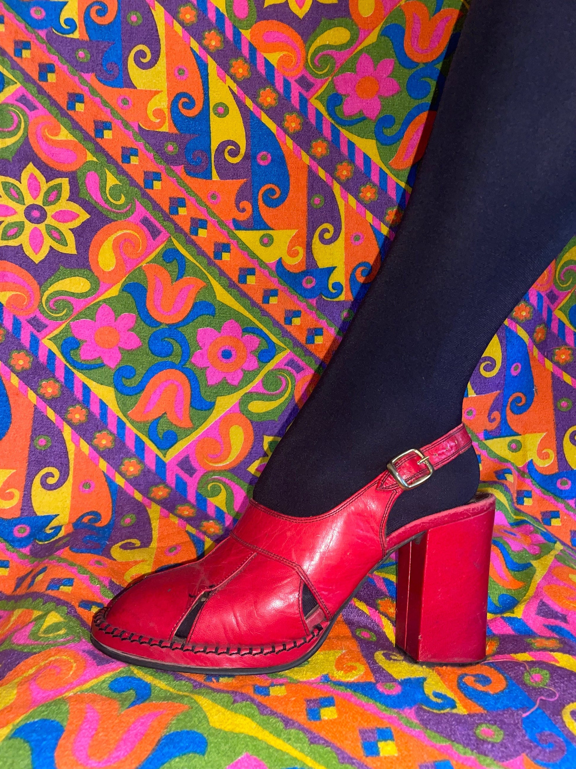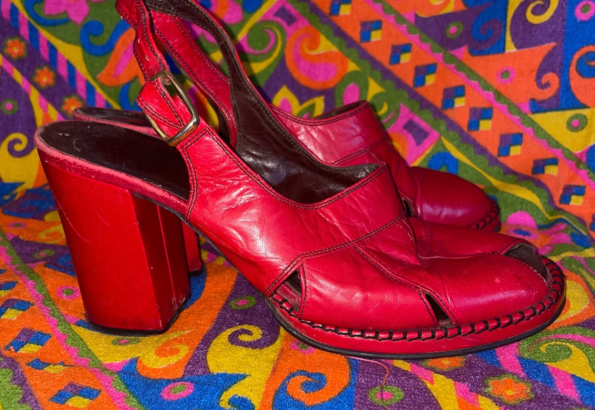 vtg 1970s cherry red leather platform pumps cut out peep toe sling back chunky heels disco sexy dancing retro 70s stacked strappy heels