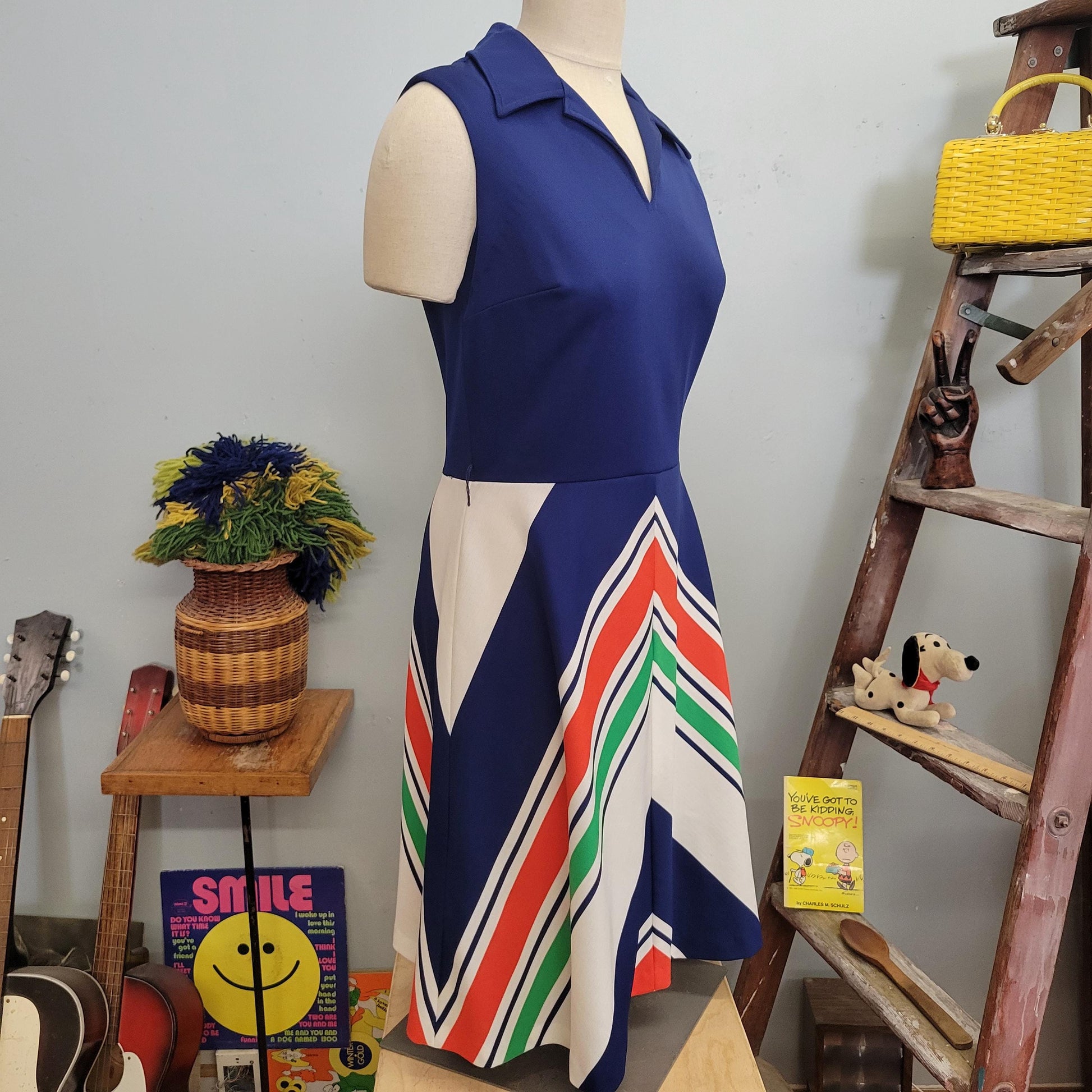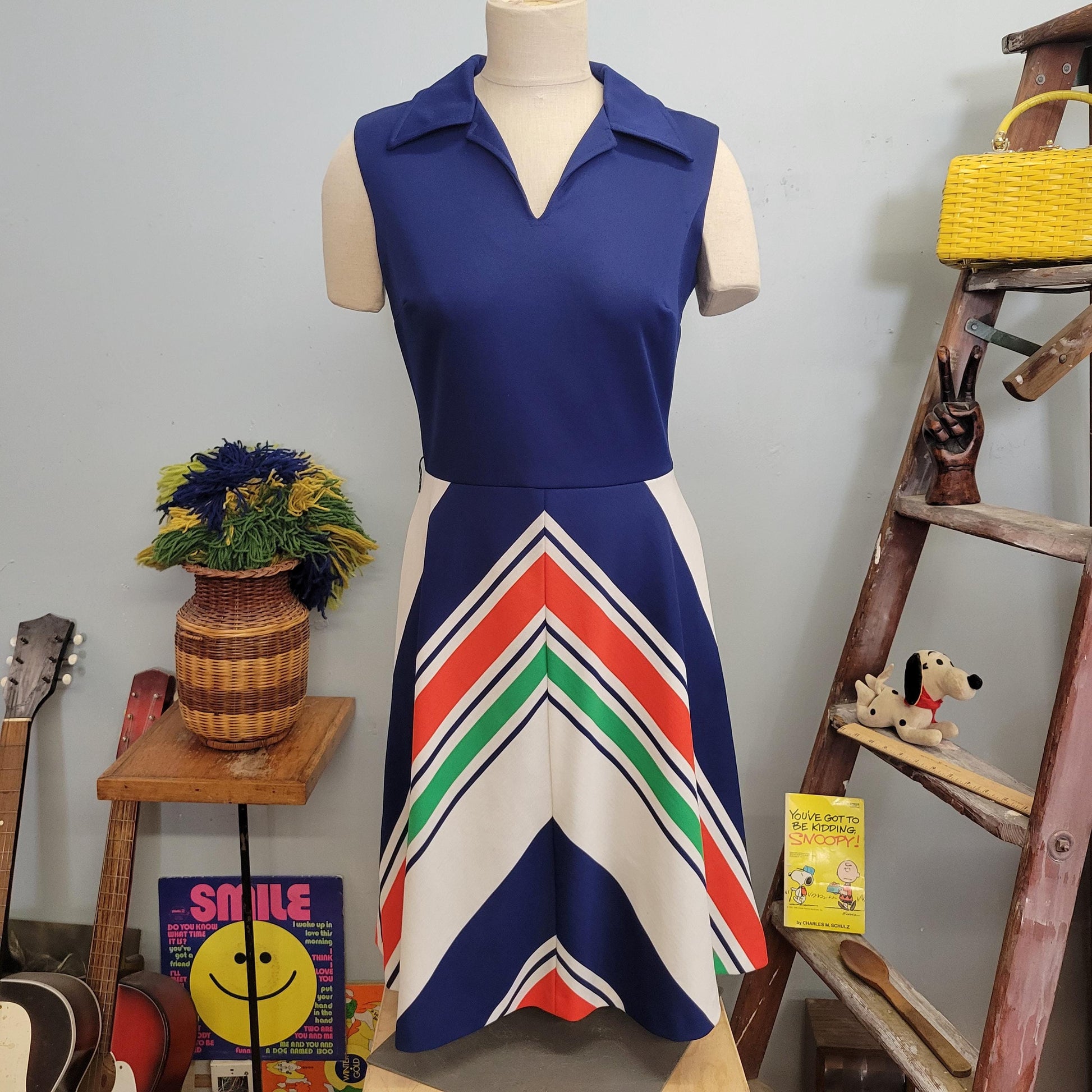 vtg 70s CHEVRON AUTUMN DRESS // vintage veron knit medium womens v neck collared mod striped midi retro fall layering geometric pattern wild
