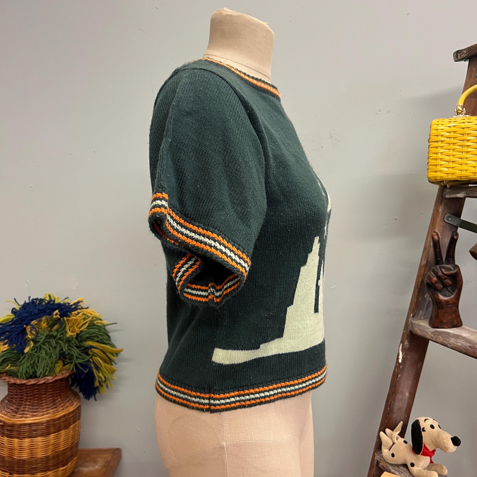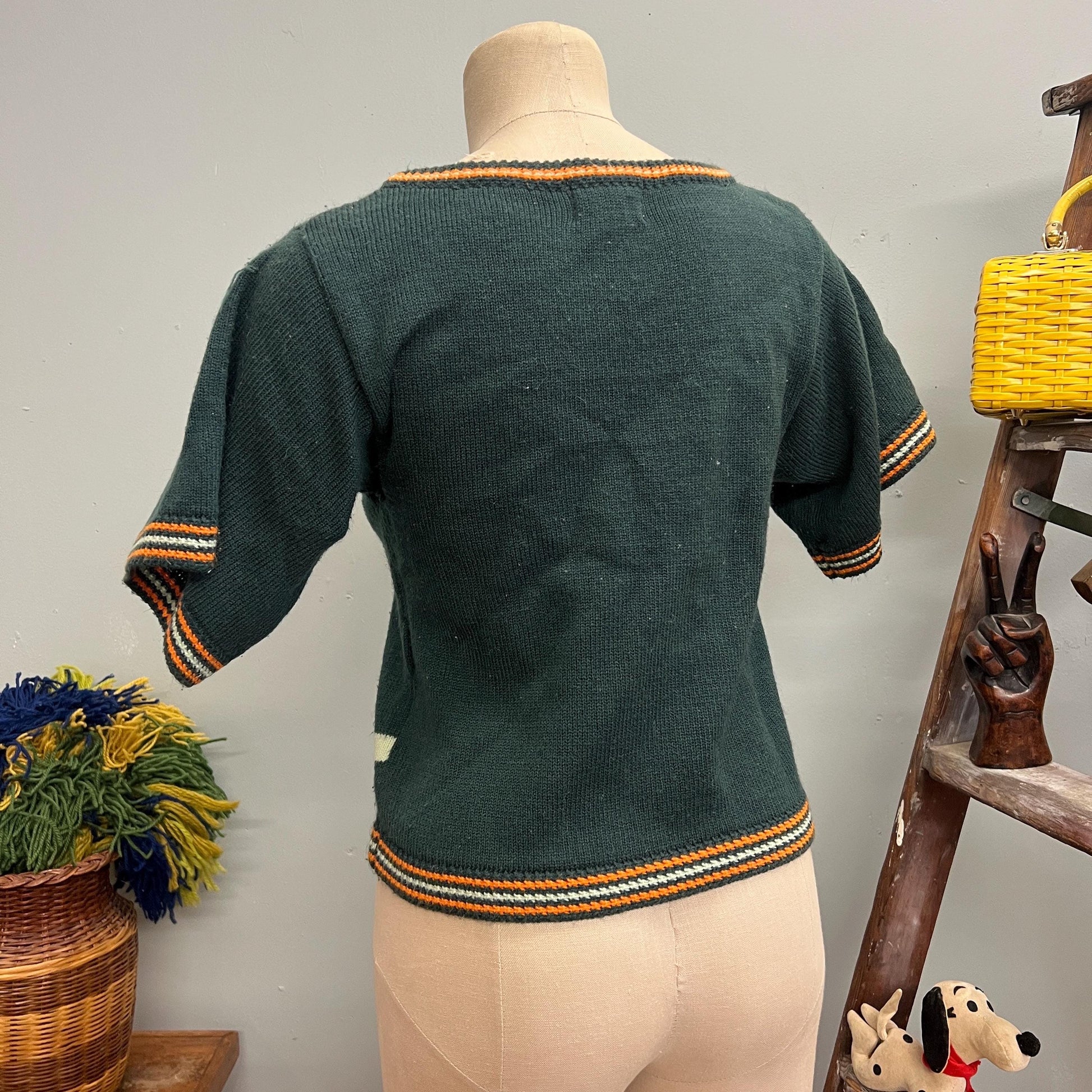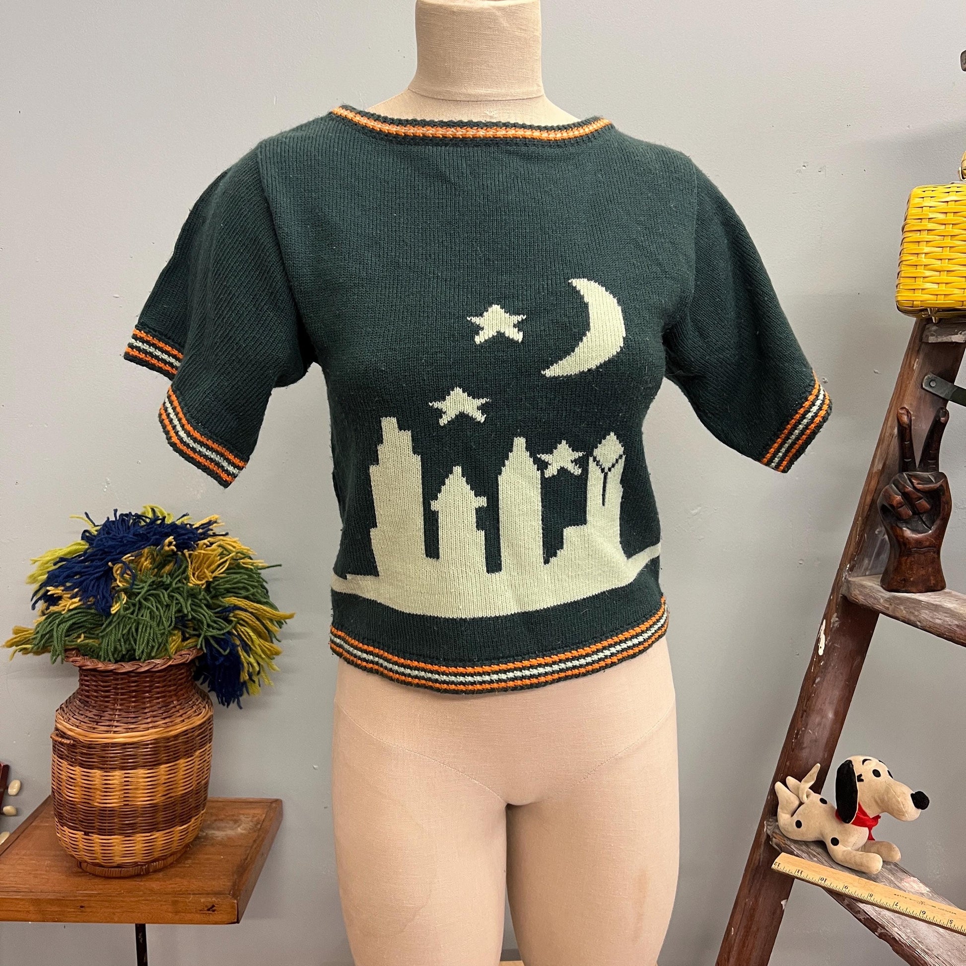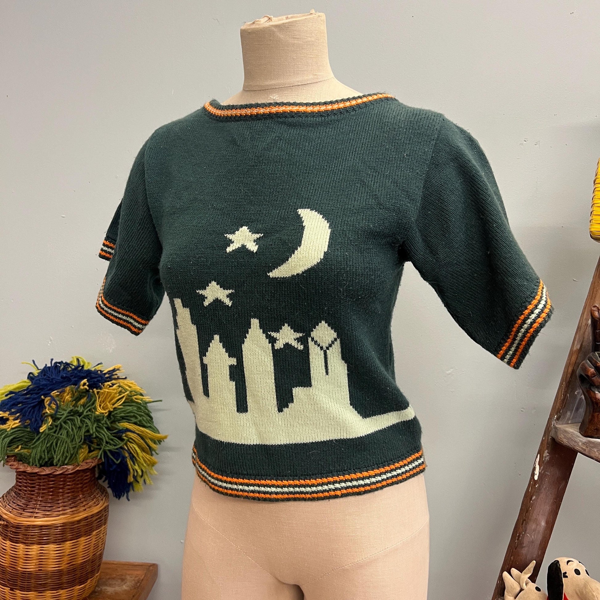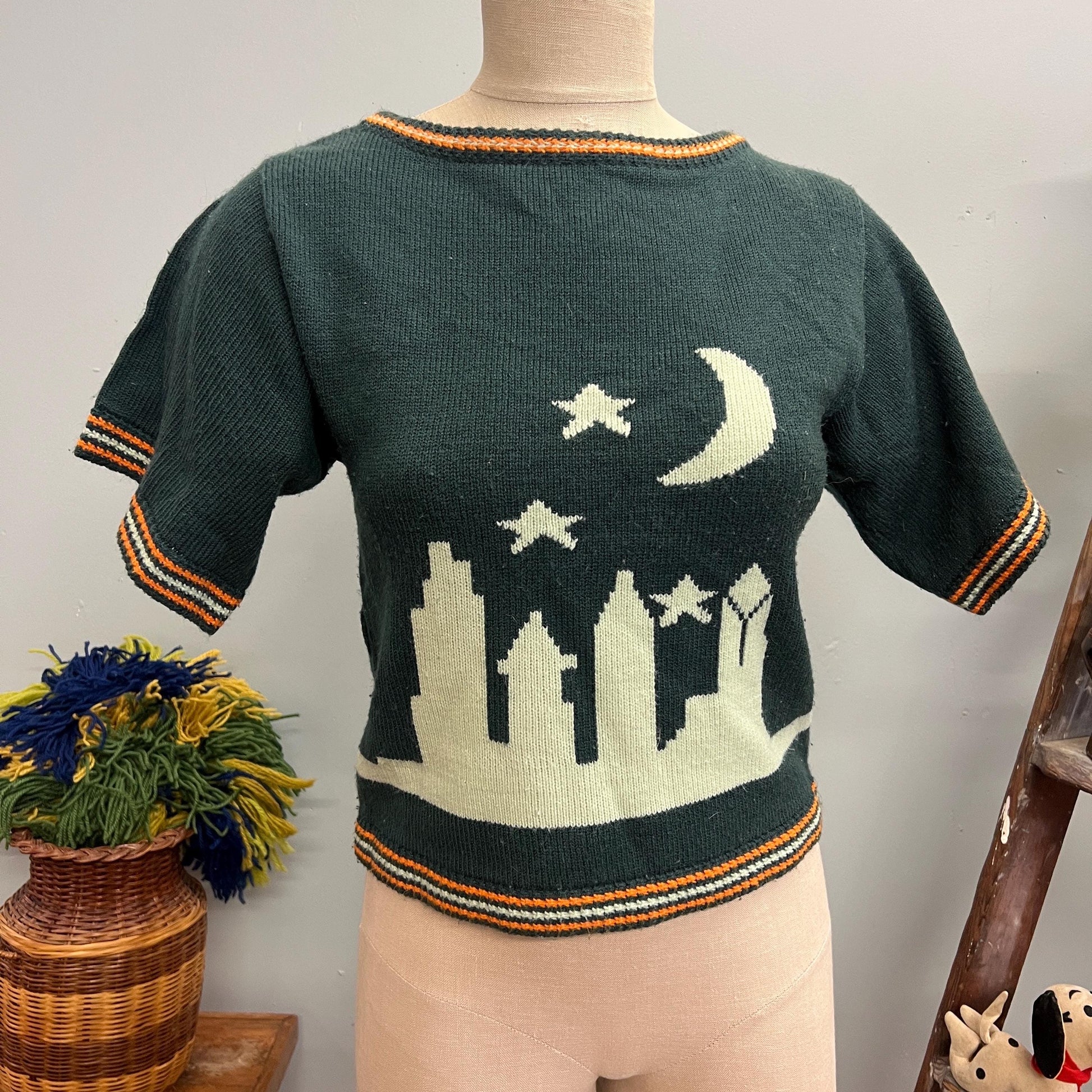 vtg 70s CITY CEMETERY TOP // vintage mister Noah large sweater vest graveyard striped cropped knit top retro celestial star pattern autumn