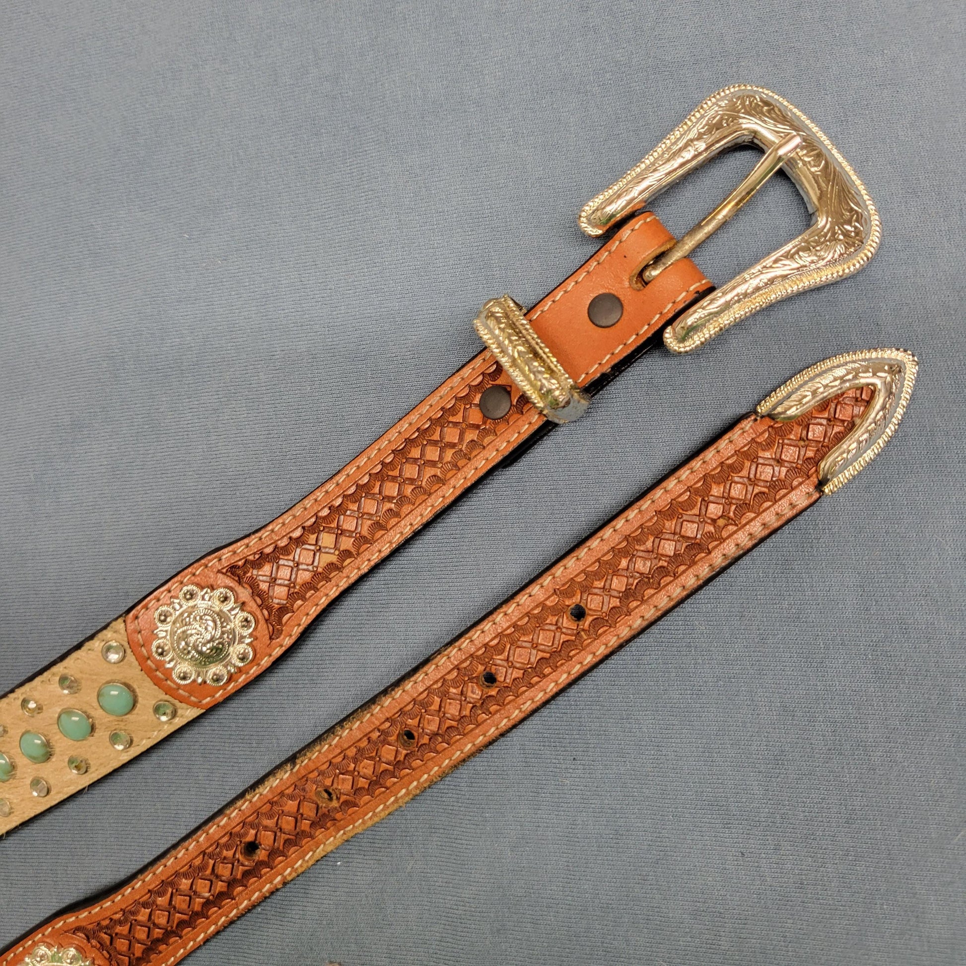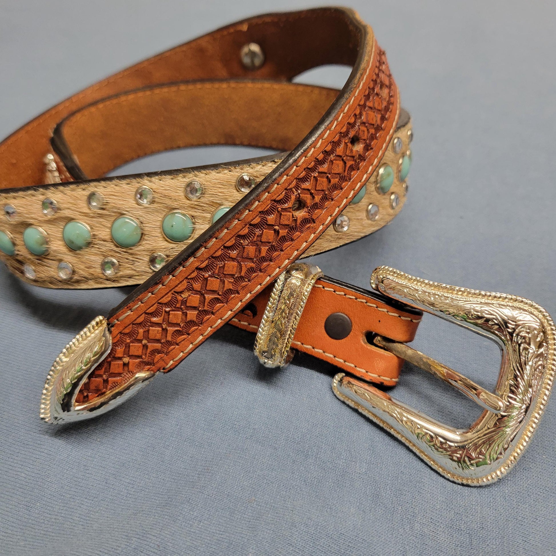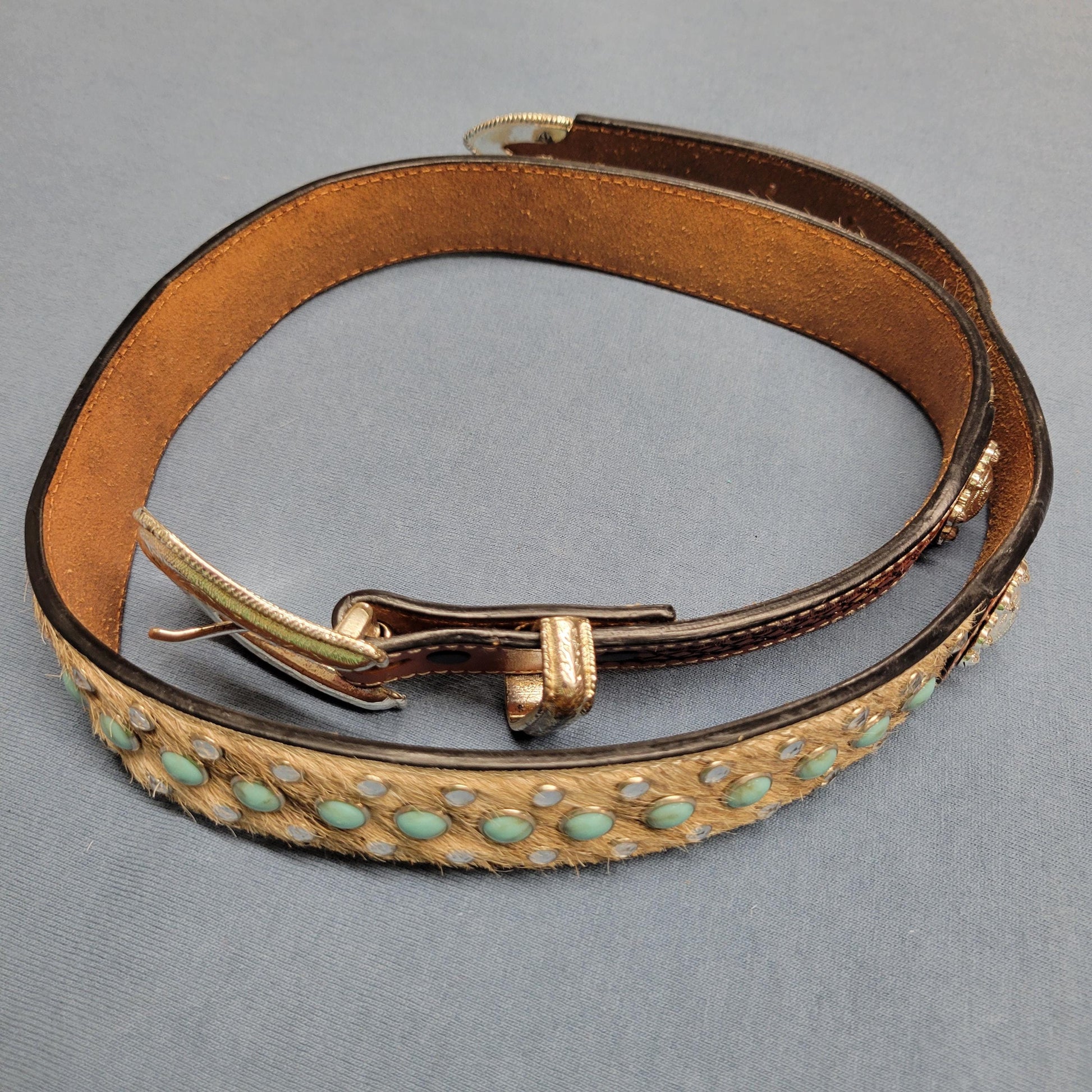 vtg 70s COW FUR BELT // vintage leather size 32 unisex bling leather belt turquoise bejeweled western rodeo conch cowgirl retro hippie biker