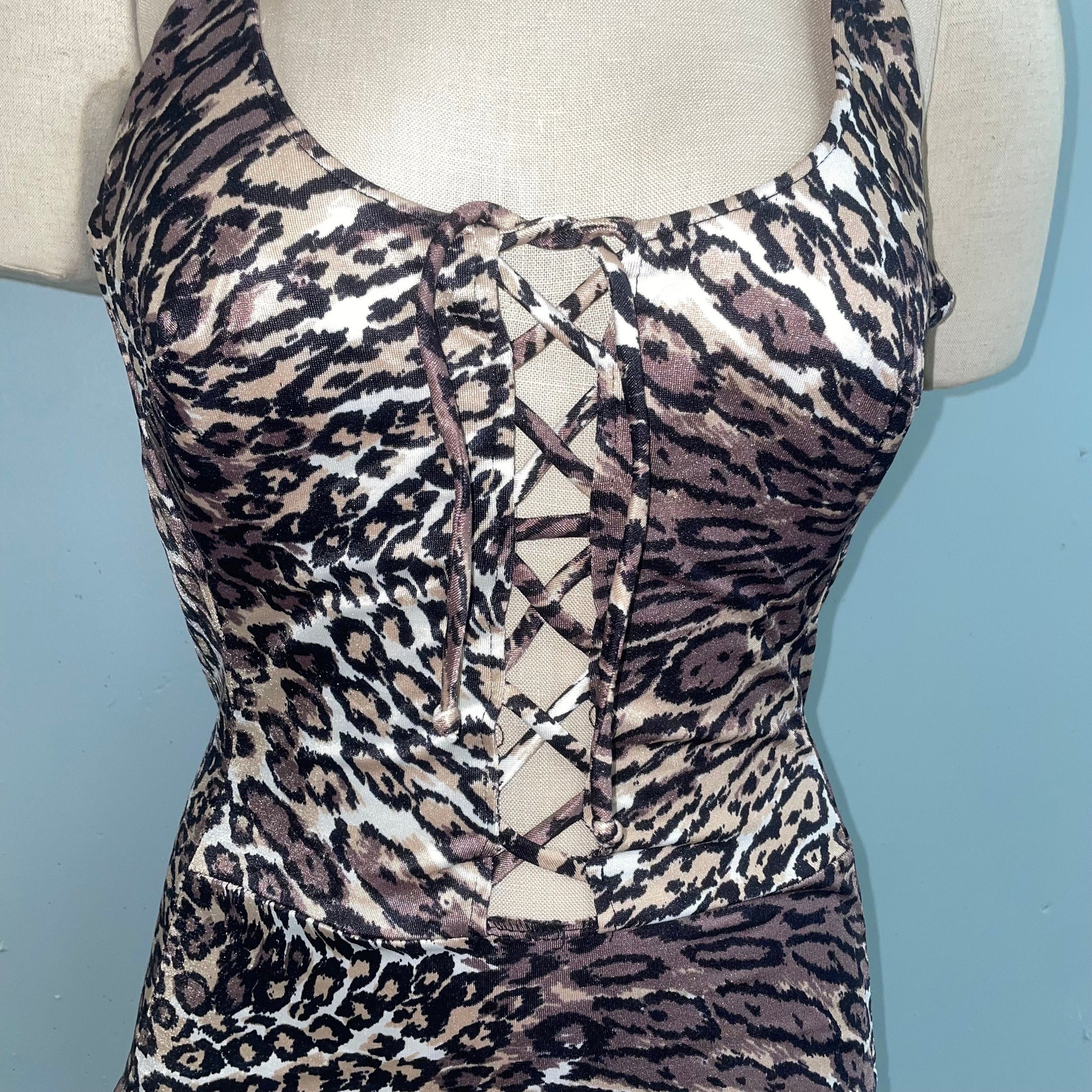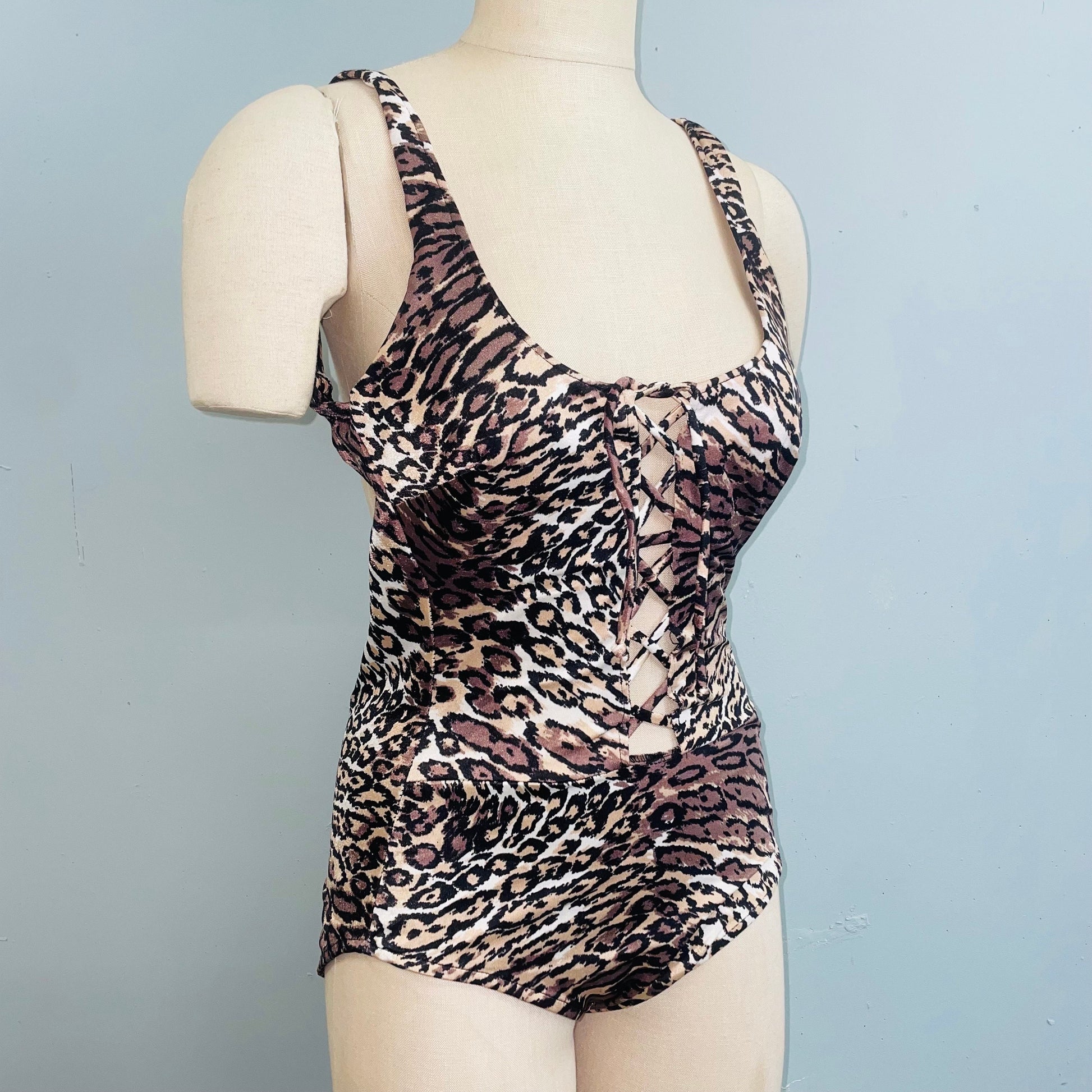 vtg 70s animal print cut out swimsuit lace up leopard print retro disco playsuit one piece bathing suit sexy criss cross low cut back short