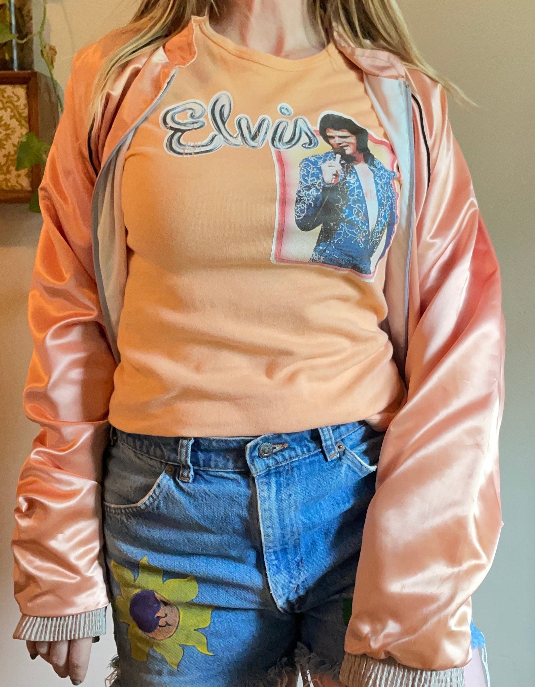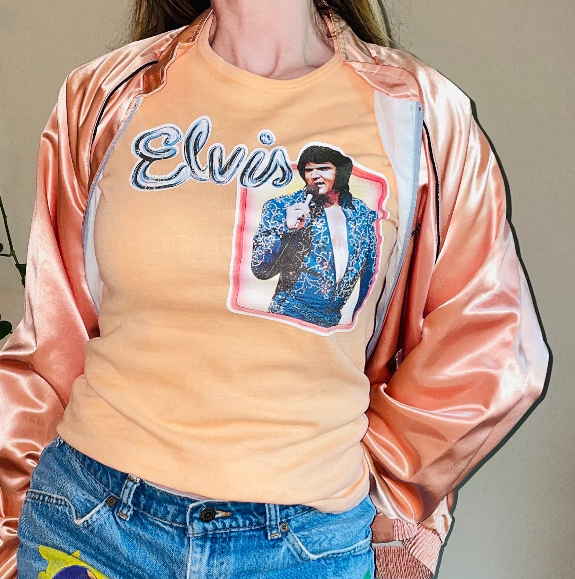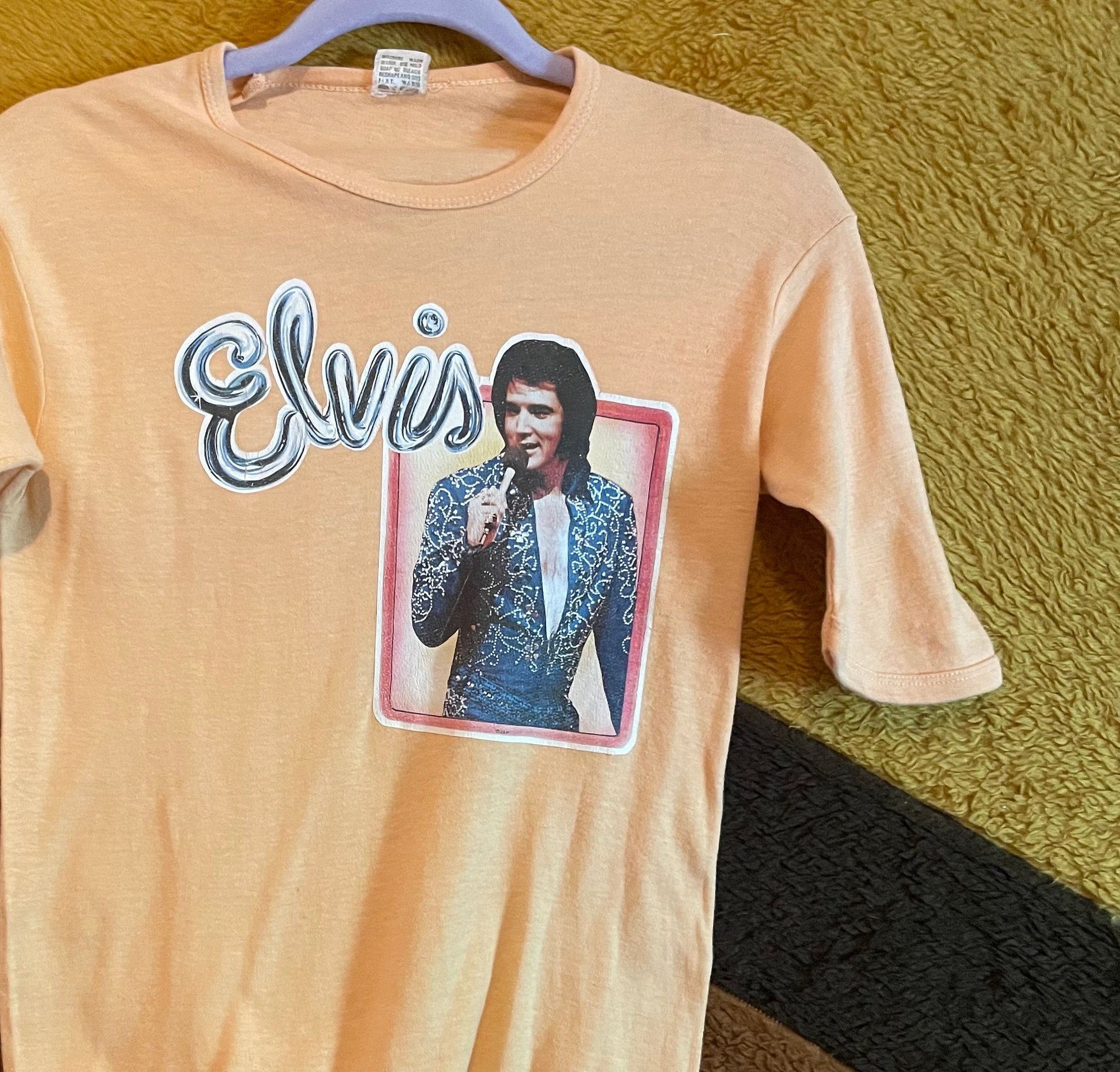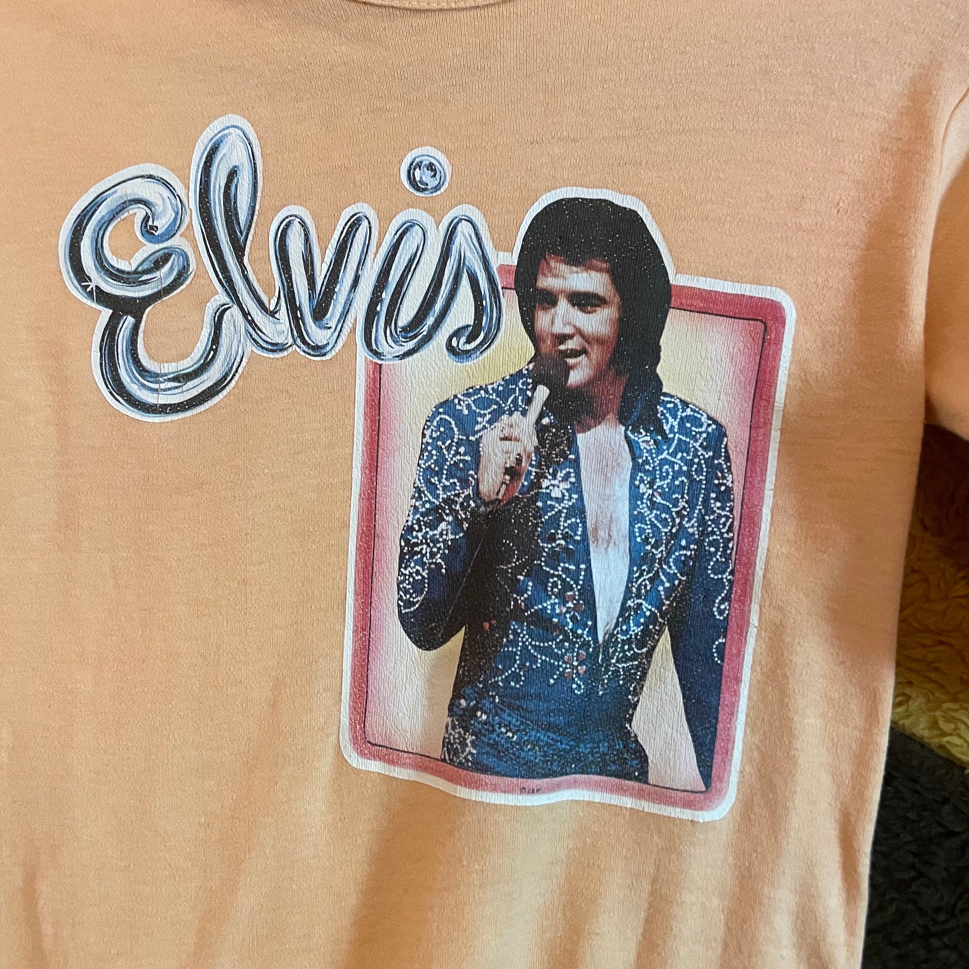 vtg 70s Elvis Presley the king shirt retro iron on lounge singer pop culture peachy pastel disco funky rocker memphis sun studio icon