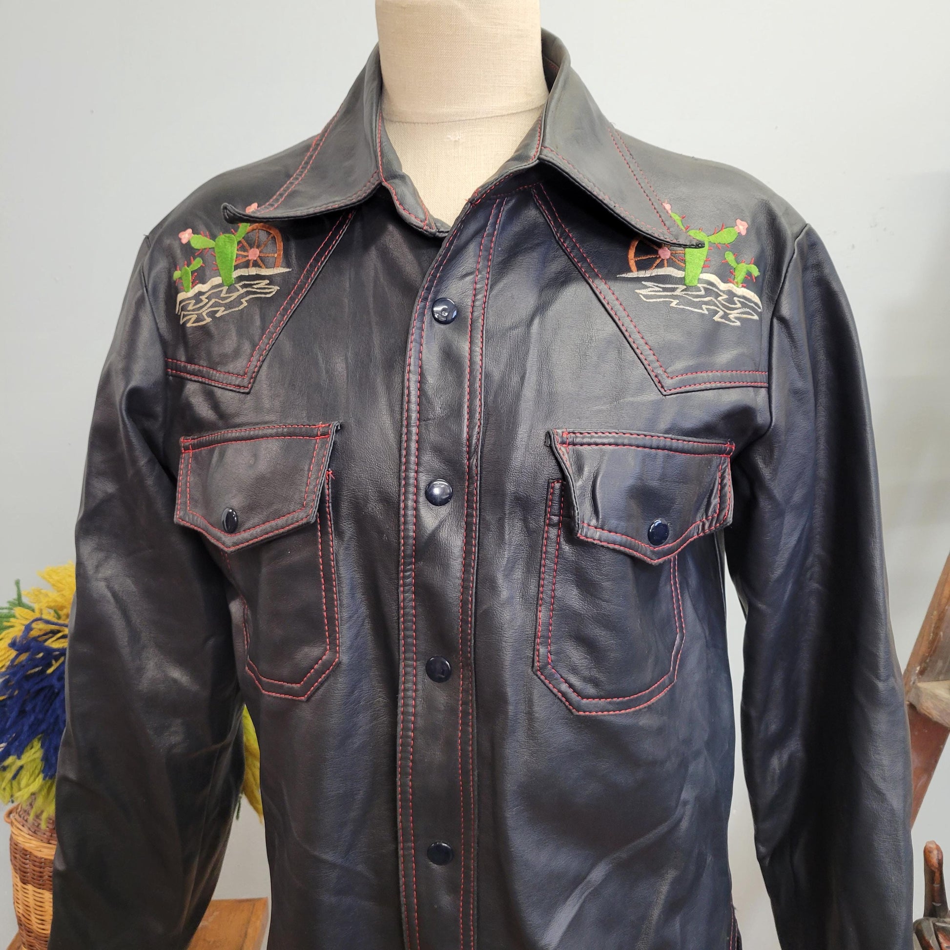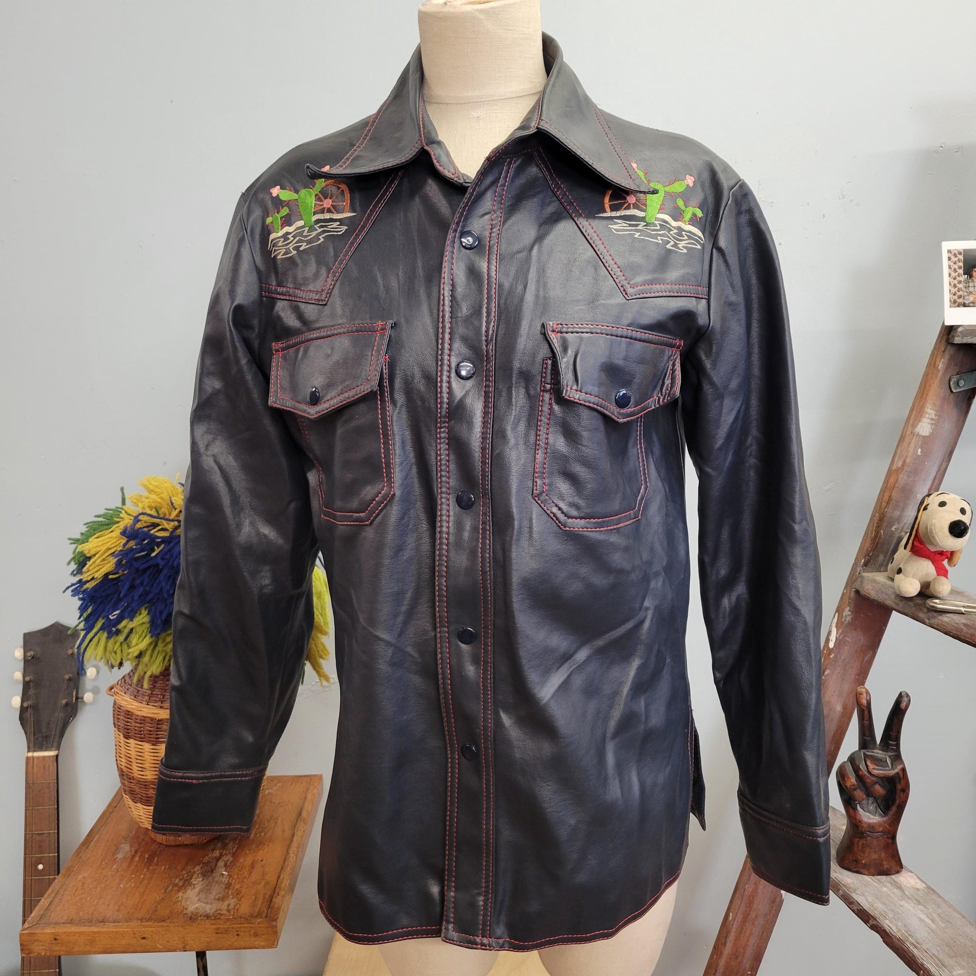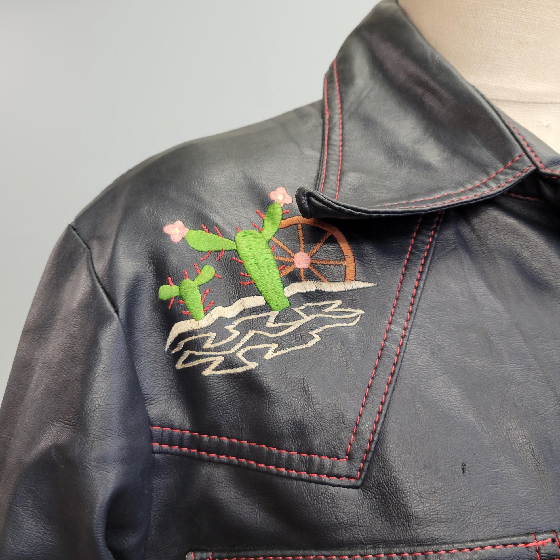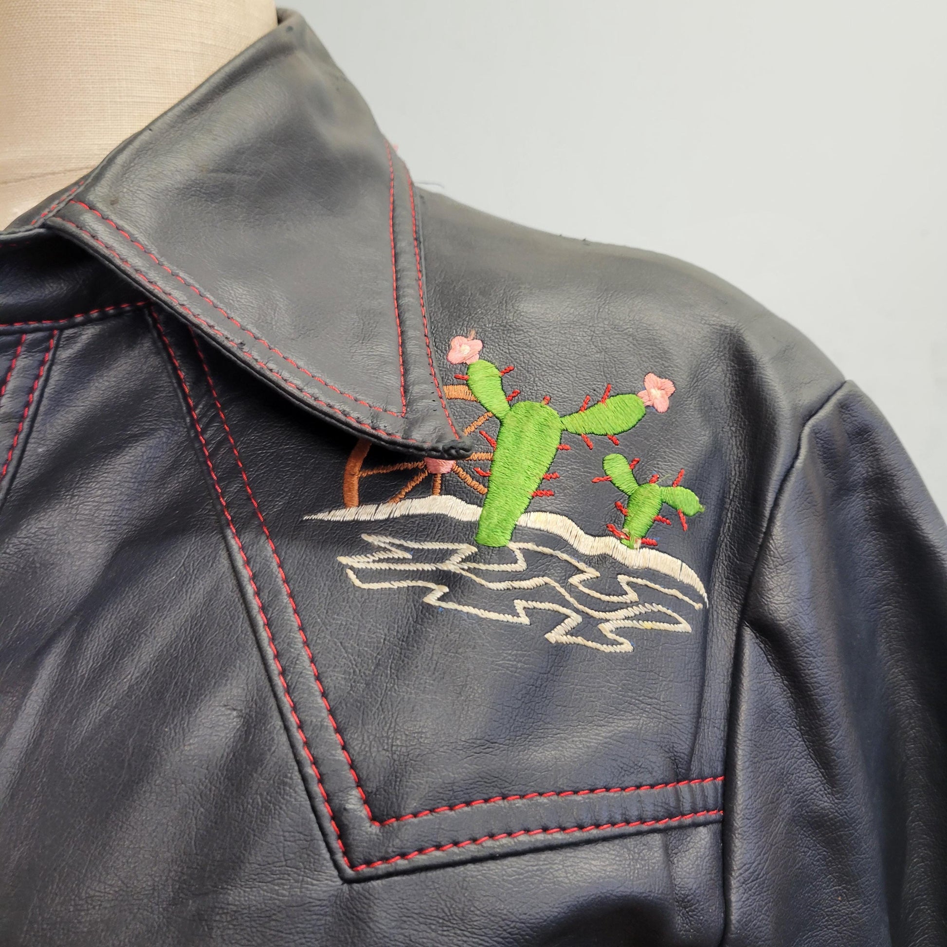 vtg 70s EMBROIDERED CACTUS JACKET // vintage medium mens master-jac pvc vinyl pointy collar western style hippie retro blue pleather cowboy