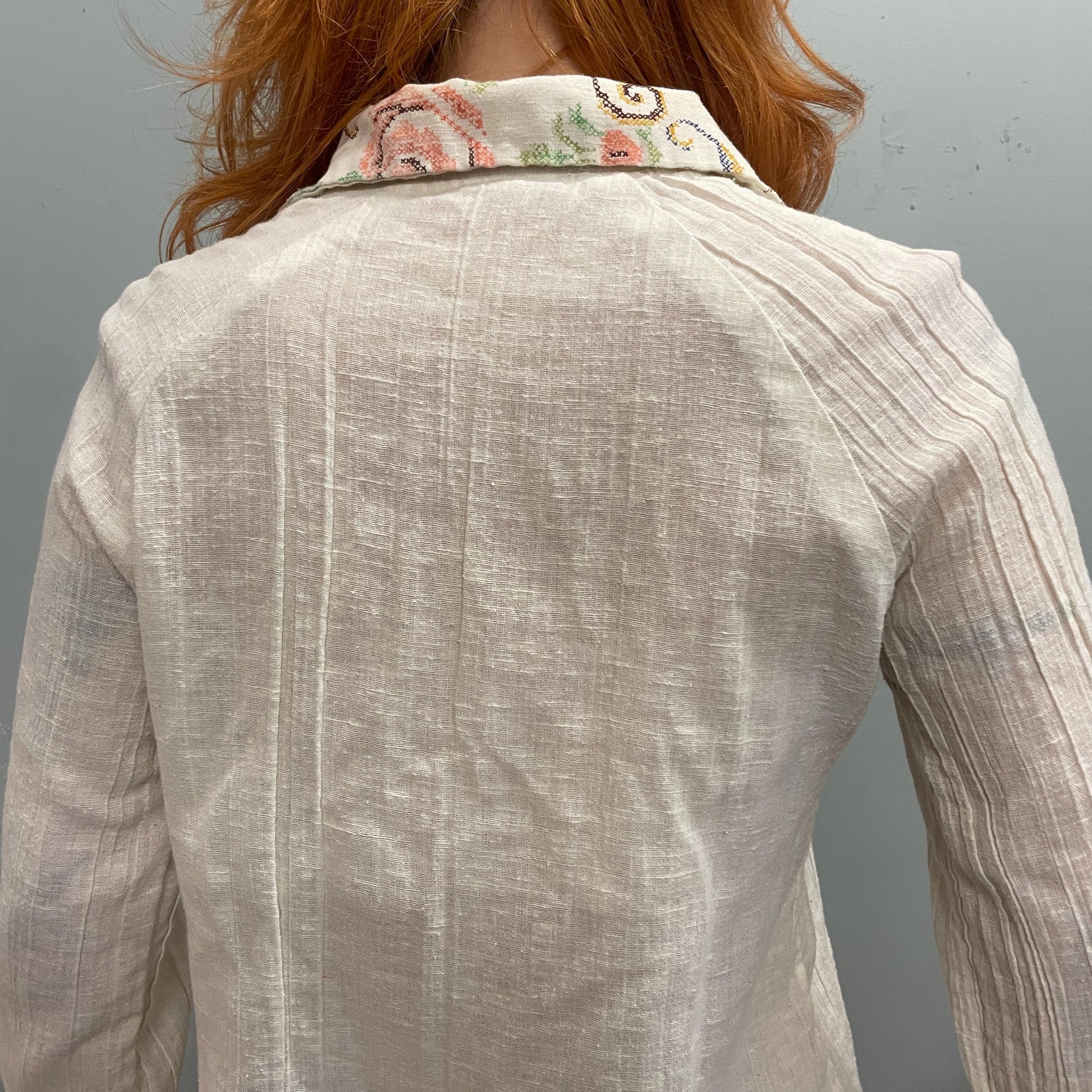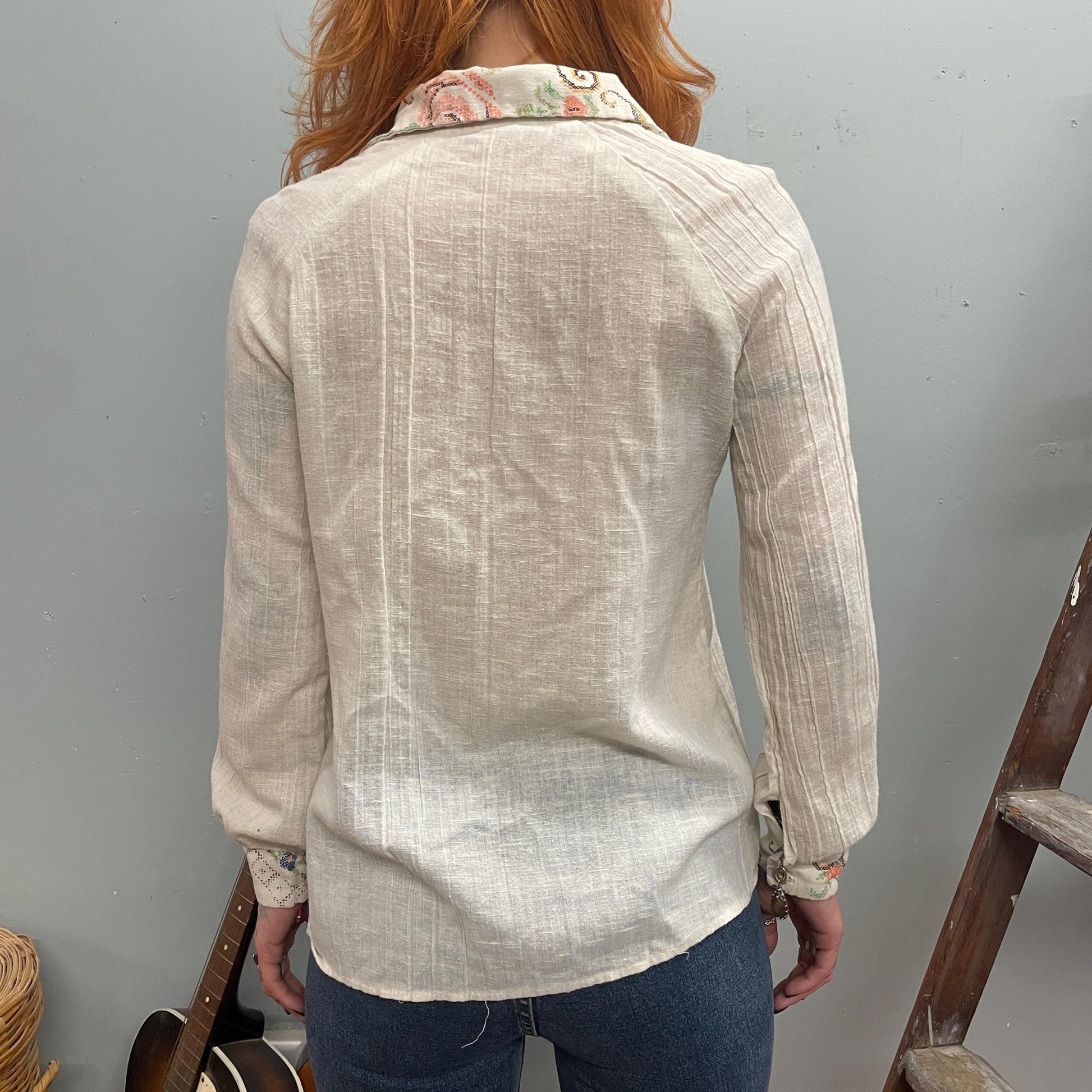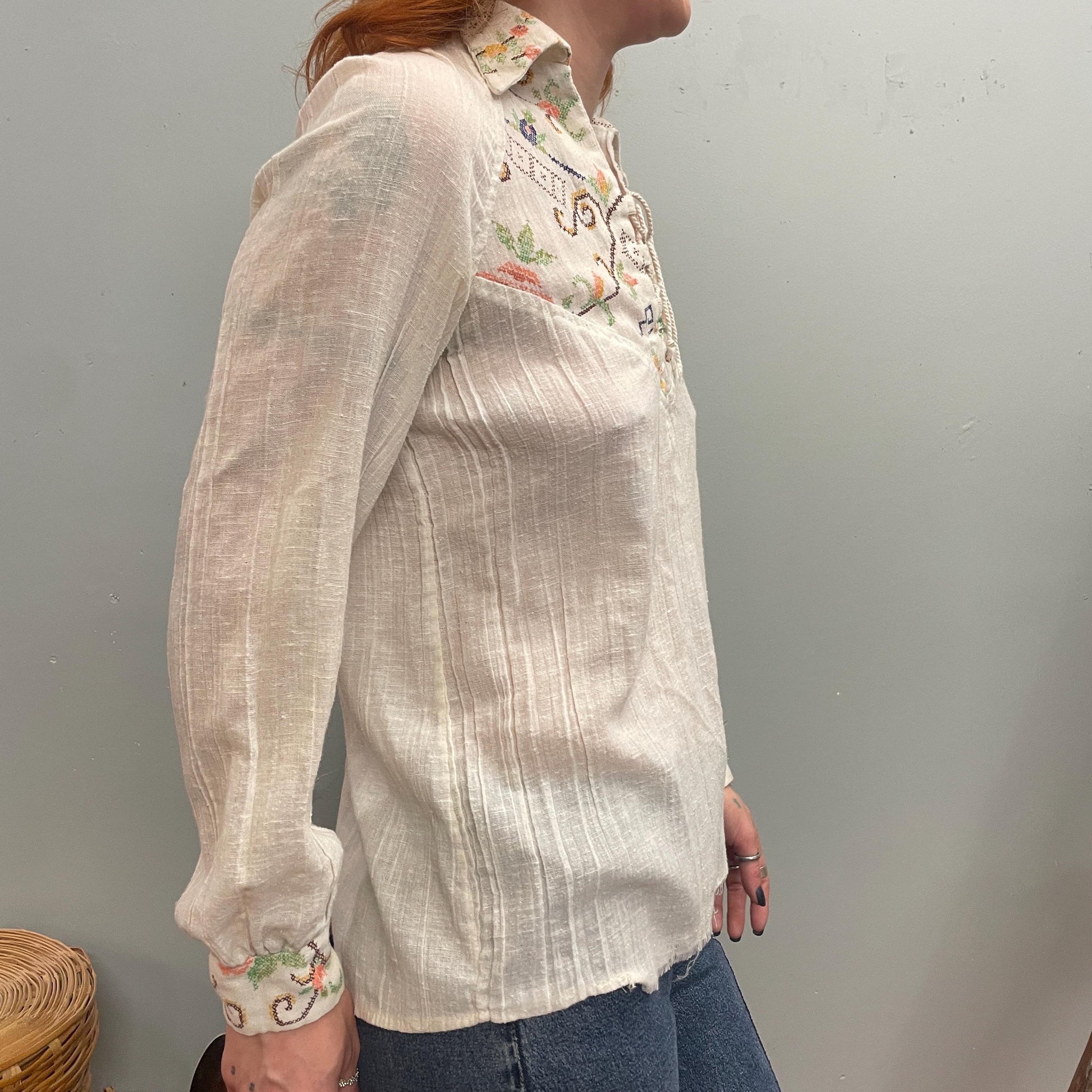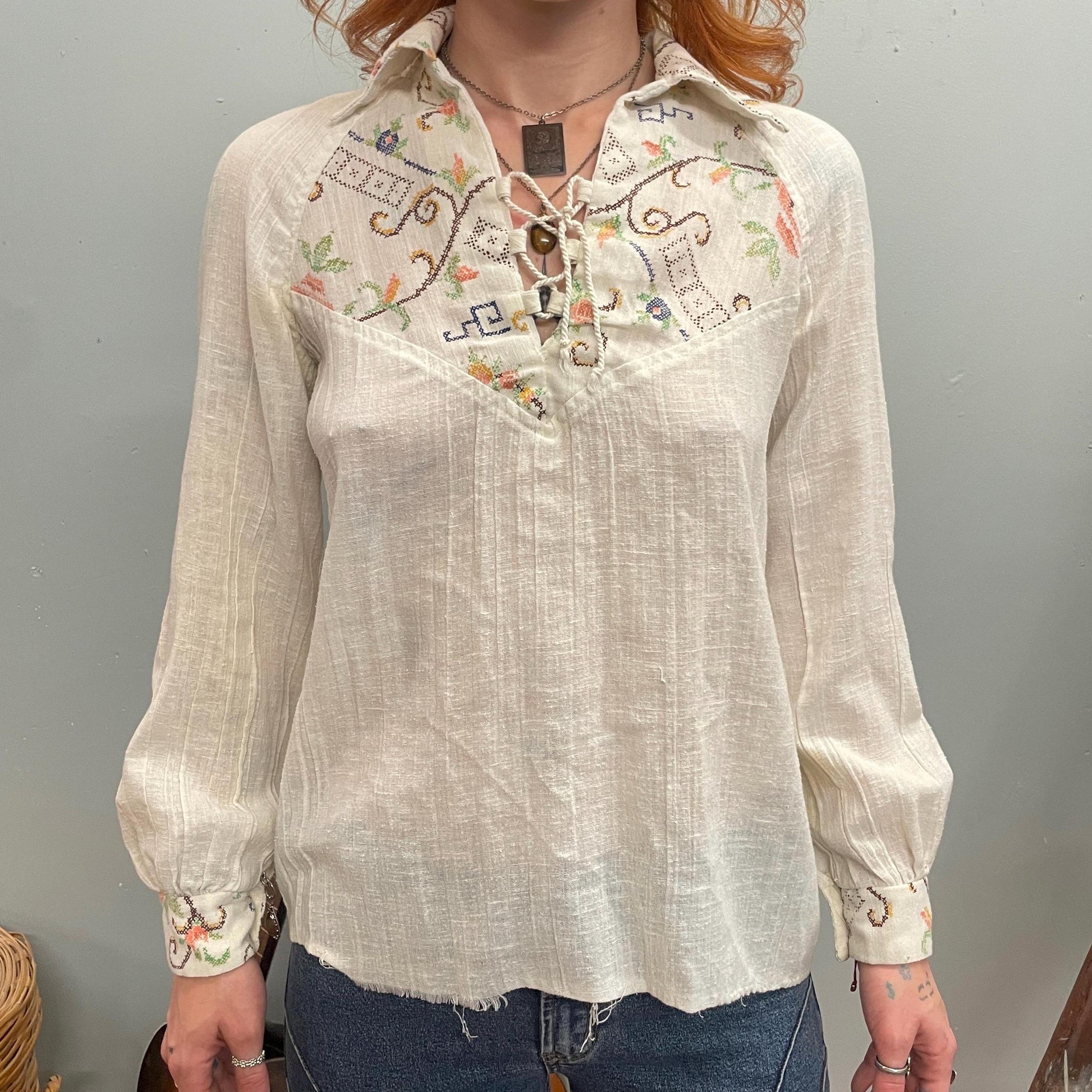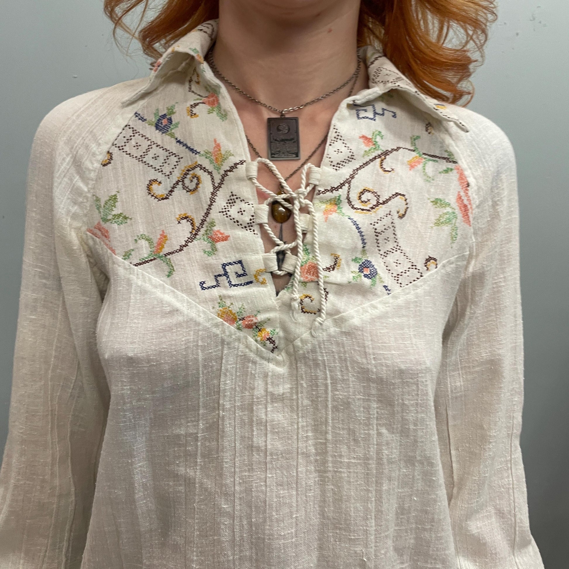 vtg 70s EMBROIDERED LINEN BLOUSE // vintage floral hippie flowy collared lace up western retro long sleeve boho guru jimi hendrix doors rock