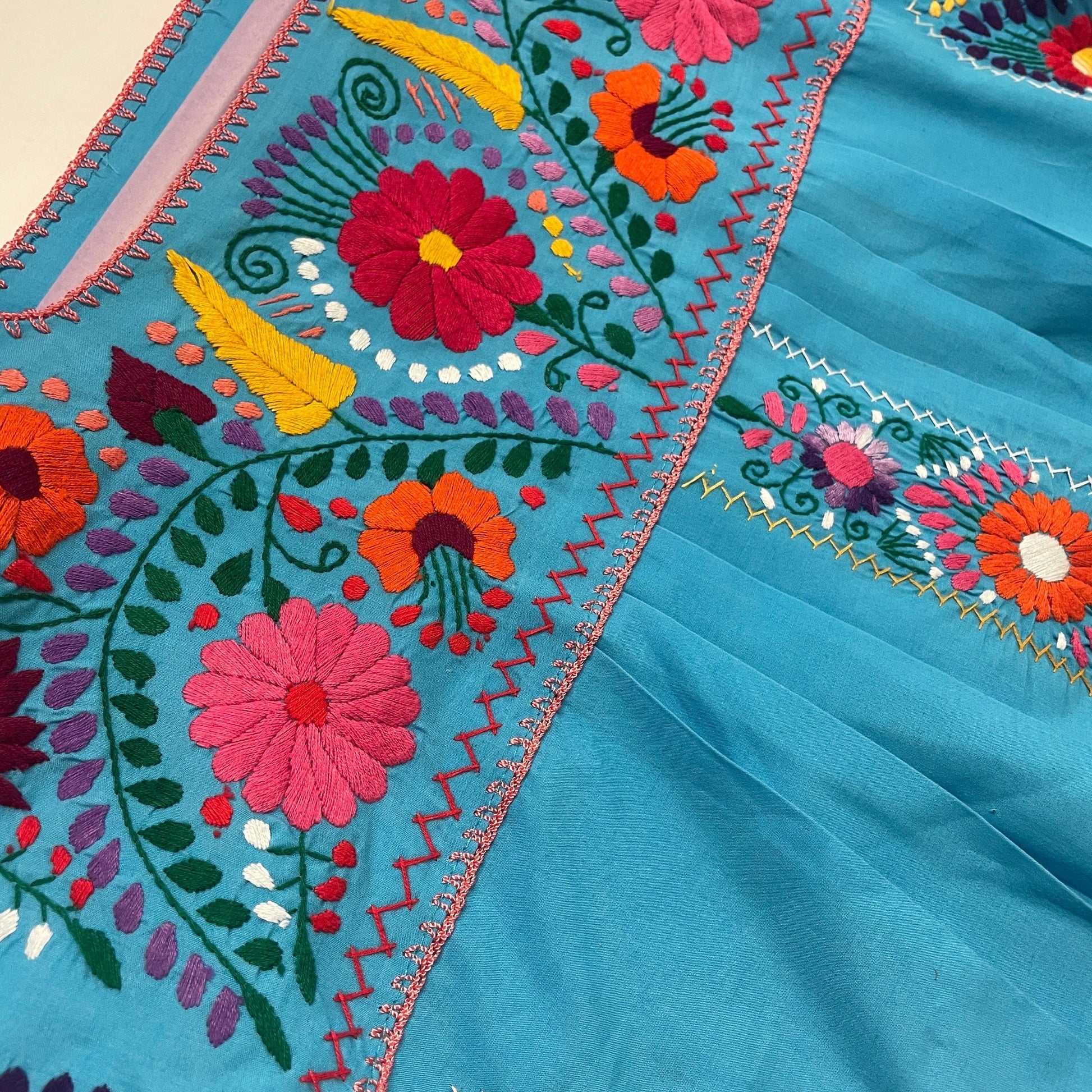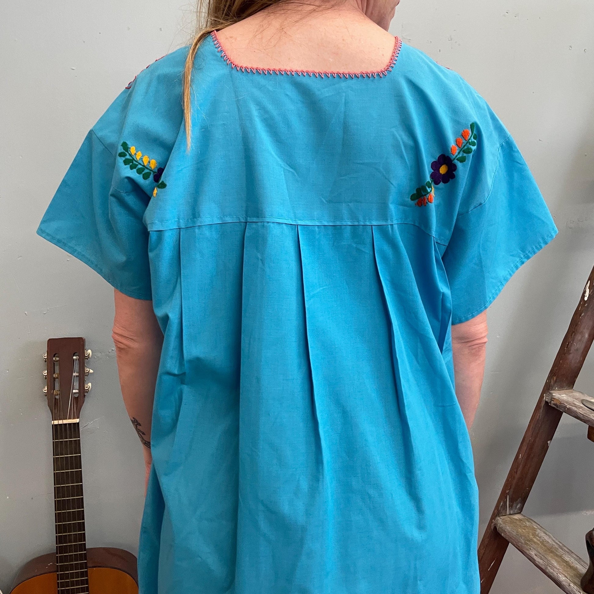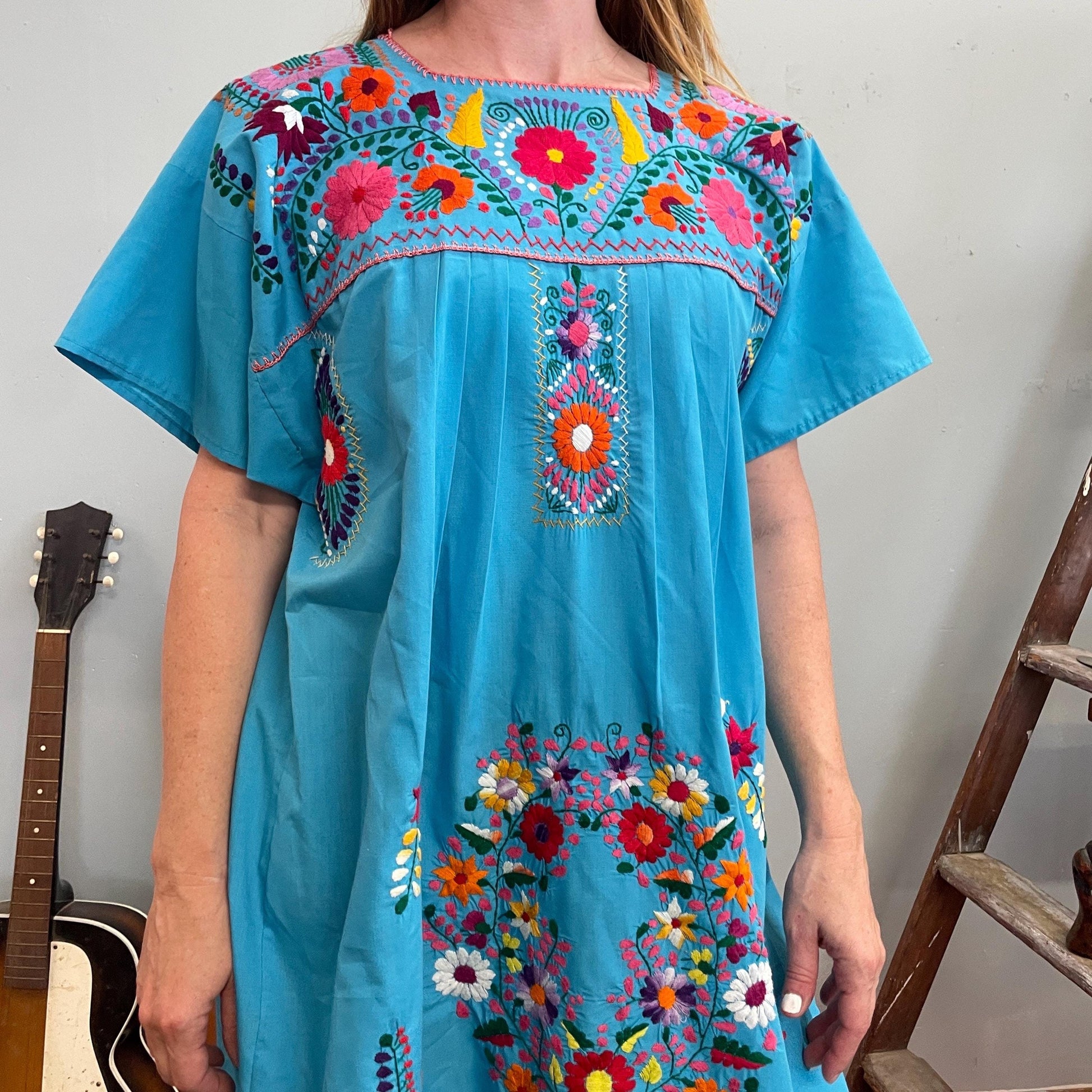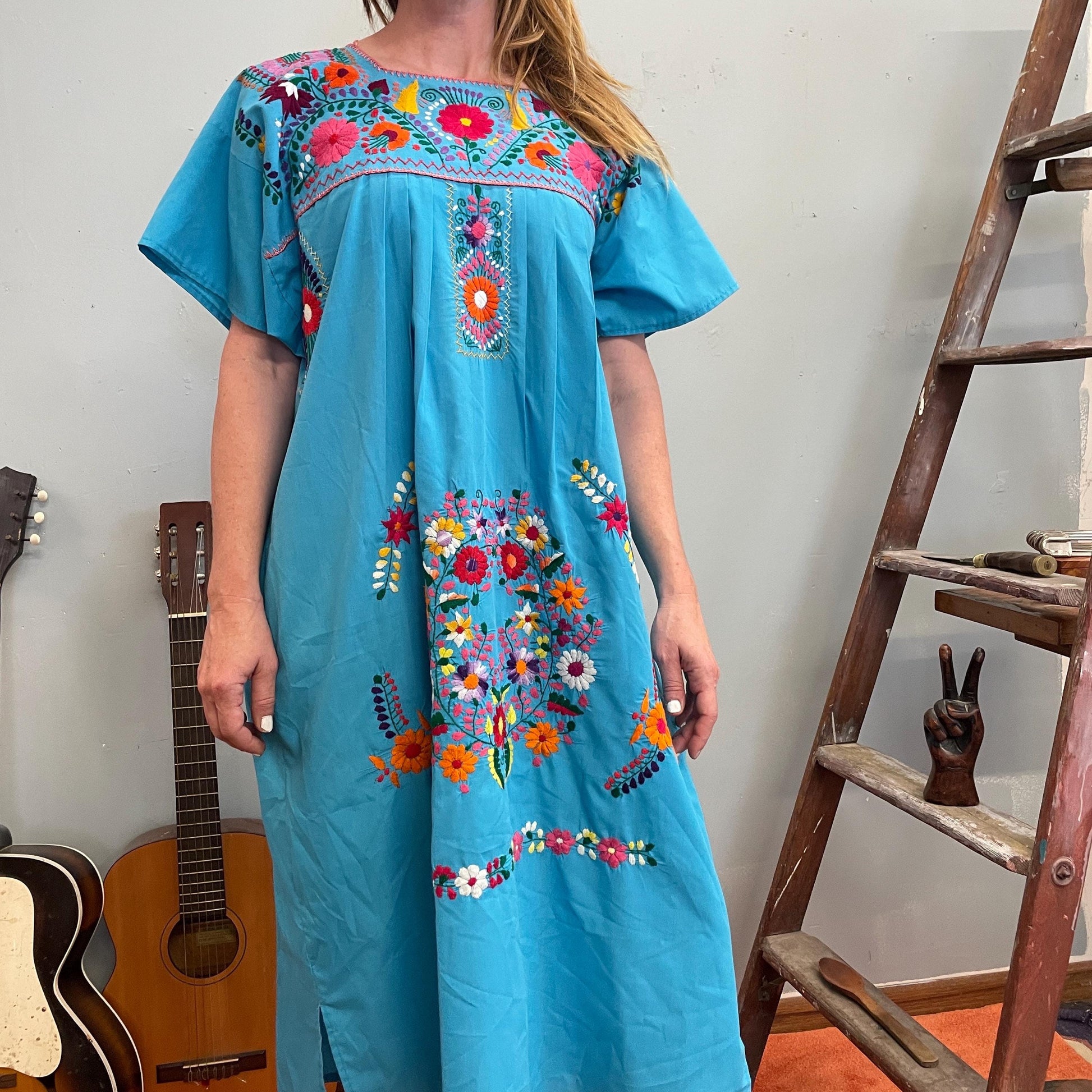 vtg 70s EMBROIDERED OAXACAN DRESS // bright blue floral Mexican cultural hippie boho maxi coco day of the dead festive flower power retro