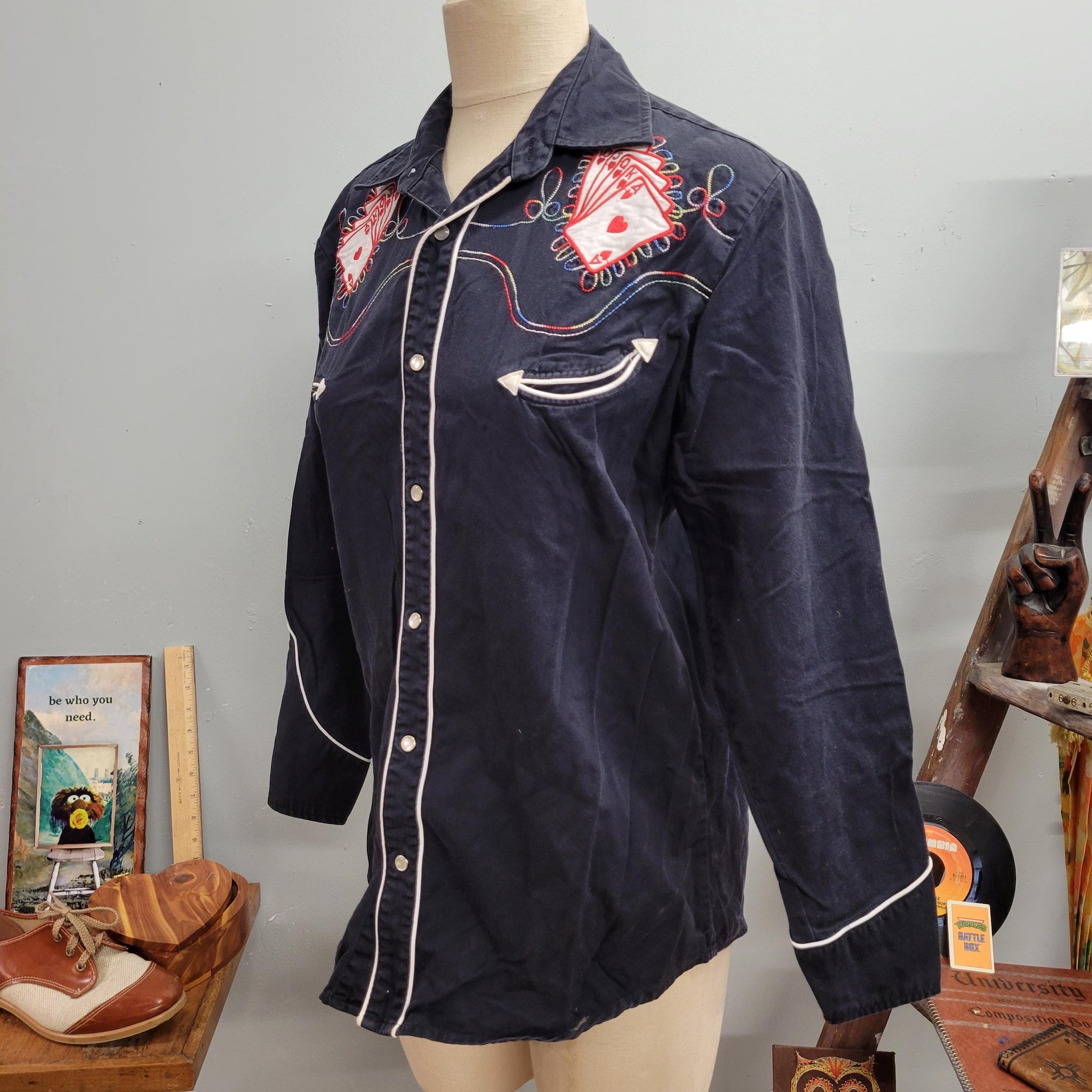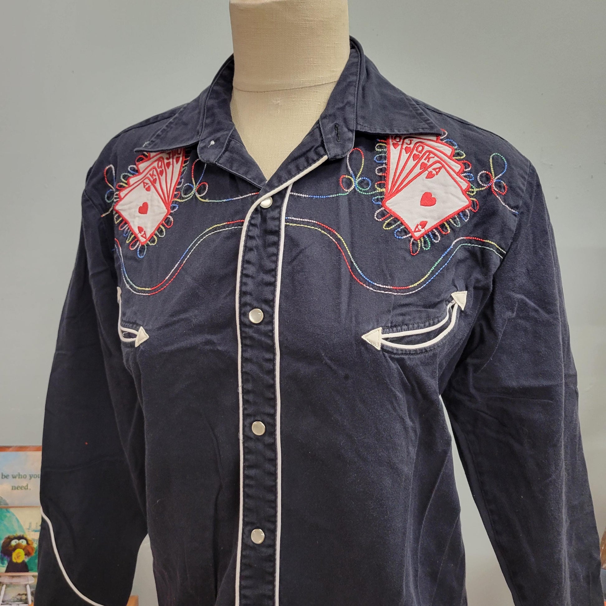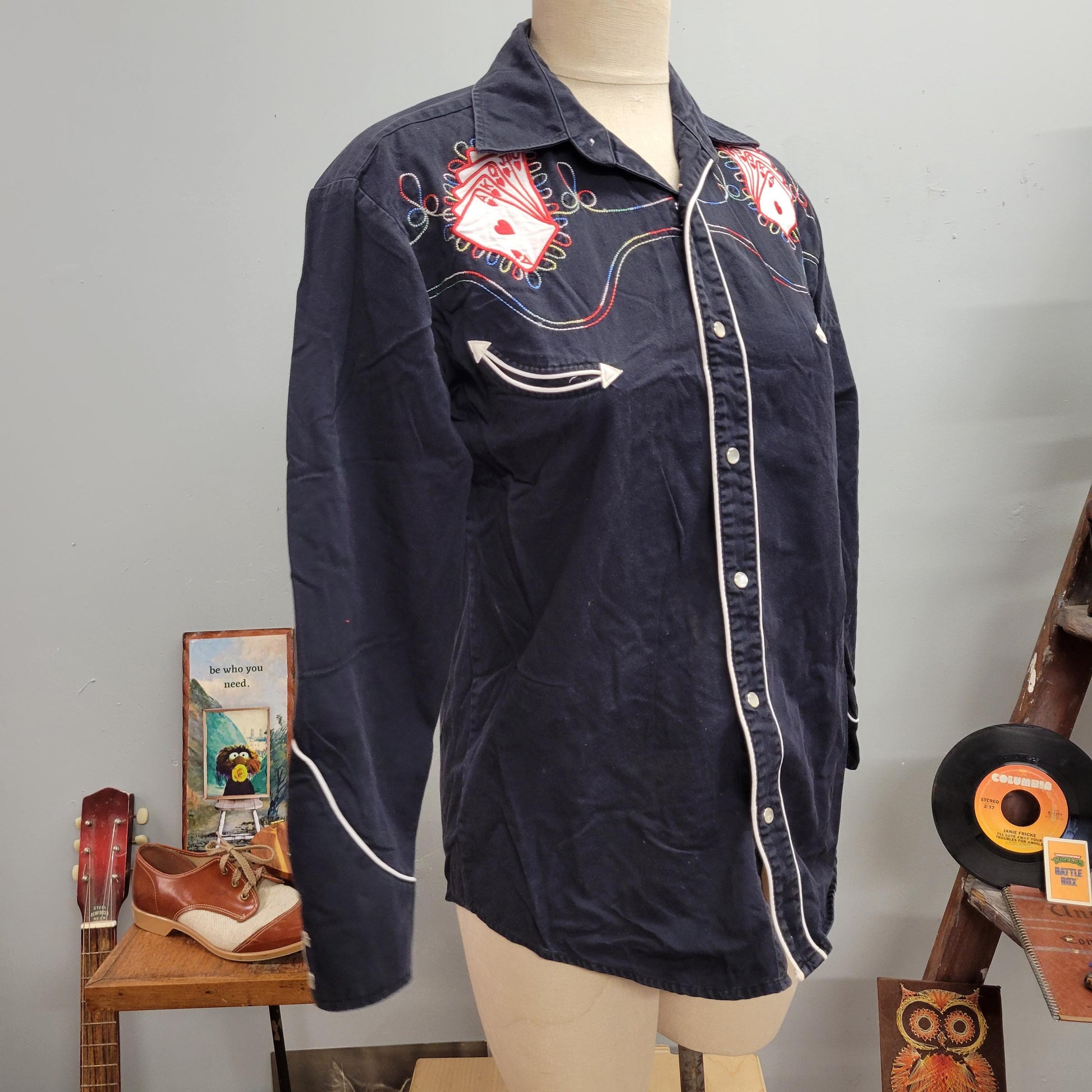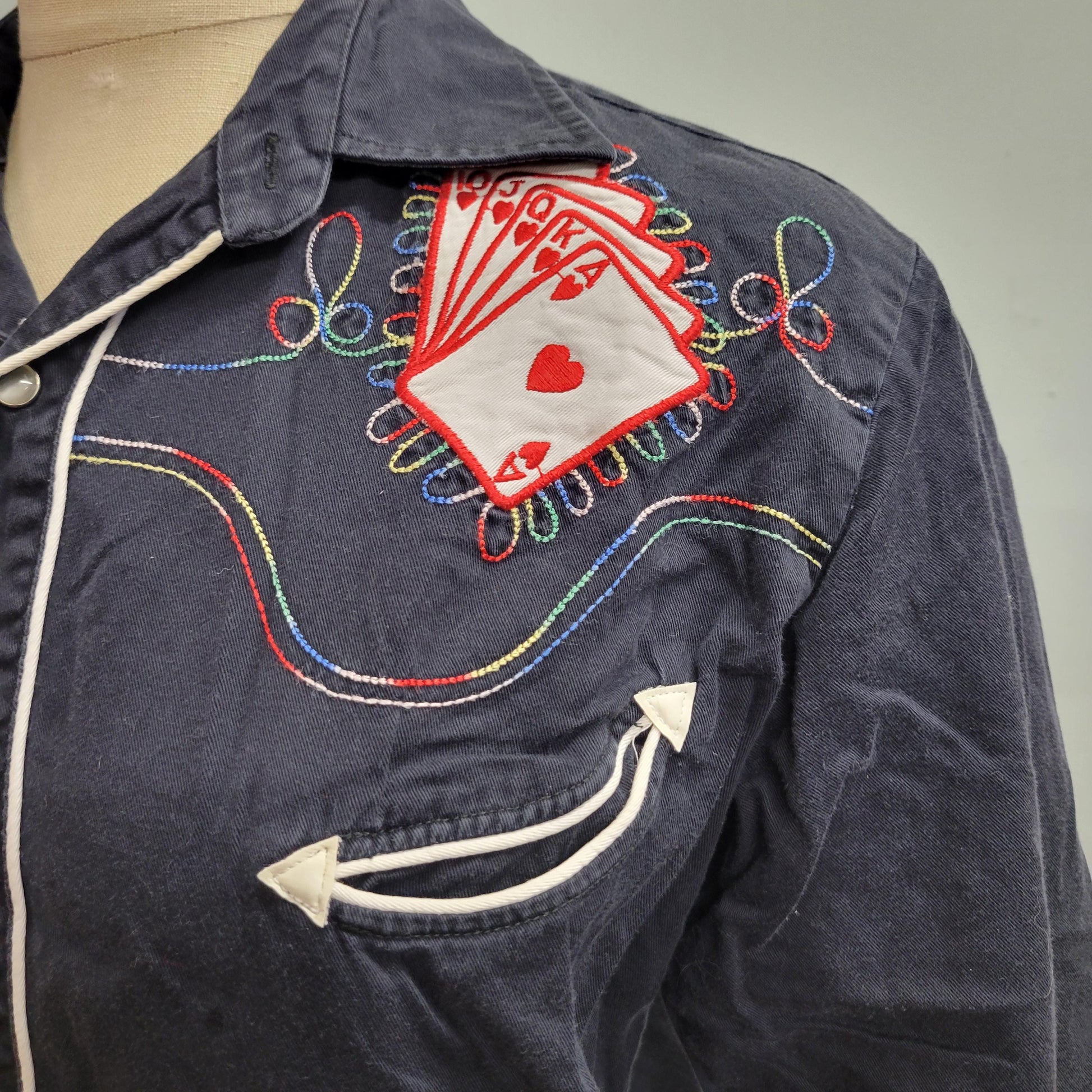 vtg 70s EMBROIDERED POKER BUTTONDOWN // vintage buffalo country small western rainbow trim royal flush h bar c style cotton pearl snap ranch