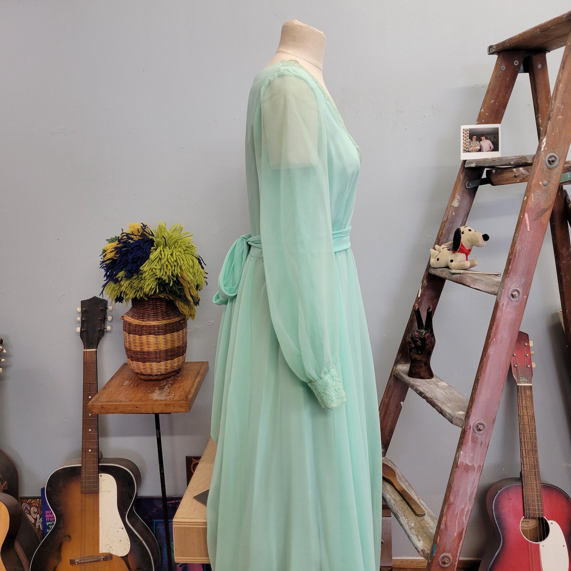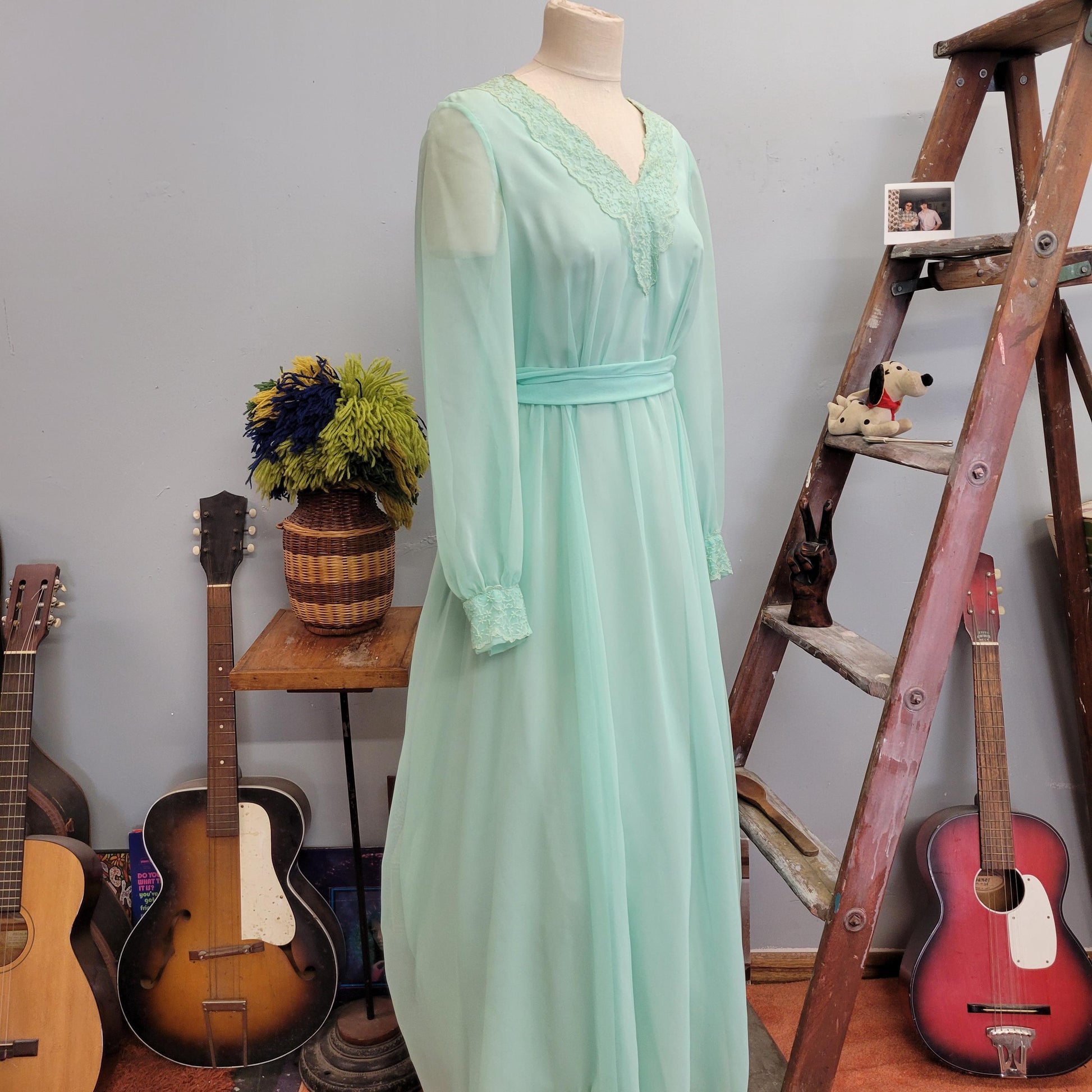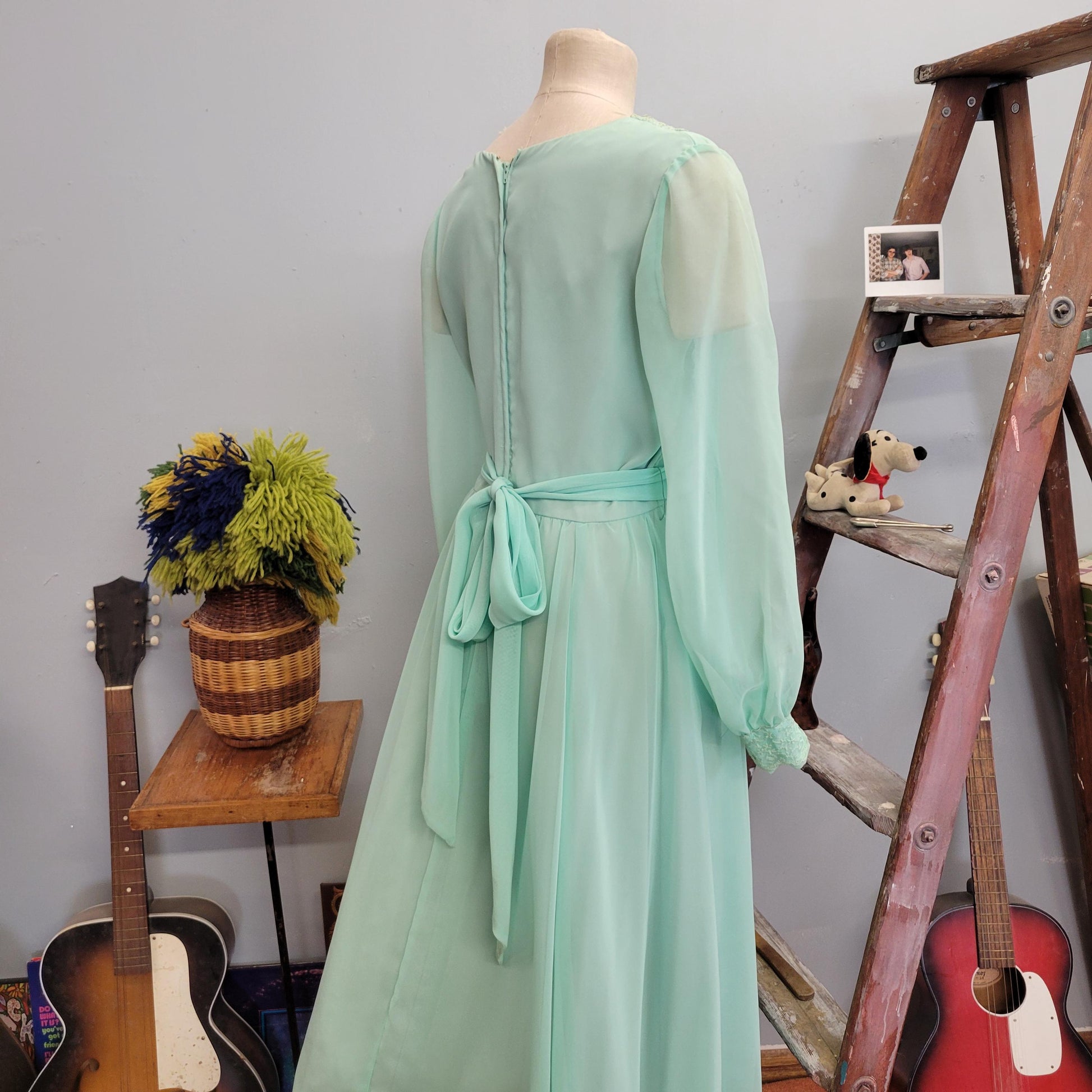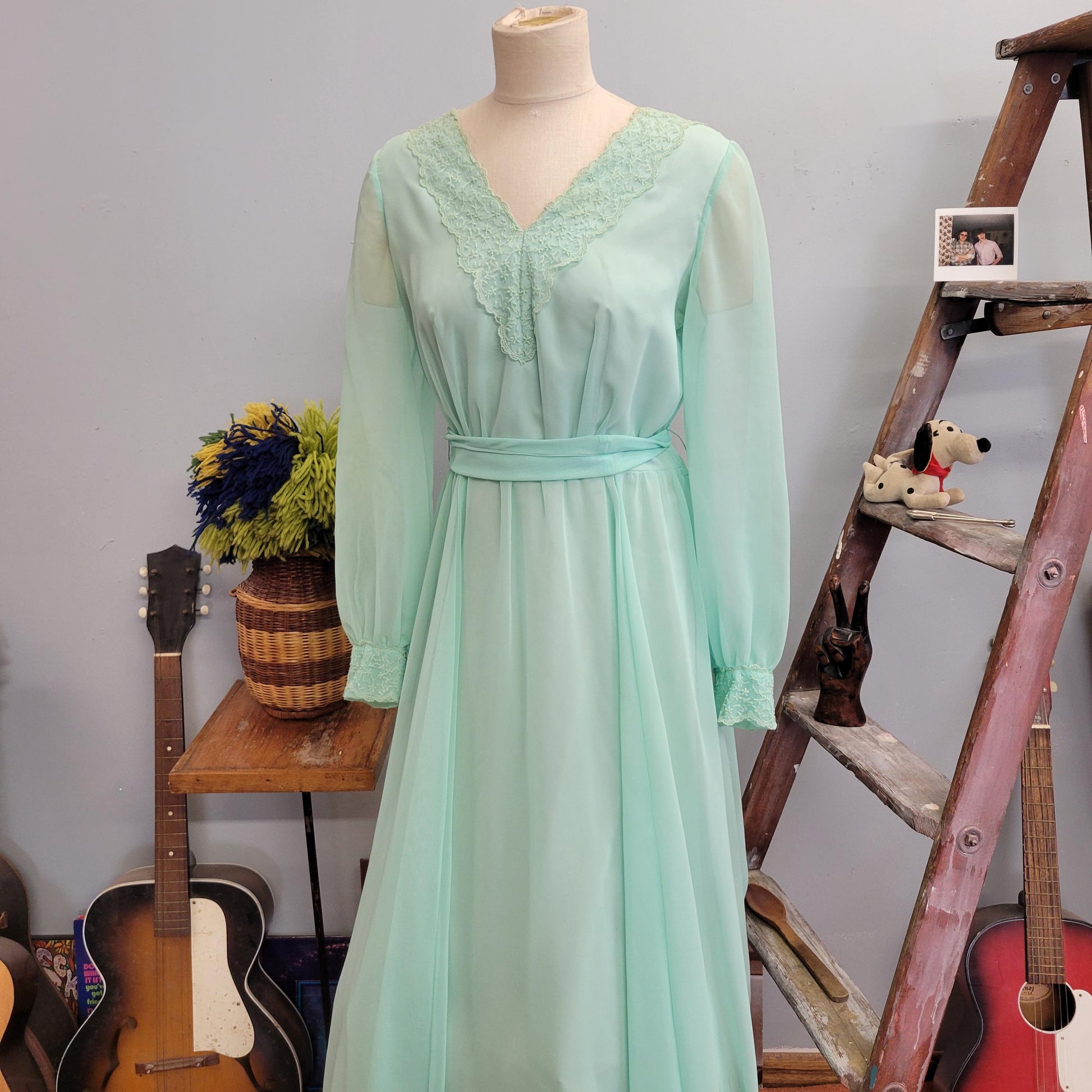 vtg 70s EMMA DOMB GOWN // vintage pastel green chiffon ethereal flowy maxi gown belted embroidered sheer angelic romantic full length dress