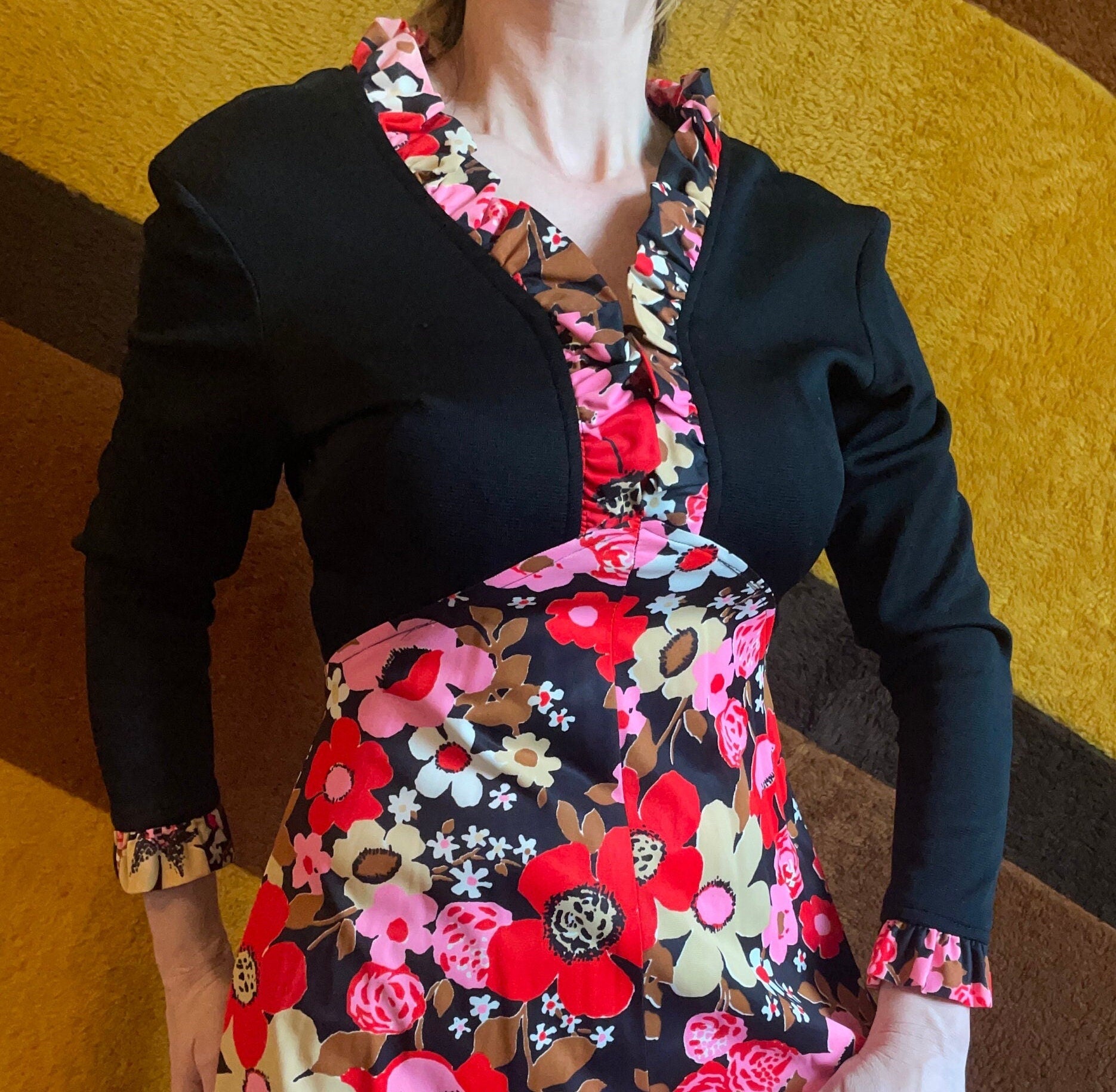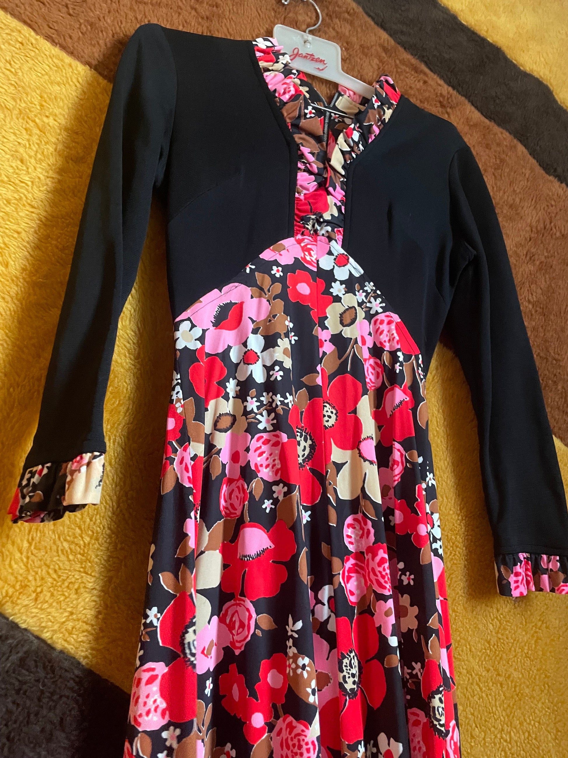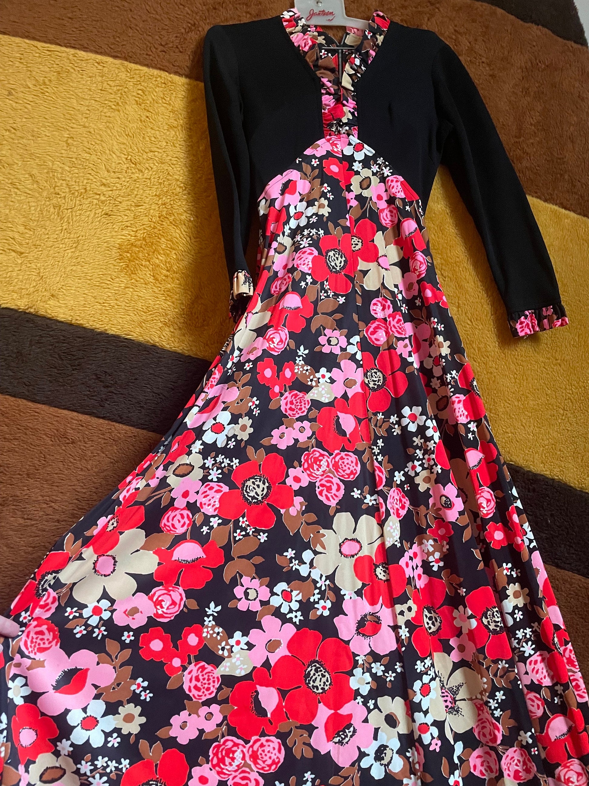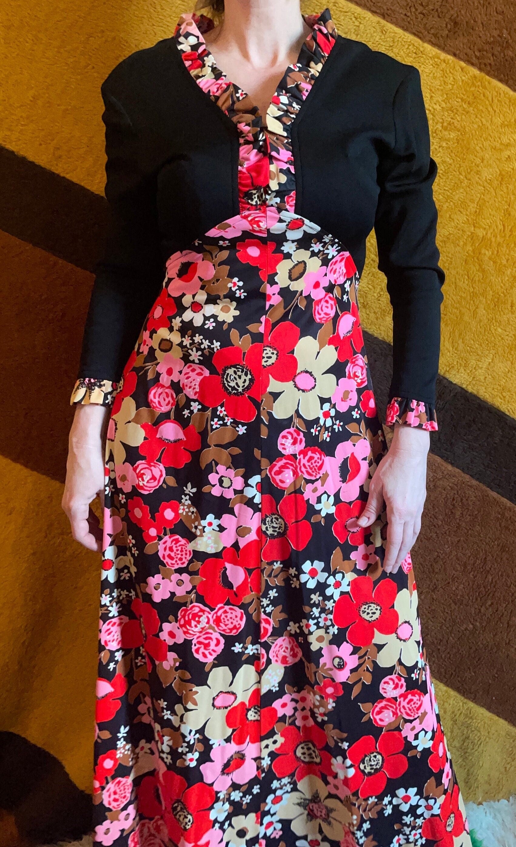 vtg 70s EMPIRE MAXI DRESS // waist black & pink floral v neck hippie retro flower power full flowy skirt fun psychedelic kitschy party gown