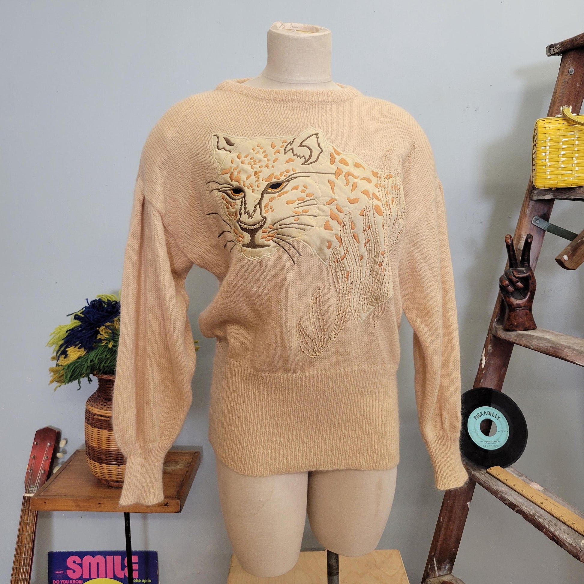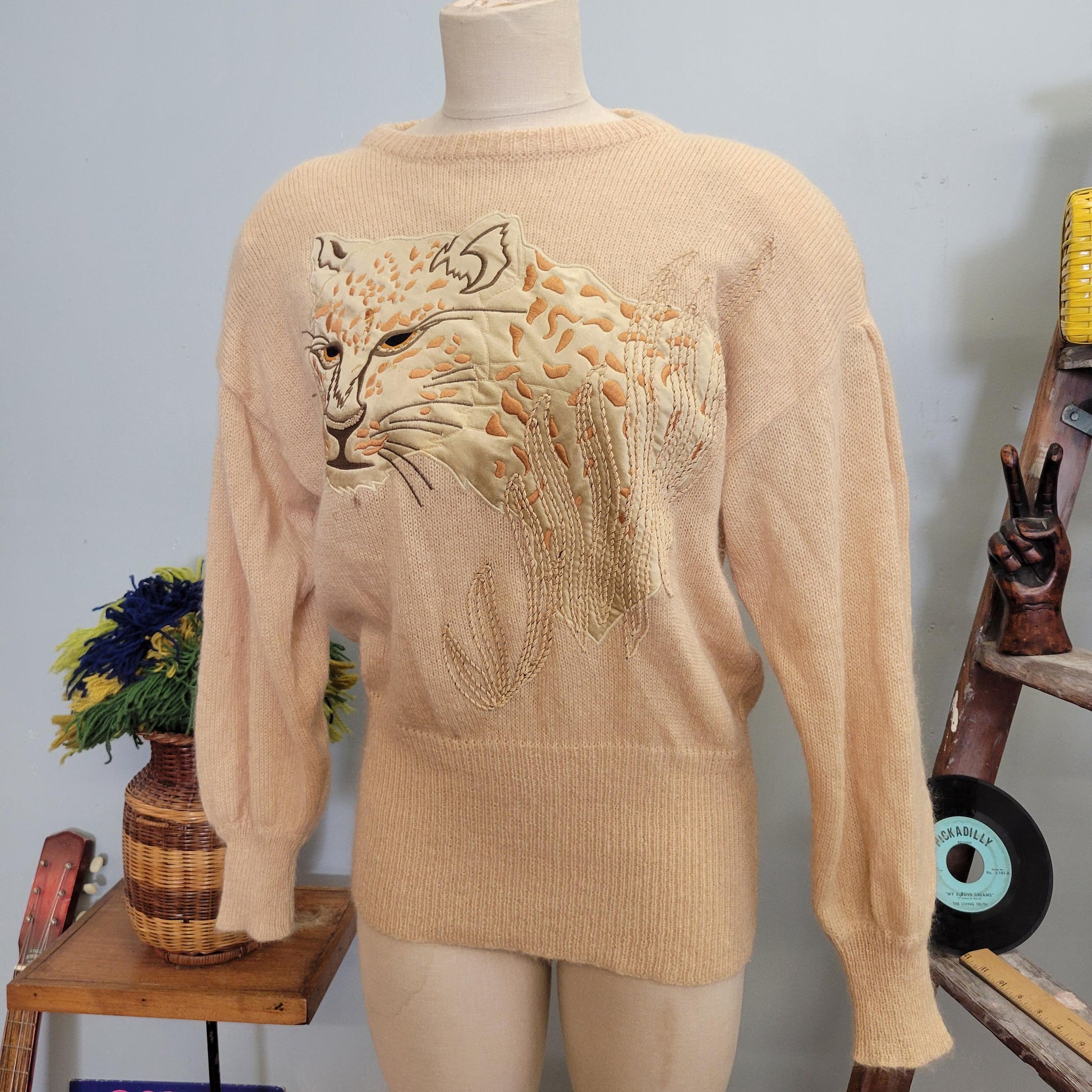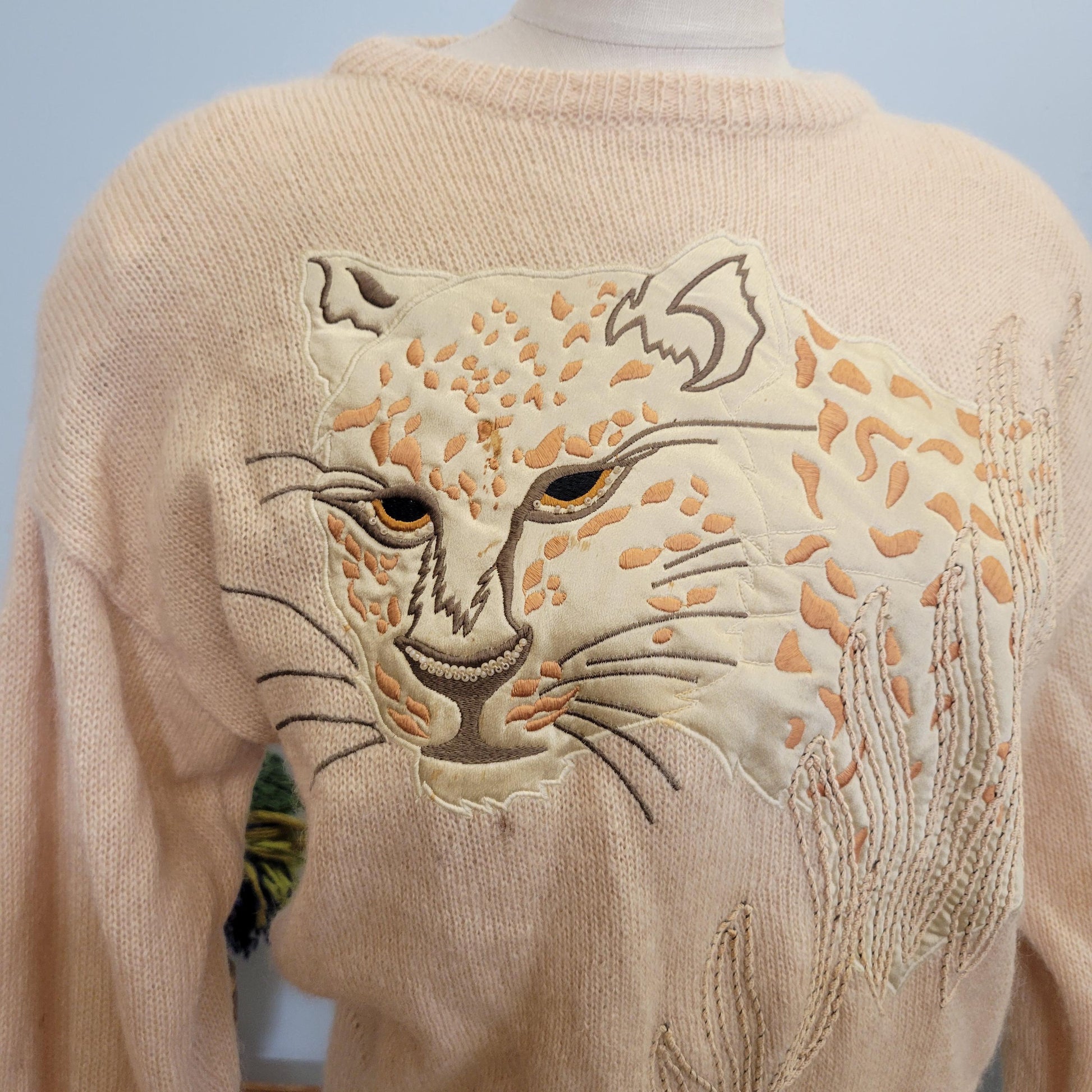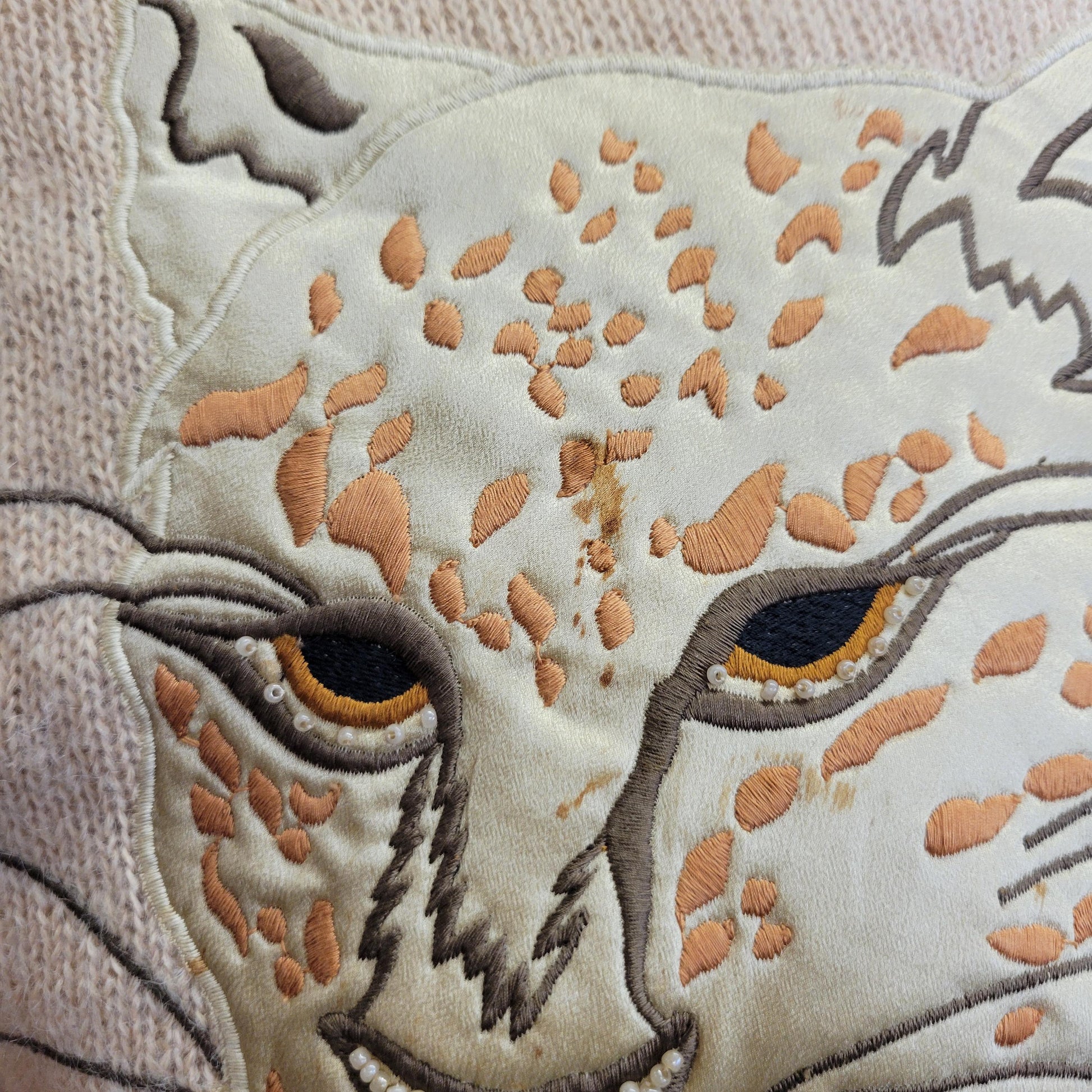 vtg 70s ESCADA LEOPARD SWEATER // vintage neiman marcus large gold satin lynx embroidered cat applique fancy high fashion name brand 80s fab