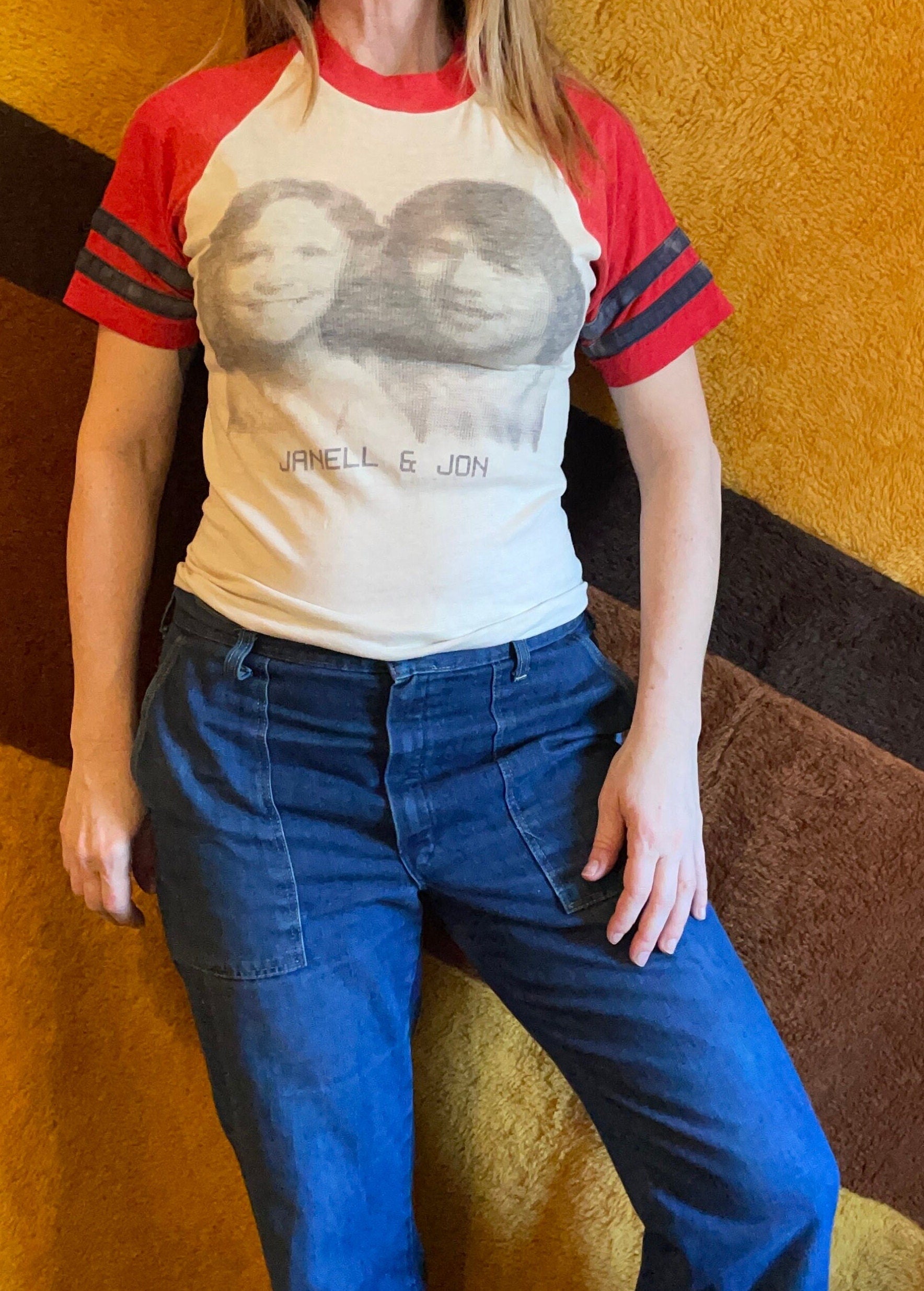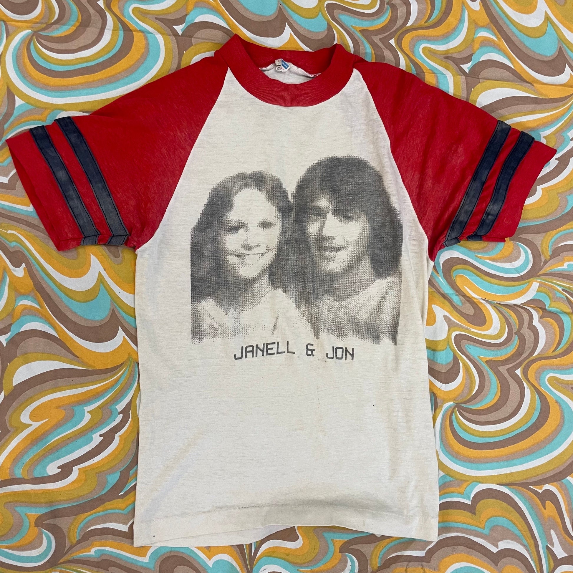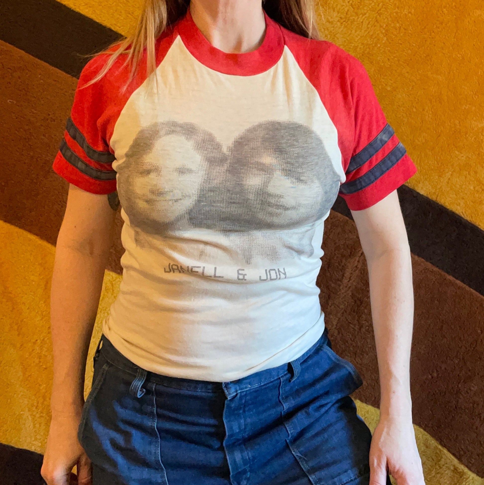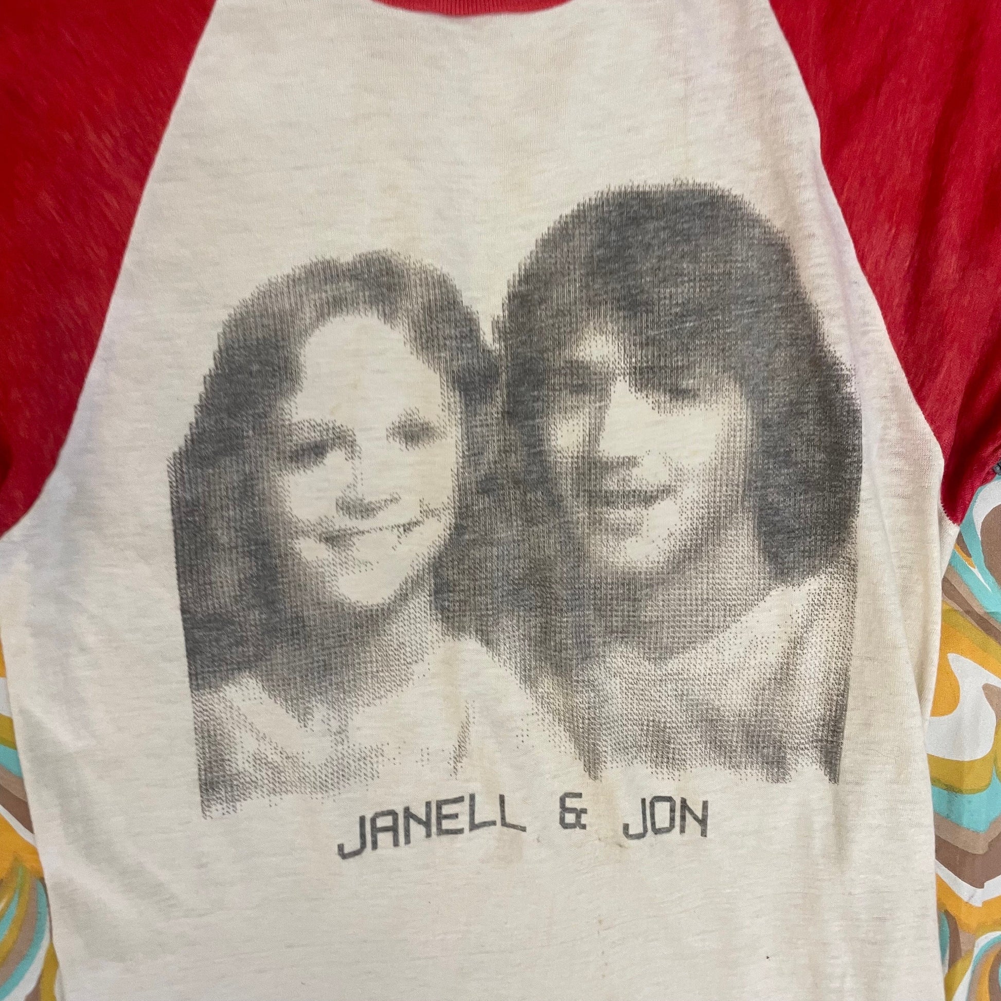 vtg 70s FACES PHOTO PIXEL booth /vintage champion blue bar medium art real couples carnival souvenir striped raglan retro ringer shirt